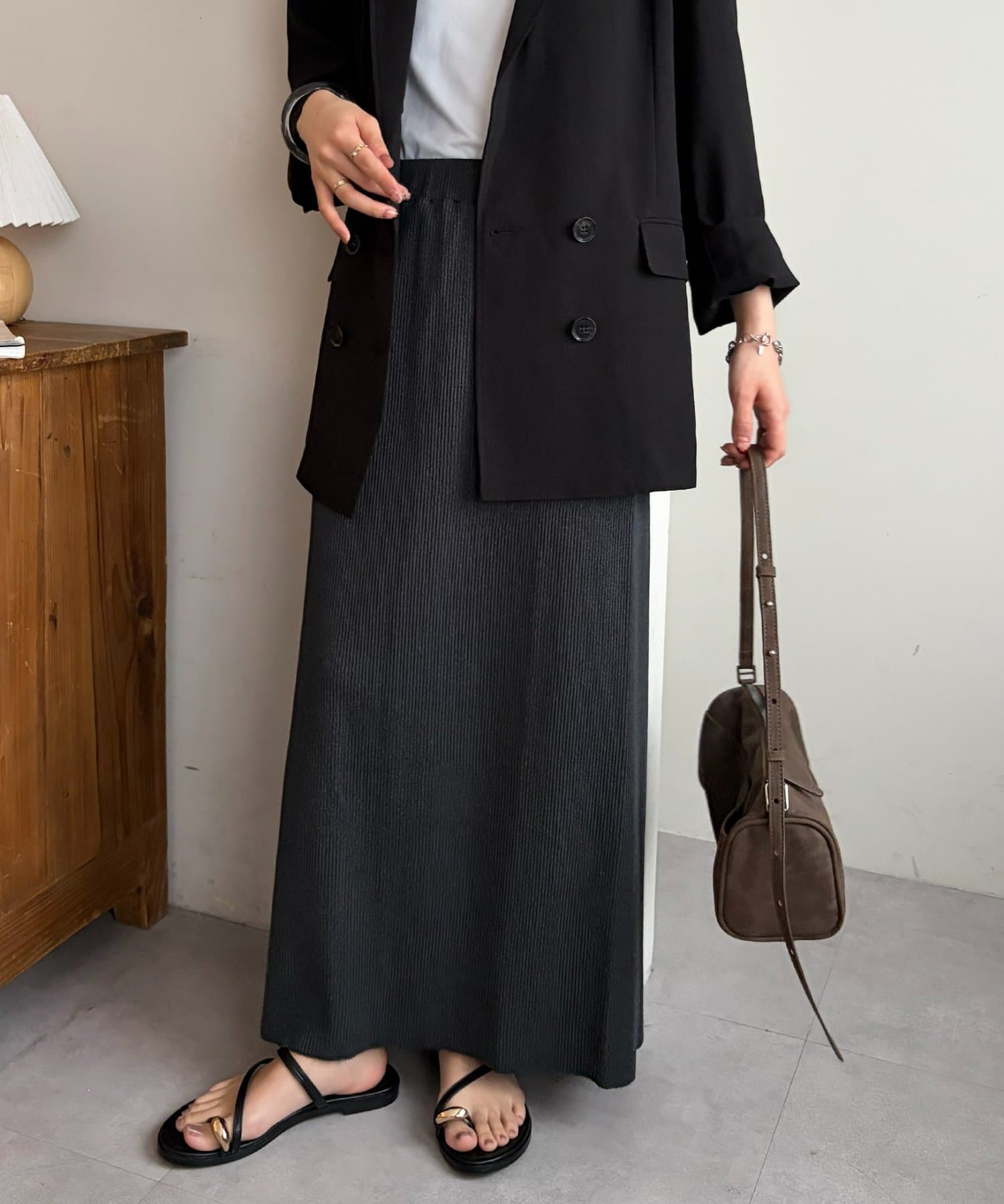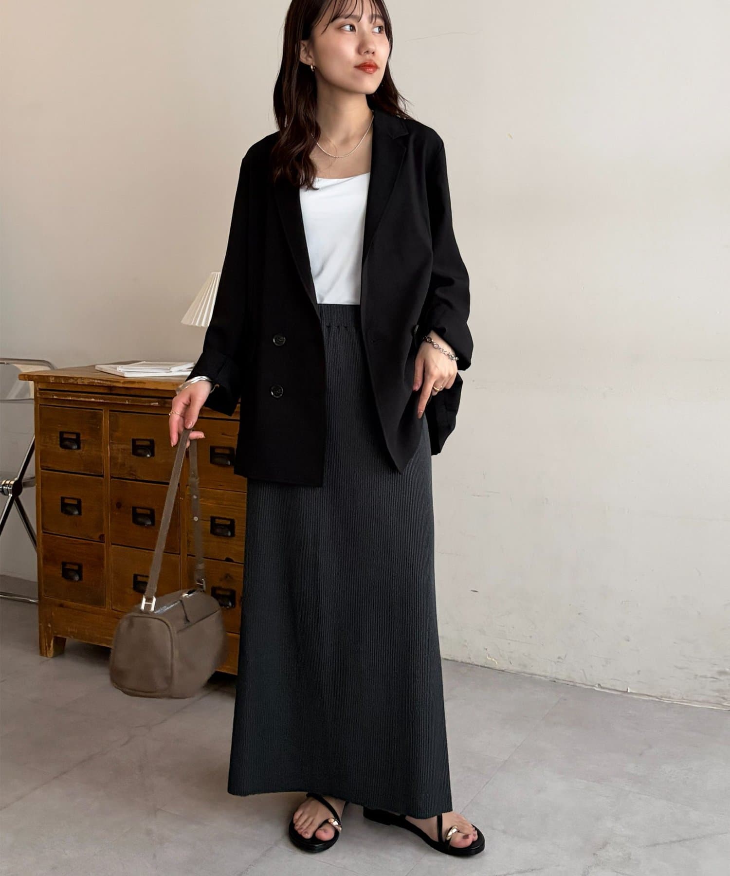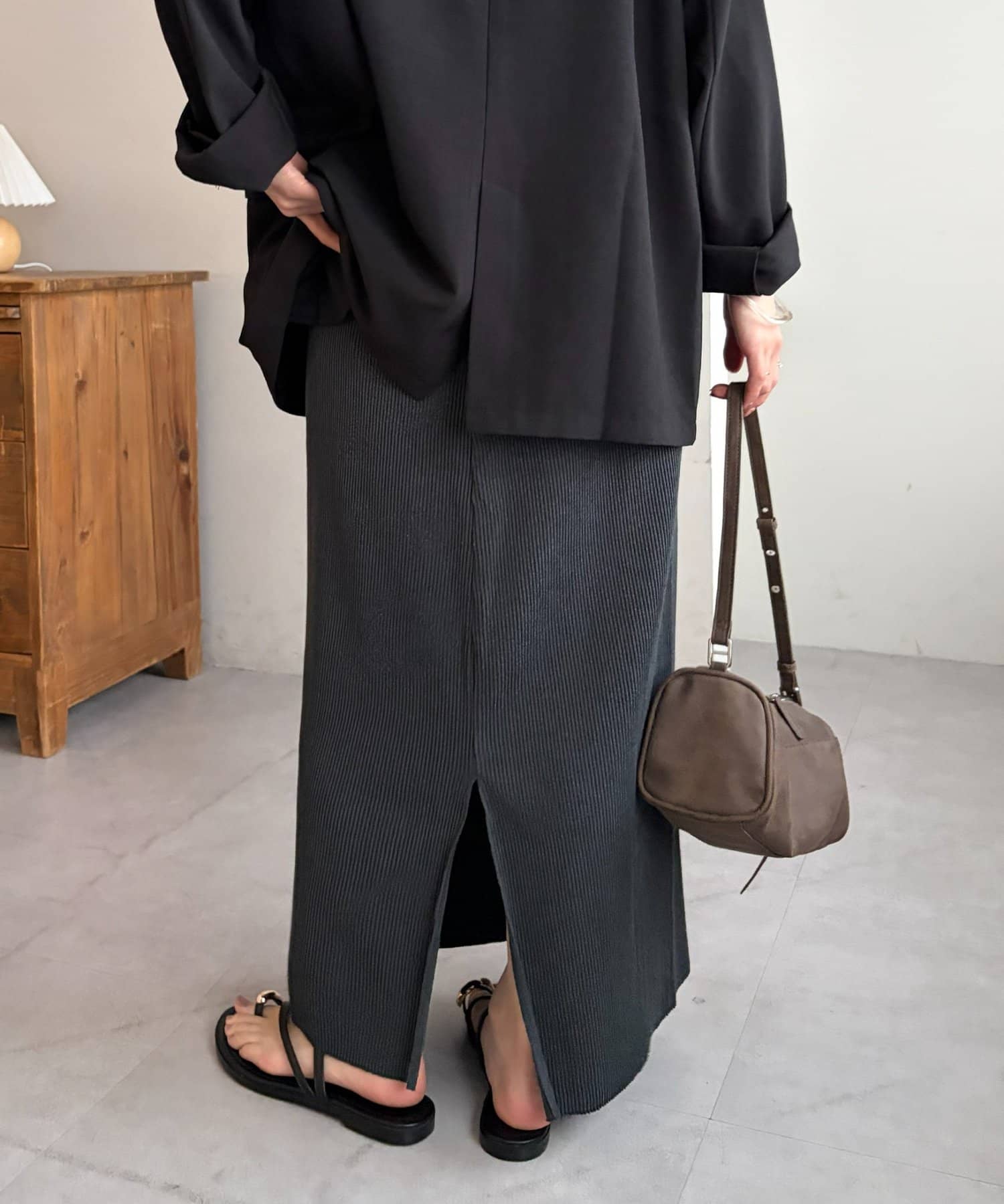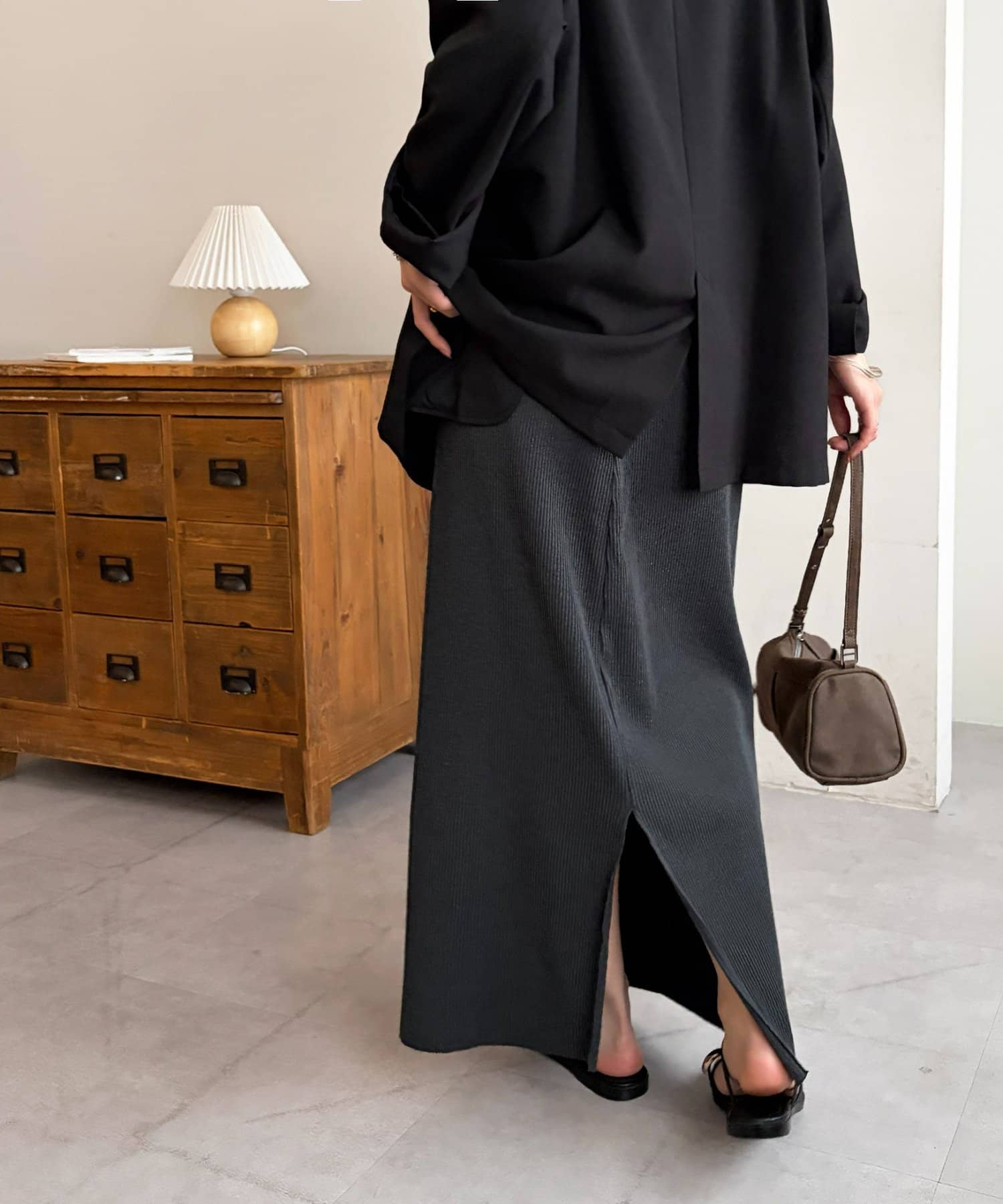Iラインが綺麗に見えるナロースカートはゆったりとしたサイズ感のトップスと合わせることでメリハリのあるコーデが完成します♪