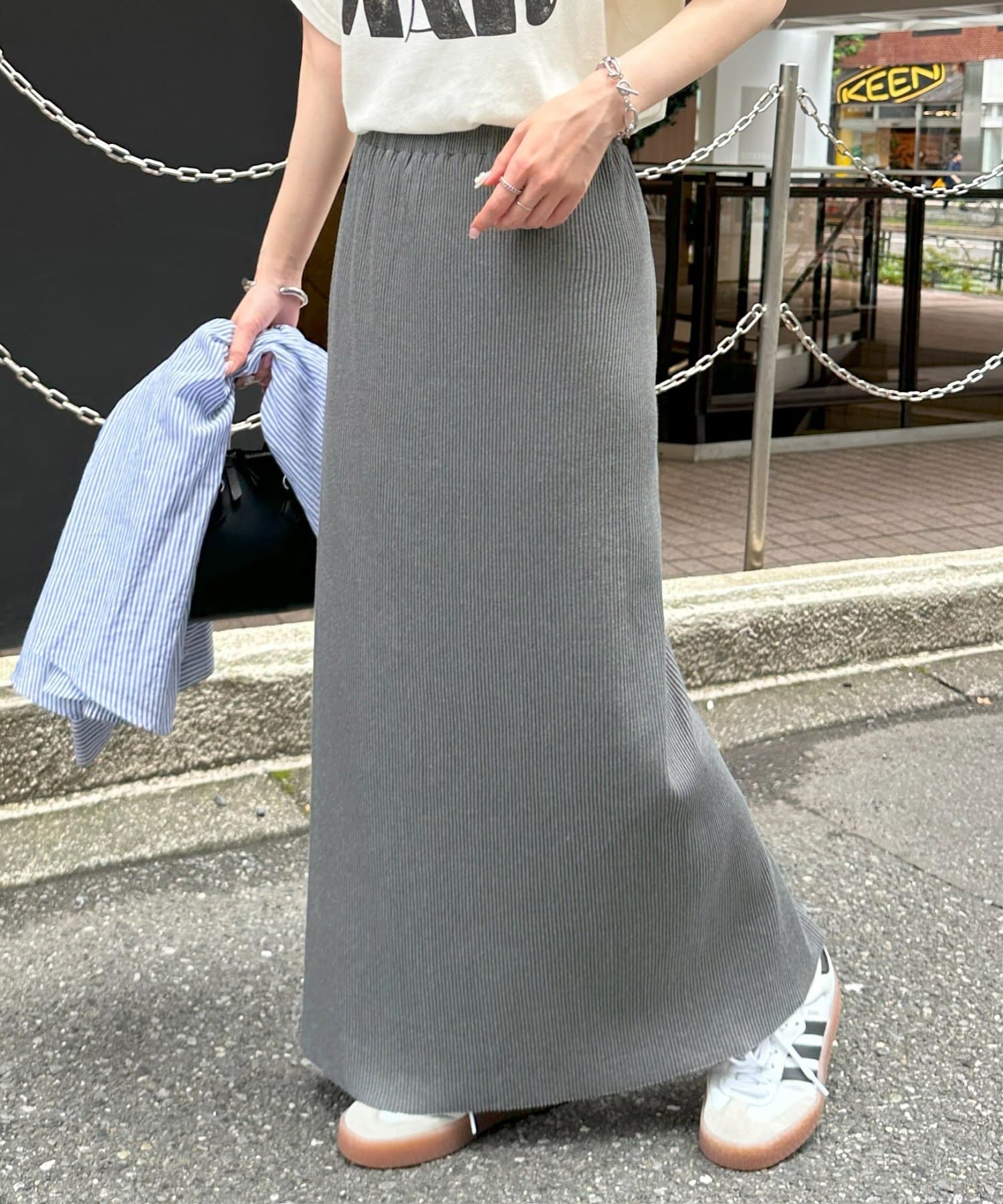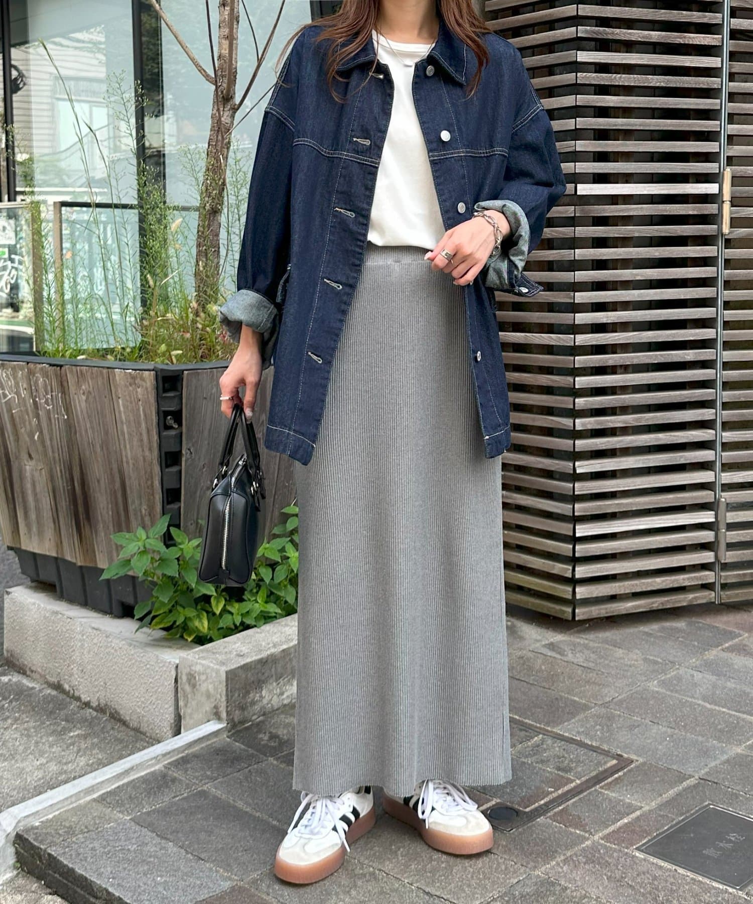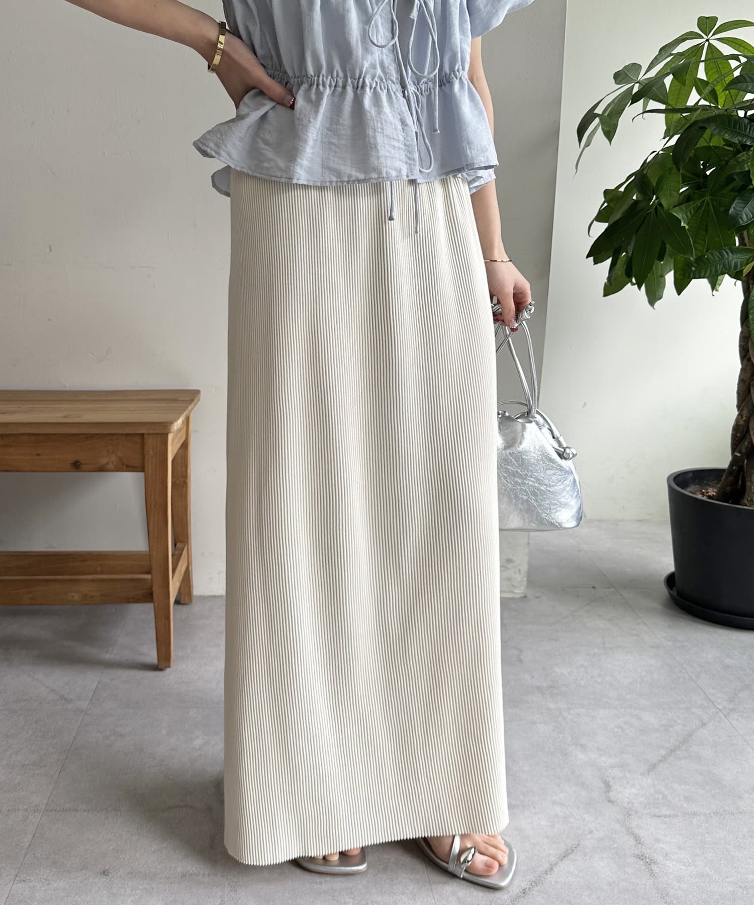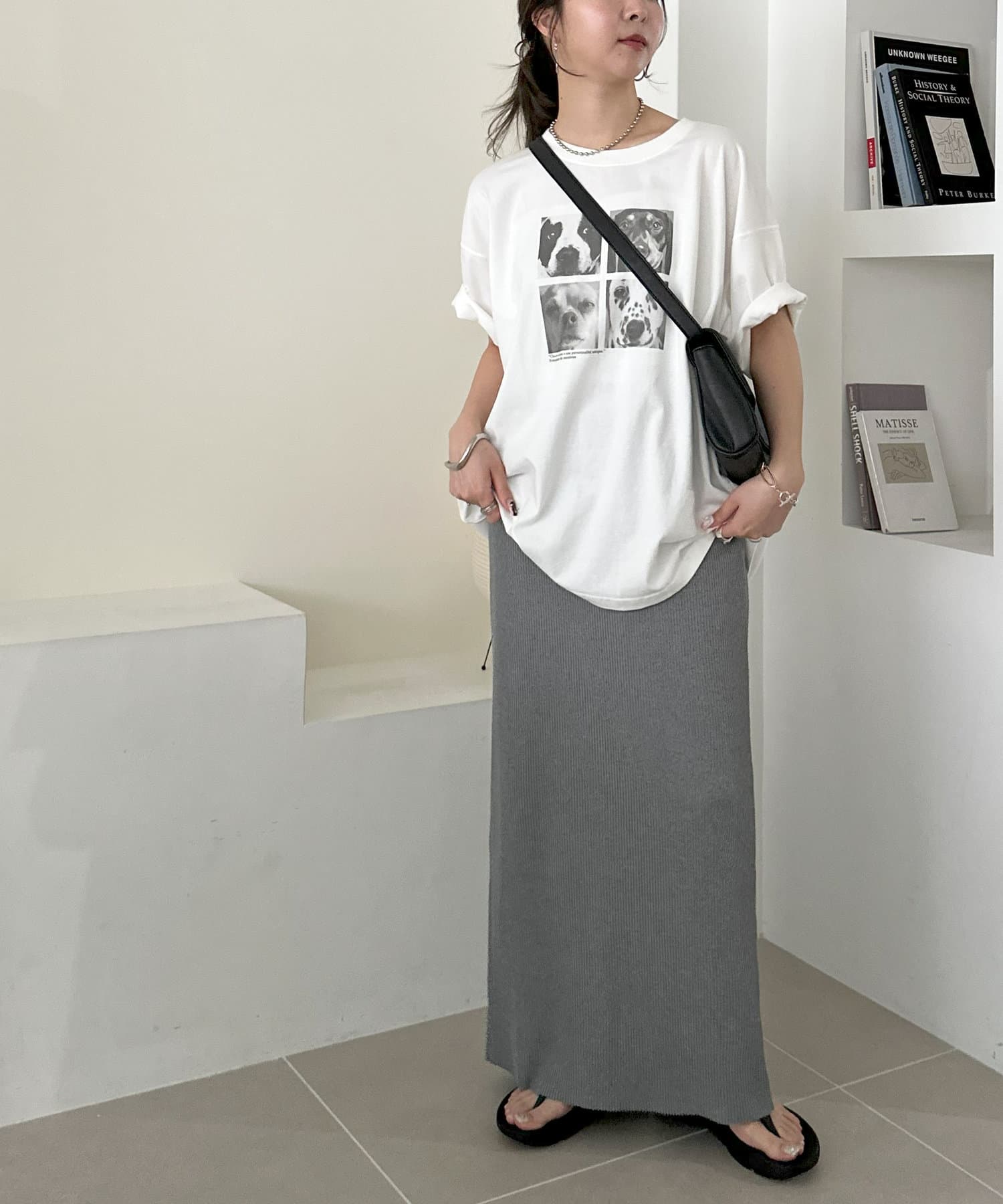Iラインが綺麗に見えるナロースカートはゆったりとしたサイズ感のトップスと合わせることでメリハリのあるコーデが完成します♪