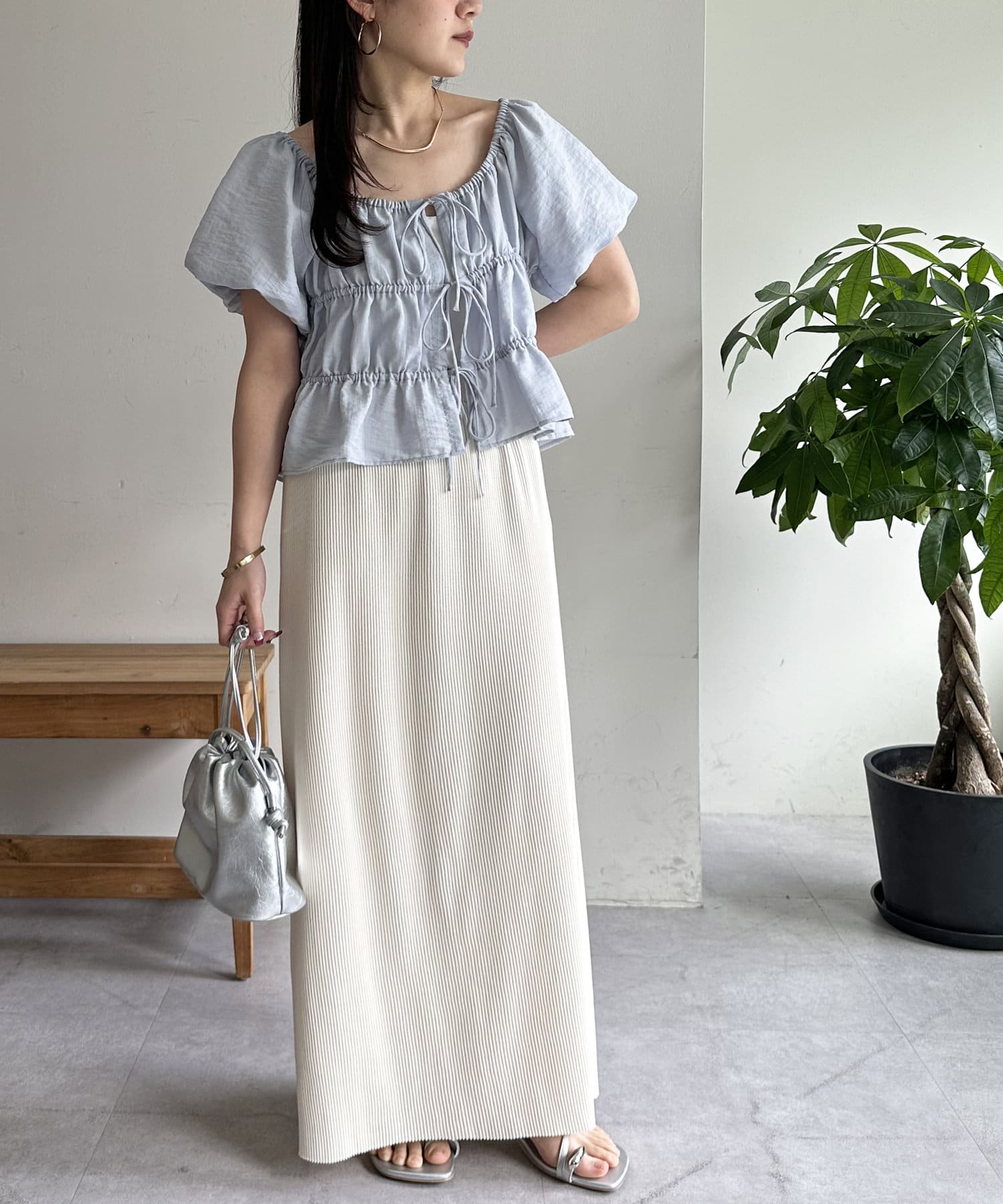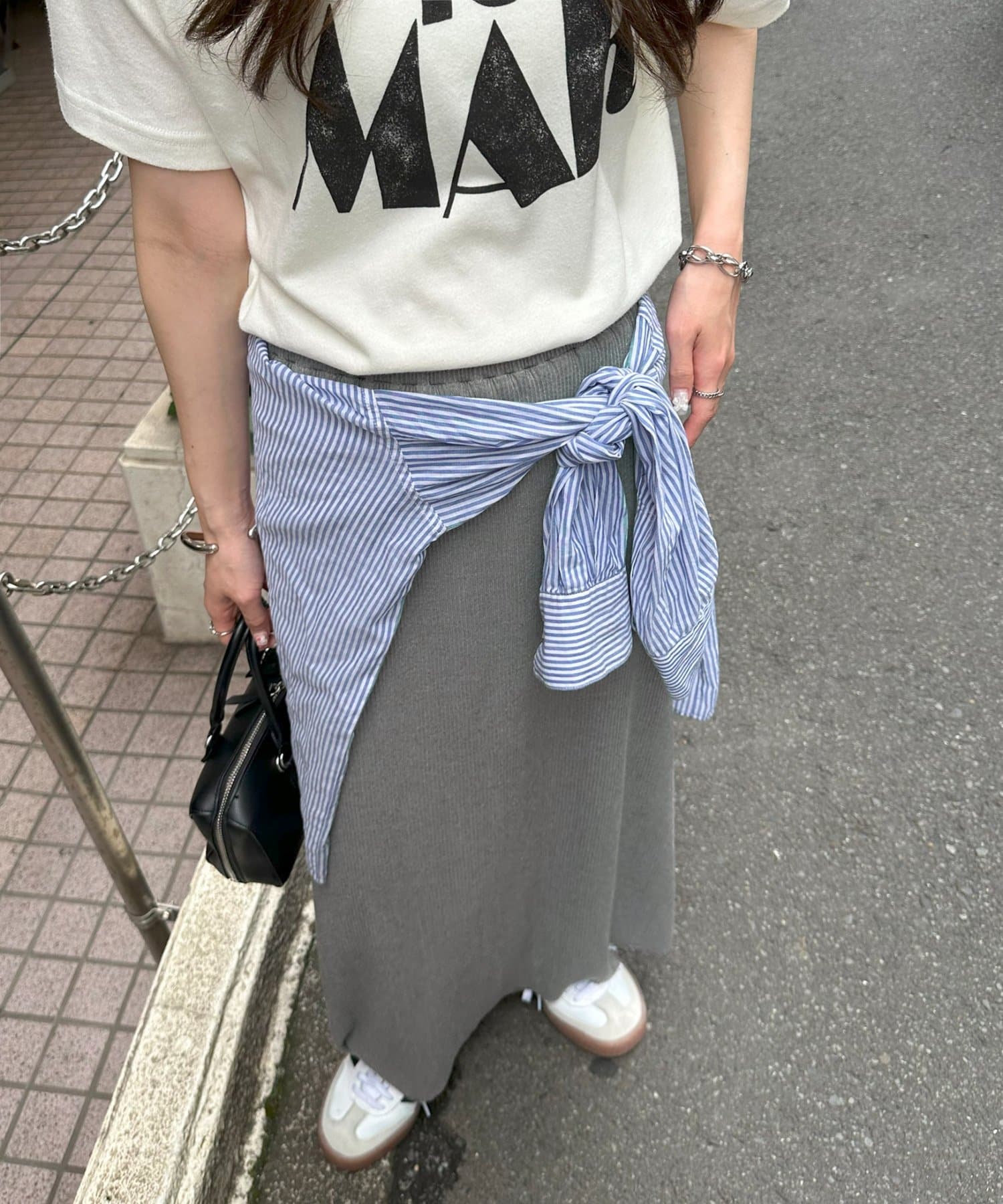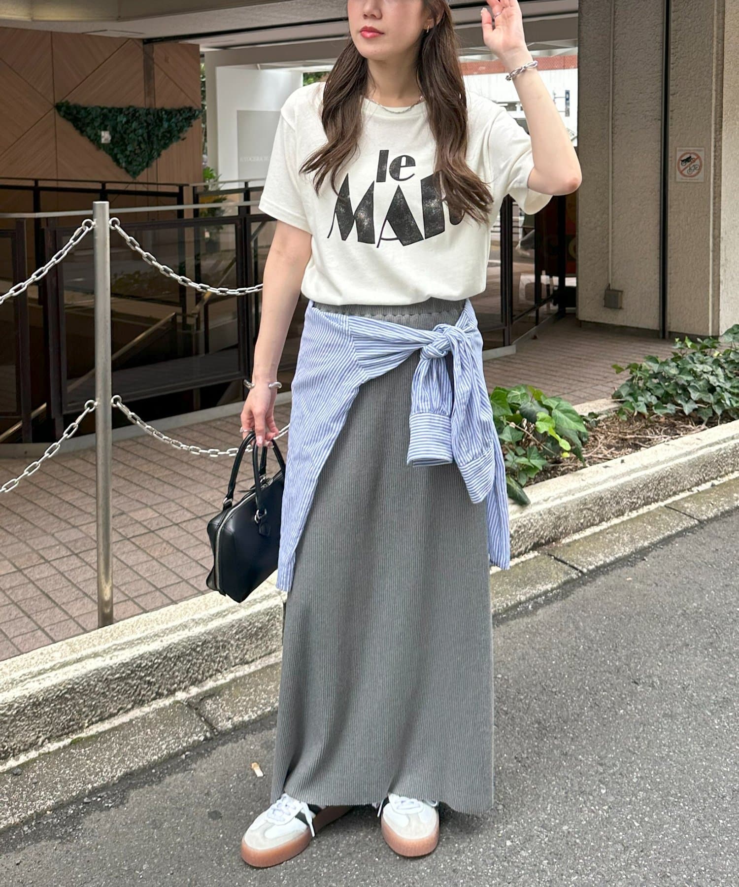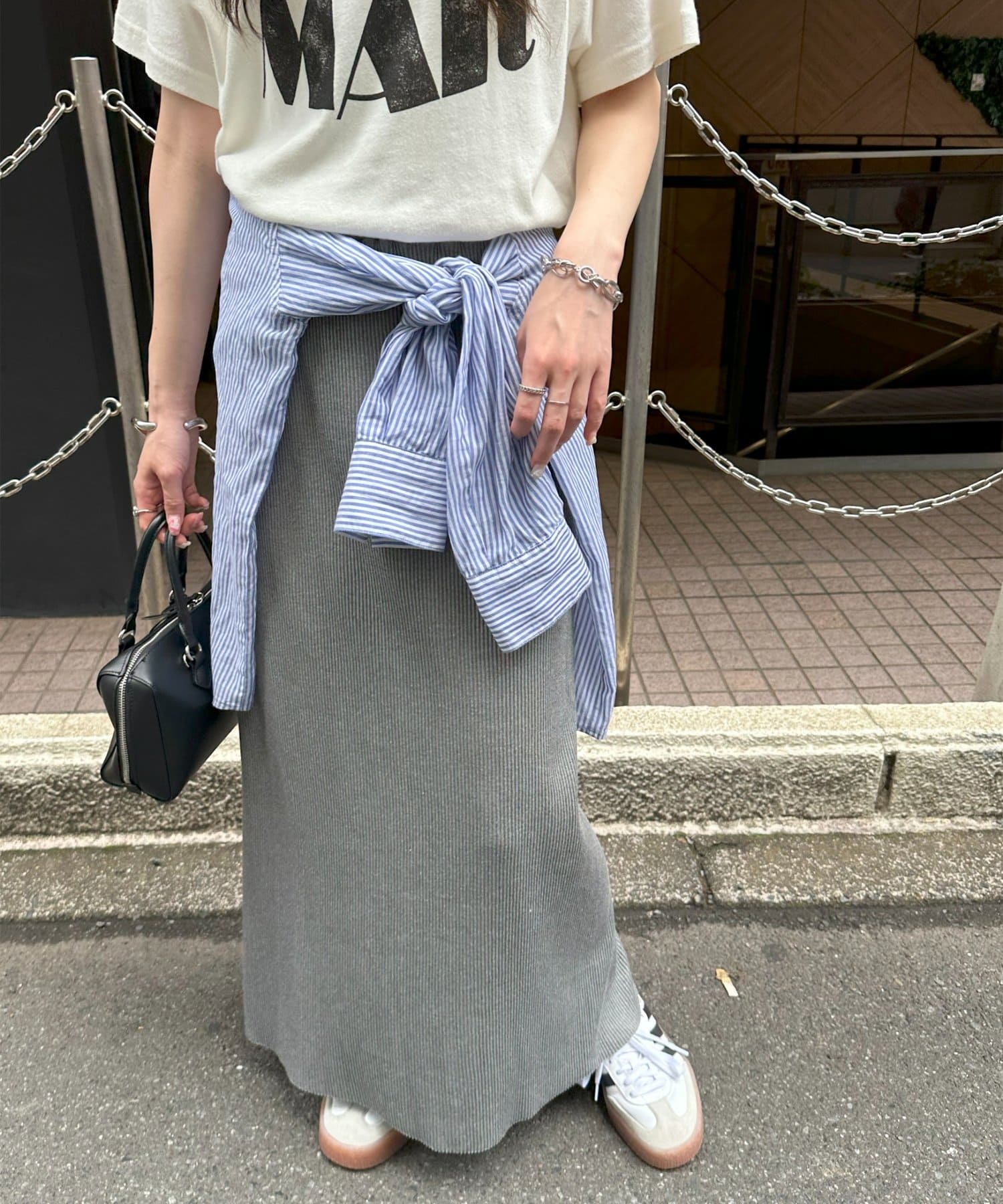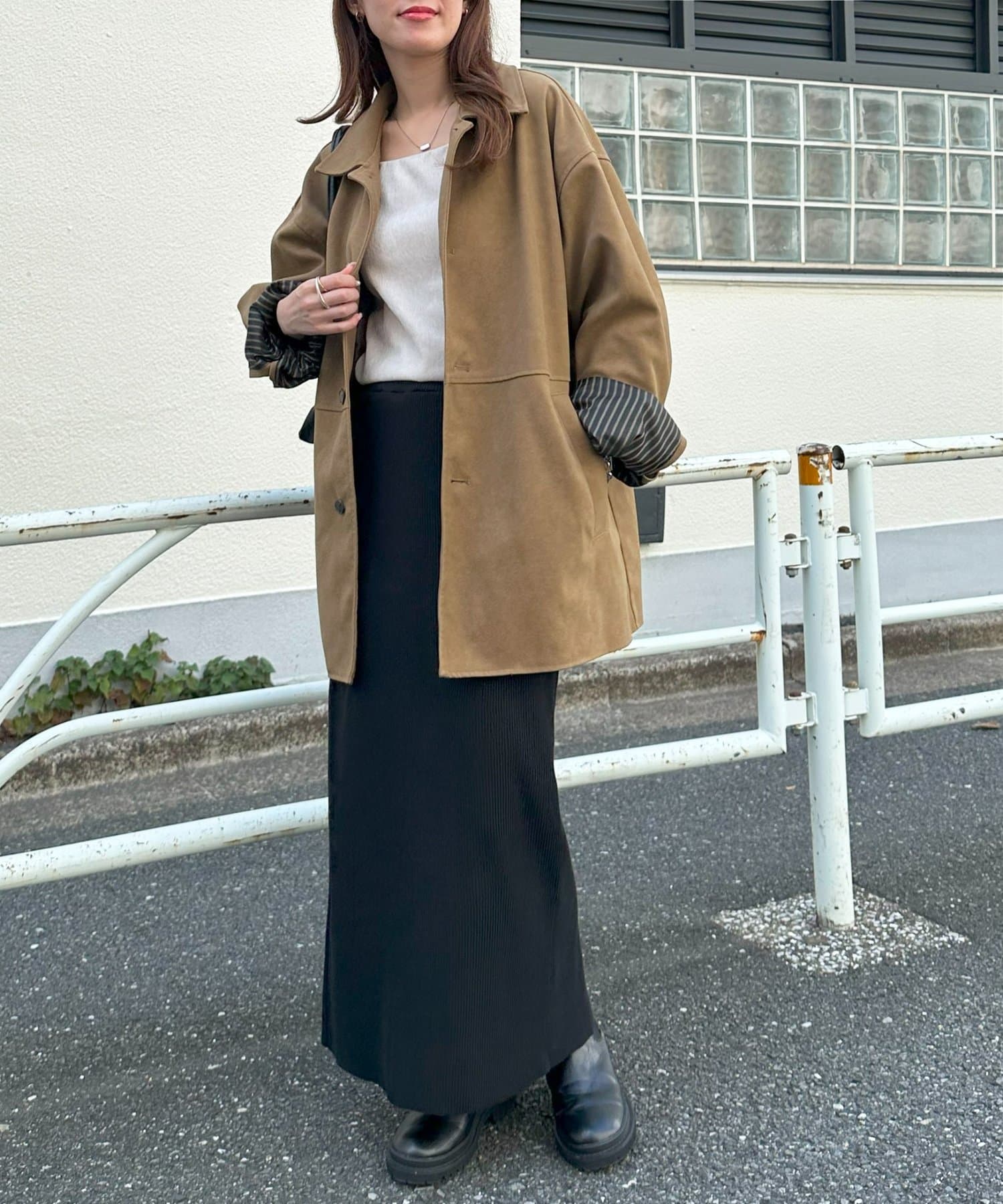 Iラインが綺麗に見えるナロースカートはゆったりとしたサイズ感のトップスと合わせることでメリハリのあるコーデが完成します♪