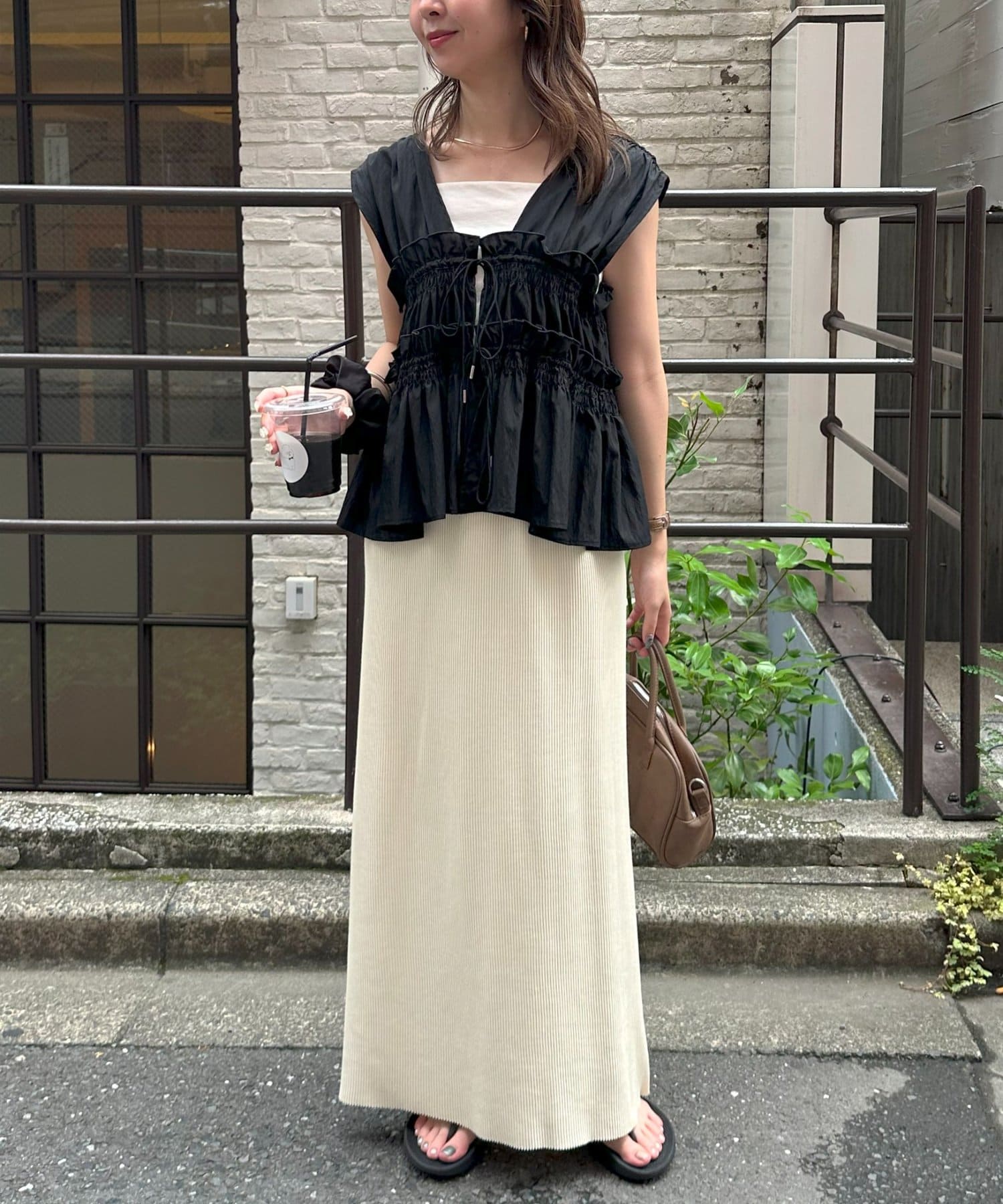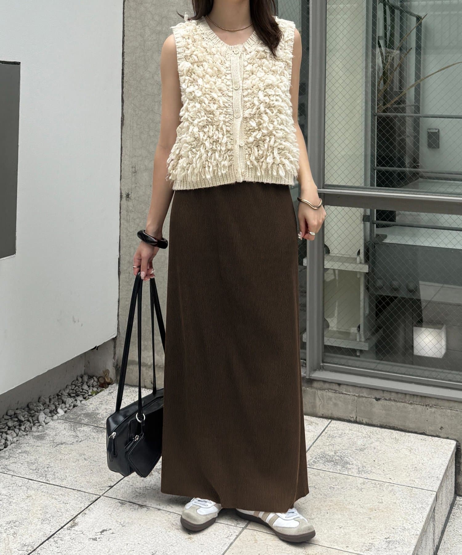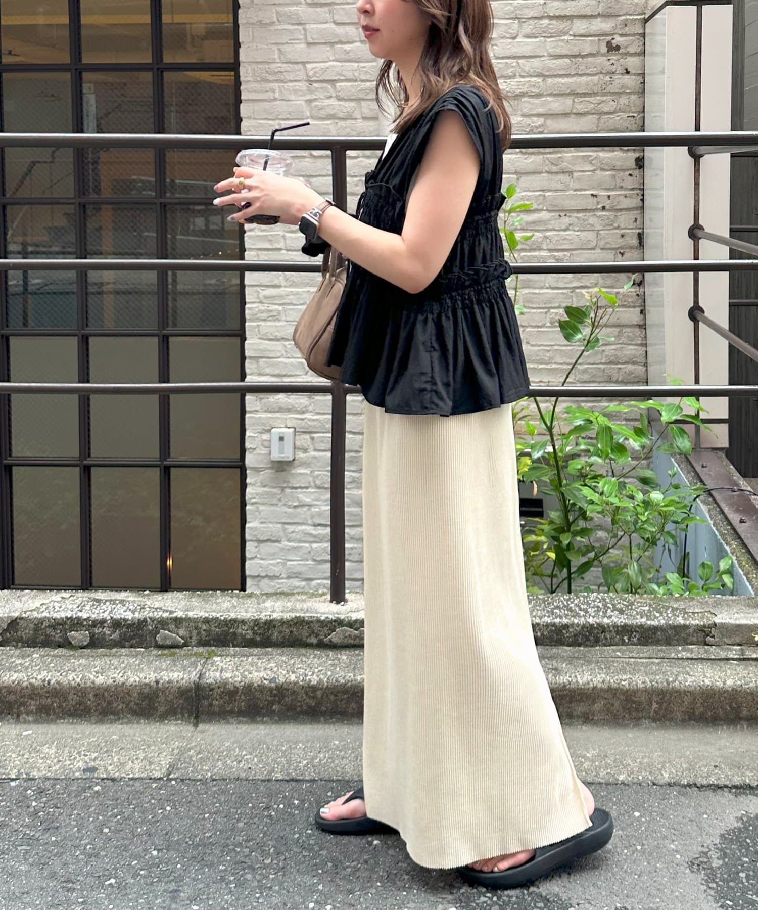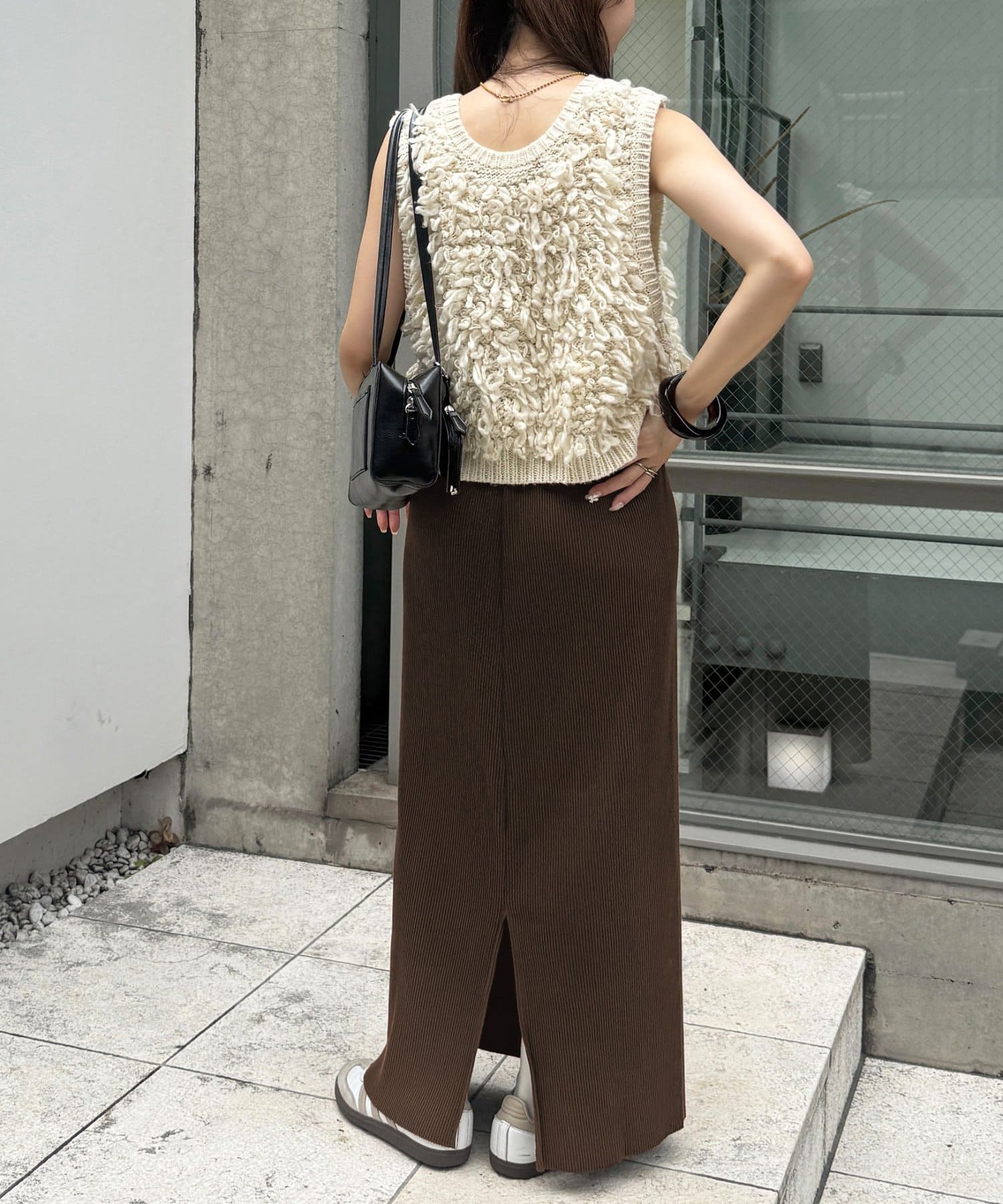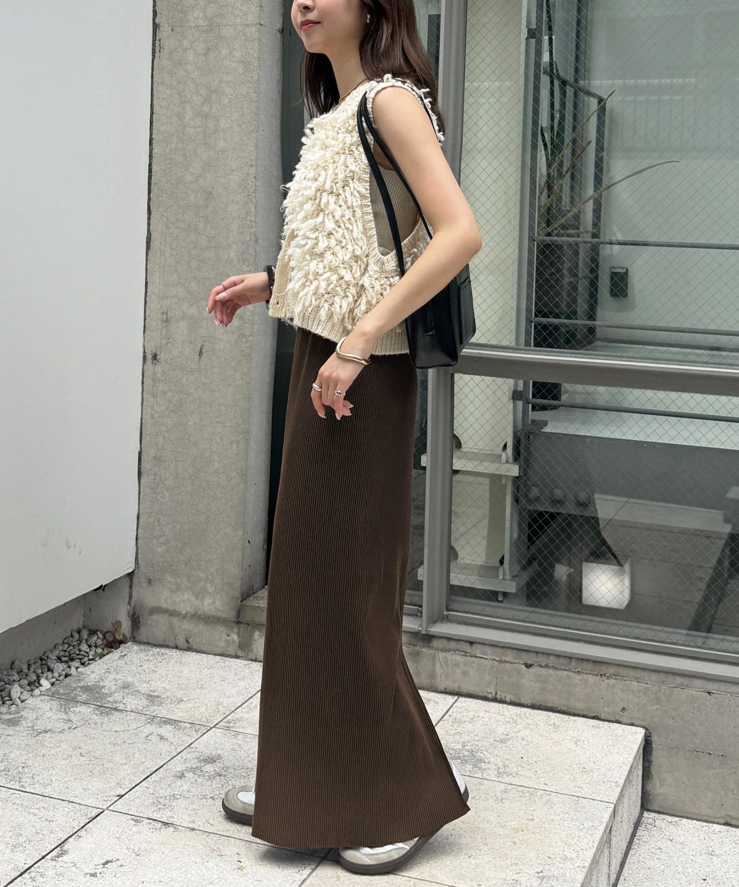 Iラインを強調したすっきりと見えるシルエットですが、凹凸感のあるリブ生地で体にフィットしすぎず着ていただけます◎