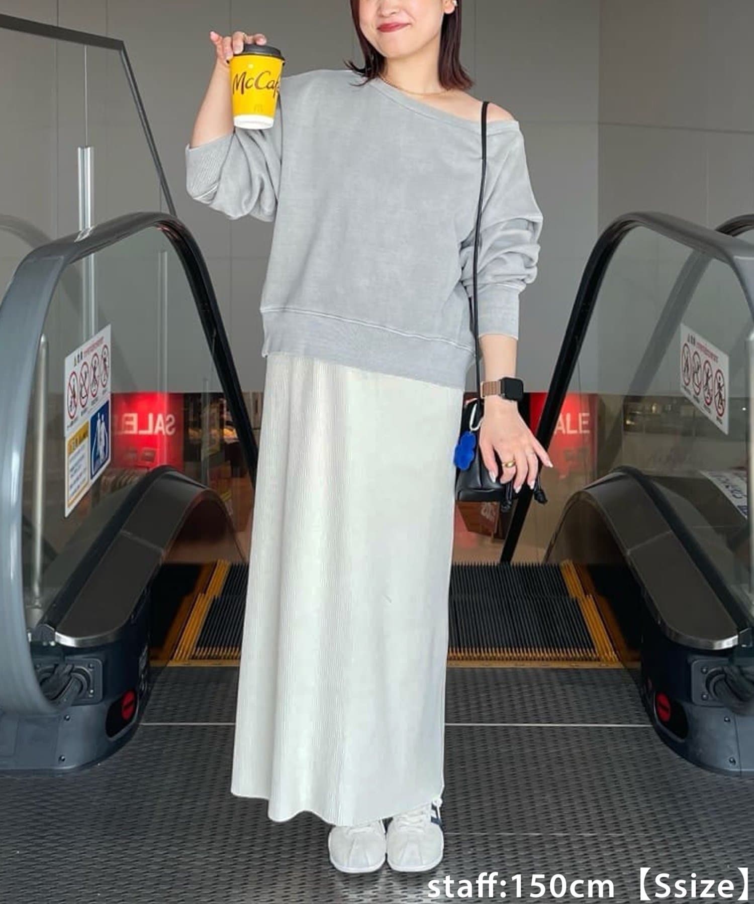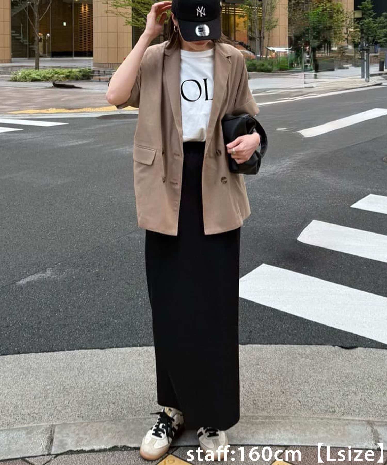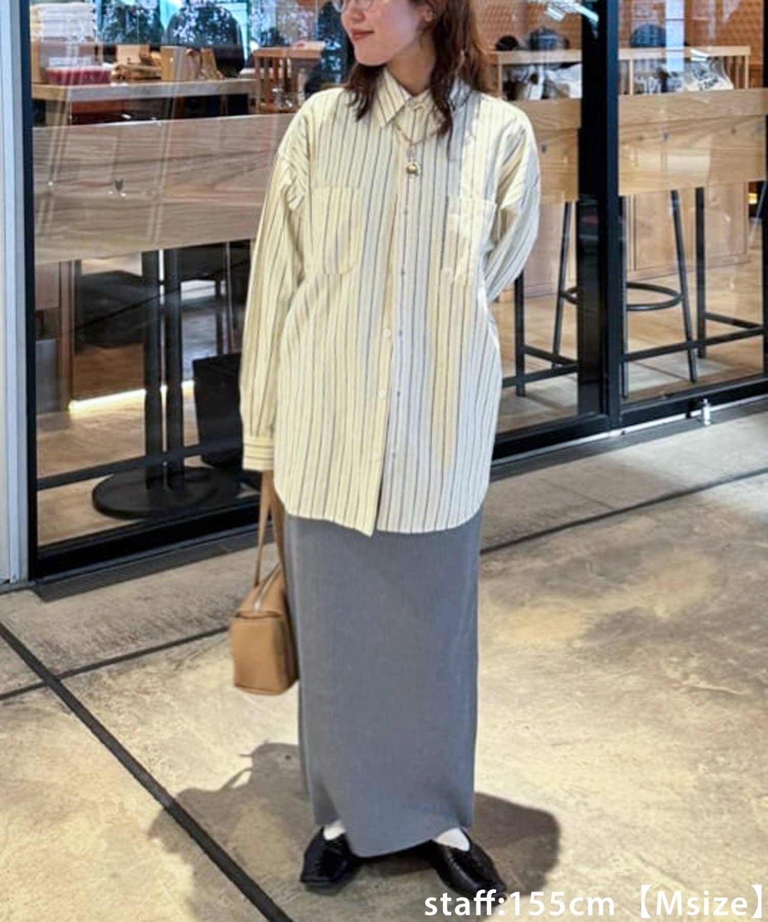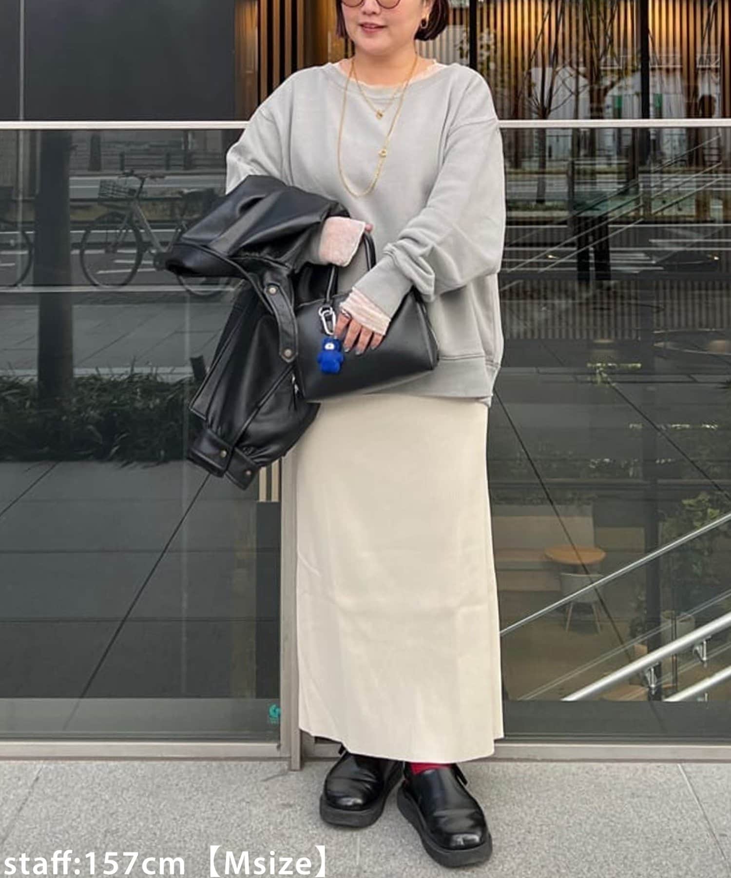 150cmスタッフ(Sサイズ着用):シンプルなデザインなので、デザインのあるトップスとも合わせられます◎