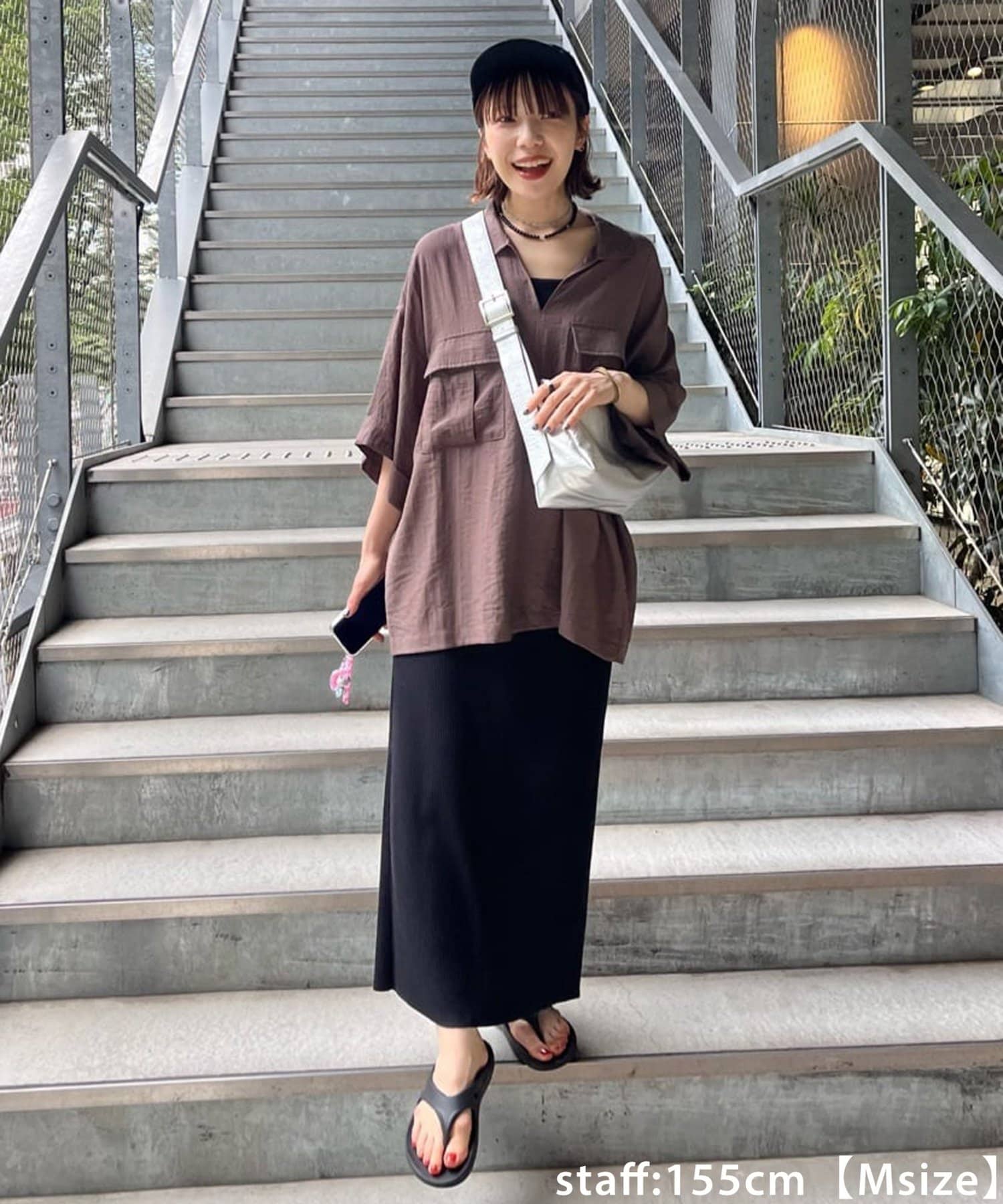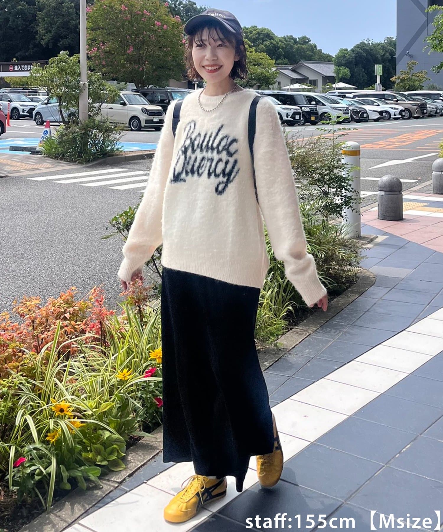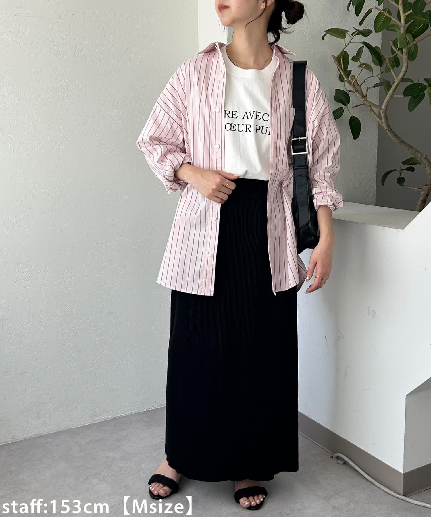 150cmスタッフ(Sサイズ着用):シンプルなデザインなので、デザインのあるトップスとも合わせられます◎