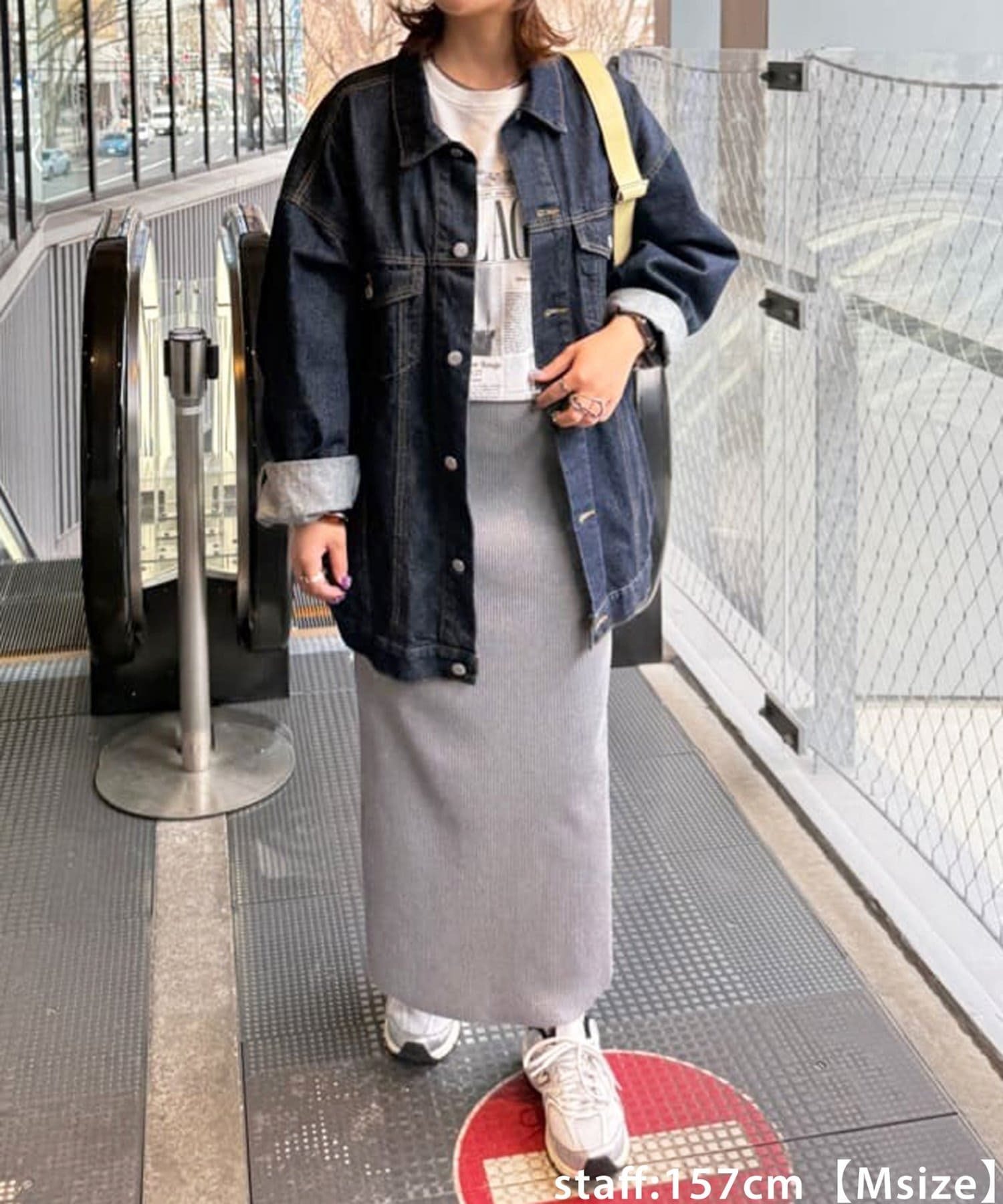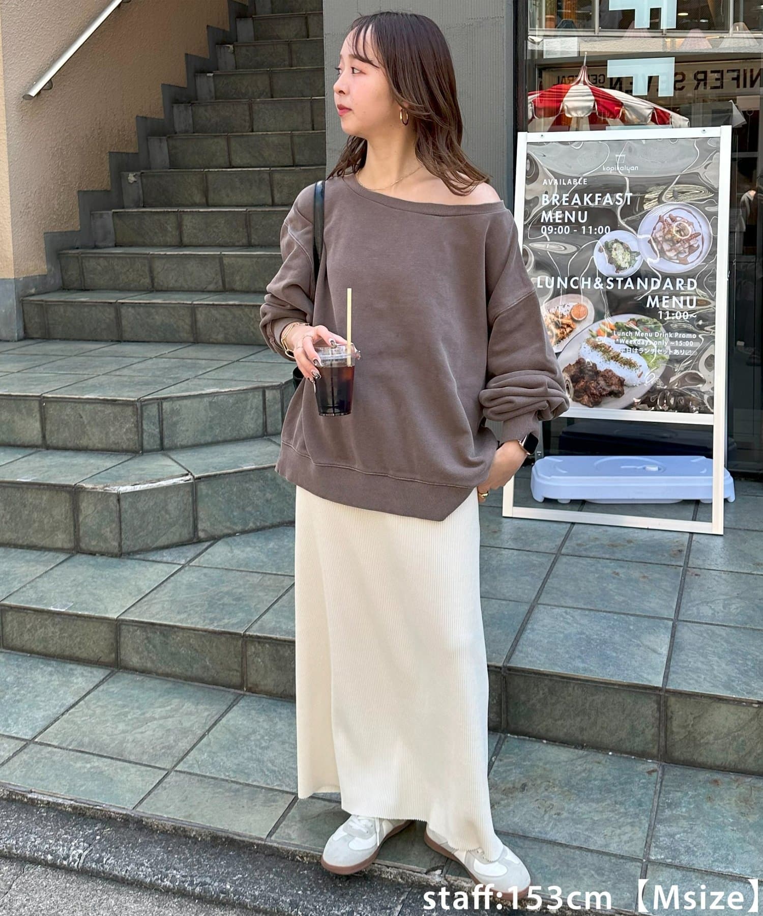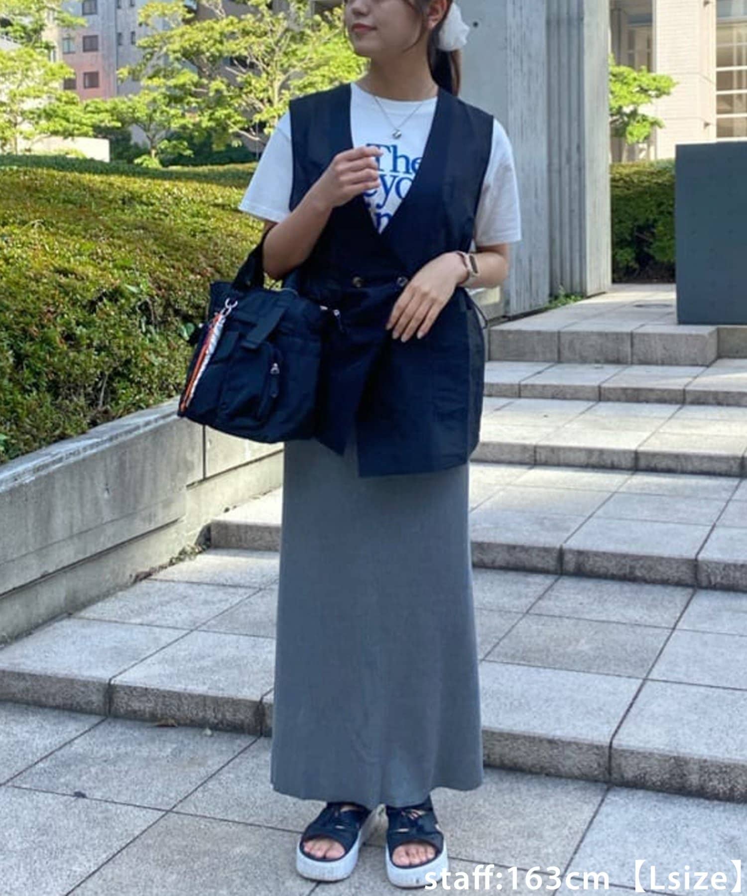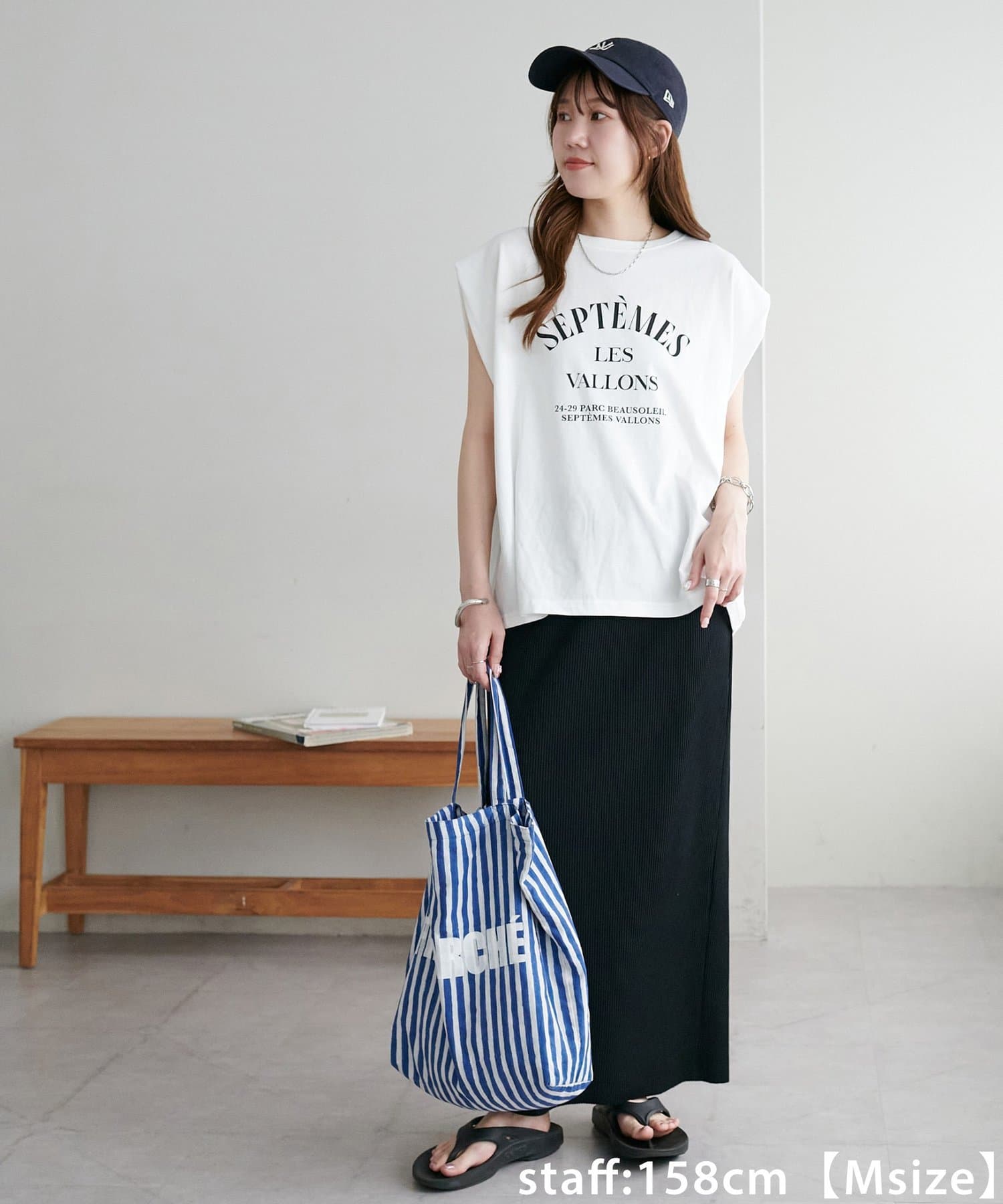 150cmスタッフ(Sサイズ着用):シンプルなデザインなので、デザインのあるトップスとも合わせられます◎