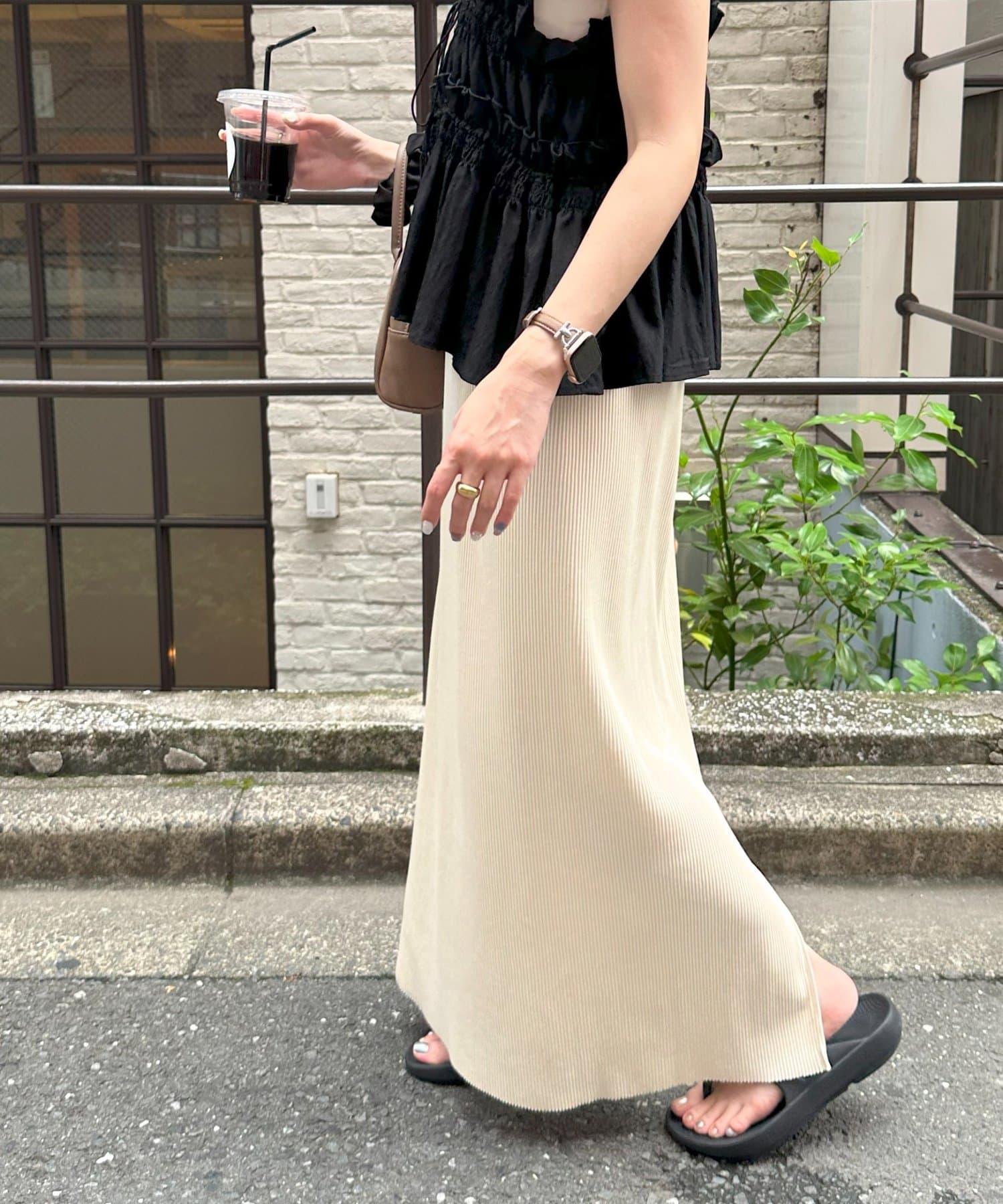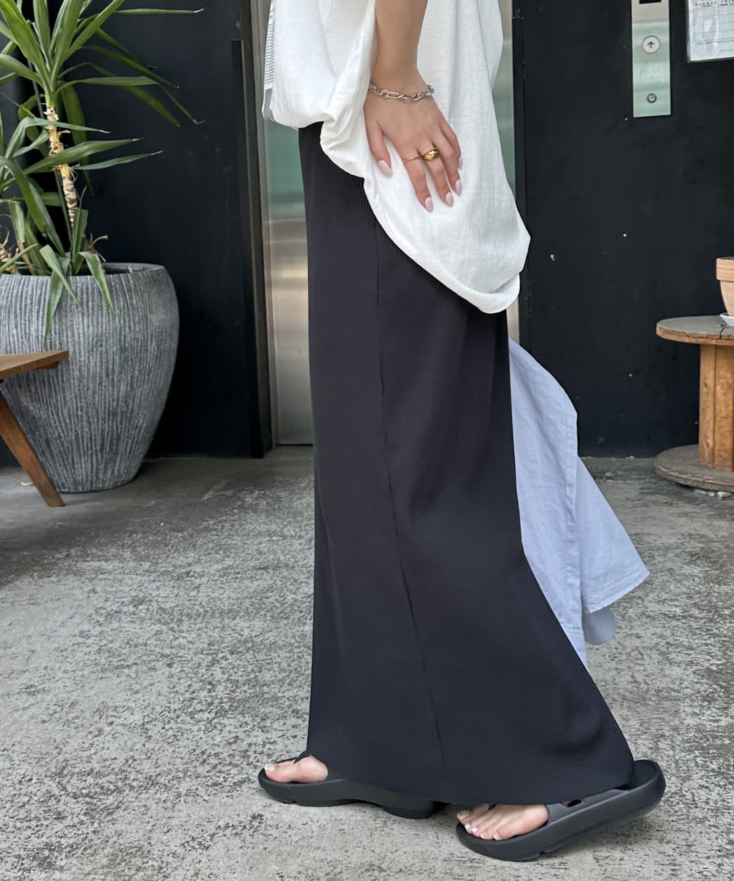 伸縮性があり、裾にスリットが入っていることで動きやすく、お出掛けコーデにもぴったり◎