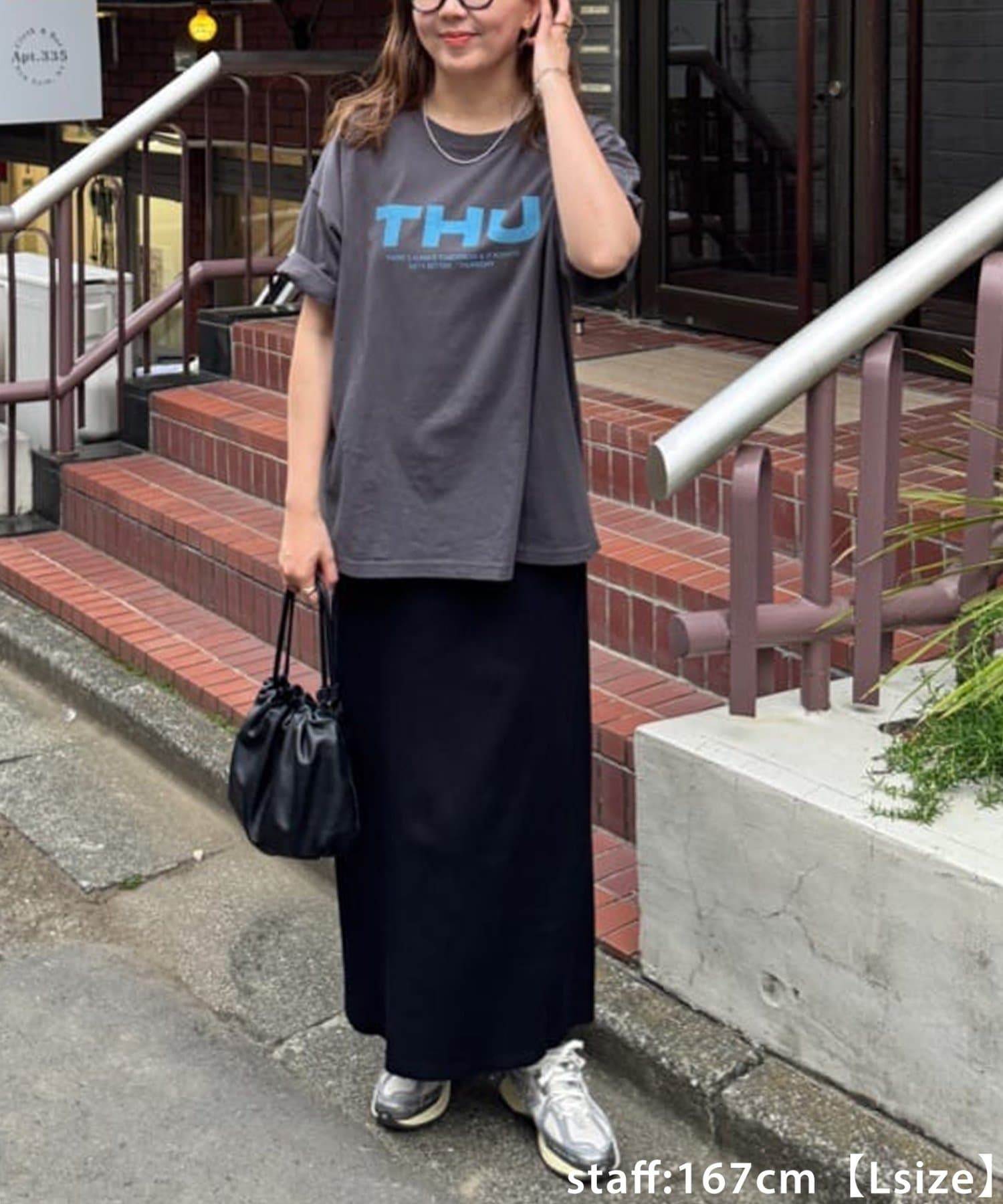 150cmスタッフ(Sサイズ着用):シンプルなデザインなので、デザインのあるトップスとも合わせられます◎サイズ展開がSサイズからあるのも低身長には嬉しいポイント♪Sサイズでスニーカーと合わせても安心の着丈です!