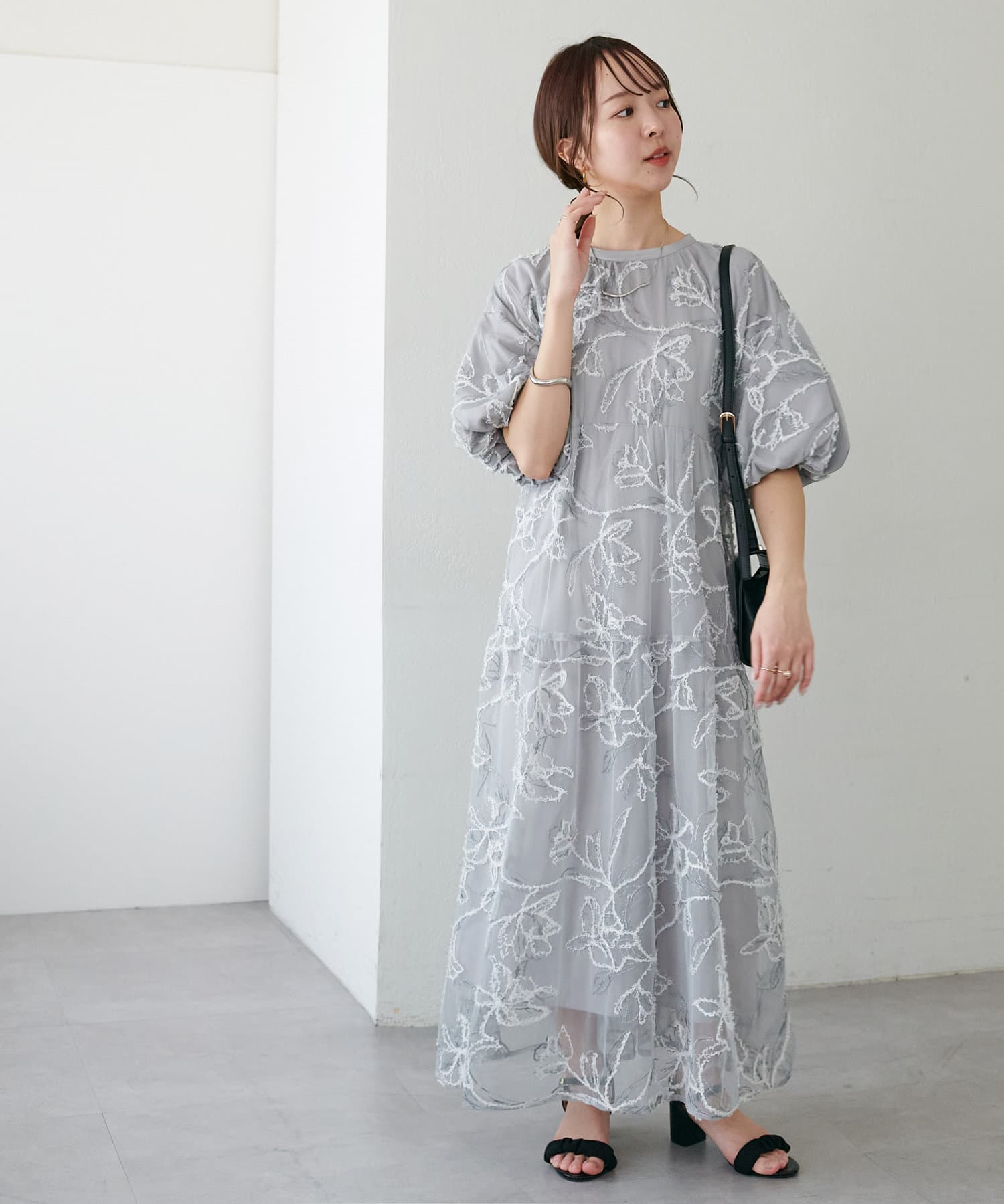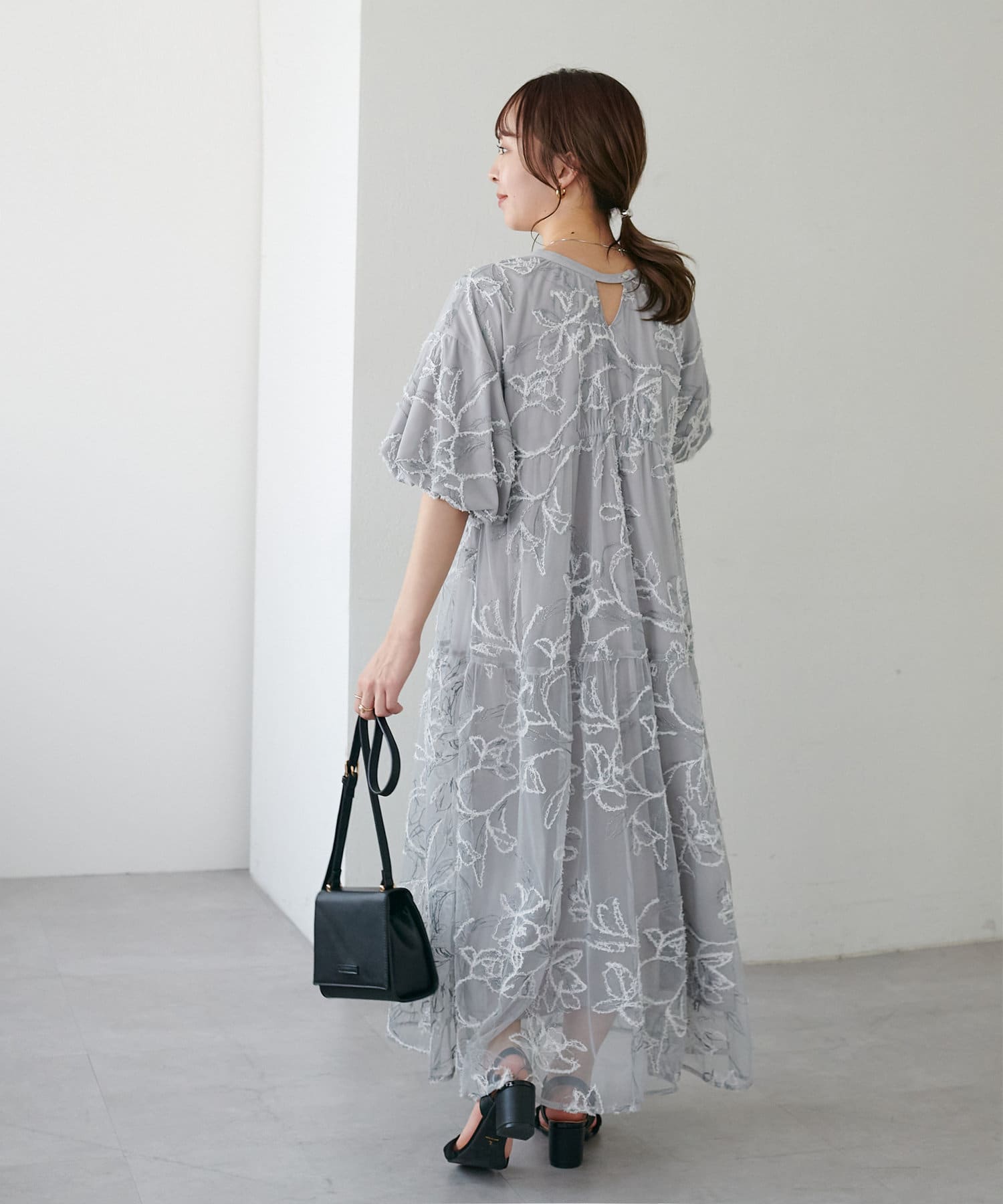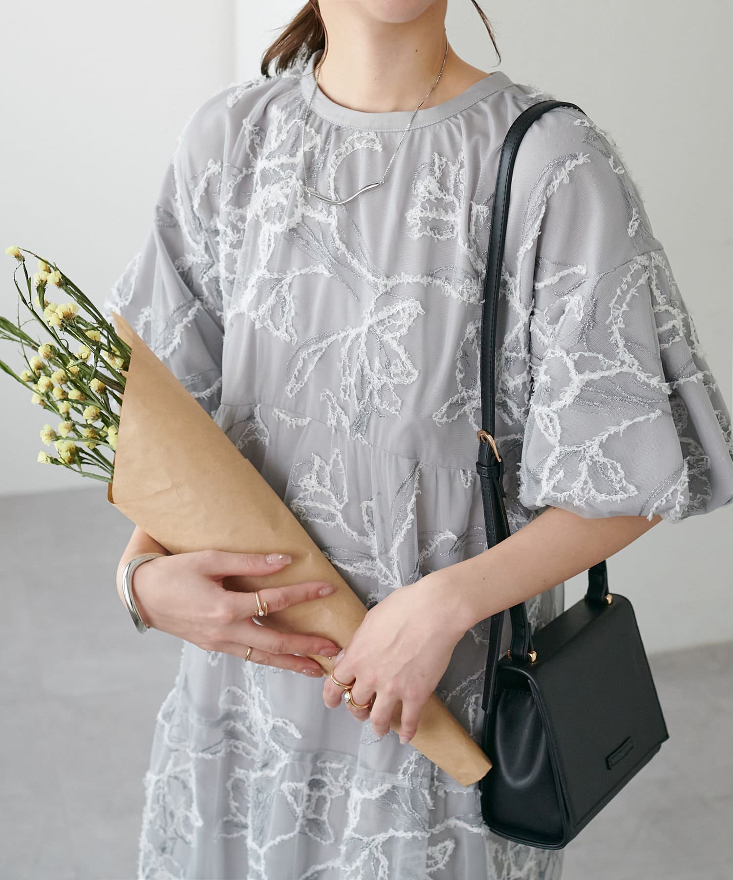 【オケージョン】フェザーフラワー袖バルーンワンピース《前後2WAY》