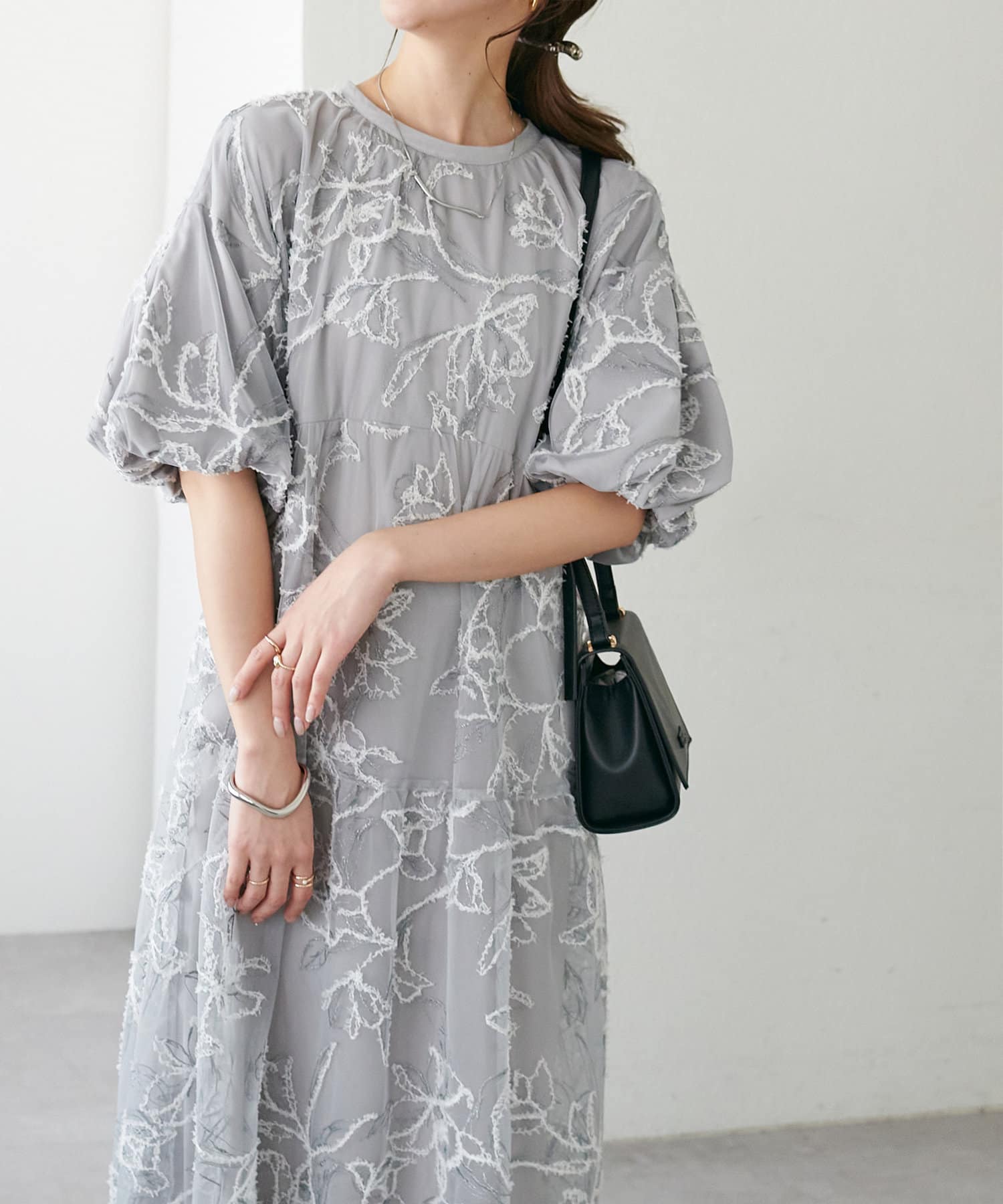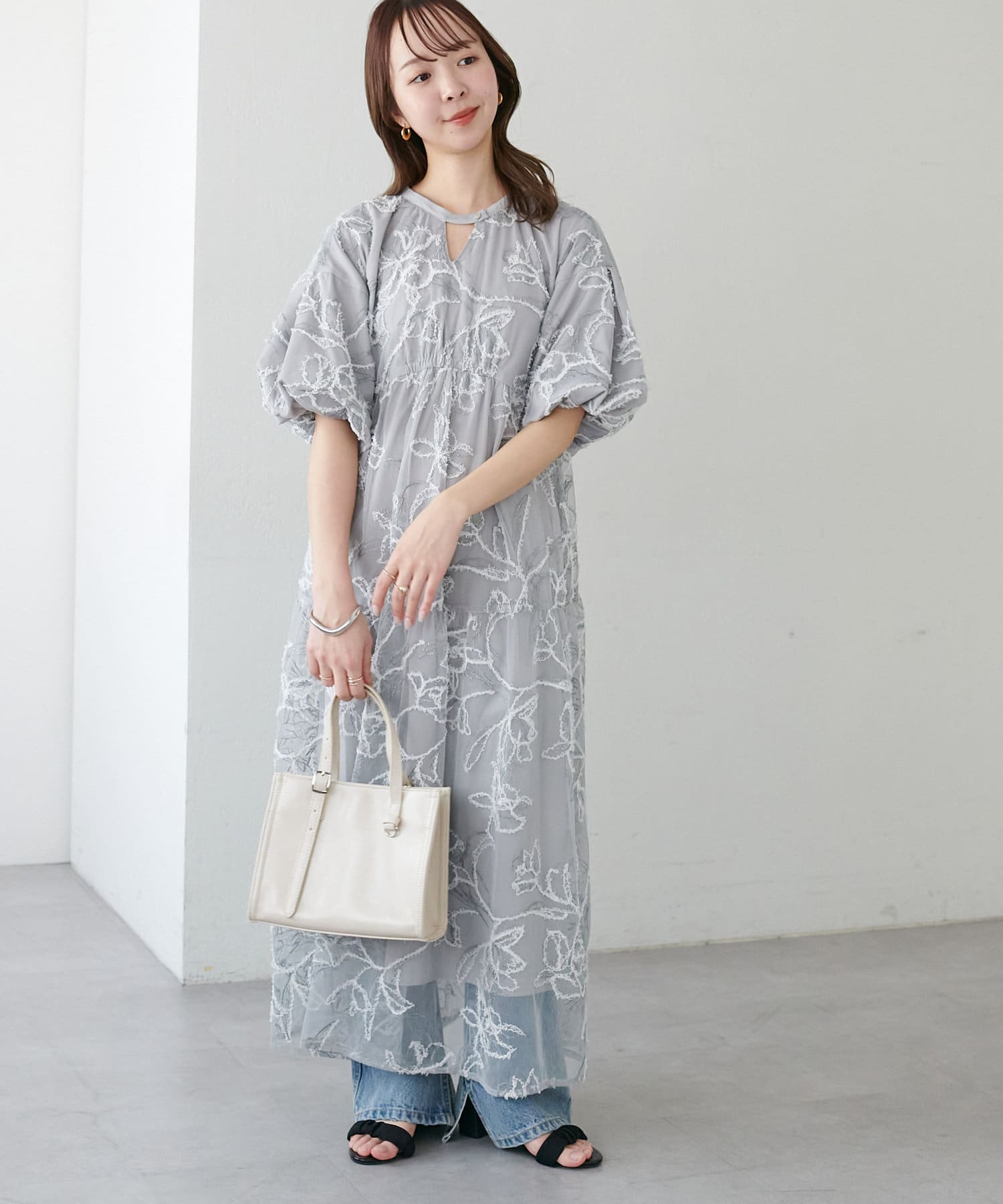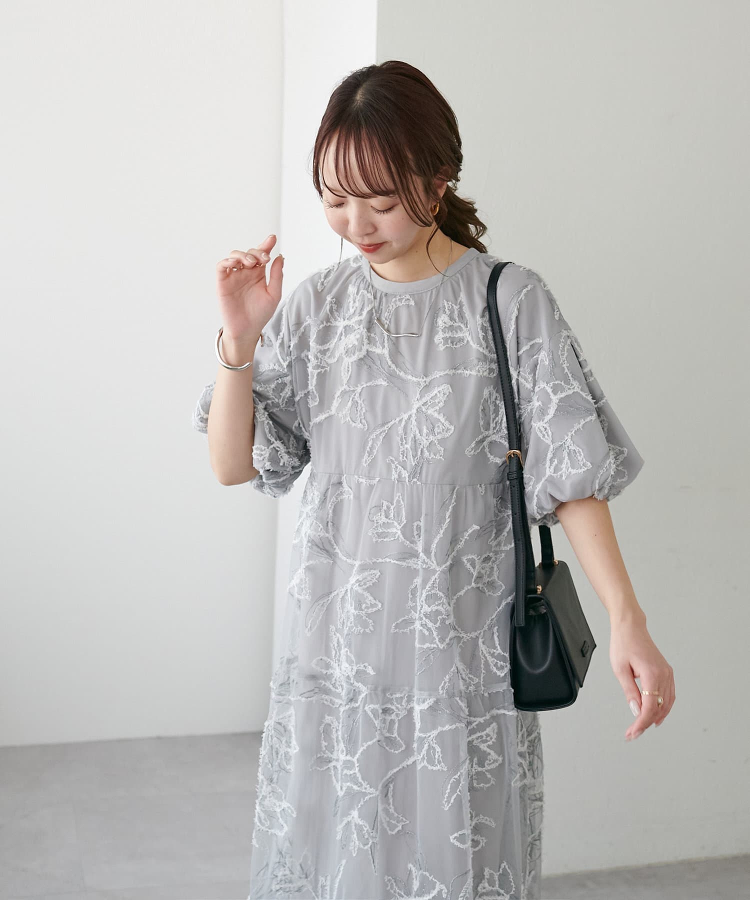 【オケージョン】フェザーフラワー袖バルーンワンピース《前後2WAY》