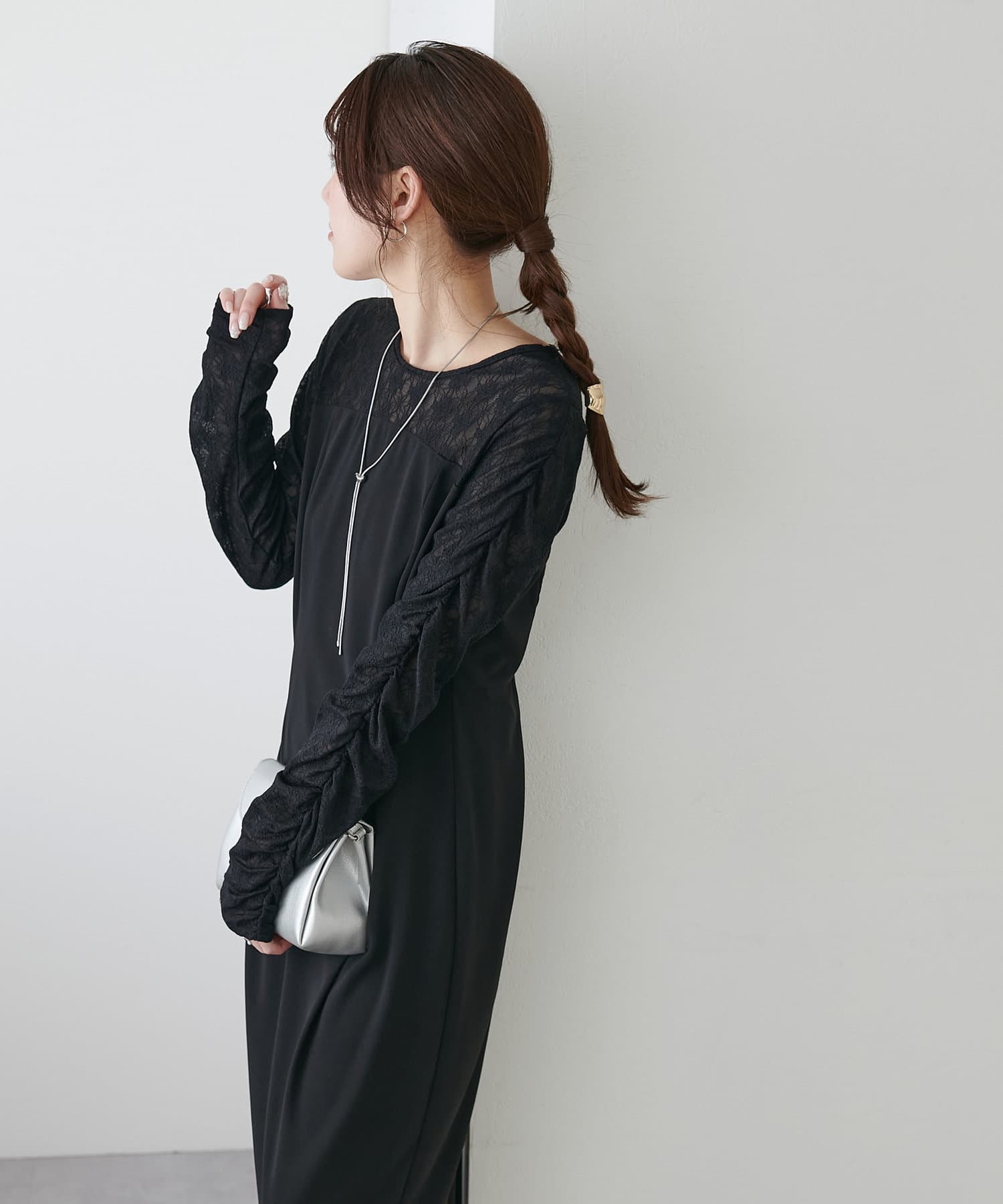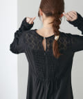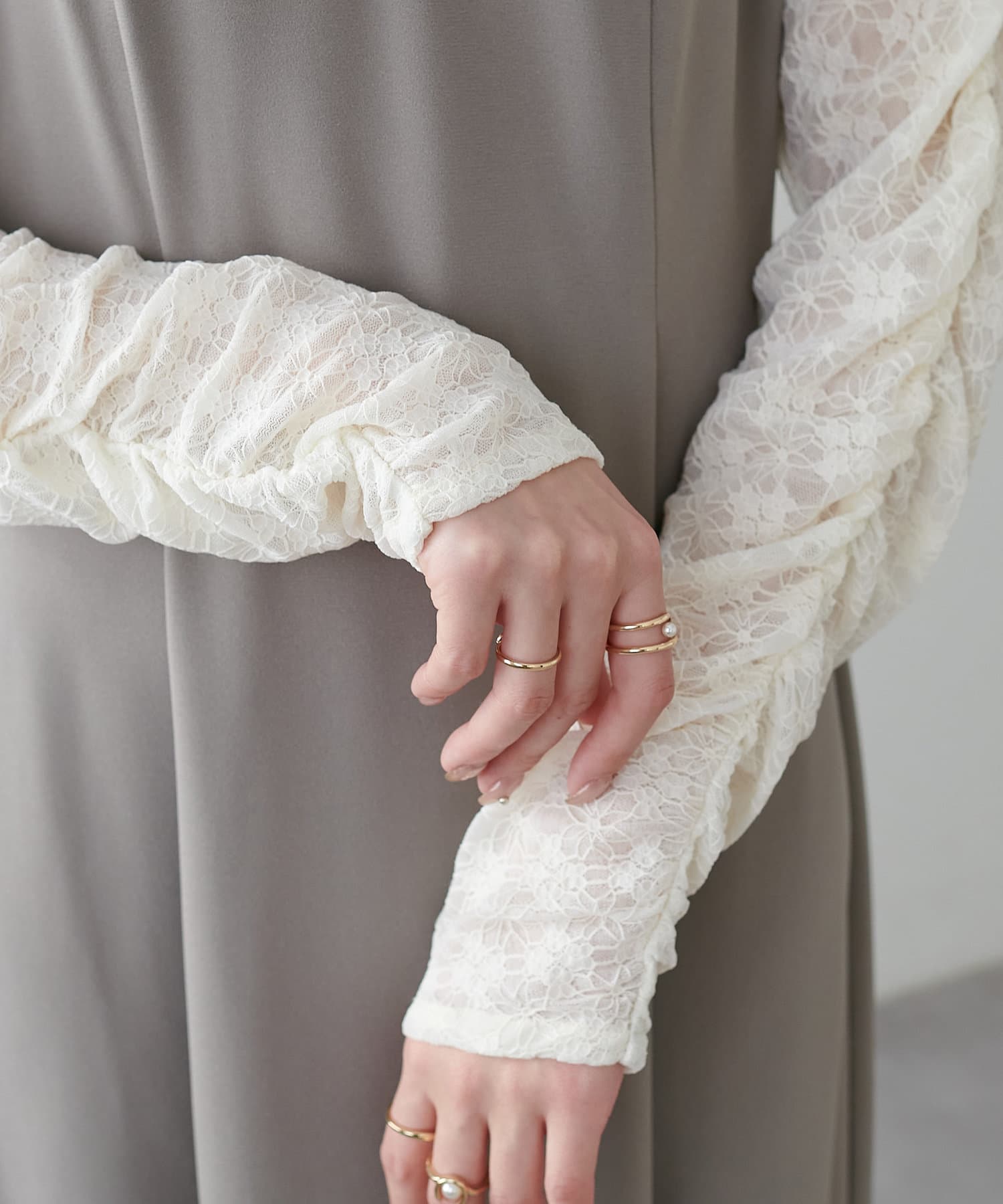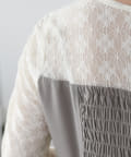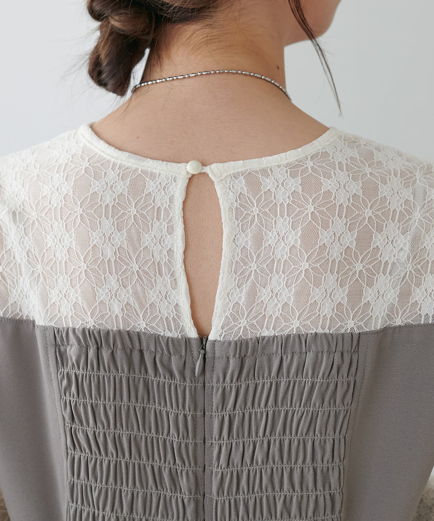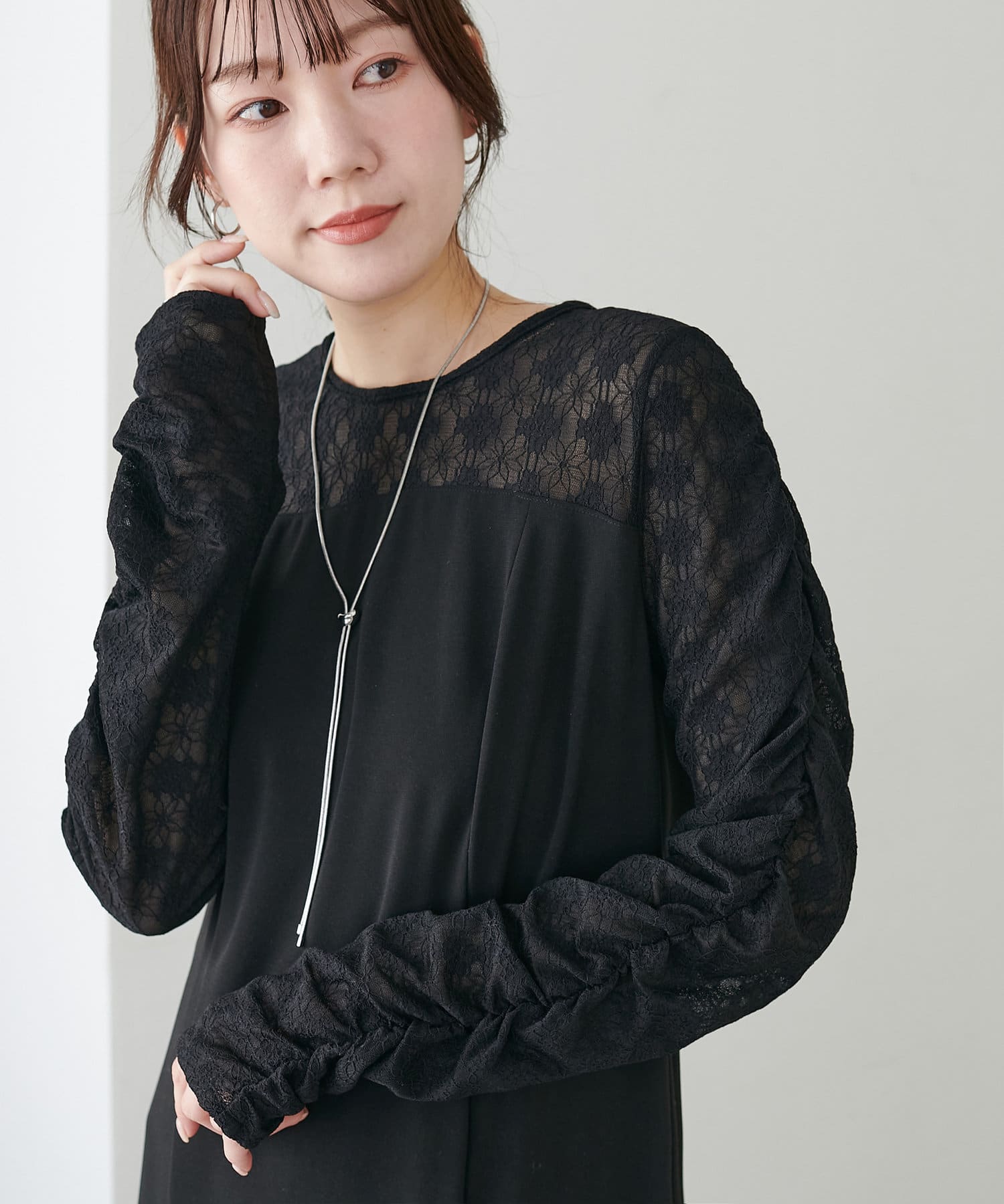 襟元から袖にかけたレースデザインが程よい透け感でヘルシーな肌見せを叶えます。袖のギャザーデザインもポイントです。胸元からタックを施すことで、立体感がでてきれいなシルエットに◎バックスリットも入っているので足捌きもしやすくストレスフリーの着心地です。