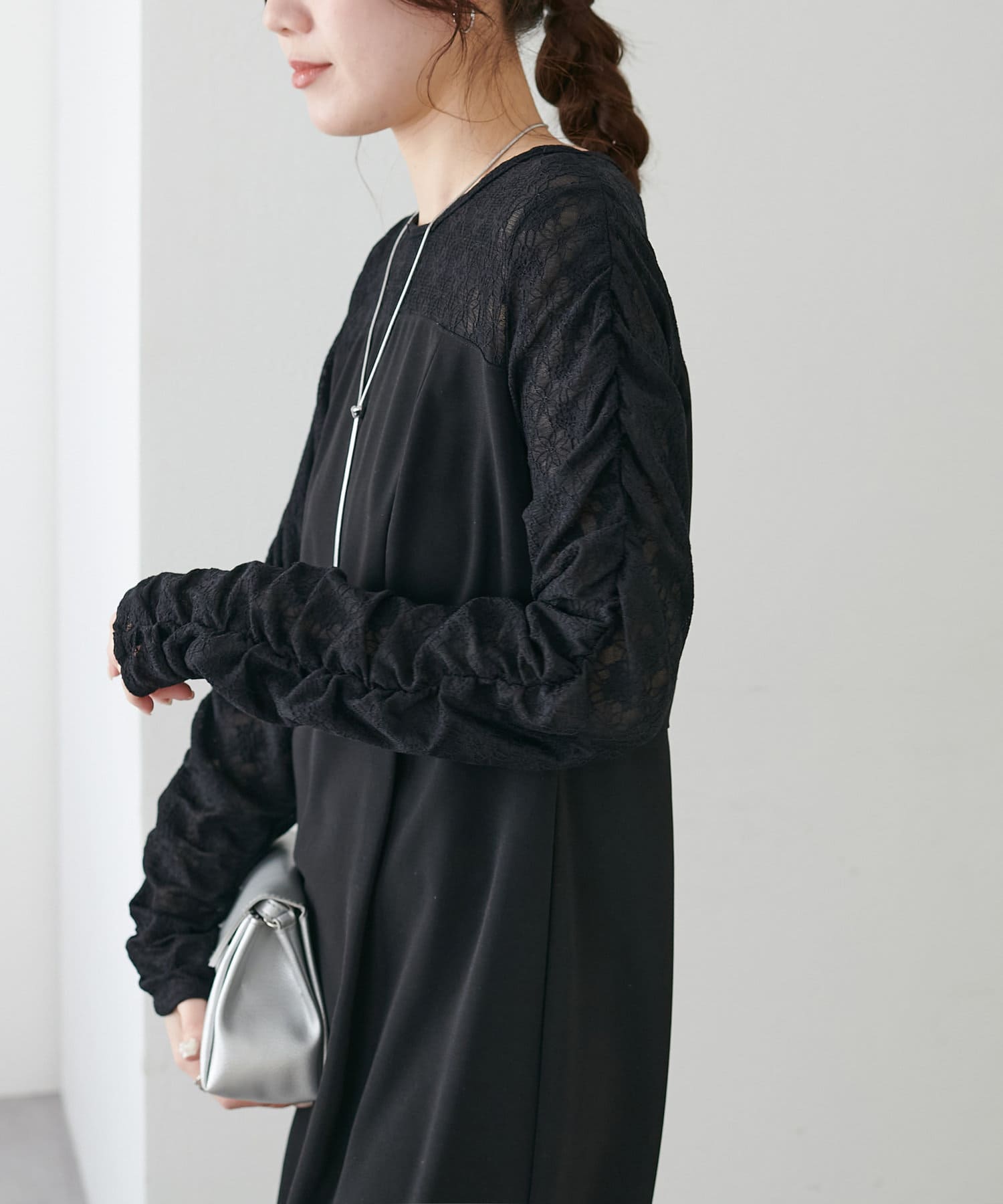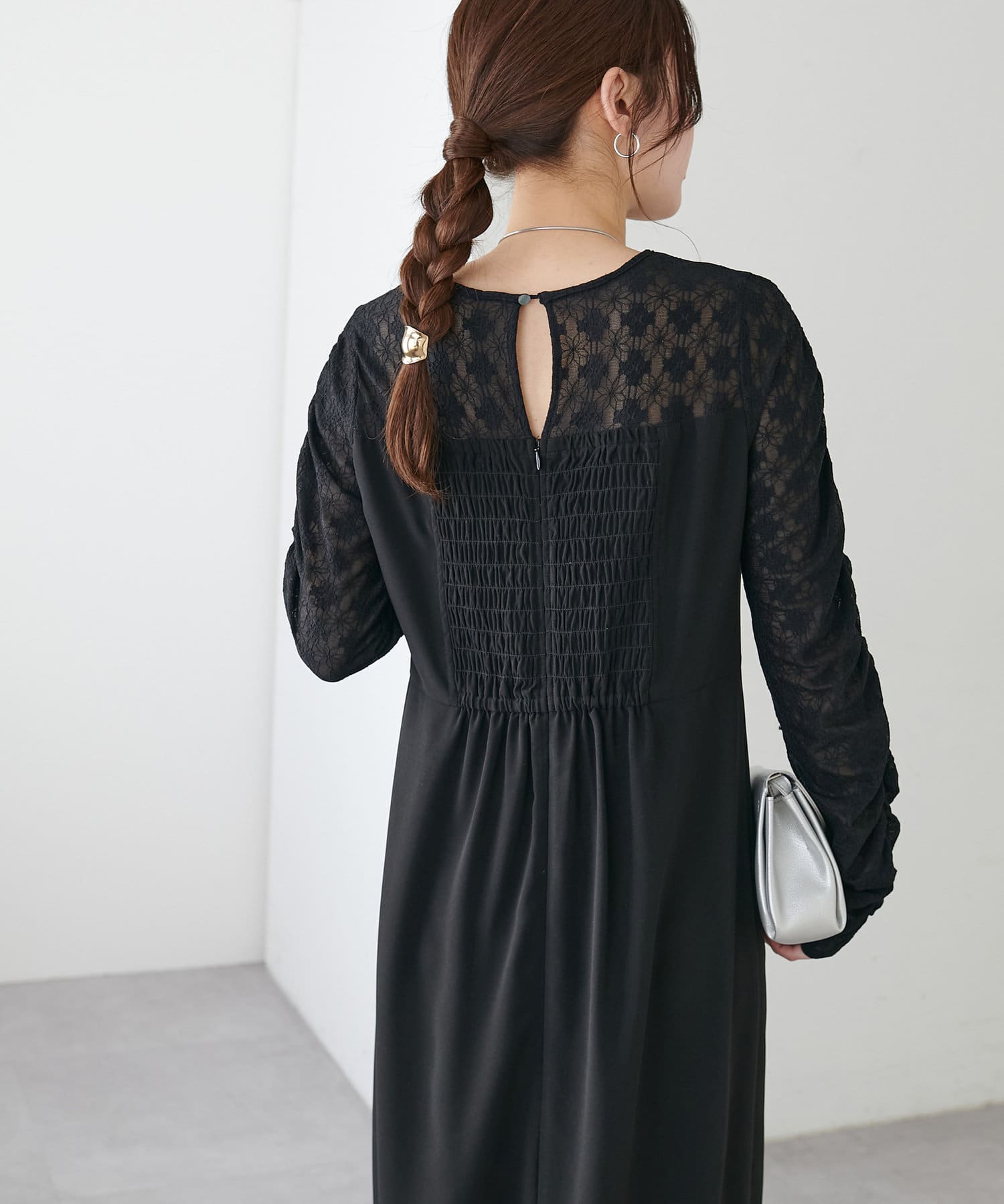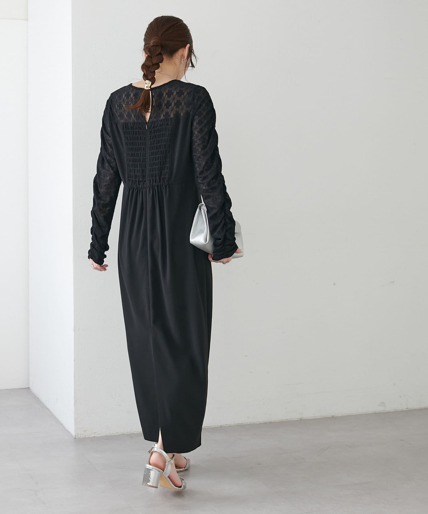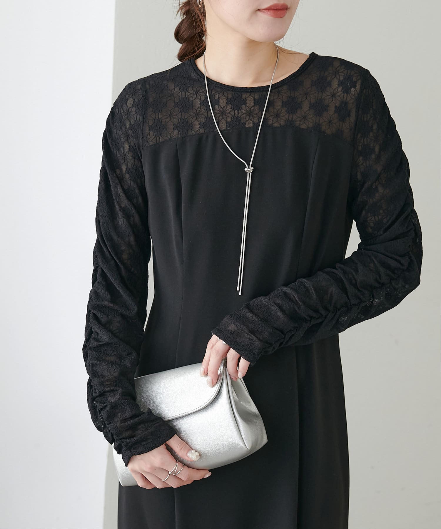 襟元から袖にかけたレースデザインが程よい透け感でヘルシーな肌見せを叶えます。袖のギャザーデザインもポイントです。胸元からタックを施すことで、立体感がでてきれいなシルエットに◎バックスリットも入っているので足捌きもしやすくストレスフリーの着心地です。