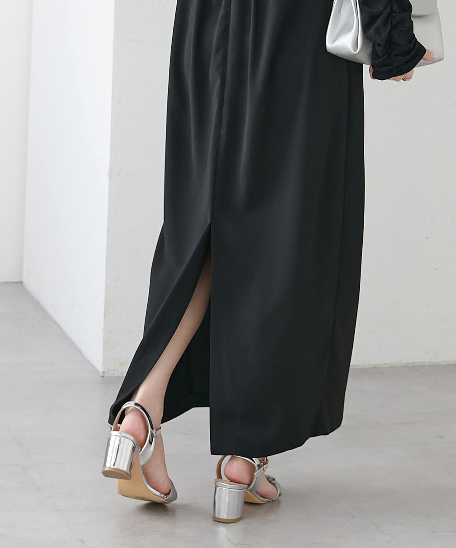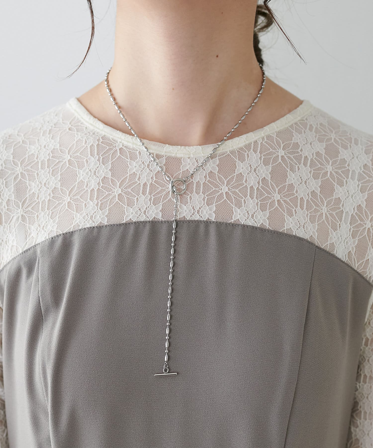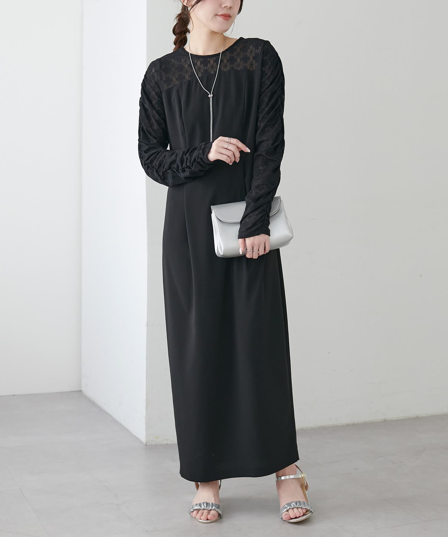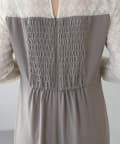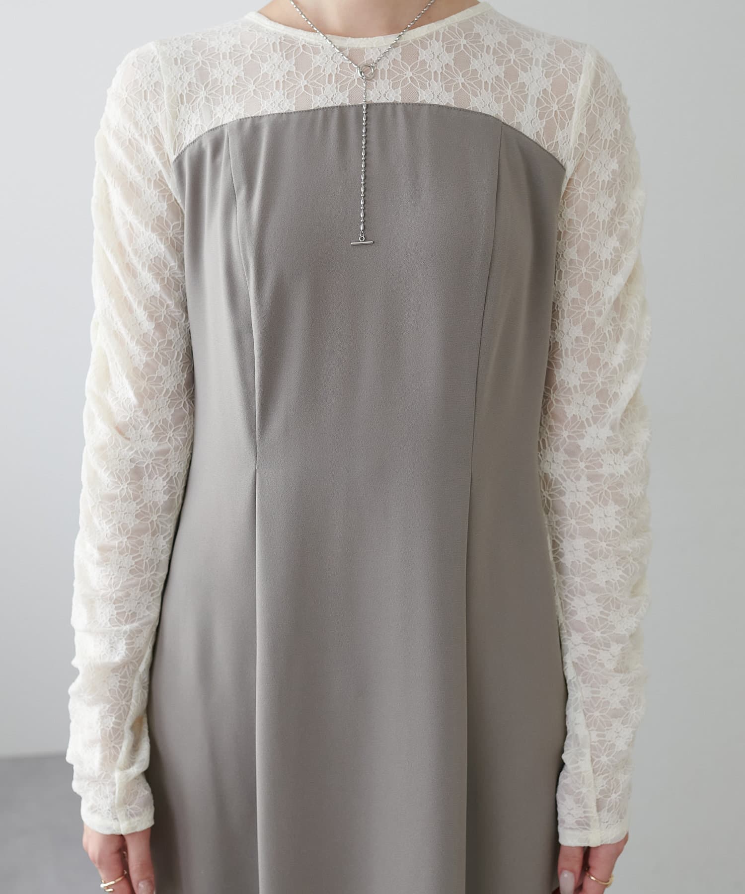 襟元から袖にかけたレースデザインが程よい透け感でヘルシーな肌見せを叶えます。袖のギャザーデザインもポイントです。胸元からタックを施すことで、立体感がでてきれいなシルエットに◎バックスリットも入っているので足捌きもしやすくストレスフリーの着心地です。