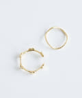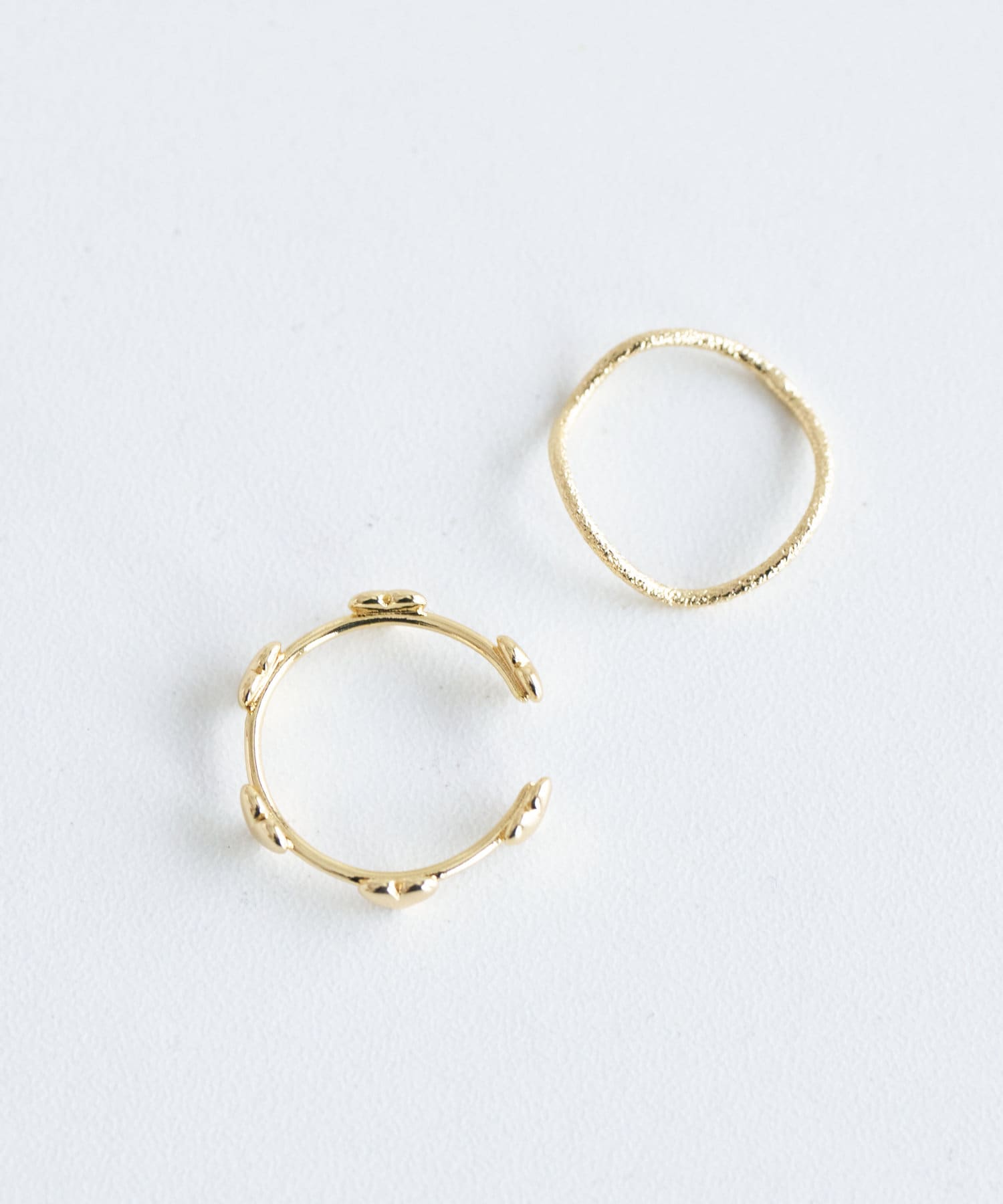 ミニマムサイズのハートが連なるかわいらしいリングと、控えめな輝きが美しいシンプルリングのセット。2つの異なるデザインが重なり合い、指先にさりげない個性と上品さをプラスします。