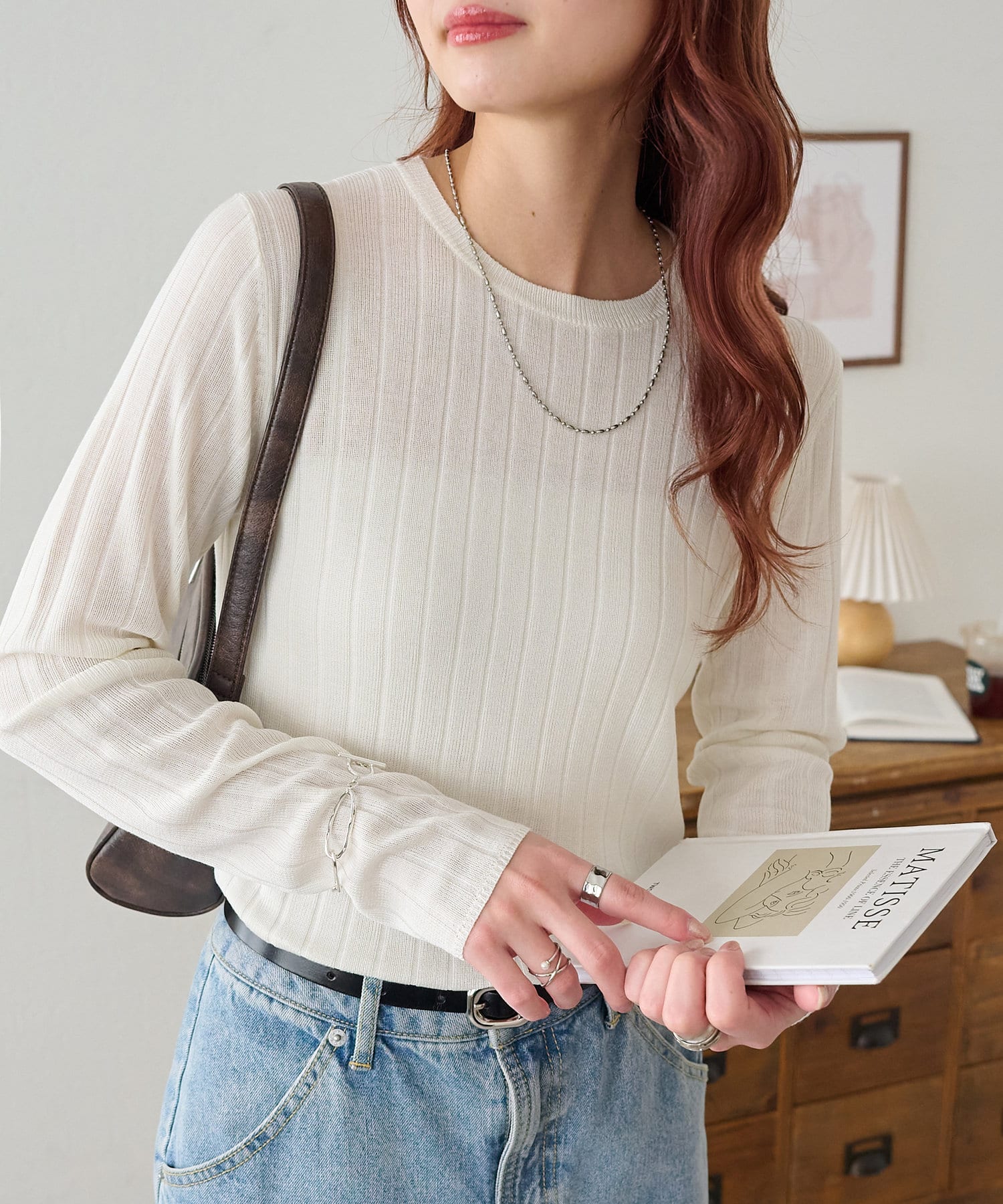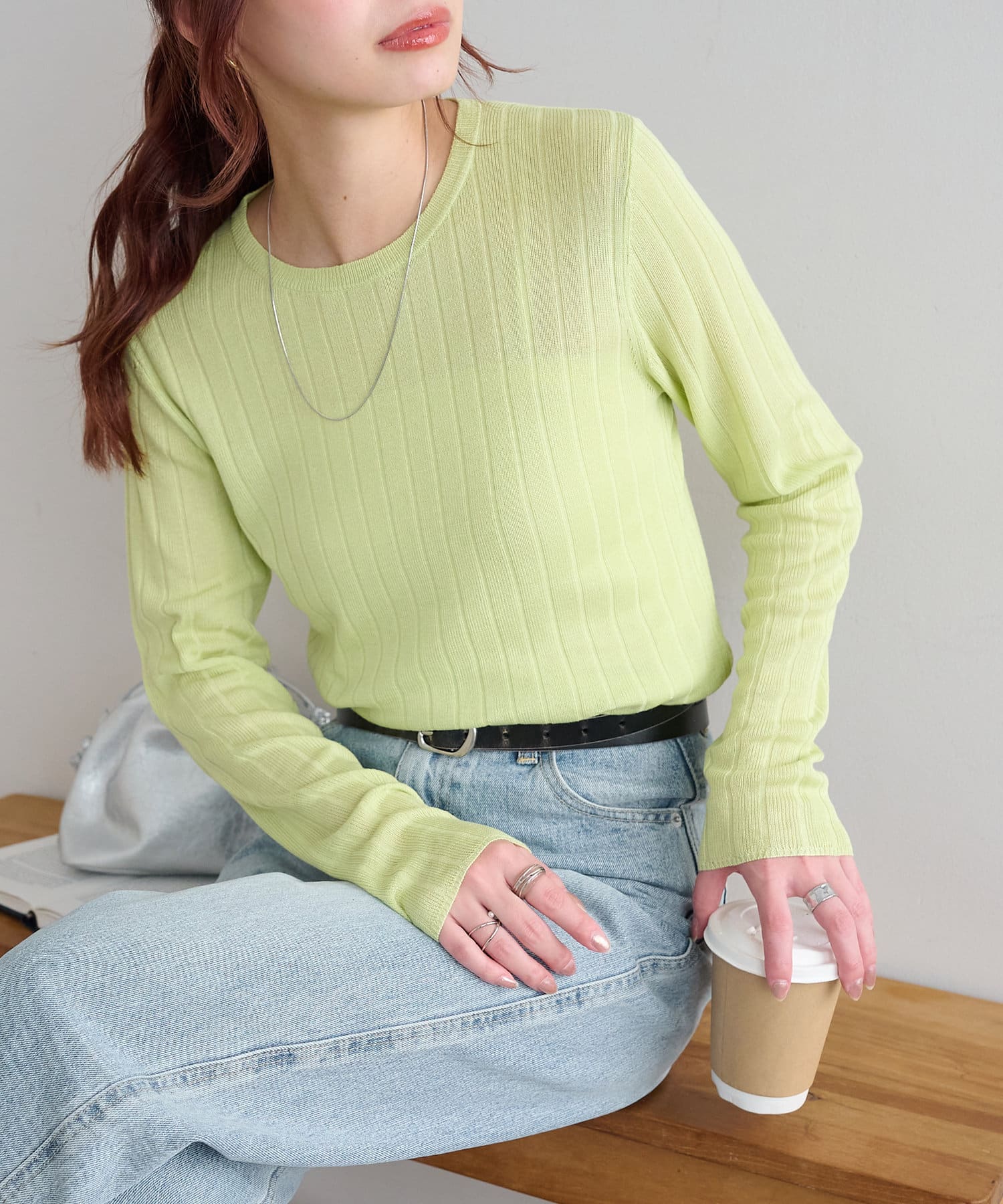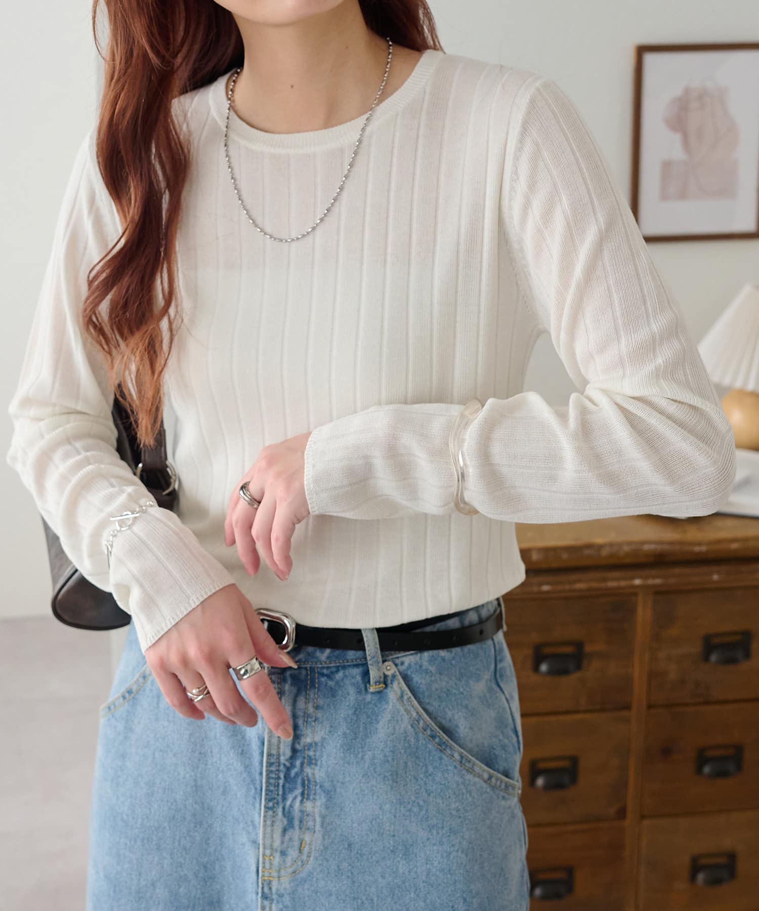 シンプルに見えるトップスですが、ワイドリブにしたことで一枚でもポイントに!