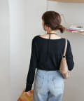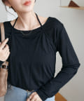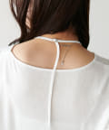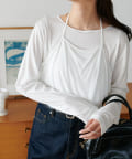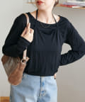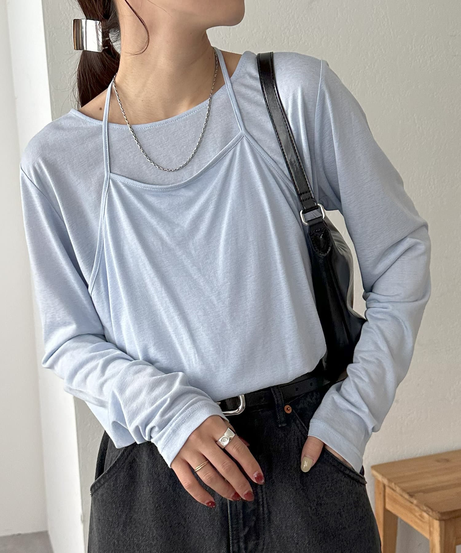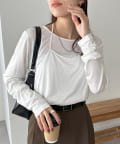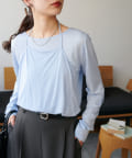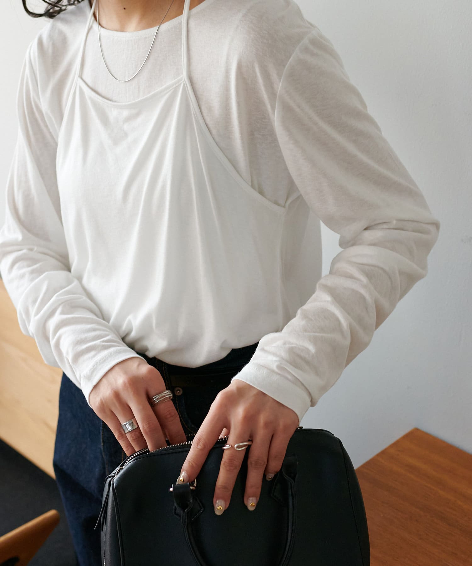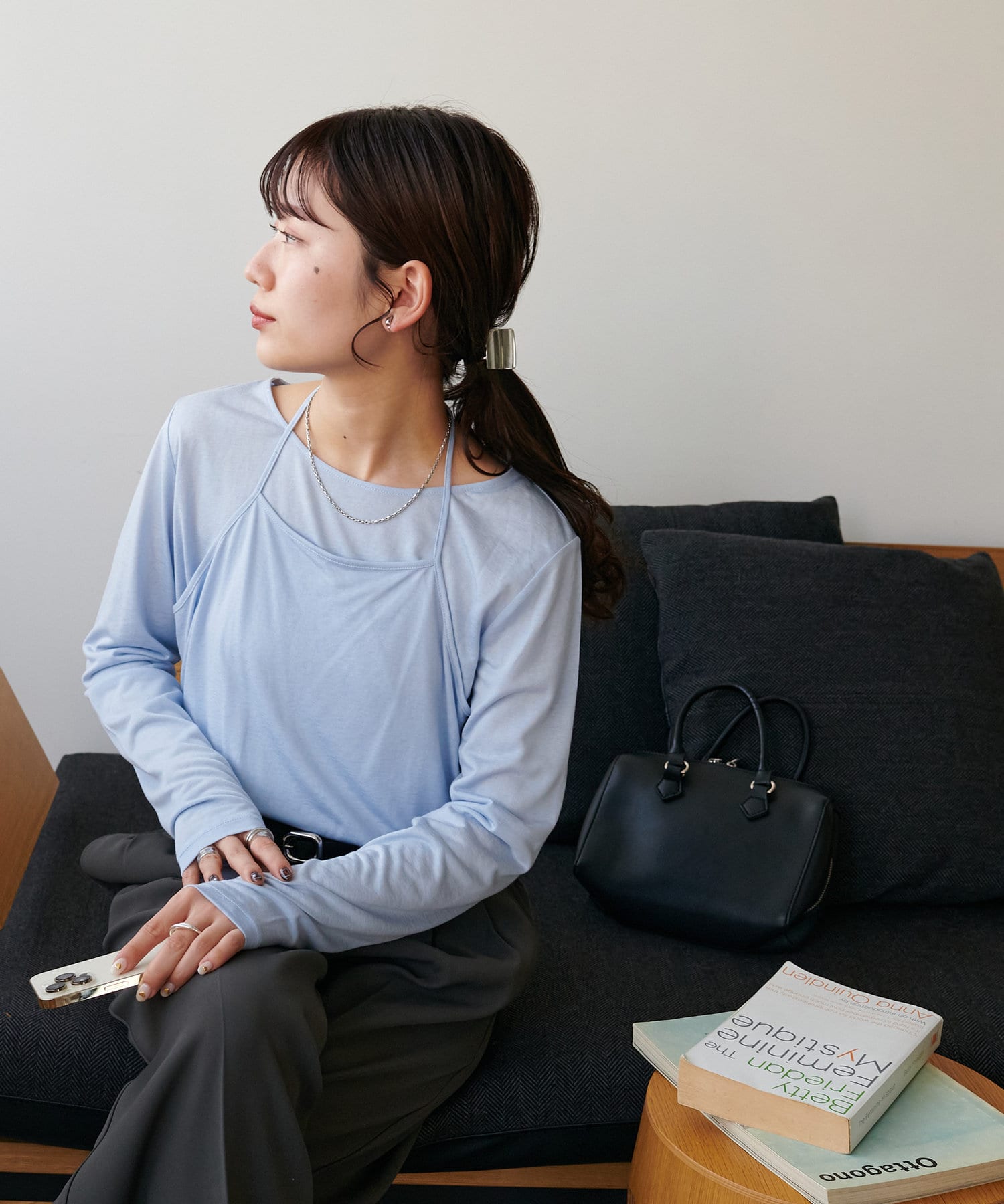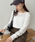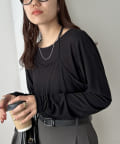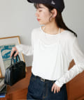 シンプルながらも重ね着風のデザインが、一枚で着映えするトップス。透け感のある素材でカジュアルながらも女性らしい雰囲気を演出します。