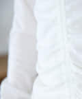 袖口のギャザーもまた、全体のデザインを引き締める重要なポイントに!程よくボリュームを持たせることで、腕を細く見せる効果も期待できます。