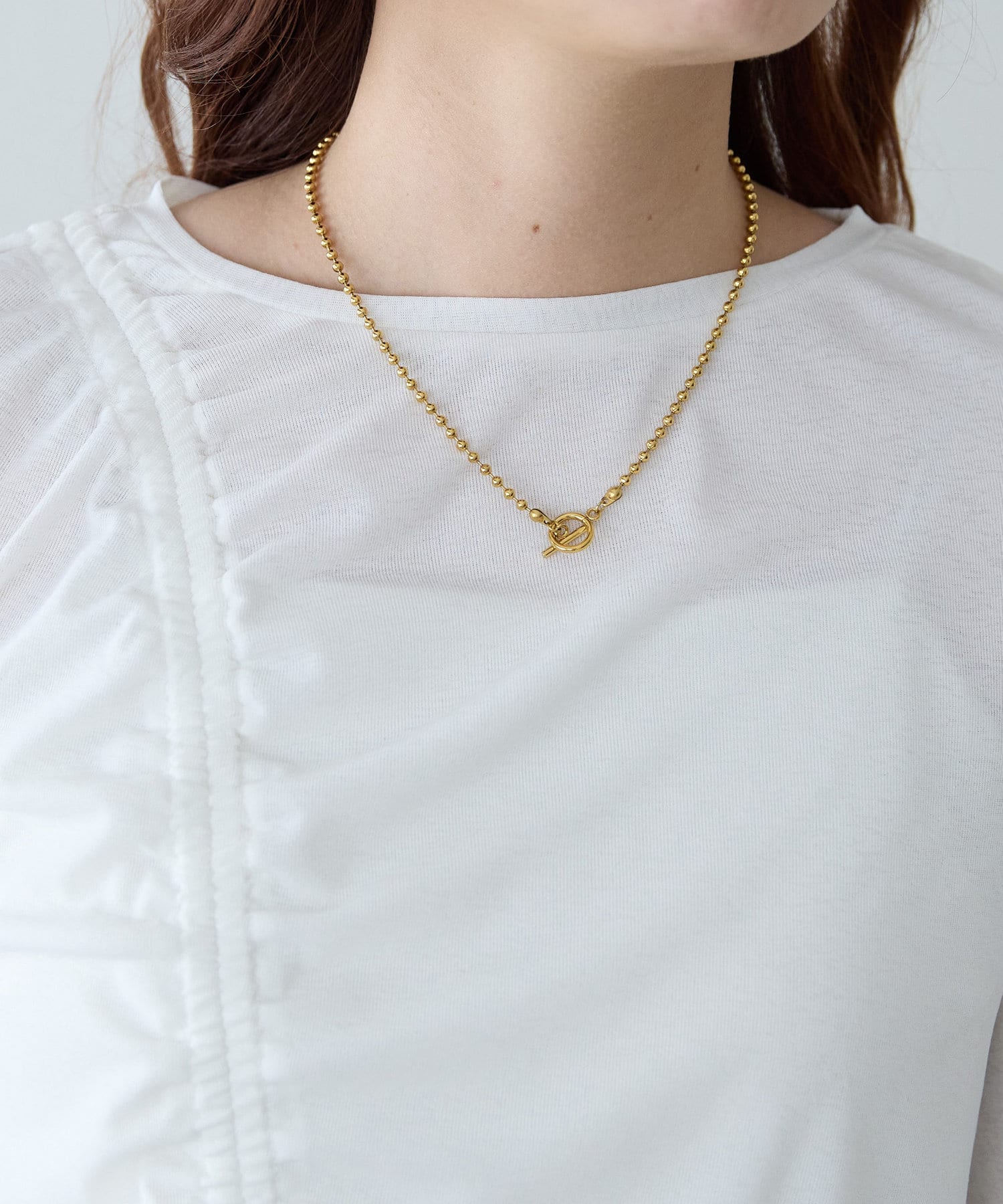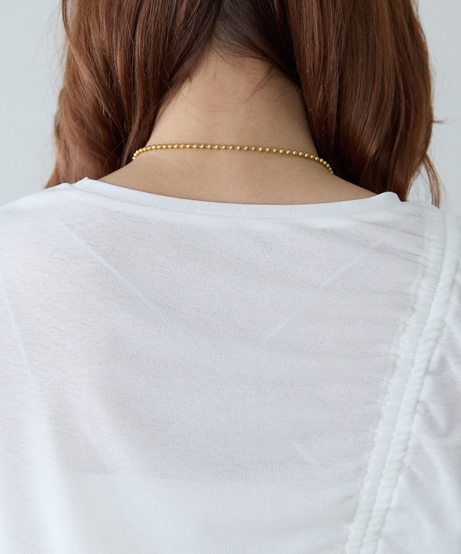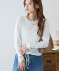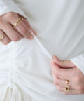 ギャザーが入っていることで、顔回りも華やかになります。一枚でもコーデが決まるトップスです◎