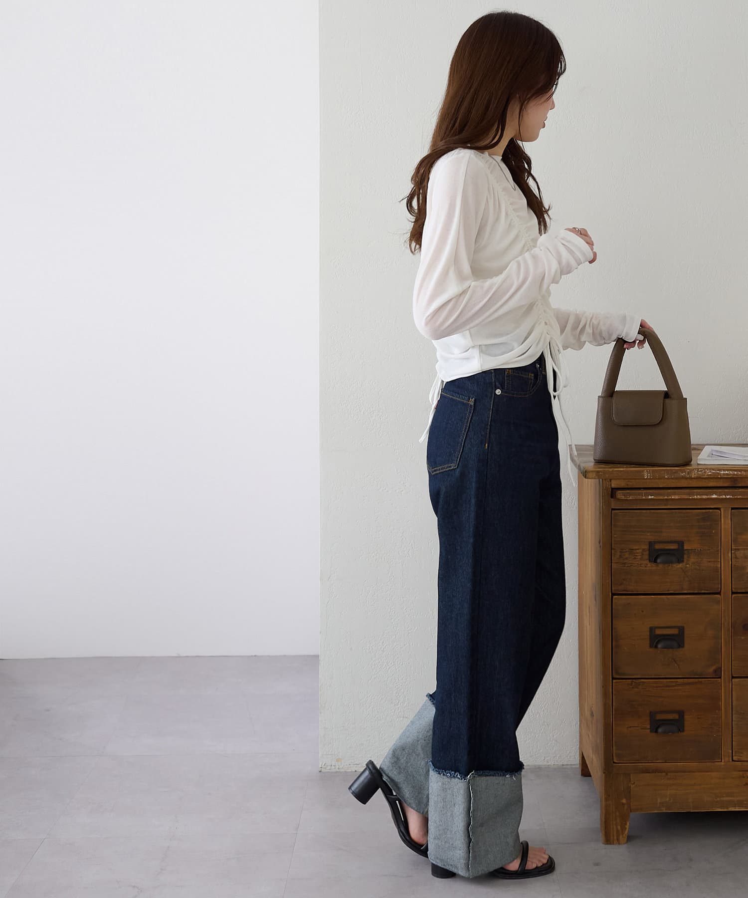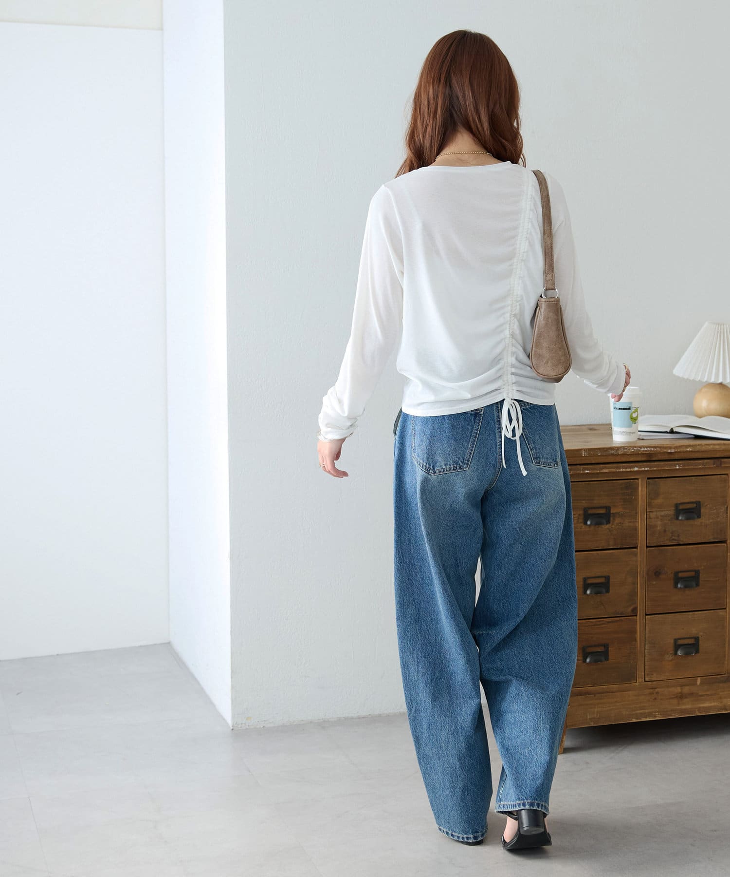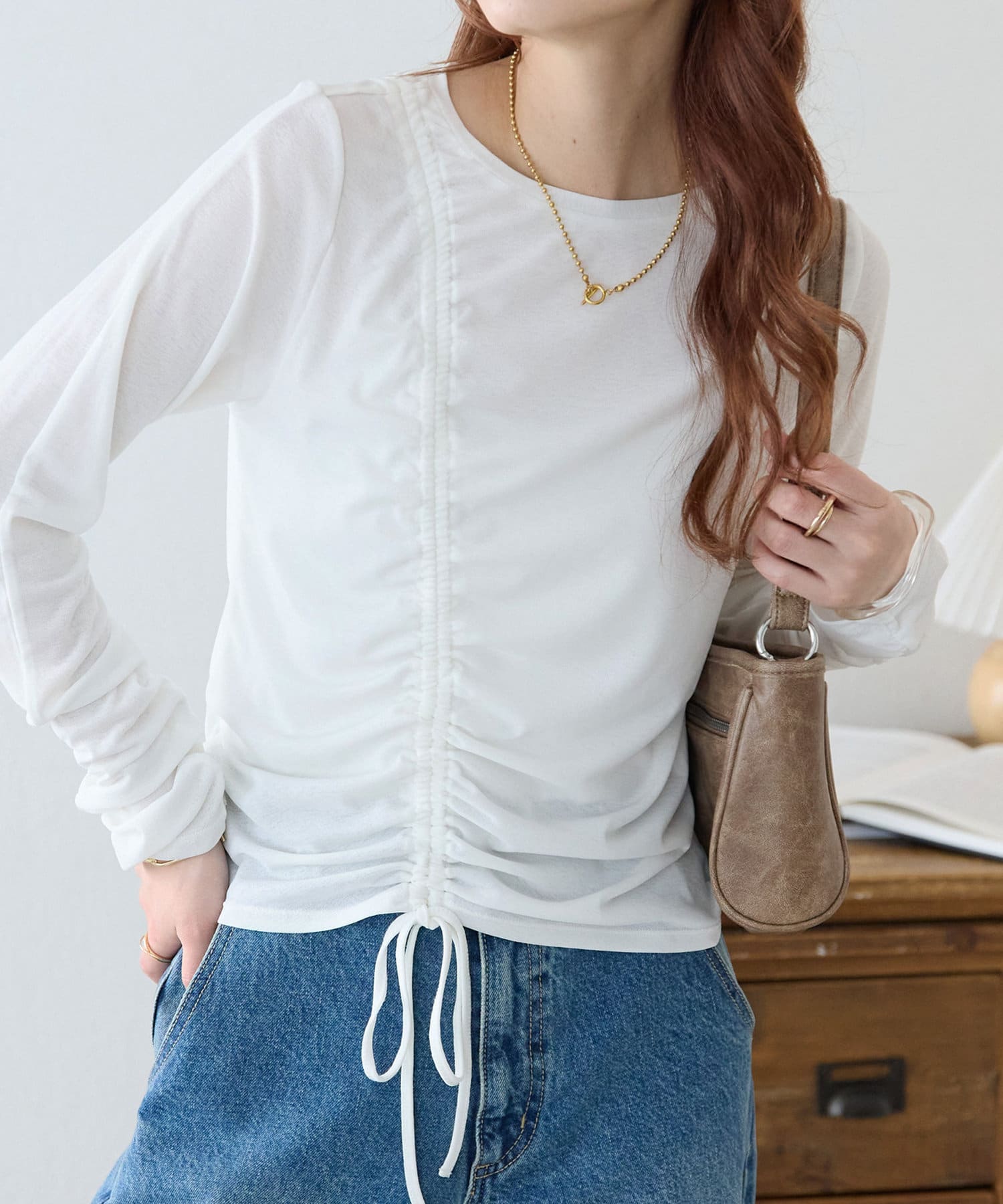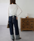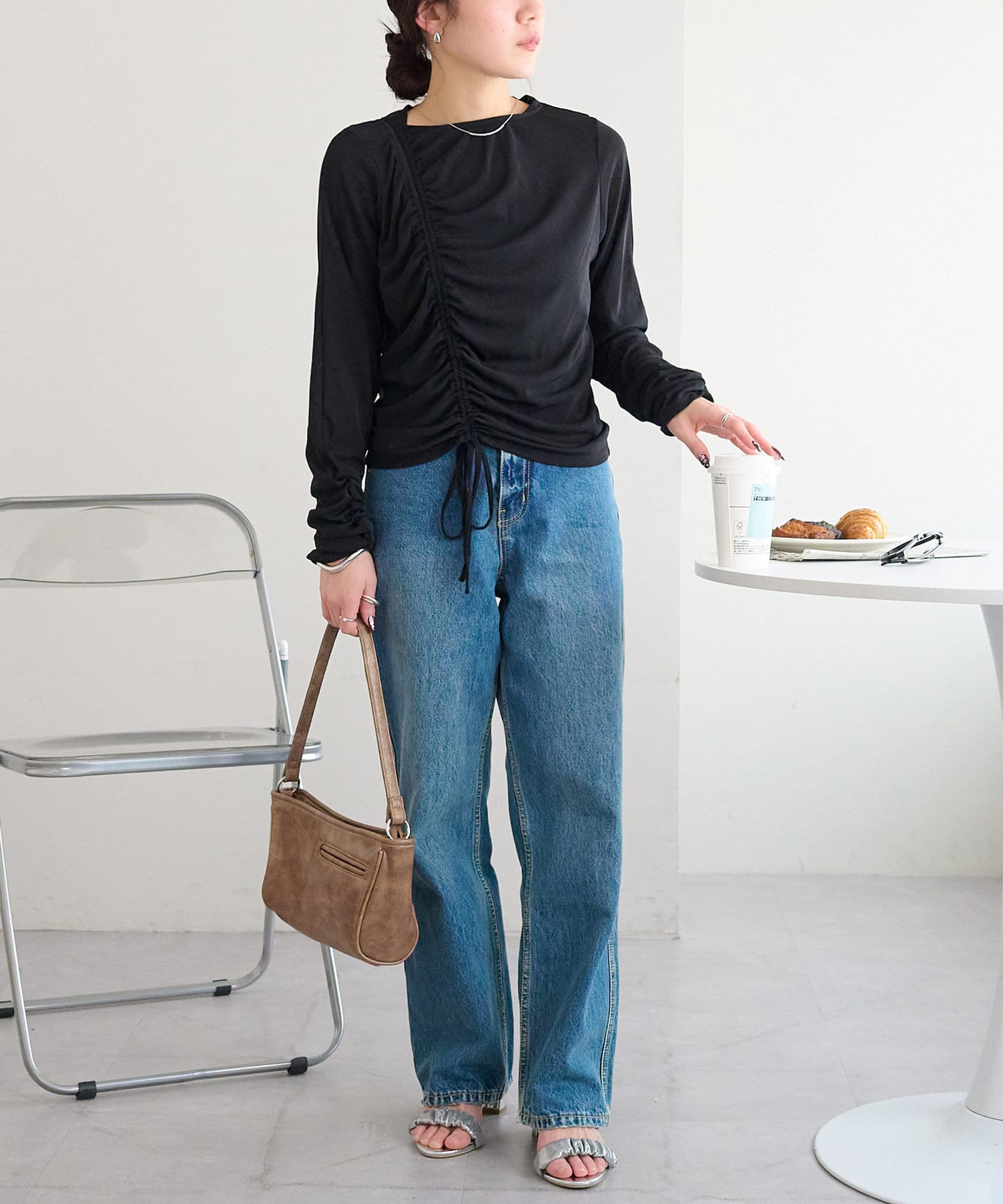 絞り具合で着丈をやや調節できるので、合わせるアイテムによって着こなしを変えて楽しめます◎