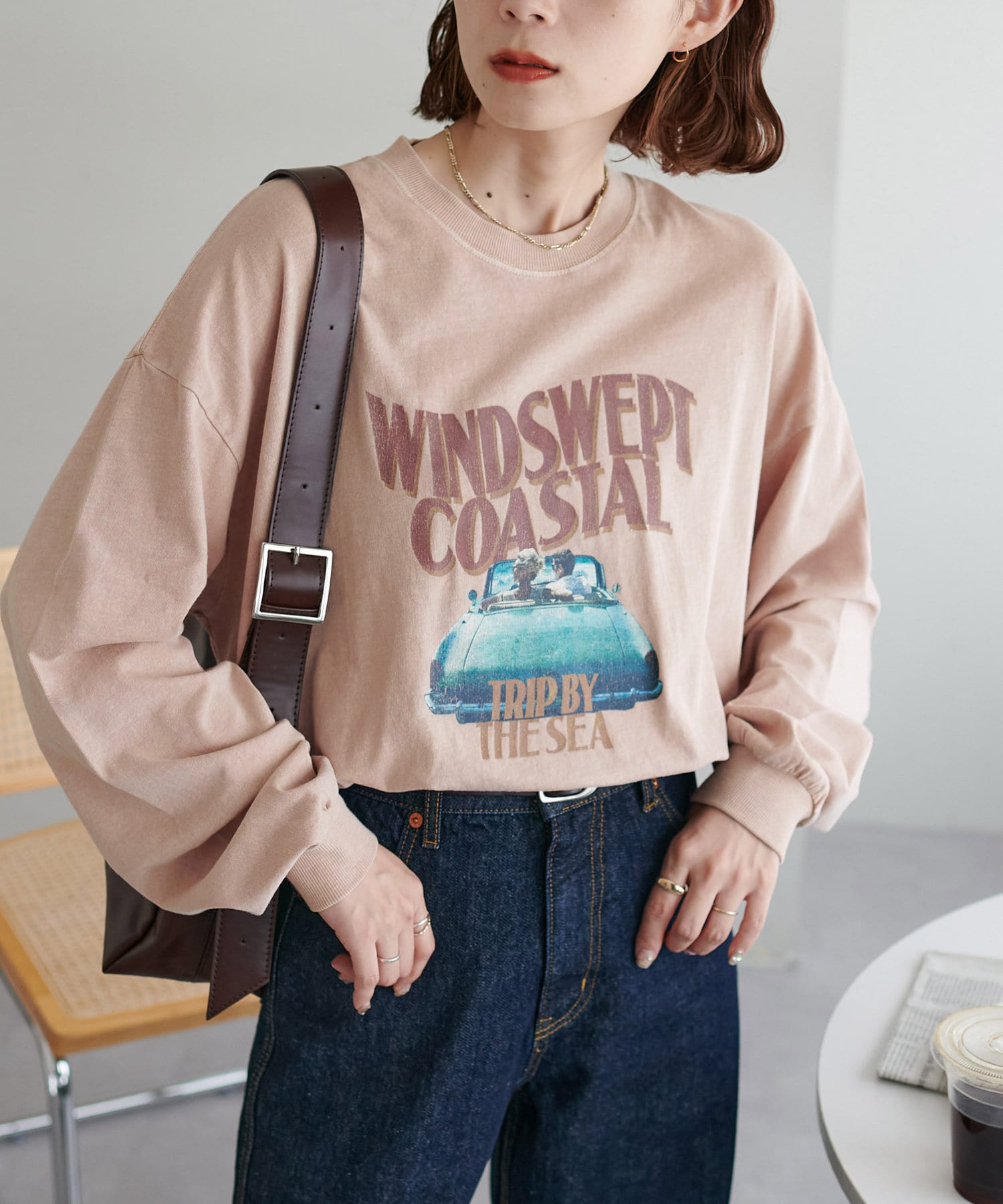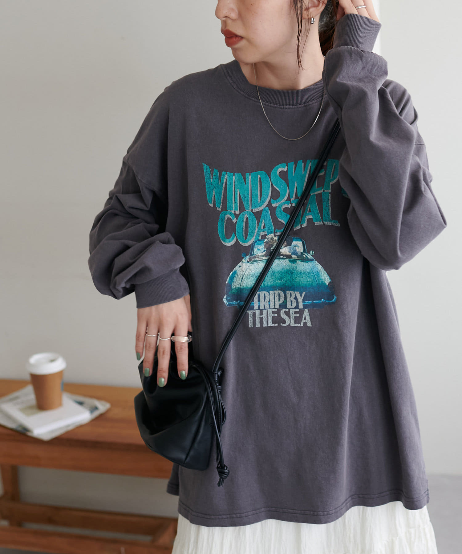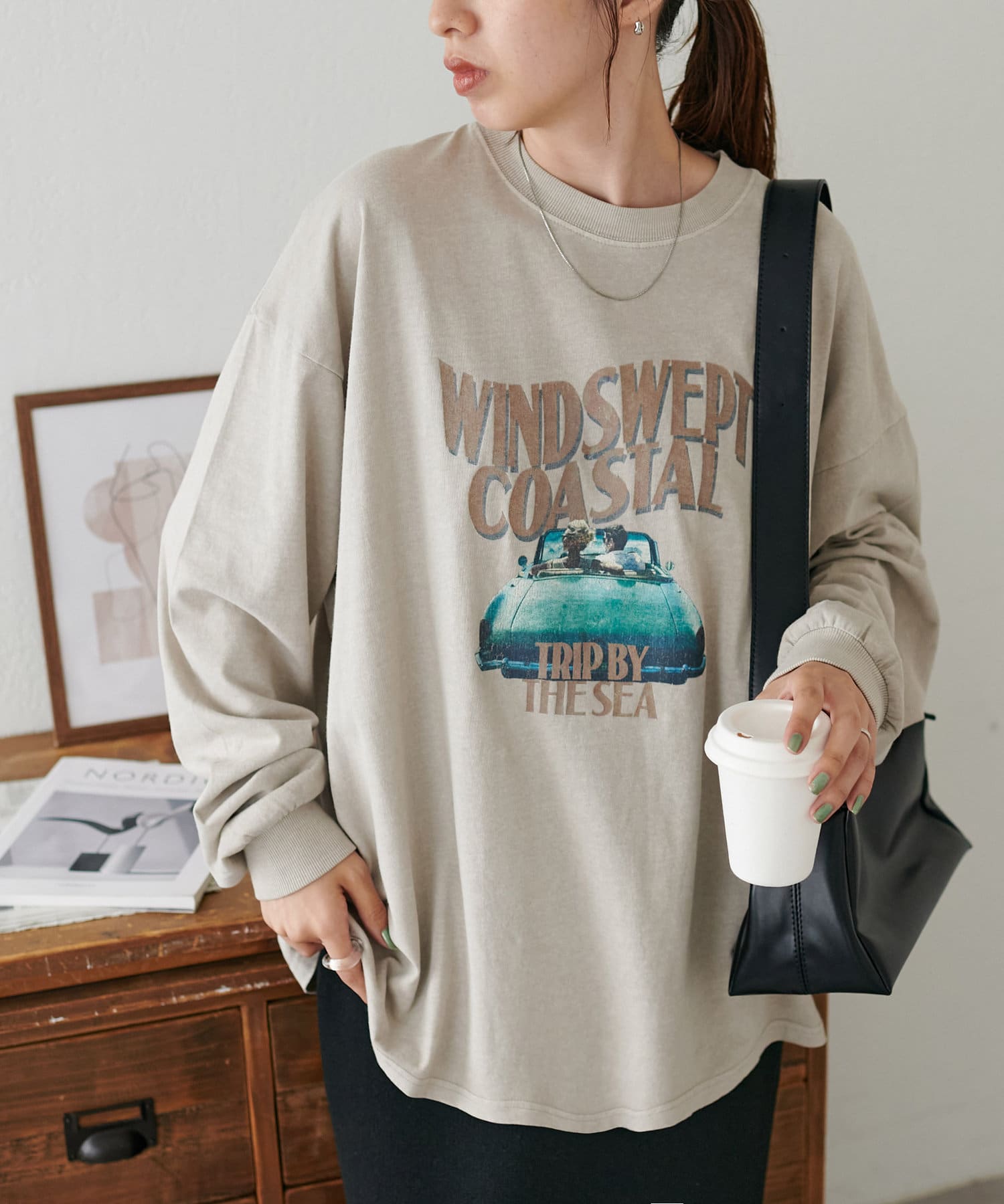 プリントがオシャレなロンT。グレージュのカラーも珍しくてでも使いやすいカラーです。袖が長めでゆるく着れるのもかわいいです。