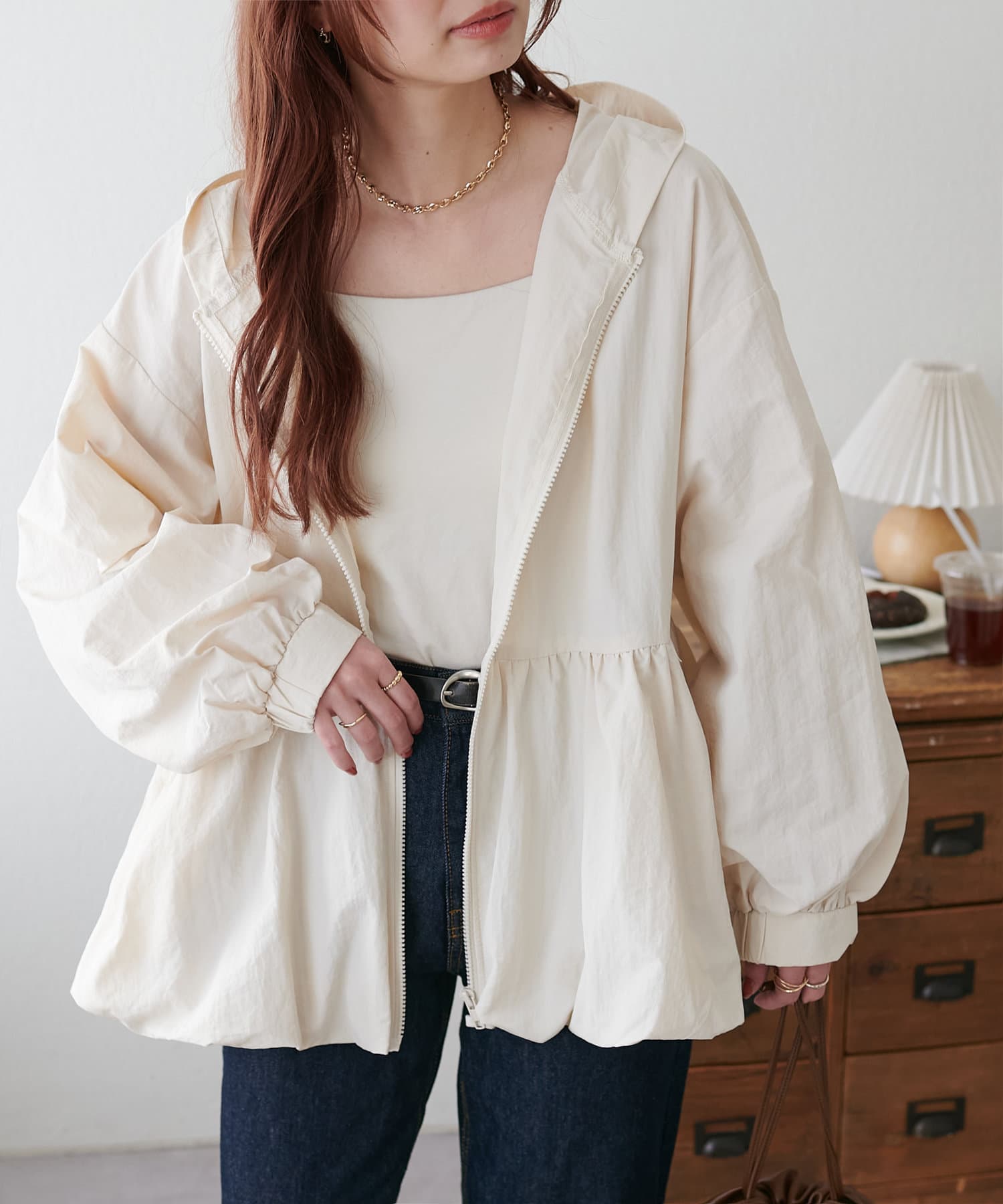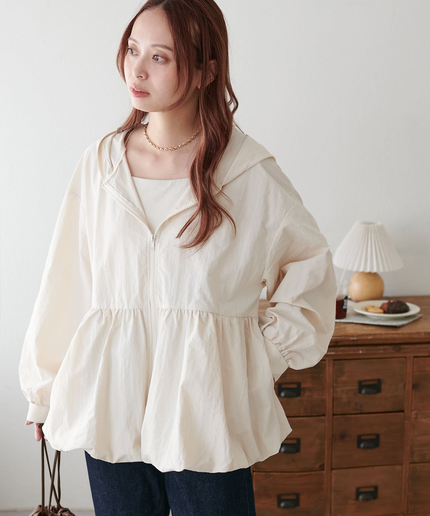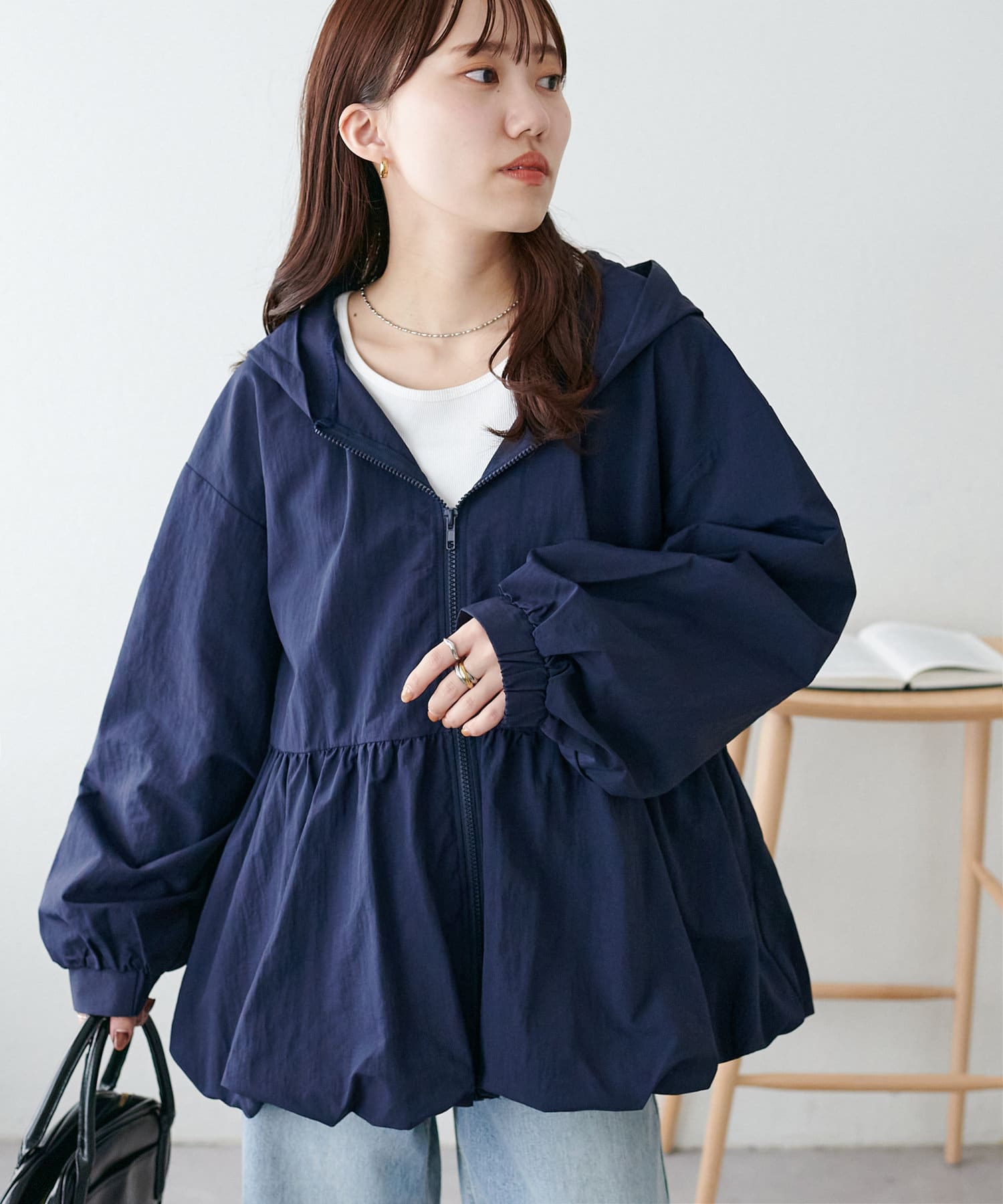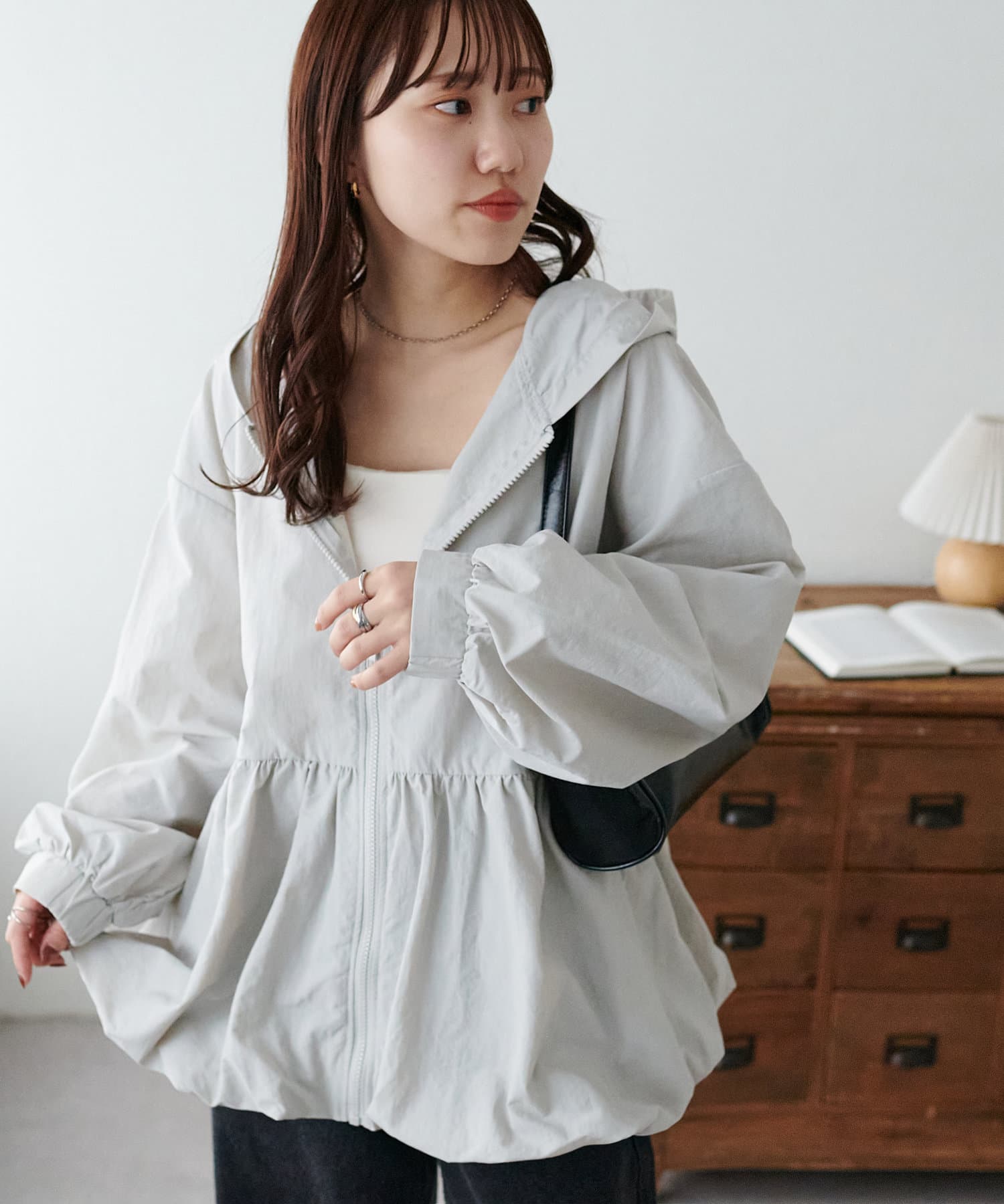 立体的なボリュームスリーブとウエストから広がるバルーンペプラムが特徴のアイテム!1枚羽織るだけで華やかな印象を与えてくれます。裾はバルーン仕立てのふんわりとしたシルエットで、着映え効果も発揮してくれます。フード付きで、急な天候の変化にも対応できるのが嬉しいポイントです。