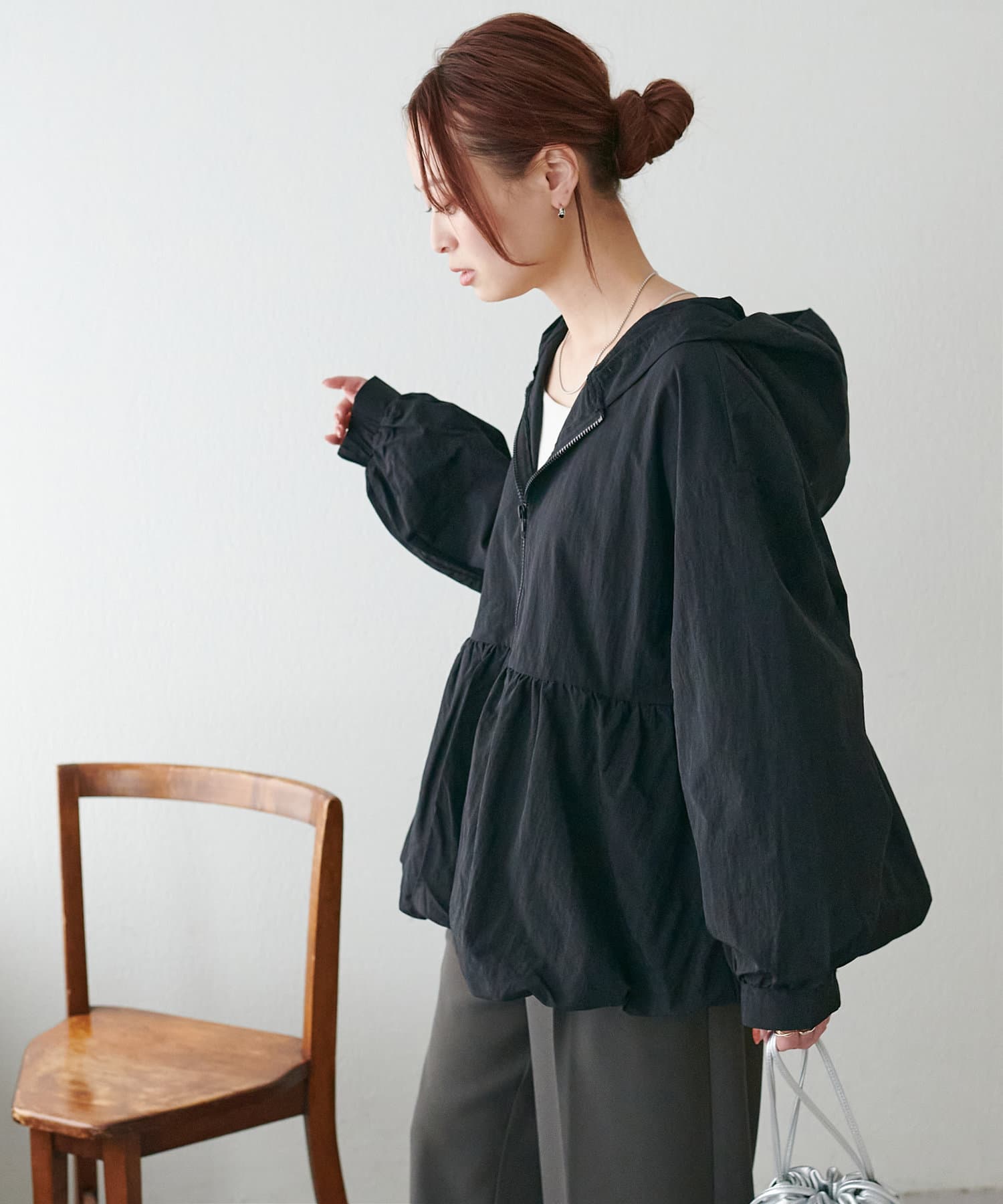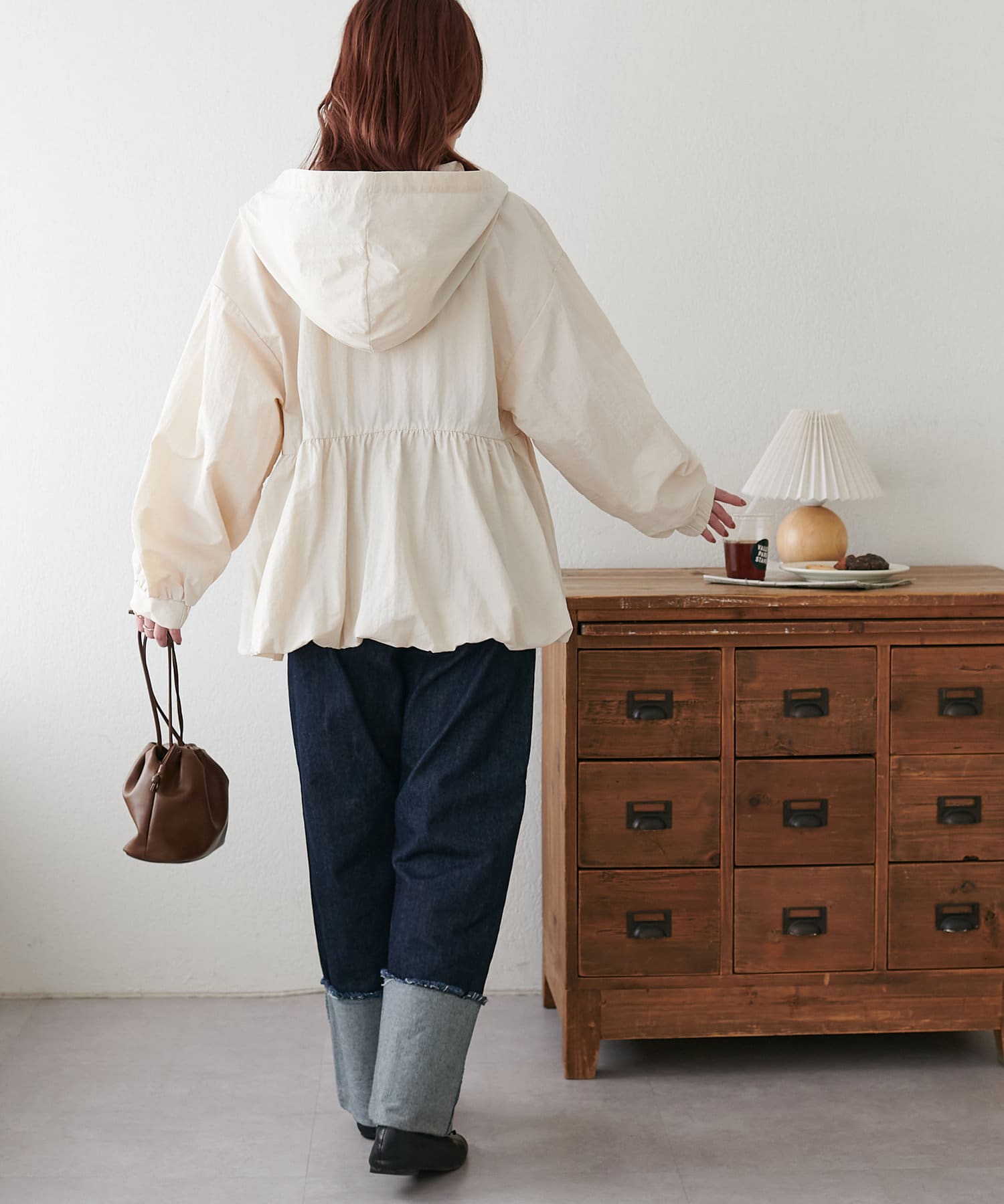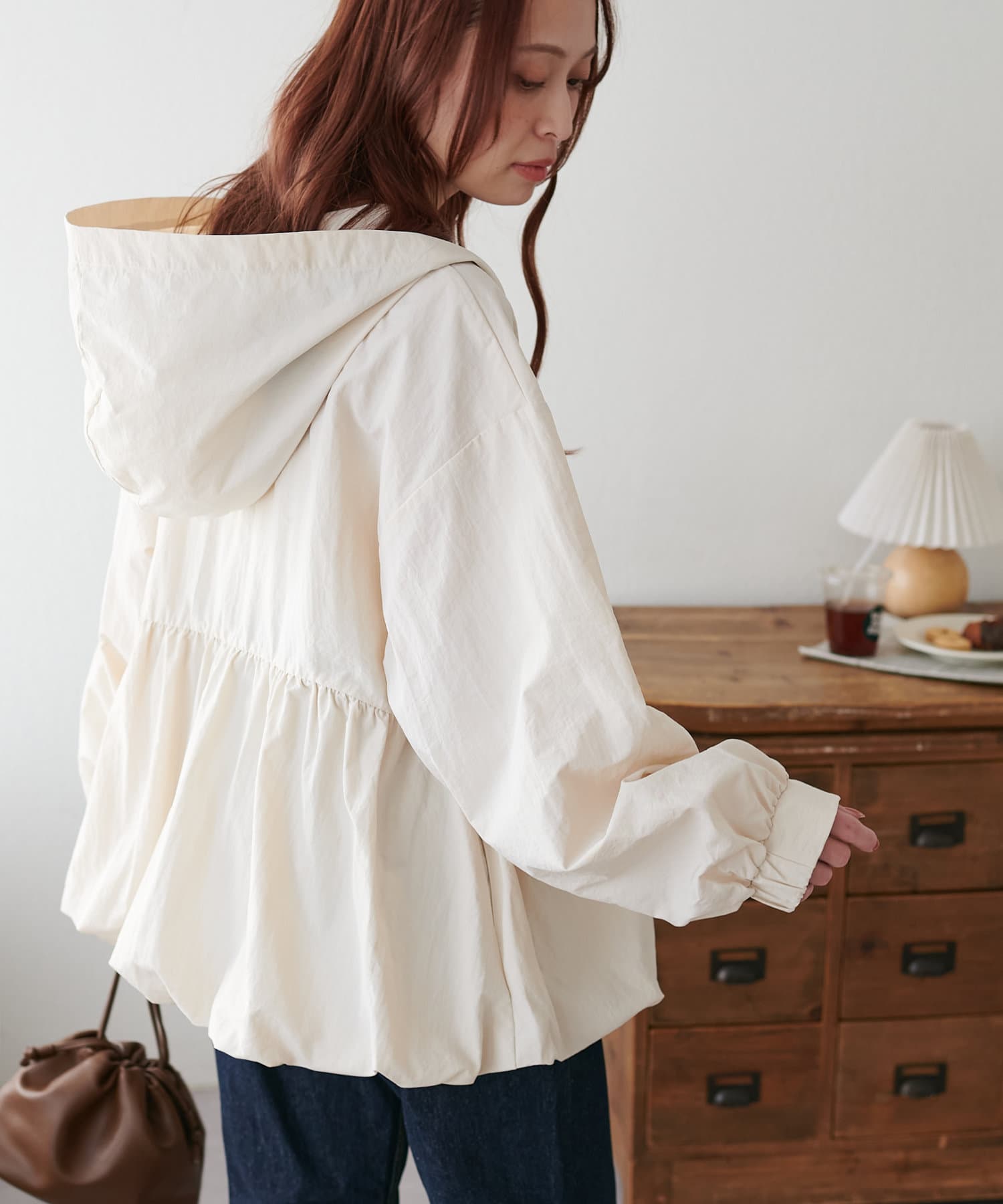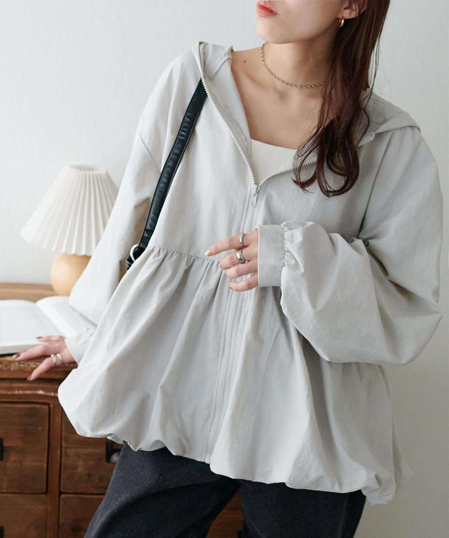 立体的なボリュームスリーブとウエストから広がるバルーンペプラムが特徴のアイテム!1枚羽織るだけで華やかな印象を与えてくれます。裾はバルーン仕立てのふんわりとしたシルエットで、着映え効果も発揮してくれます。フード付きで、急な天候の変化にも対応できるのが嬉しいポイントです。