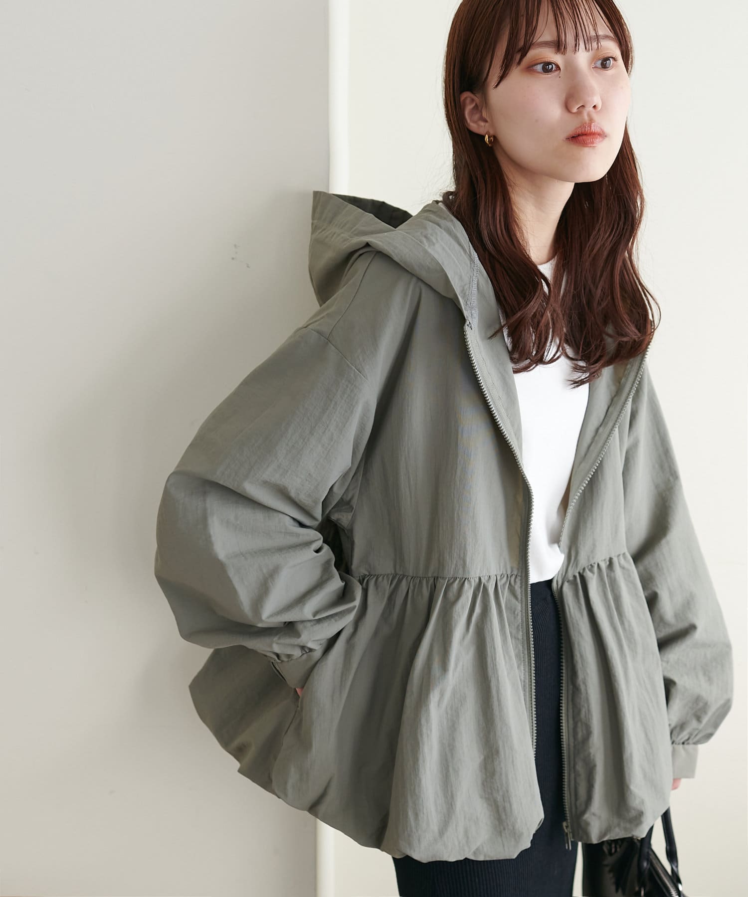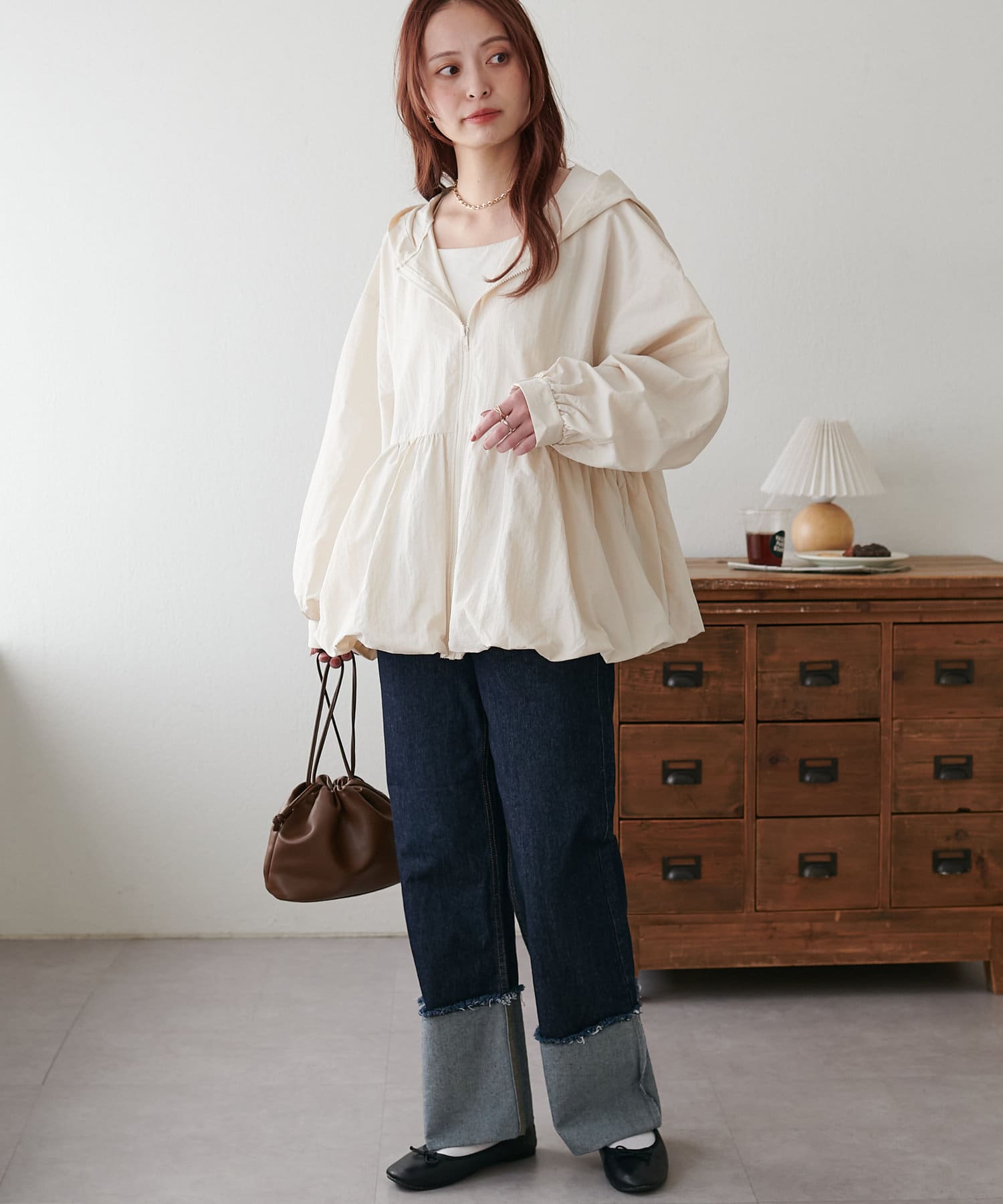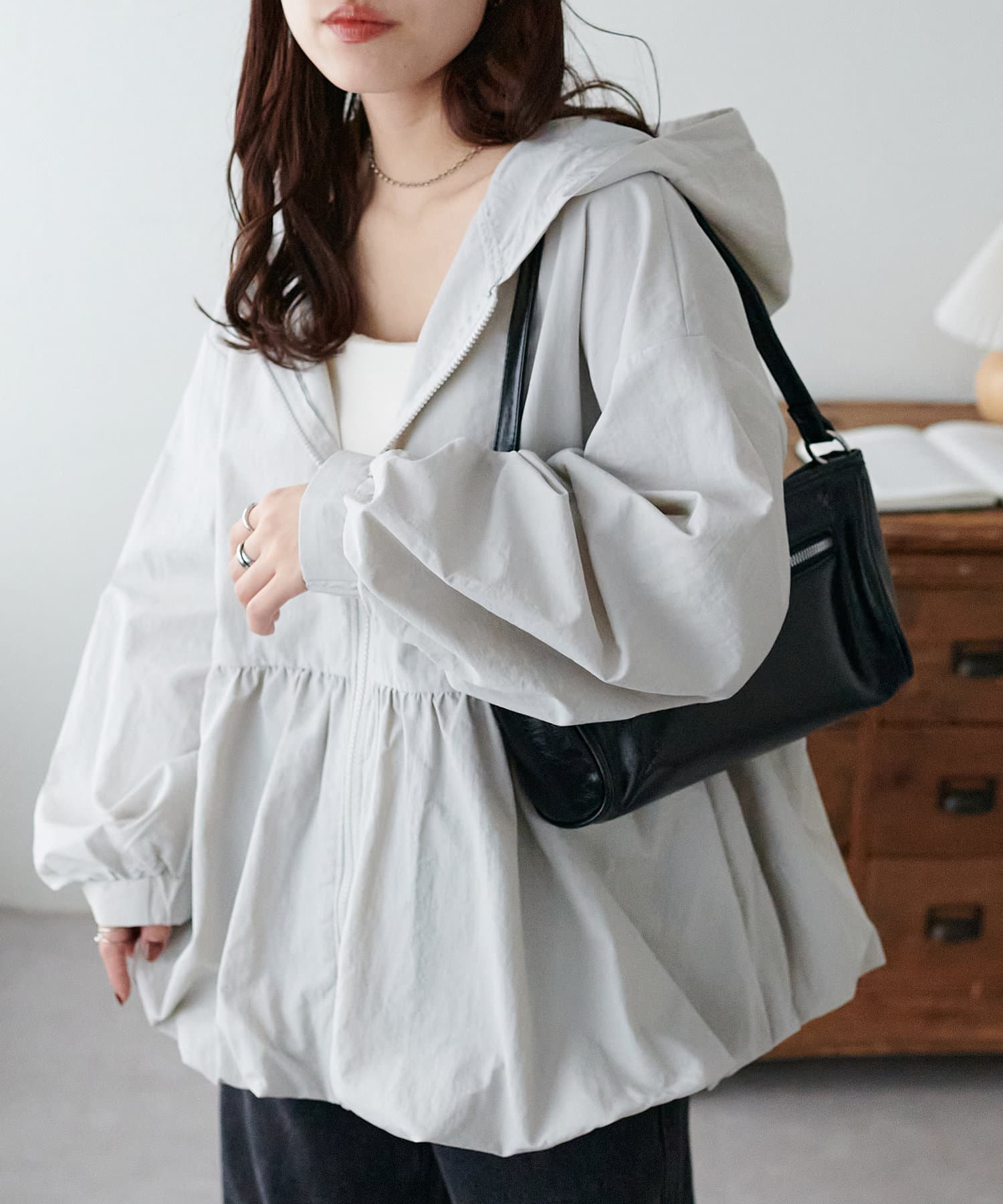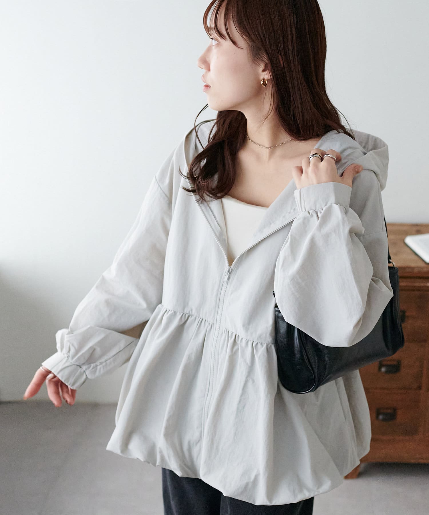 立体的なボリュームスリーブとウエストから広がるバルーンペプラムが特徴のアイテム!1枚羽織るだけで華やかな印象を与えてくれます。裾はバルーン仕立てのふんわりとしたシルエットで、着映え効果も発揮してくれます。フード付きで、急な天候の変化にも対応できるのが嬉しいポイントです。