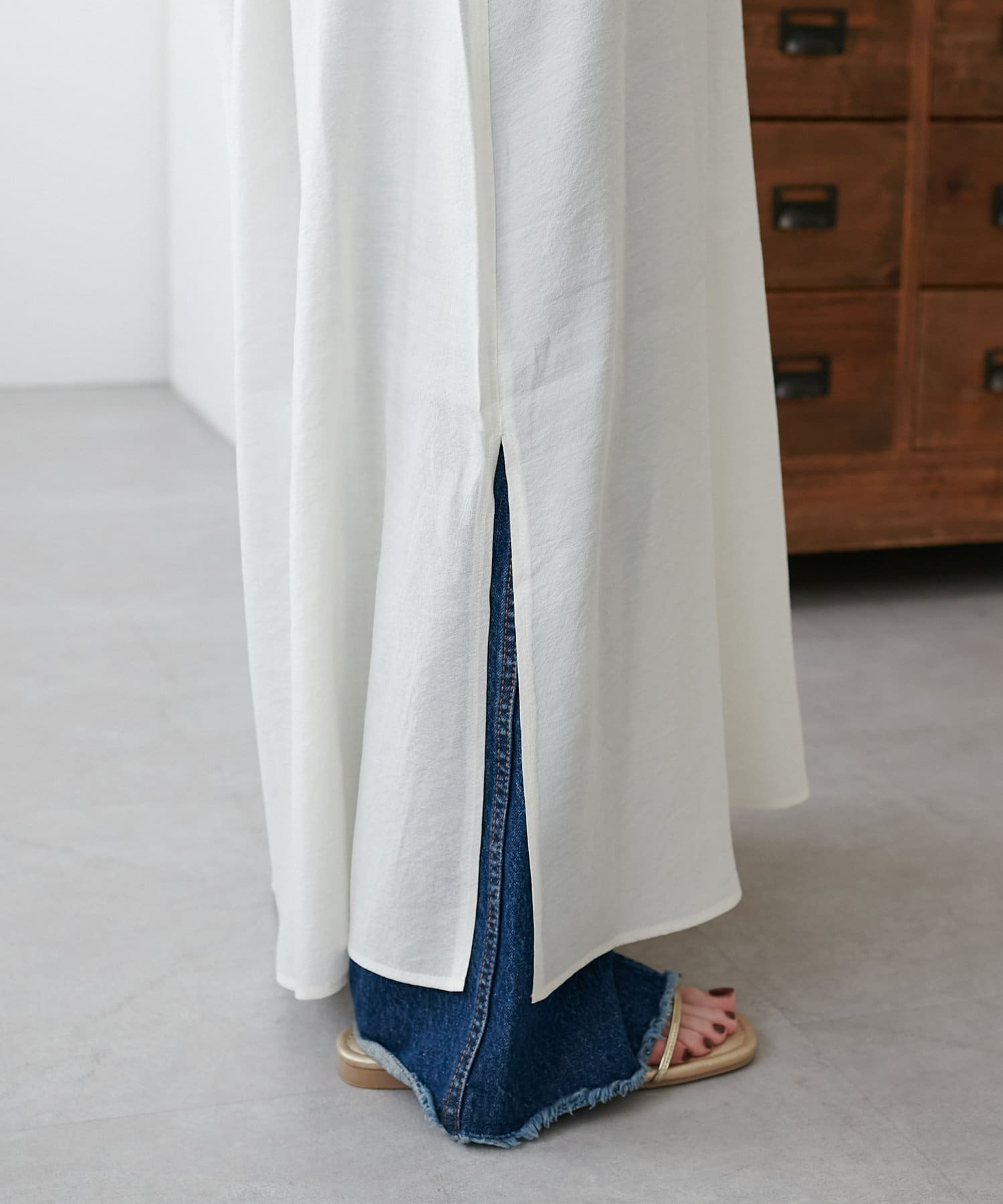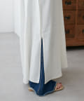 また、裾のスリットは、歩くたびに揺れるシルエットを生み出し、軽やかで女性らしい雰囲気に。