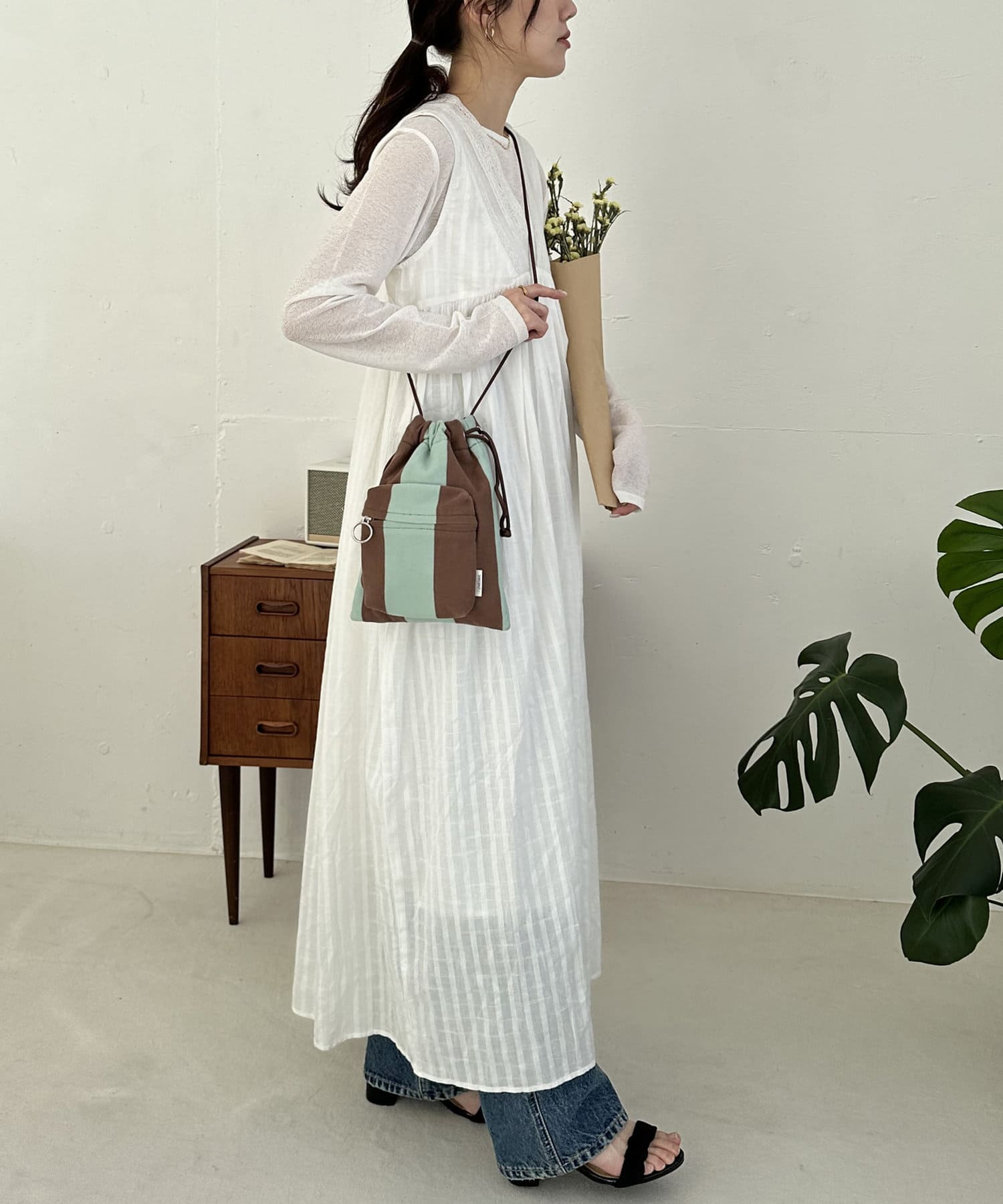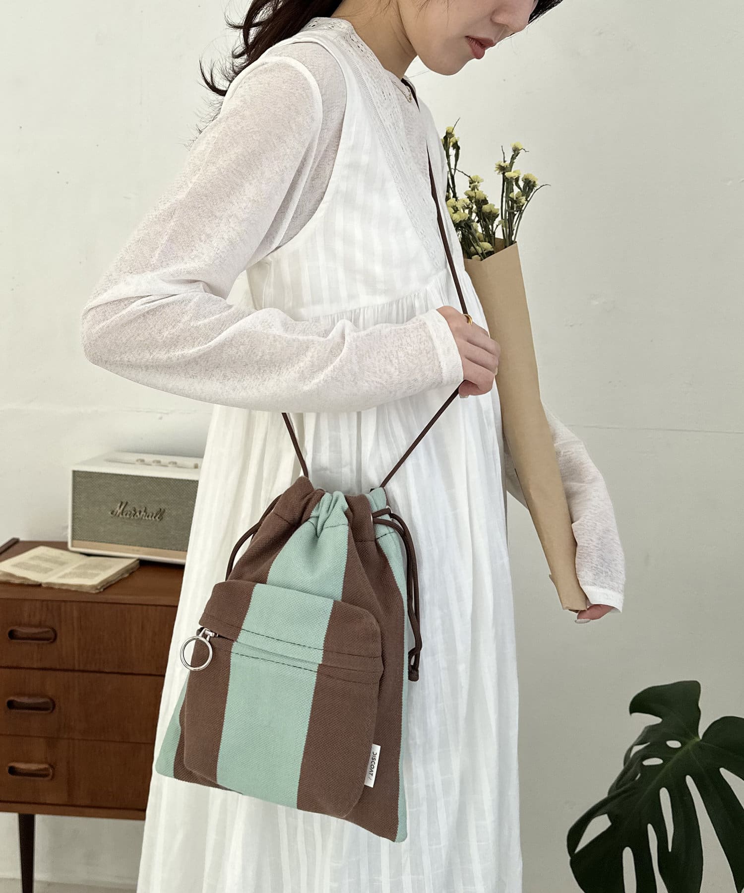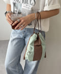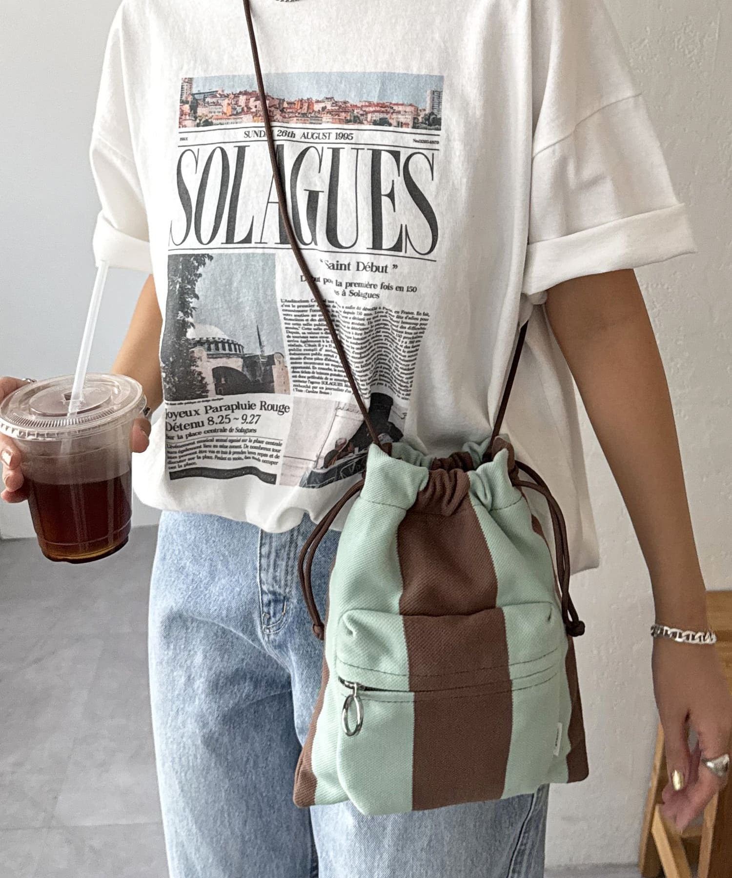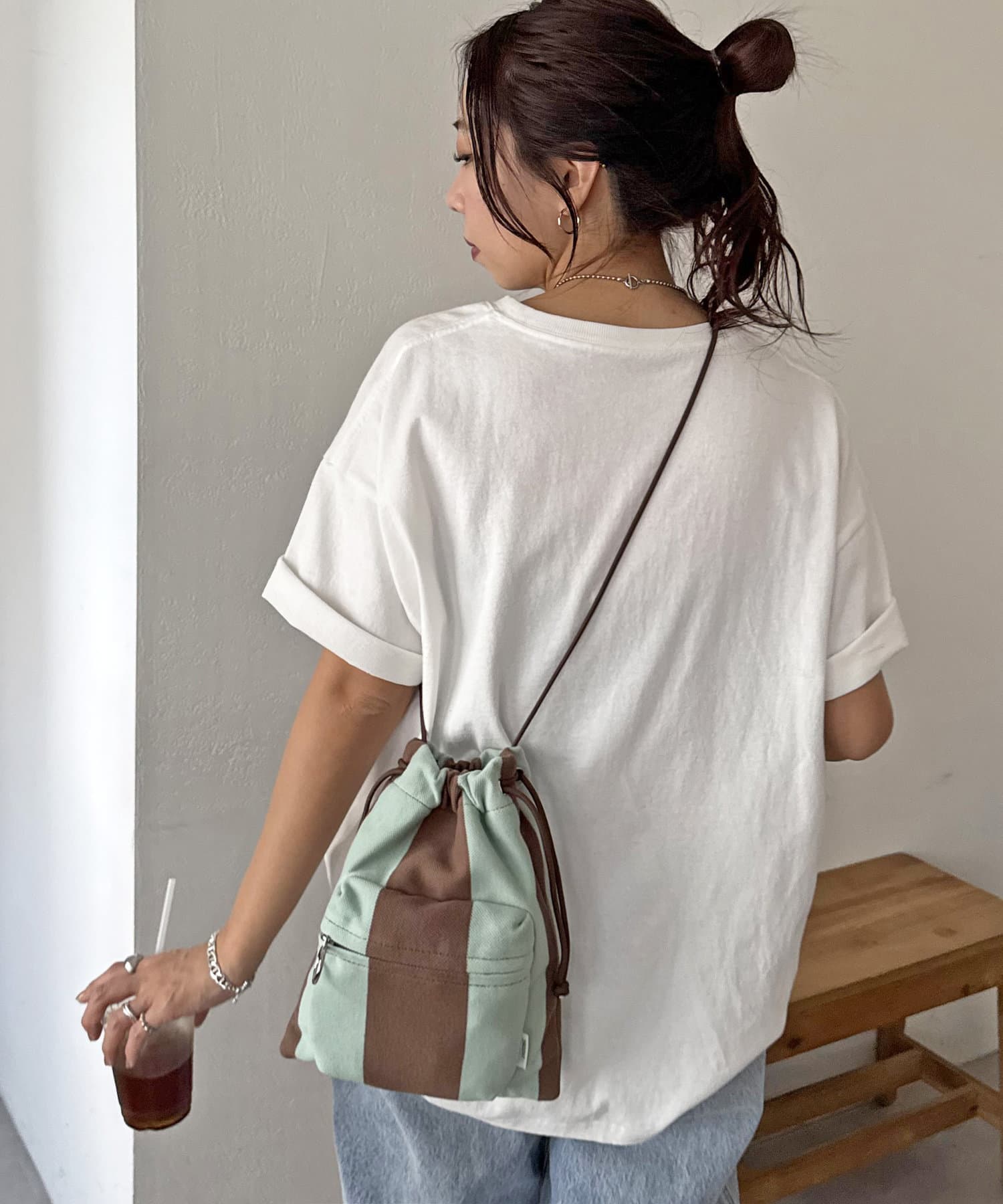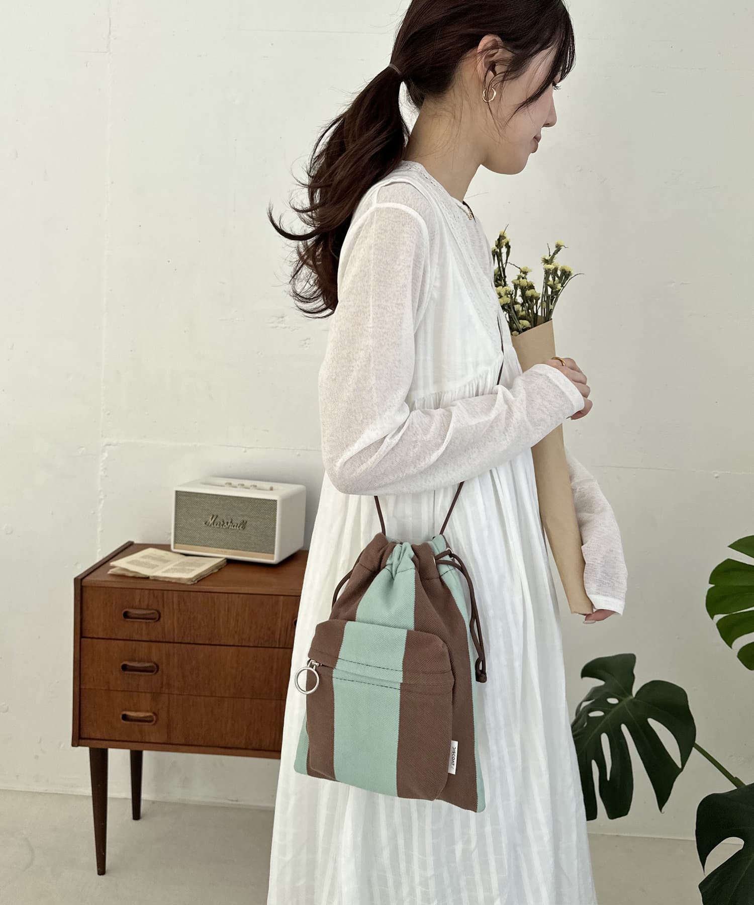 コンパクトな見た目ですが、必要最低限の荷物が収まるちょうどいいサイズ感の巾着ショルダーバッグ。内・外側にポケットがあるので、ワイヤレスイヤフォンやリップなどの小物を整理しながら収納できます◎また、付属のショルダー紐は、取り外し可能かつ、結び目で長さを自由に調整できます!さらに、軽く柔らかい素材で、コンパクトに折りたためるので旅行時のバッグにもオススメです♪カラーは定番のブラックと、春夏らしいカラーリングのミント、アイボリー、少しシックな印象のネイビーの4色展開です。