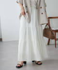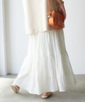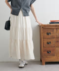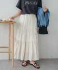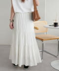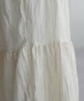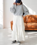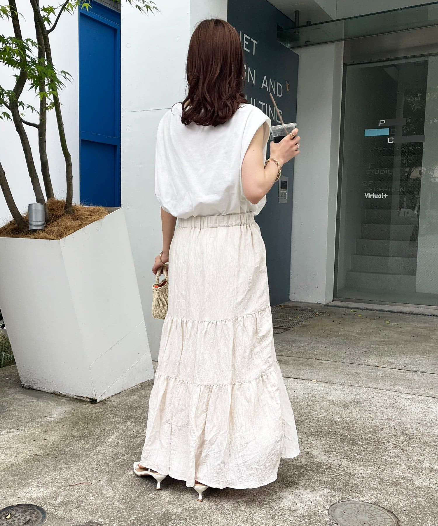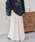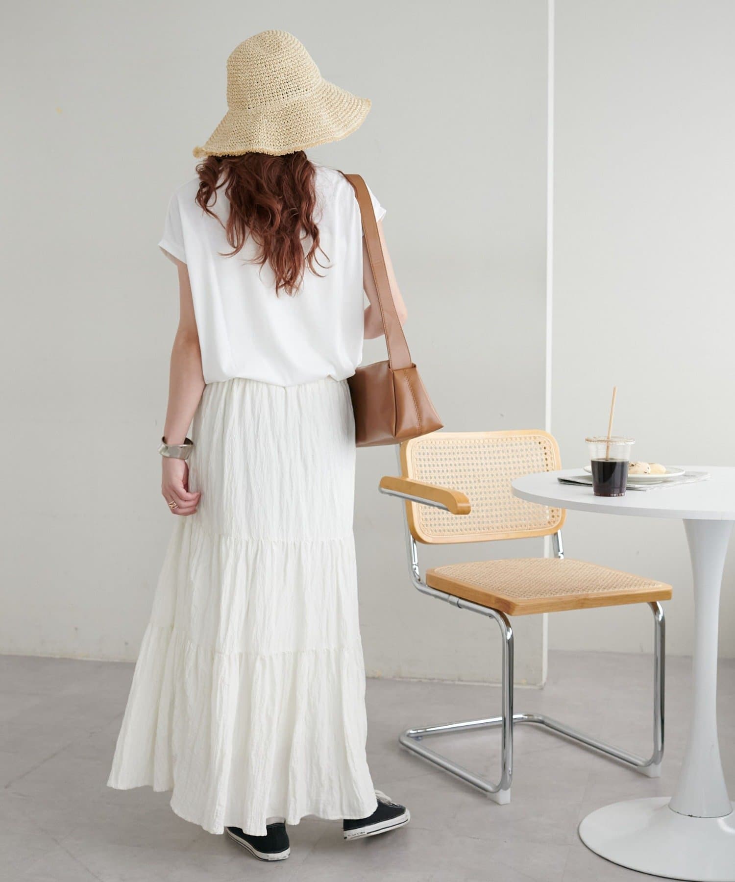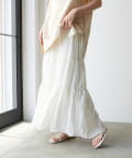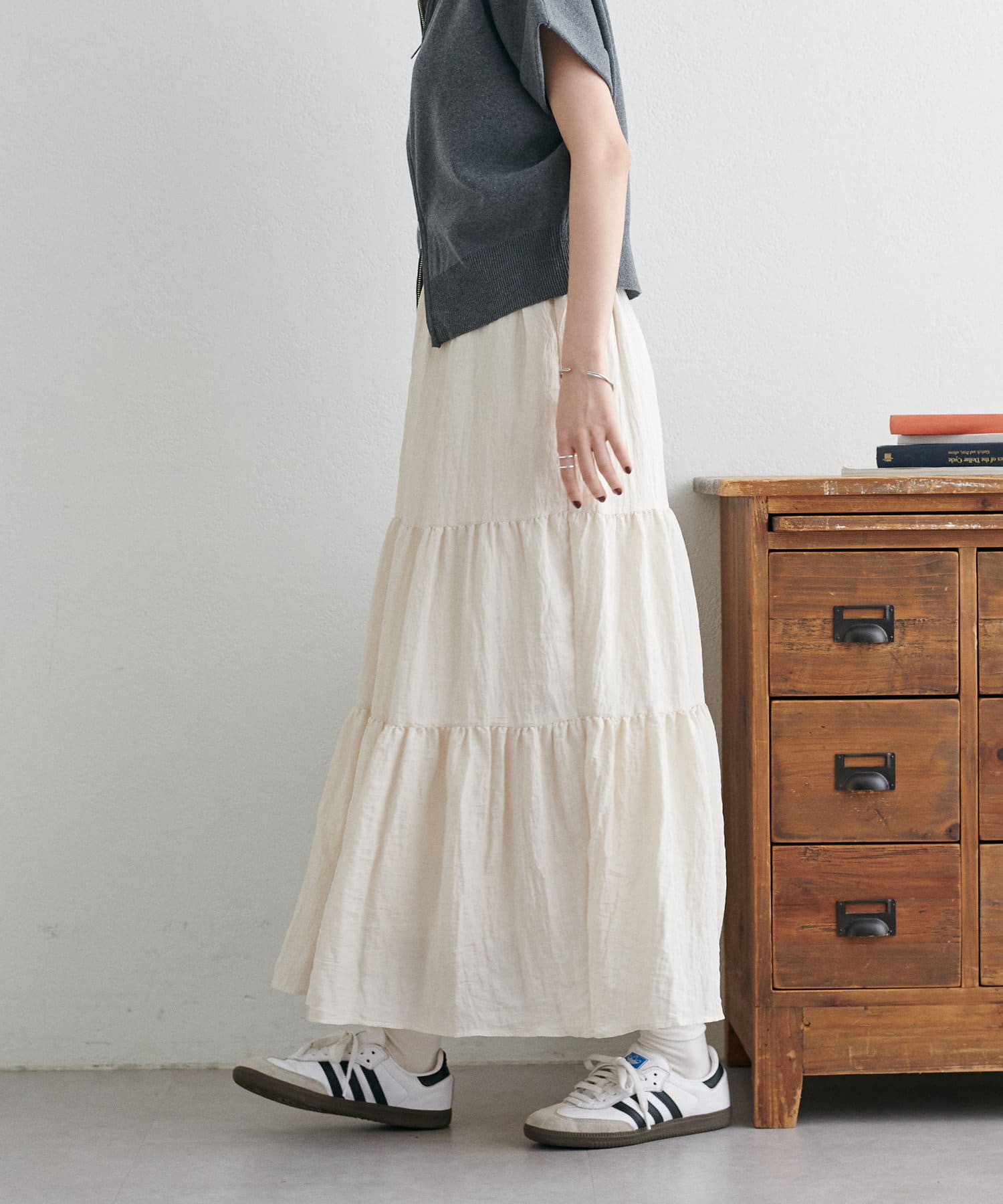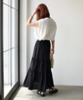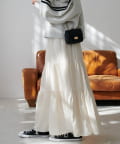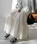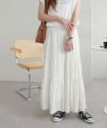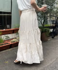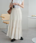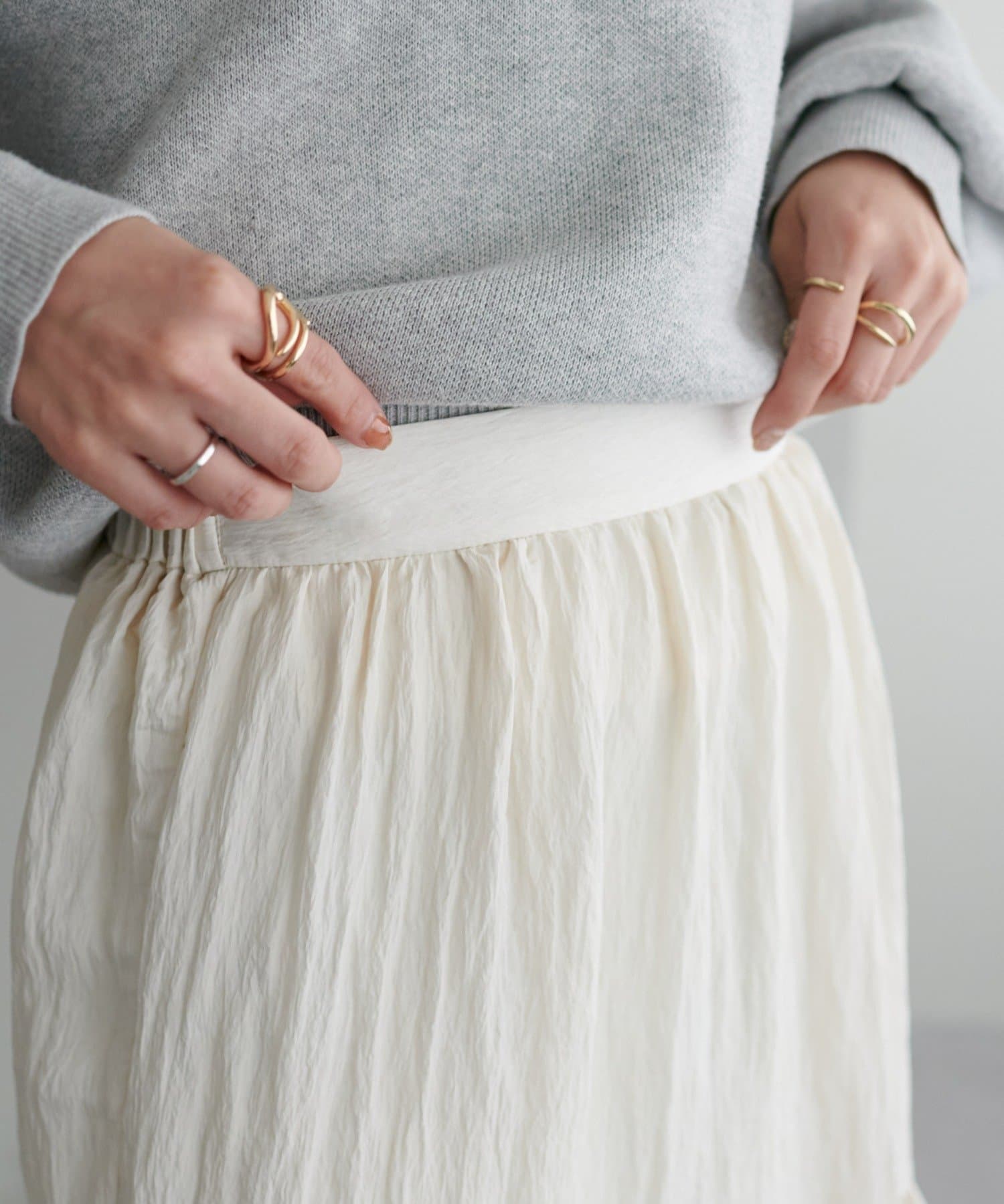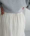動くたびに揺れるシルエットが華やかな印象を与えます。ウエストはバックゴム仕様で着脱も楽ちんながら、トップスインも様になるデザイン。