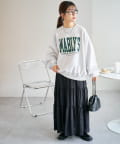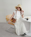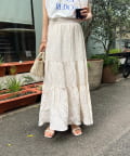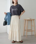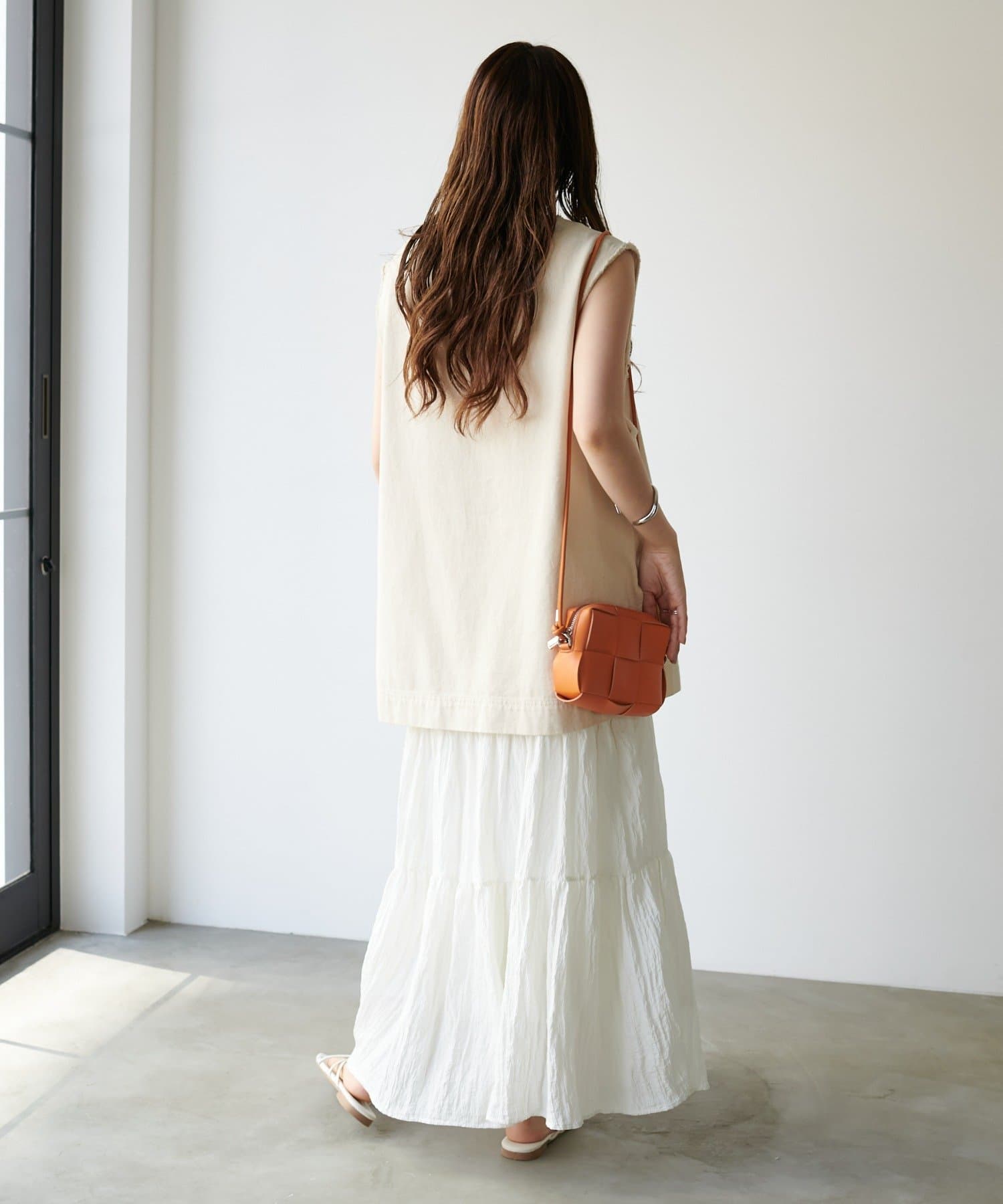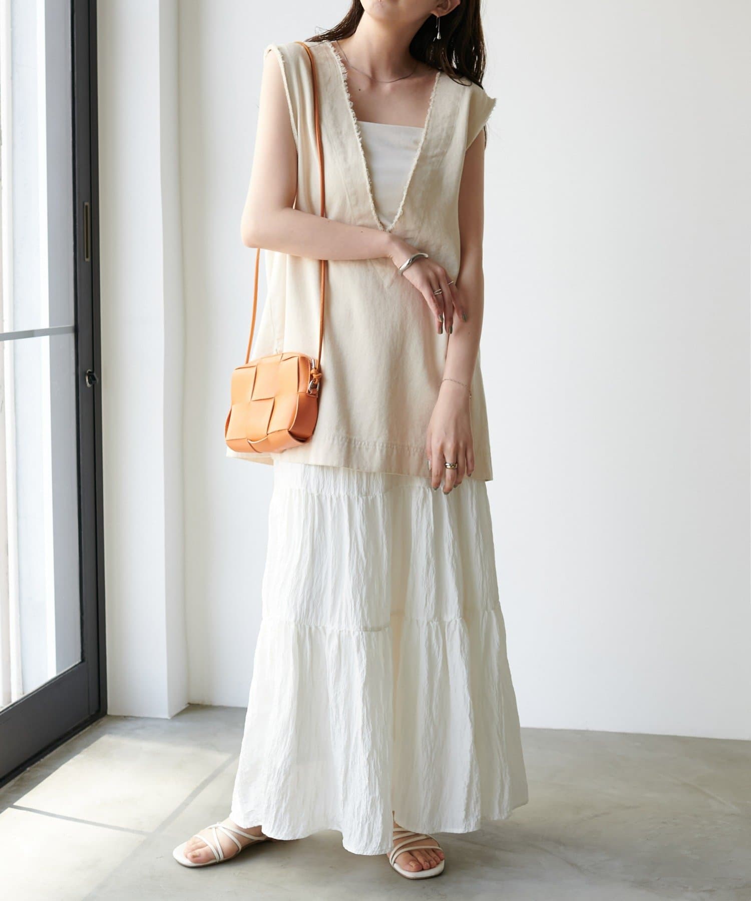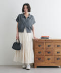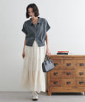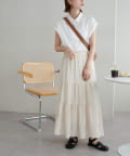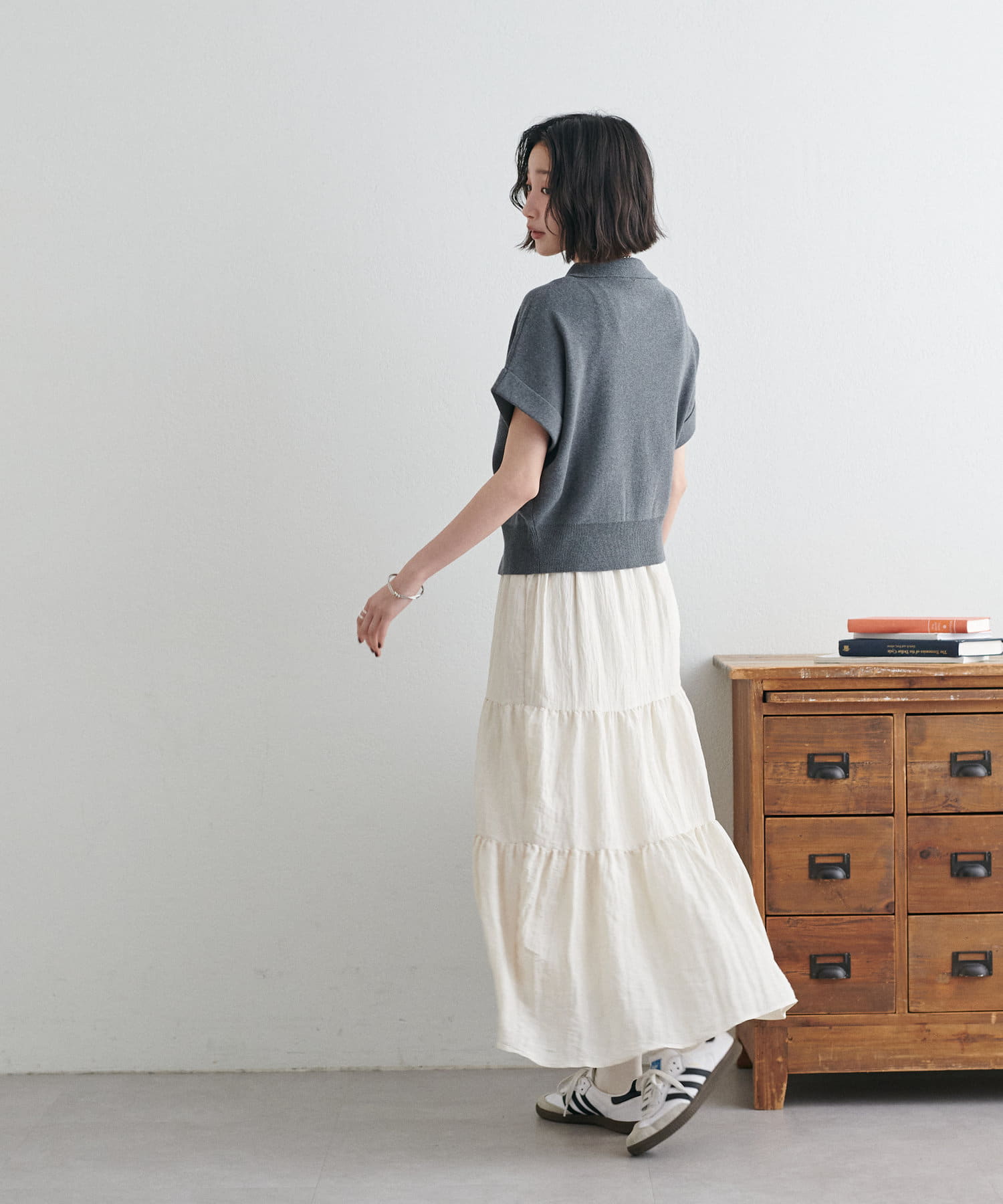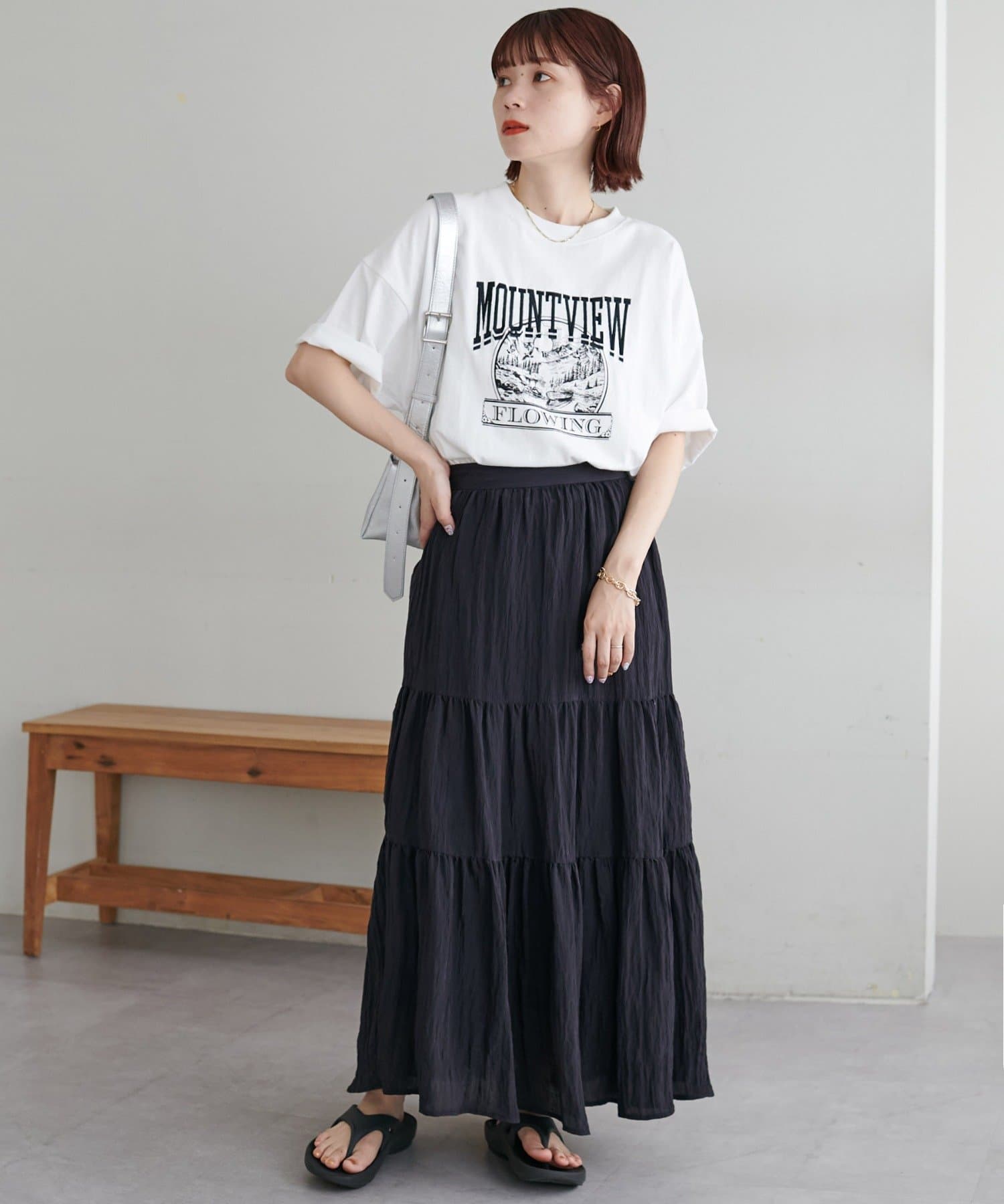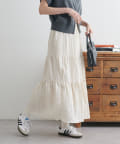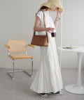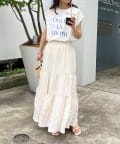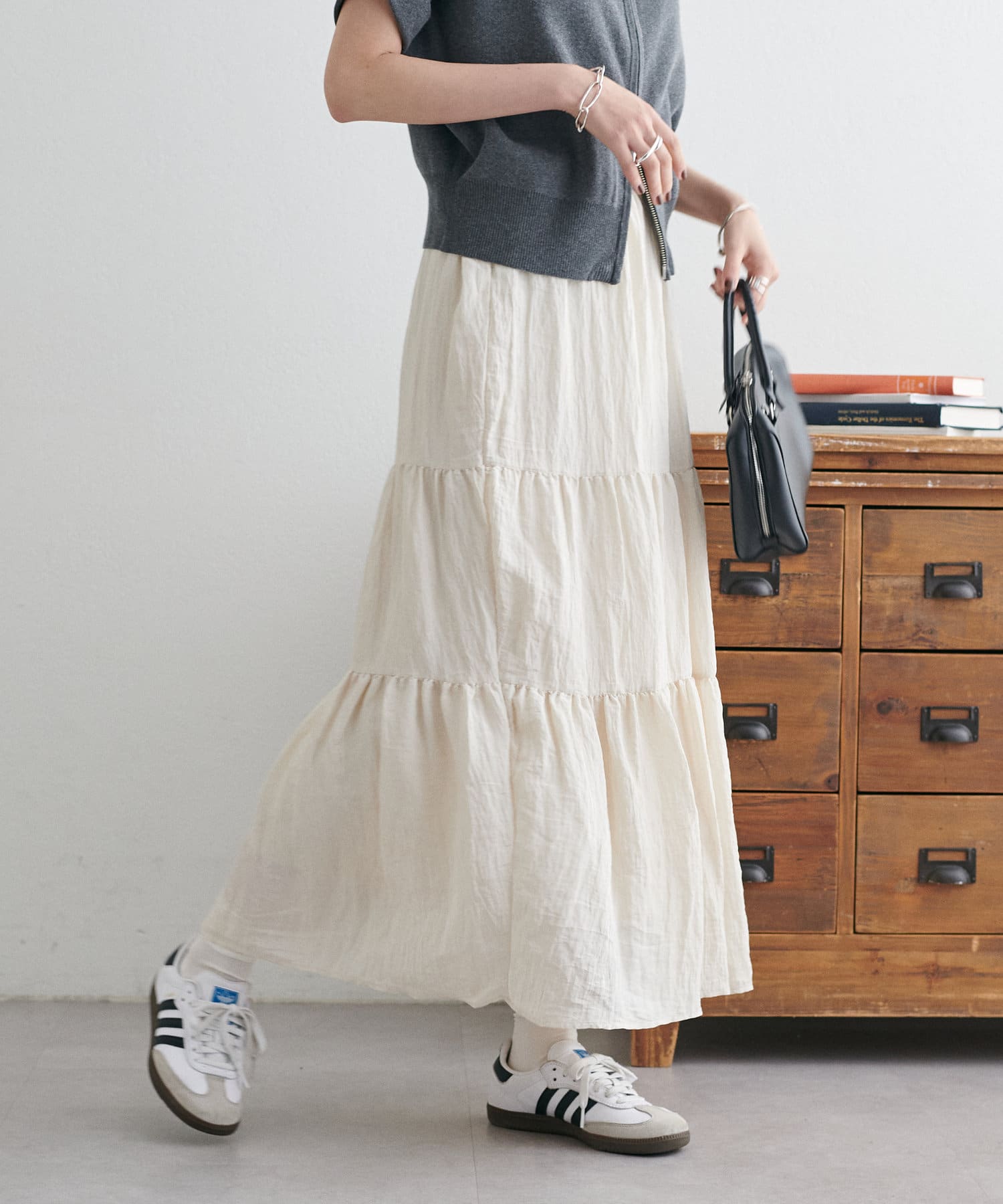 動くたびに揺れるシルエットが華やかな印象を与えます。ウエストはバックゴム仕様で着脱も楽ちんながら、トップスインも様になるデザイン。