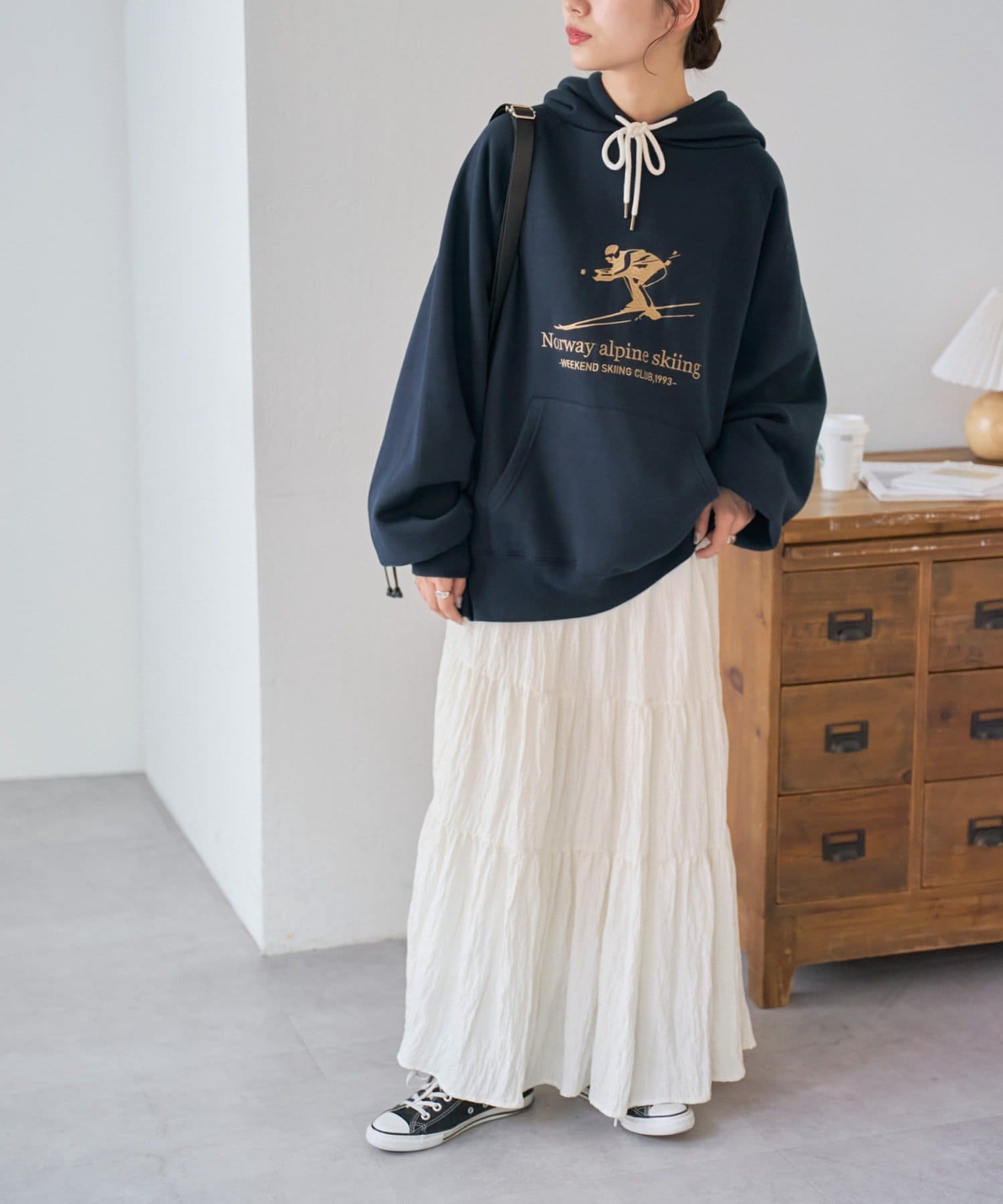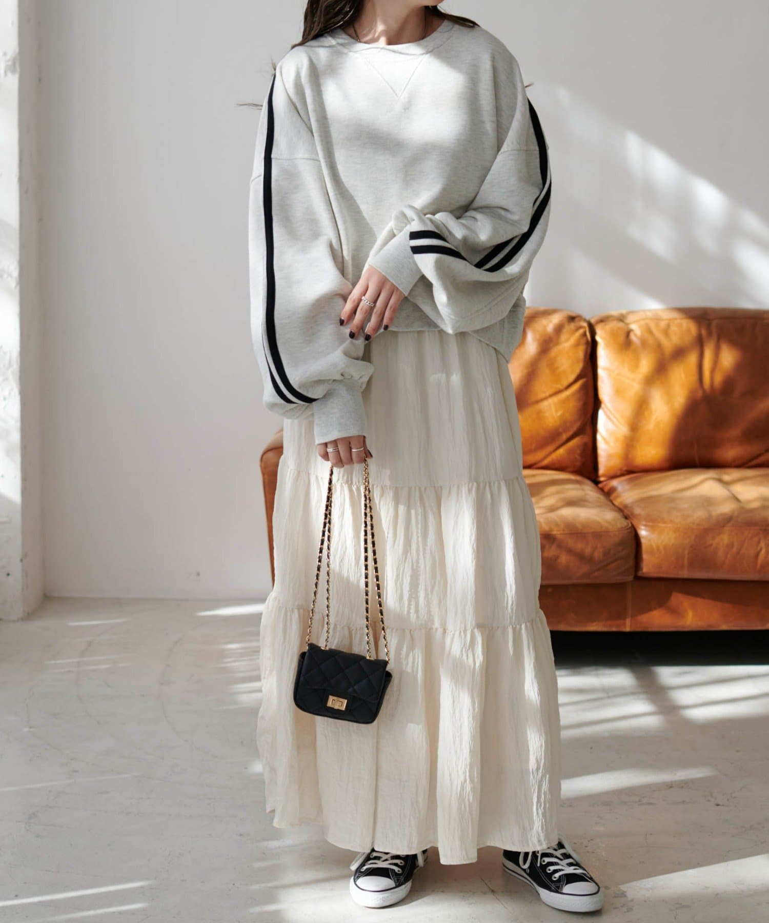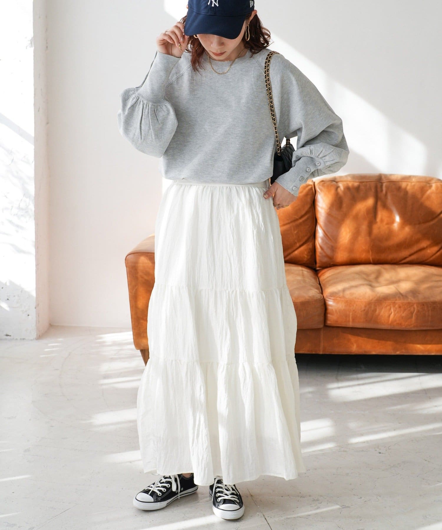 素材が軽く、動くたびにふわっと揺れる感じが可愛い。Tシャツやスウェットを合わせるだけで自然にこなれた印象に仕上がります。