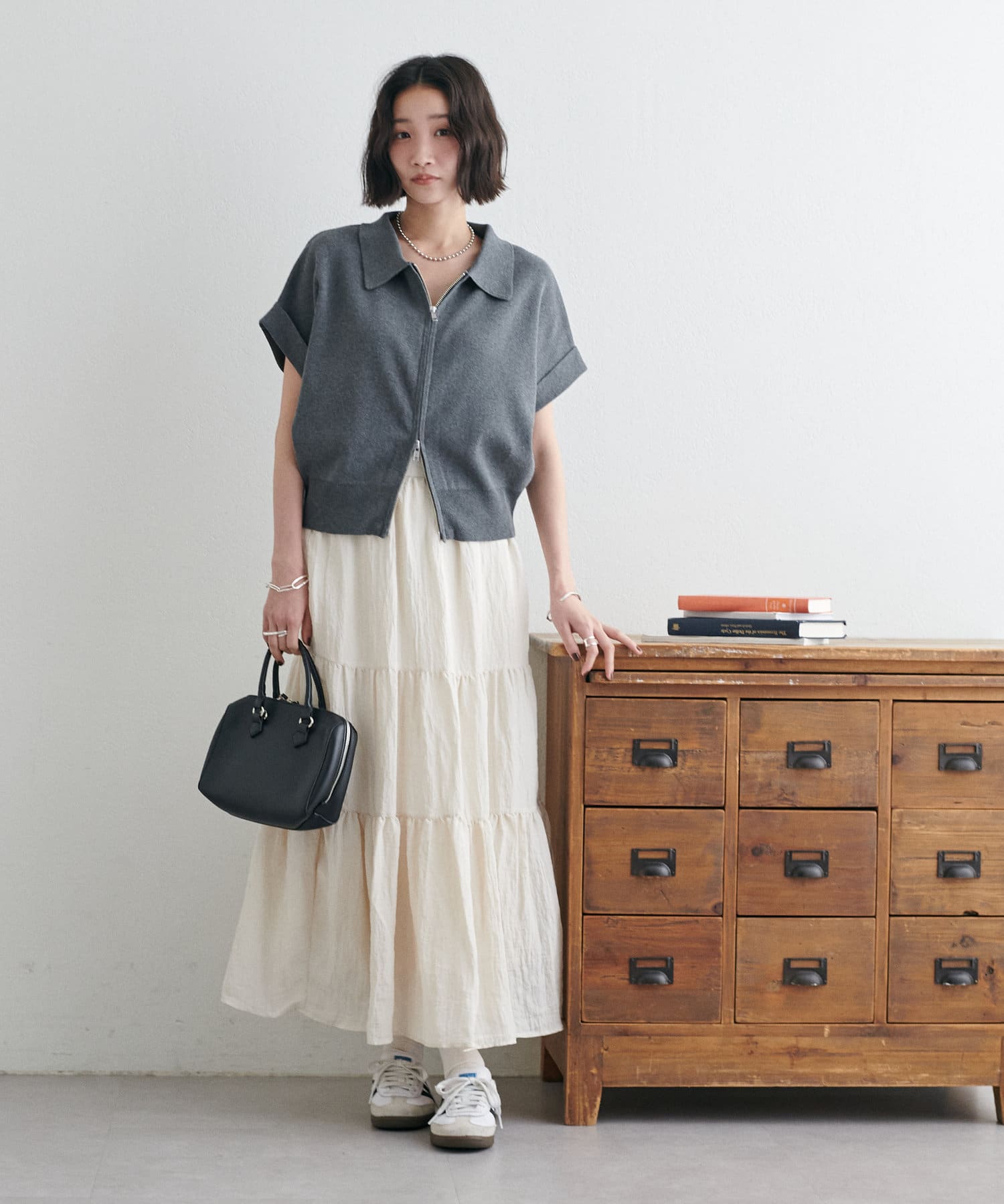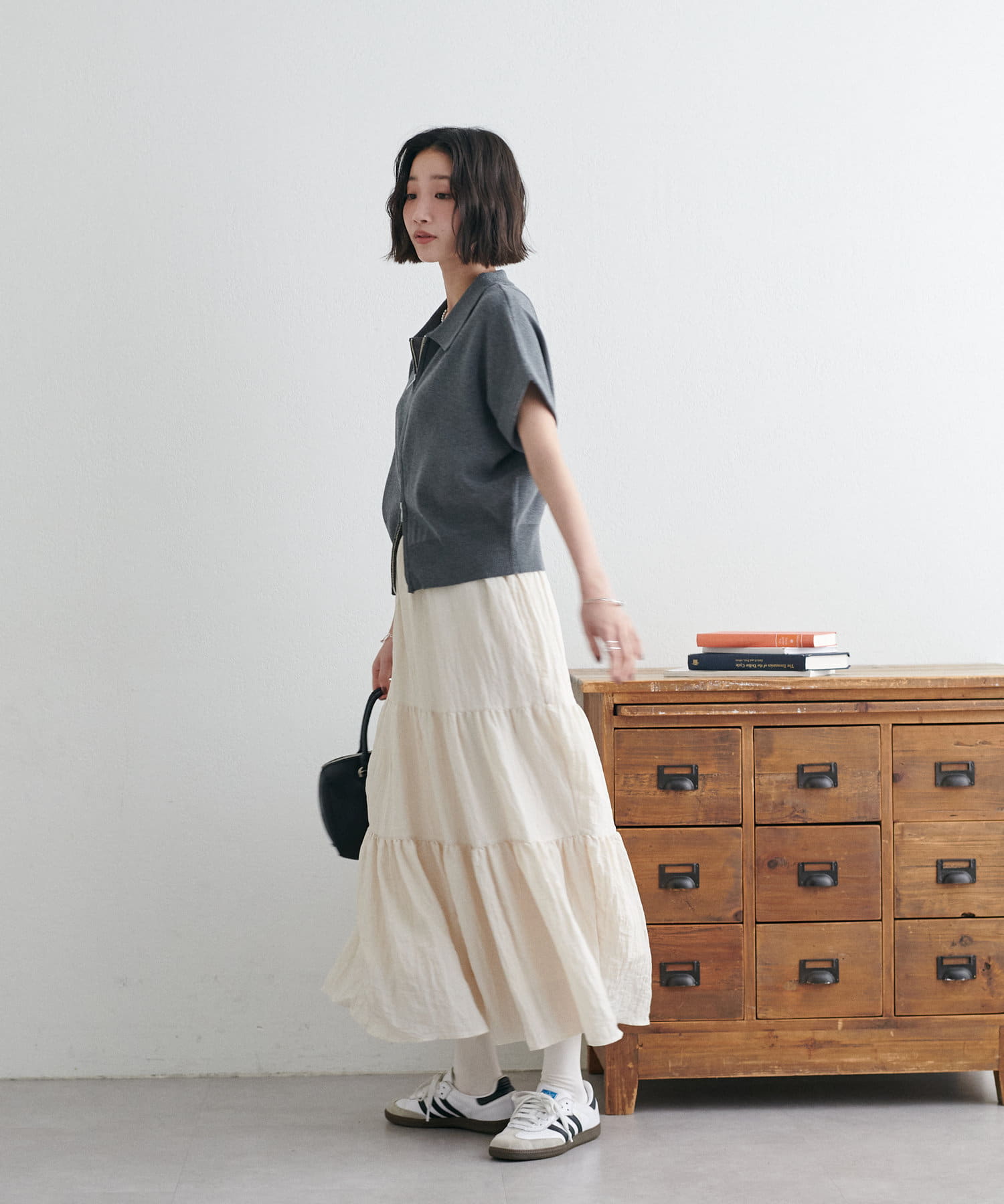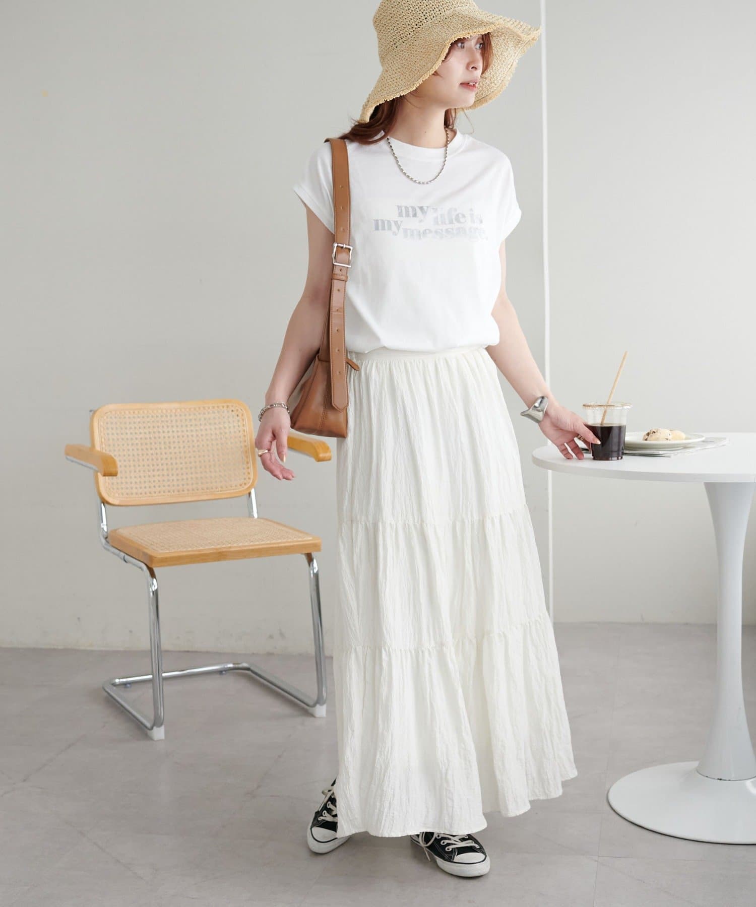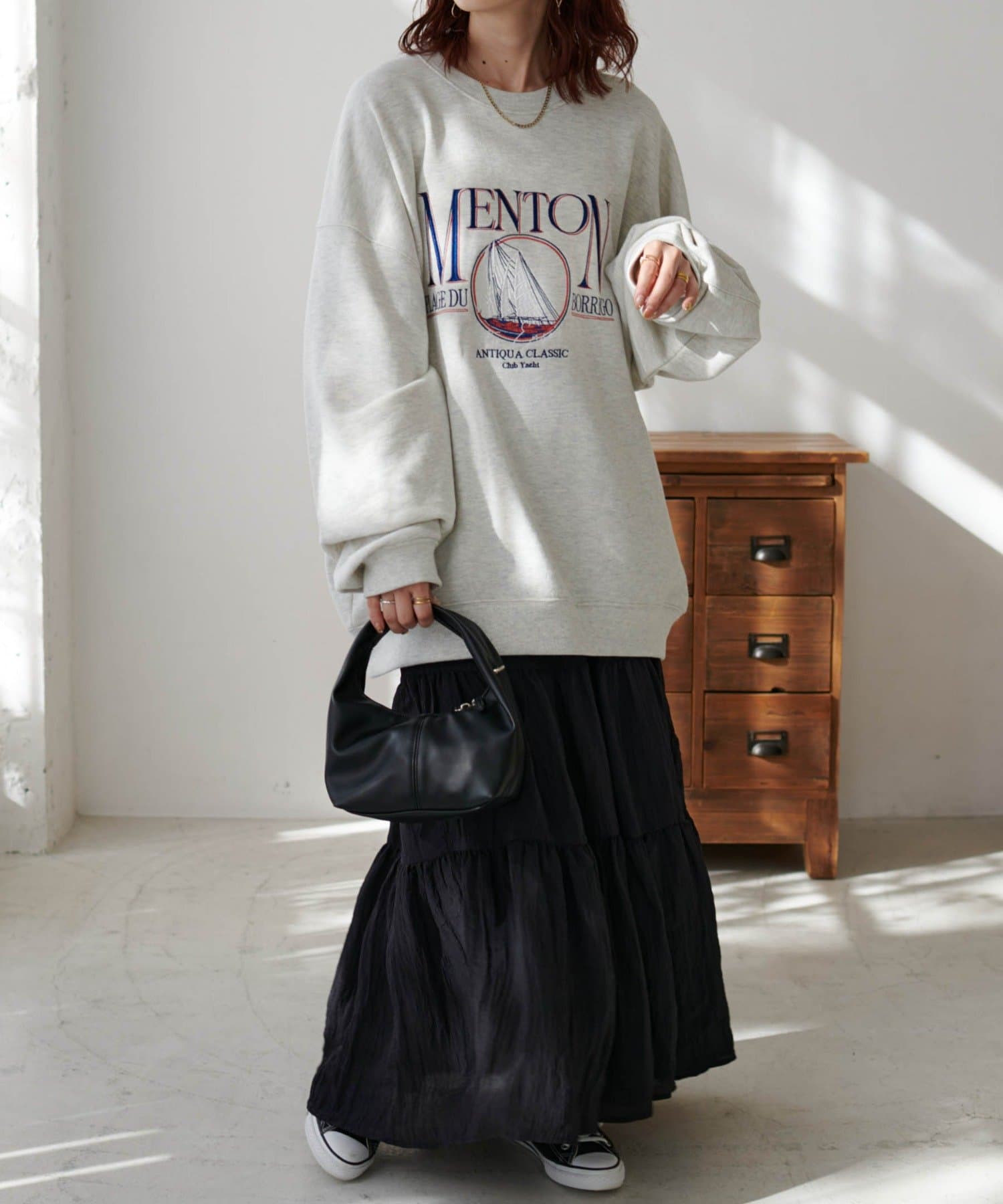 素材が軽く、動くたびにふわっと揺れる感じが可愛い。Tシャツやスウェットを合わせるだけで自然にこなれた印象に仕上がります。