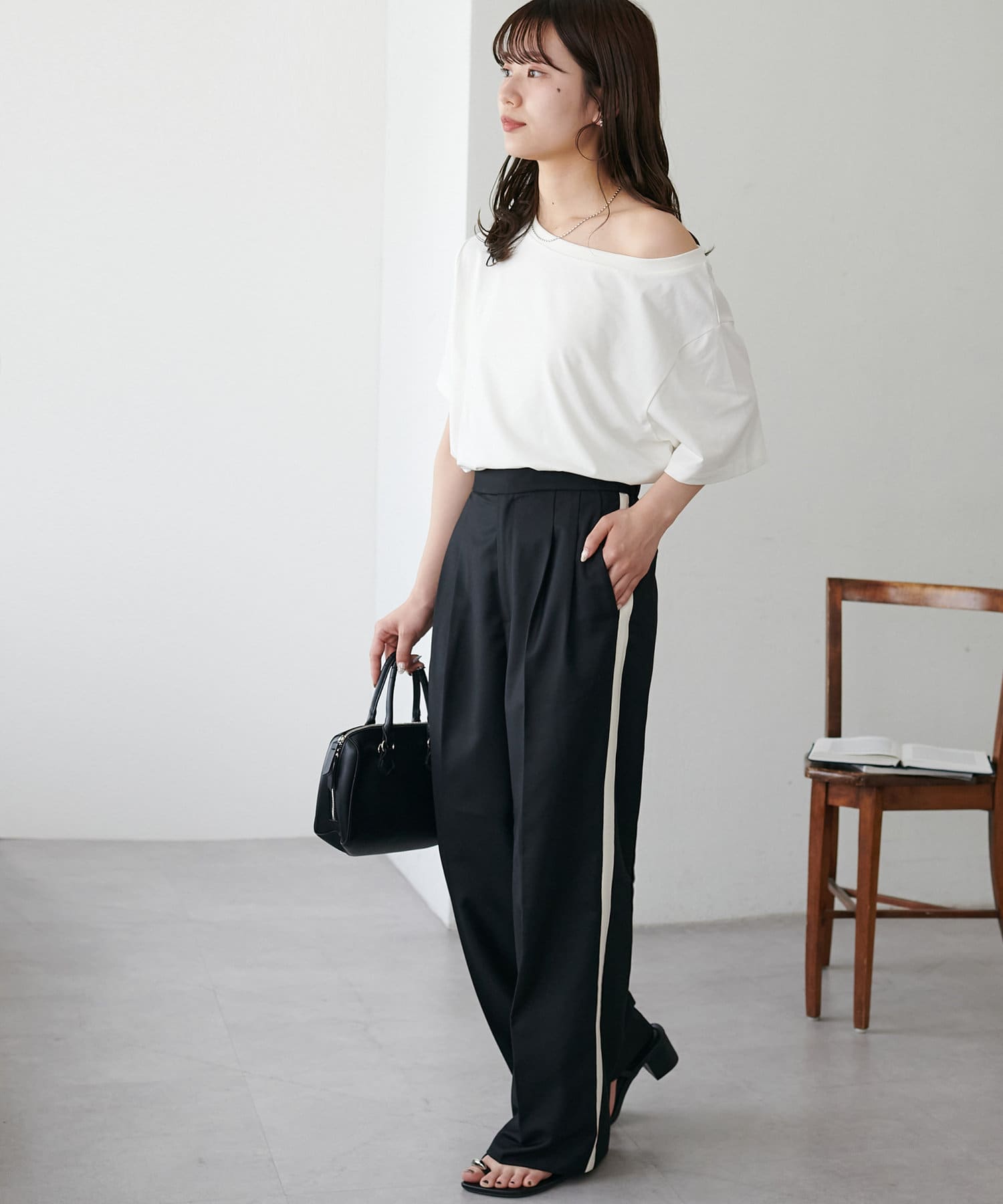 ・157cmスタッフ:サイドラインのデザインがポイントになるので、シンプルなトップスや無地のアイテムと合わせてもコーデが決まります!