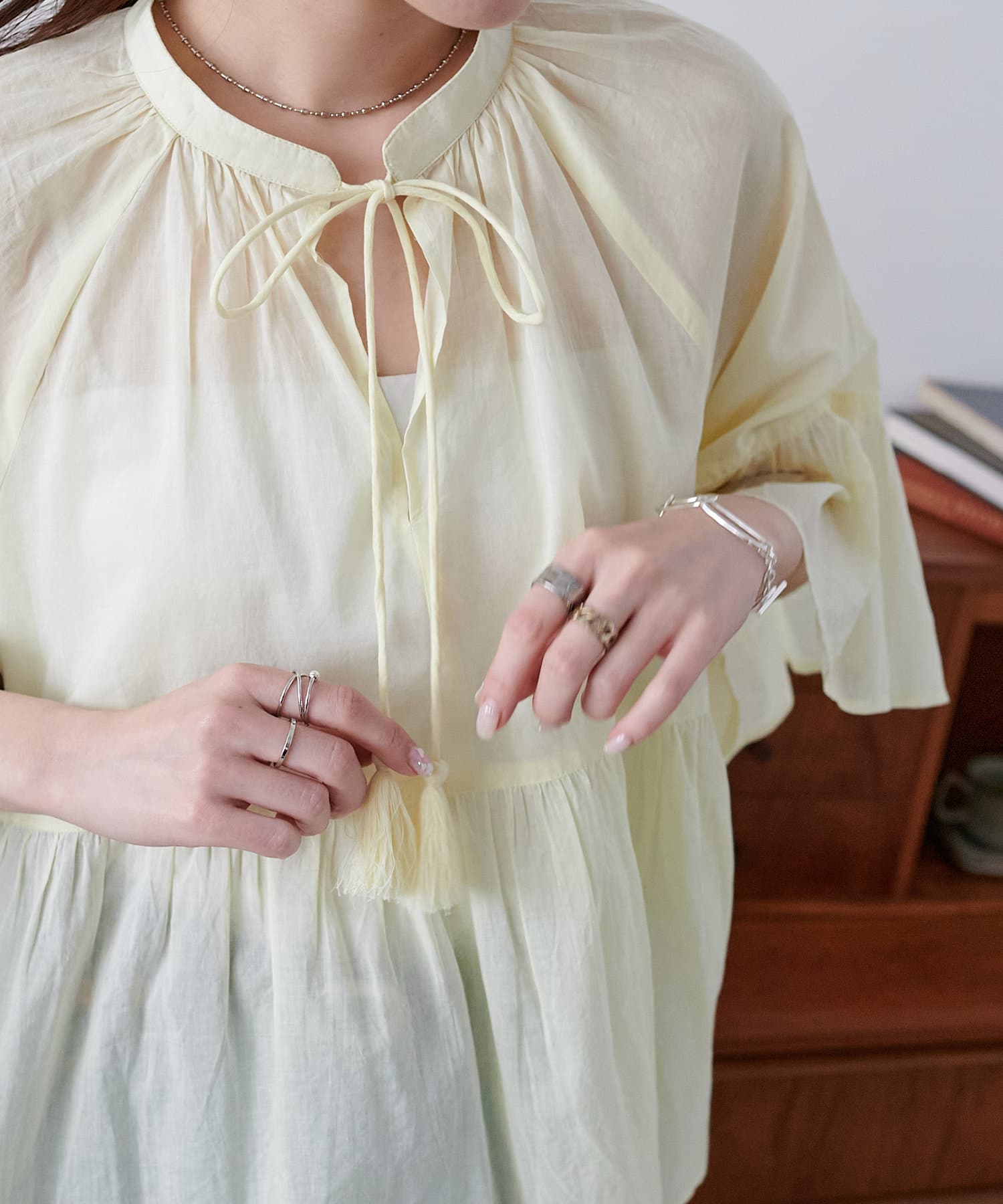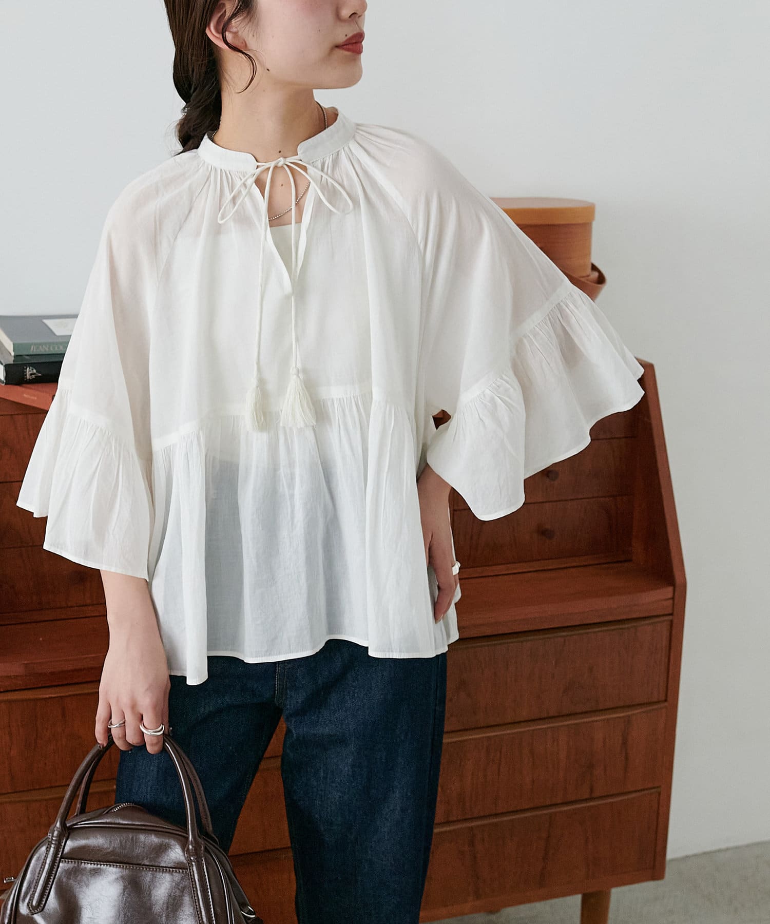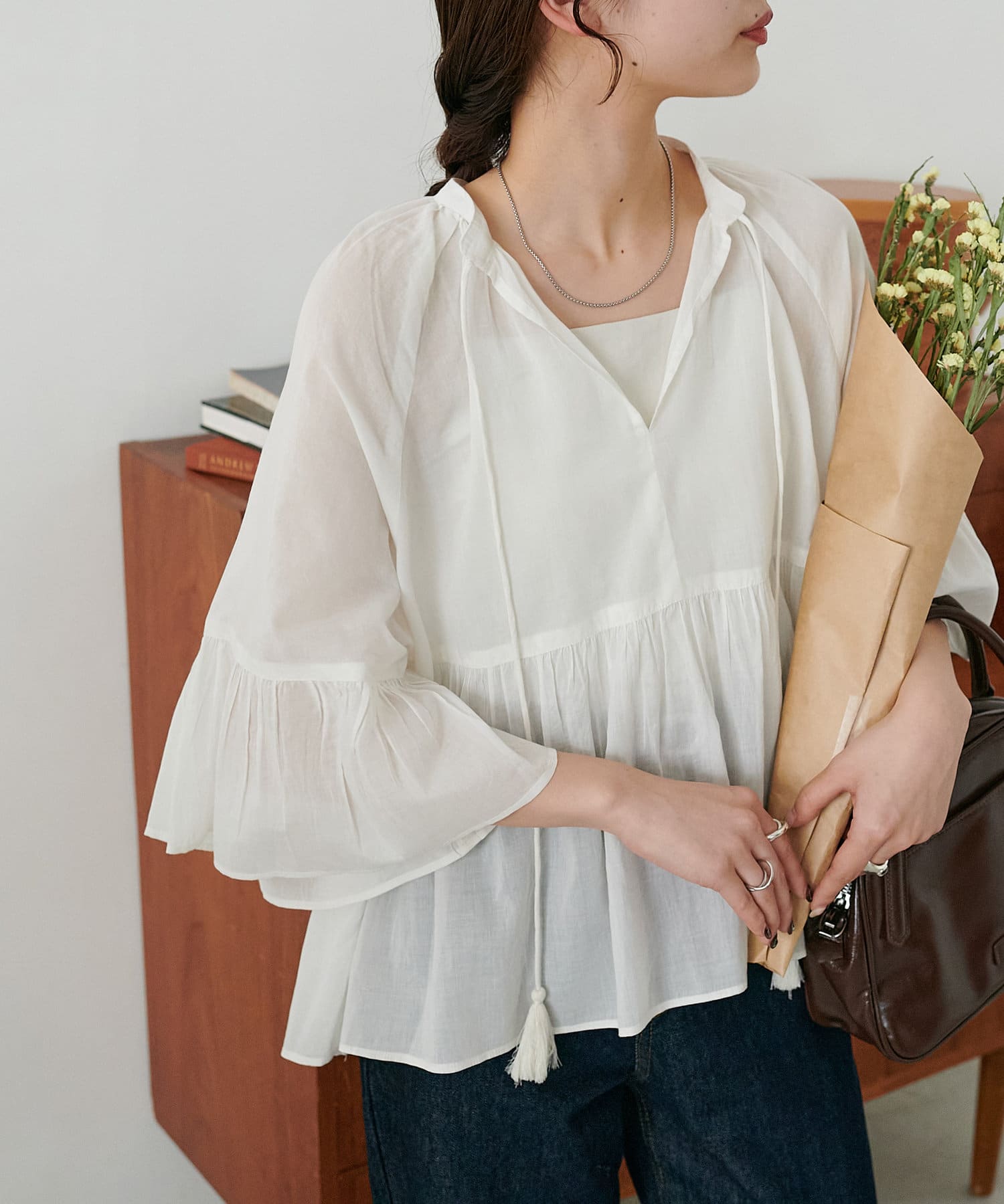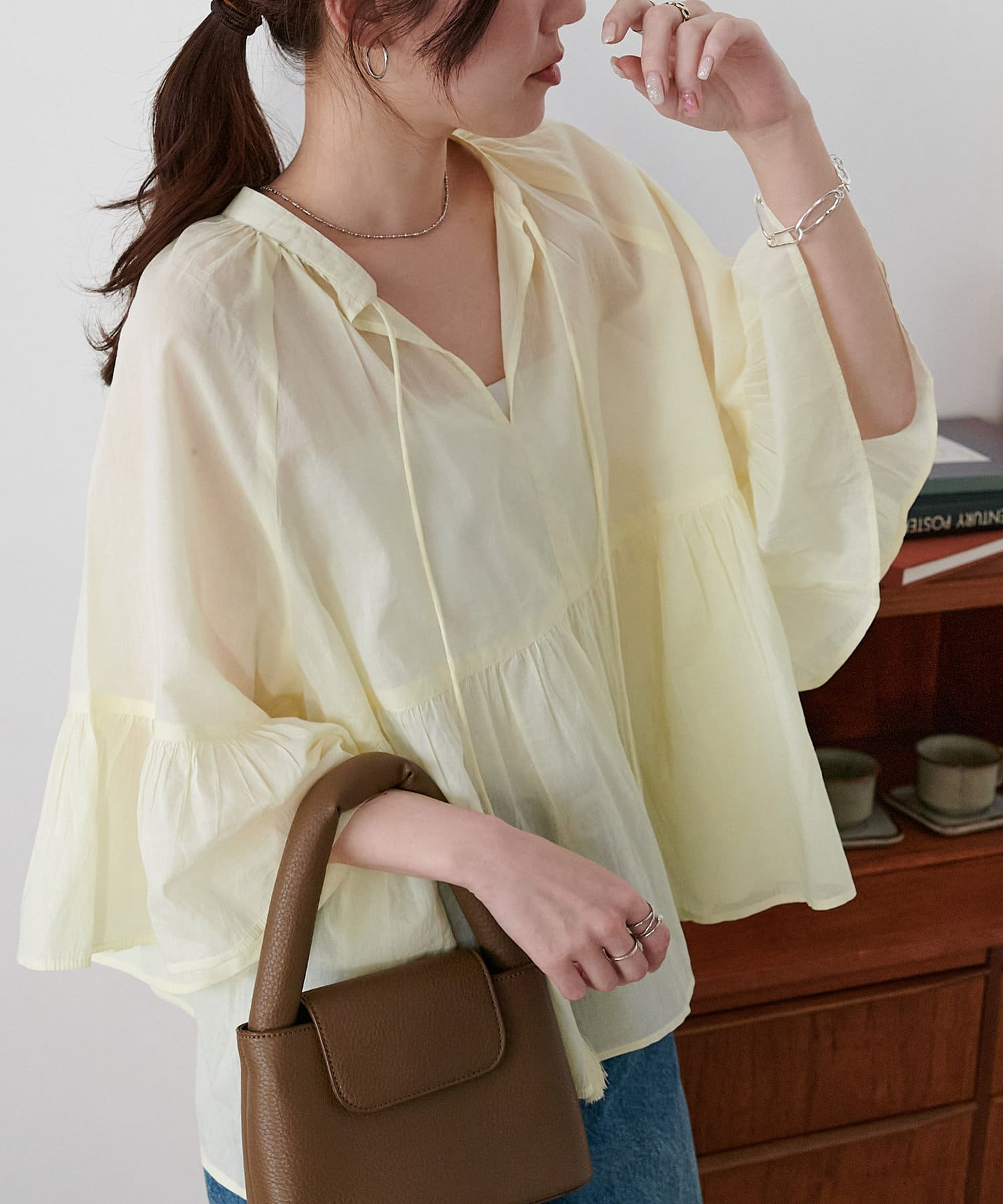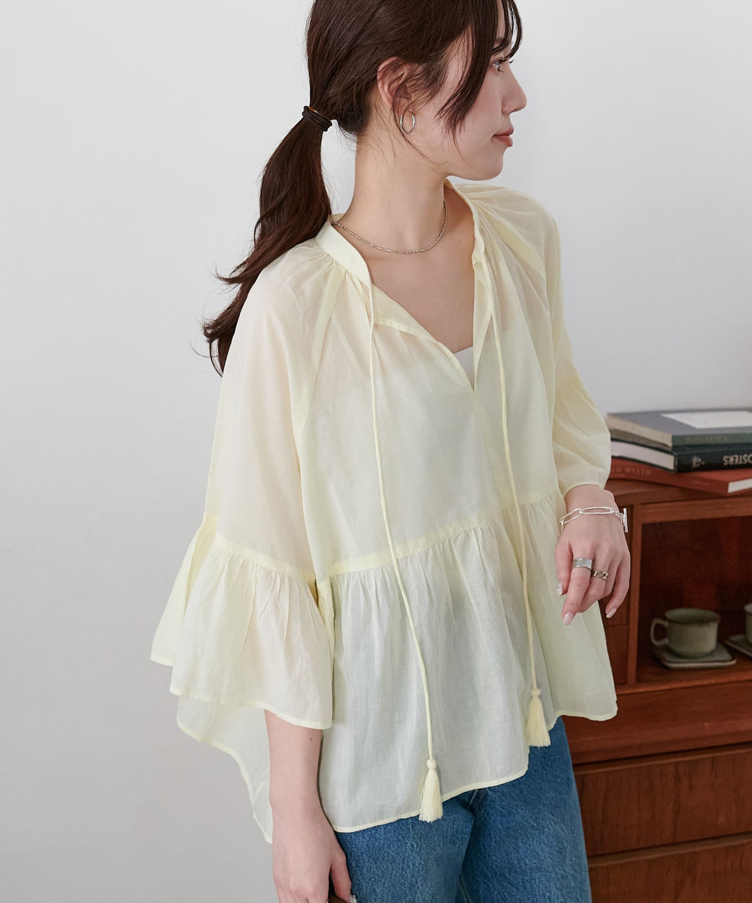 動くたびに揺れ感のあるデザインは軽やかな印象になり、春のトップスにぴったり◎