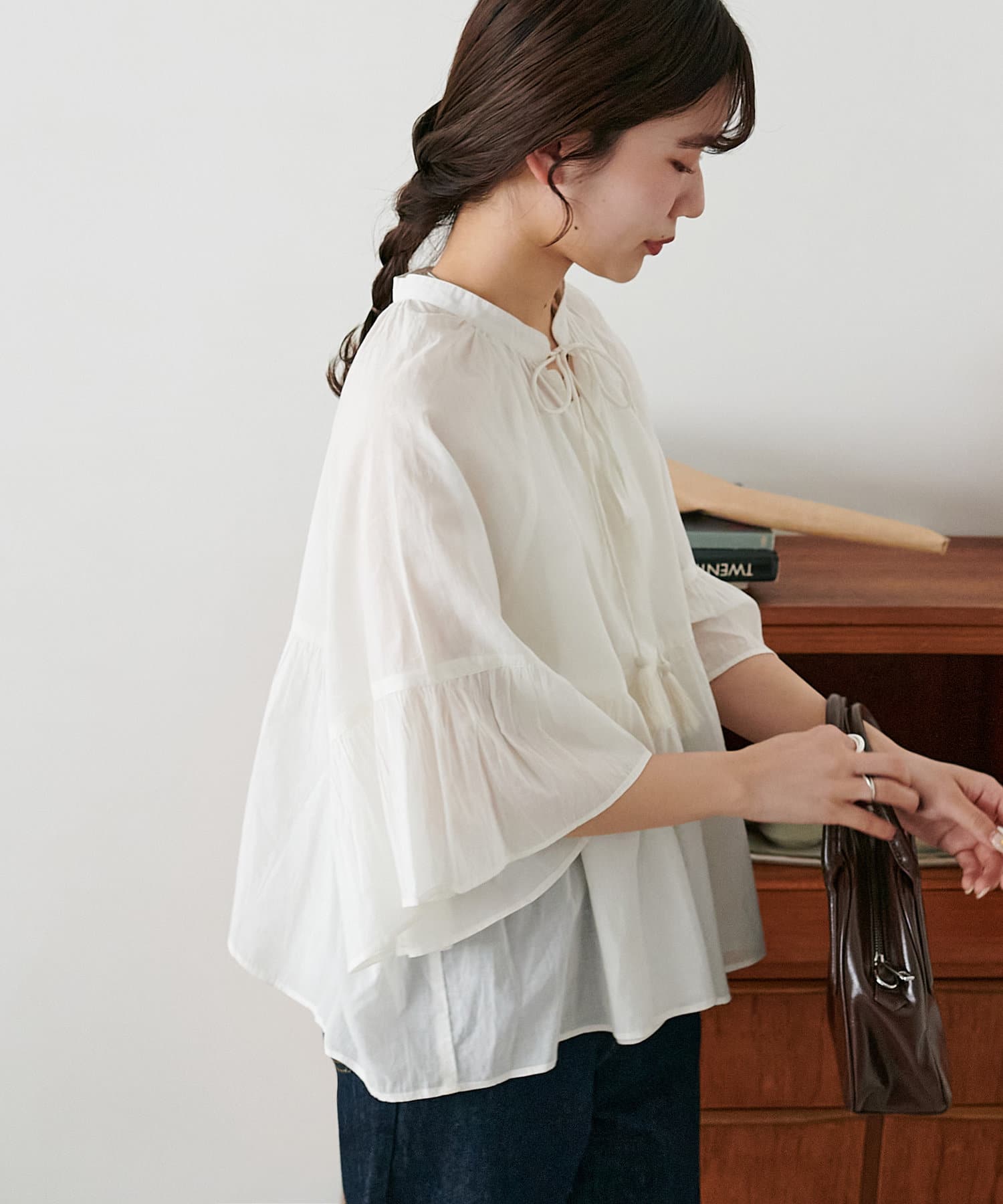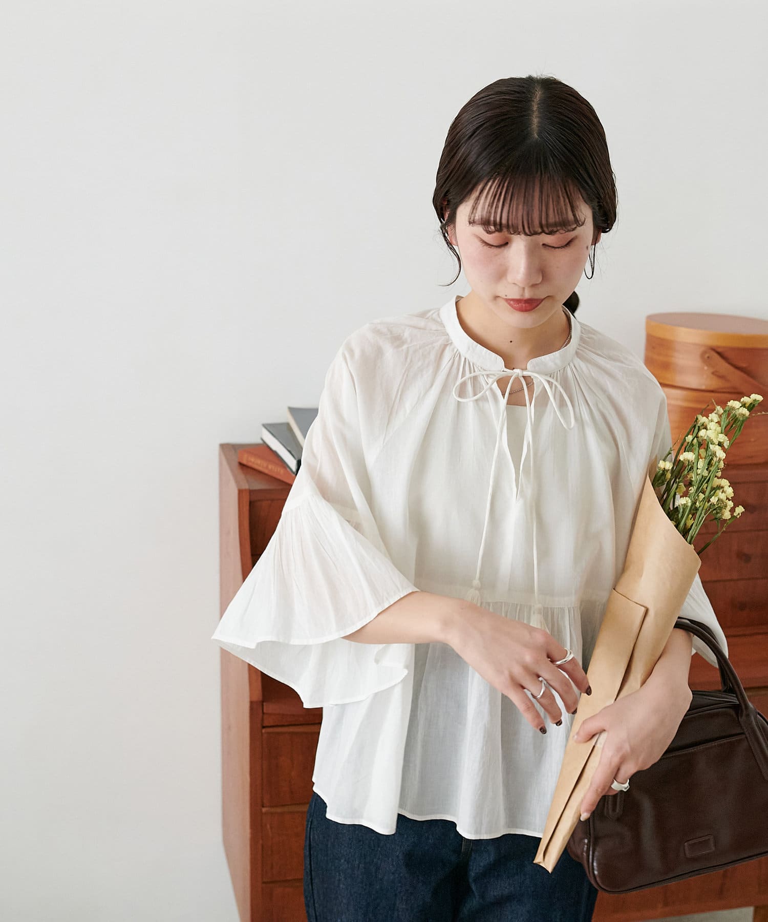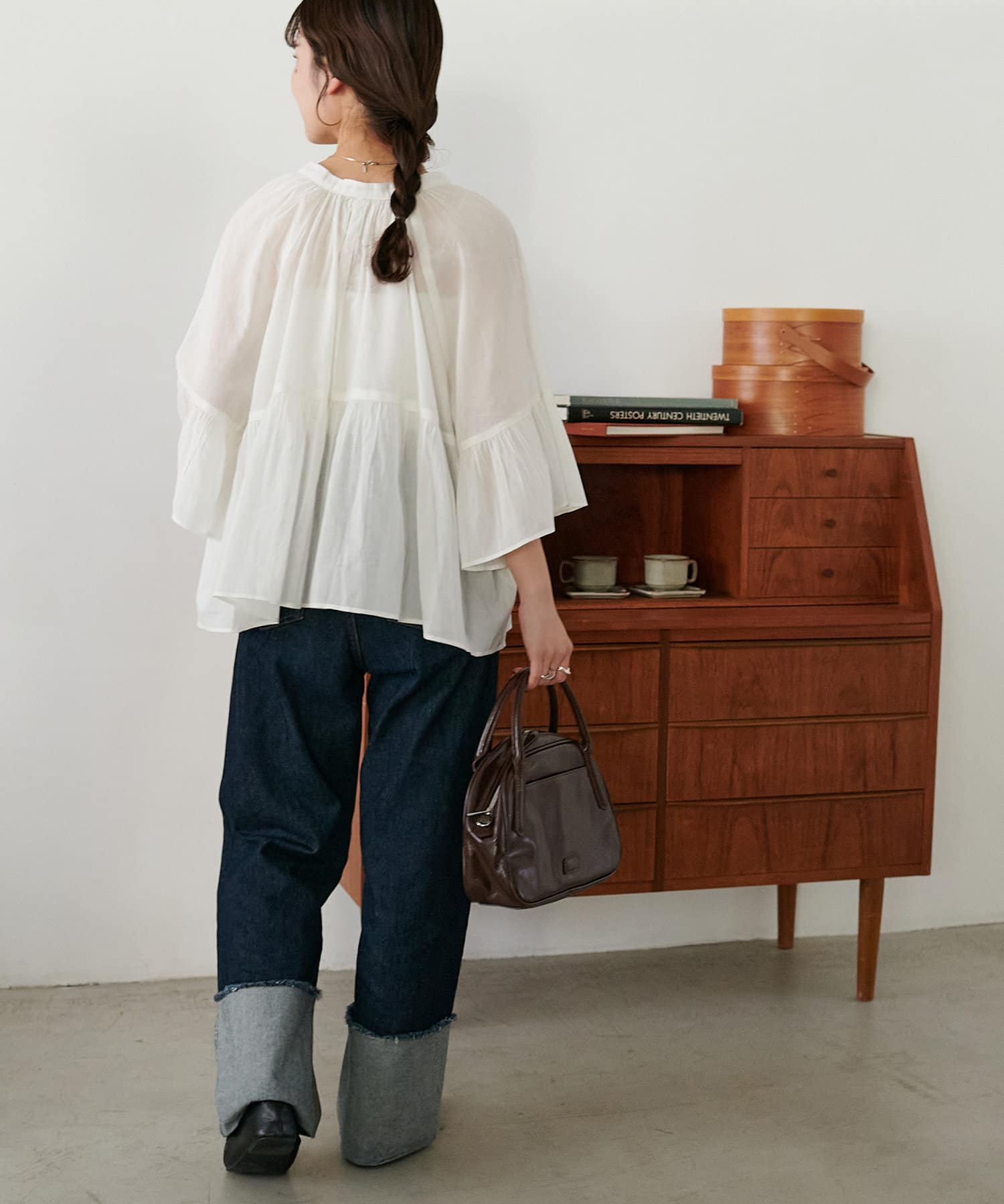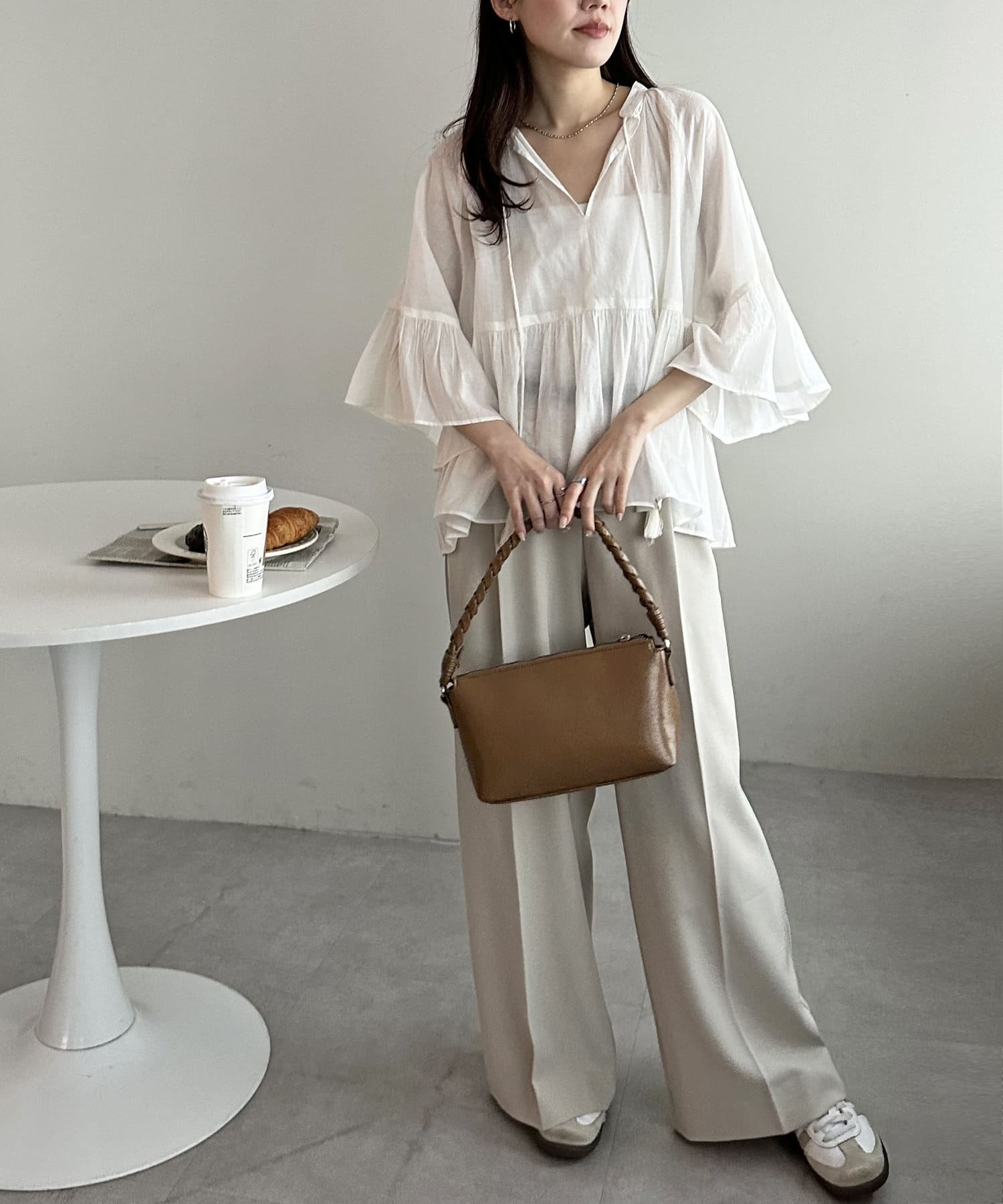 一枚で着てもサマになるブラウスですが、シンプルなデザインだからこそ、様々なボトムスとの組み合わせも楽しめます。