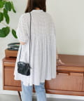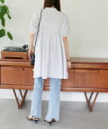 ・裾に向かって広がるシルエットながら、胸元の切り替えや袖口のゴム仕様でメリハリのある着こなしに