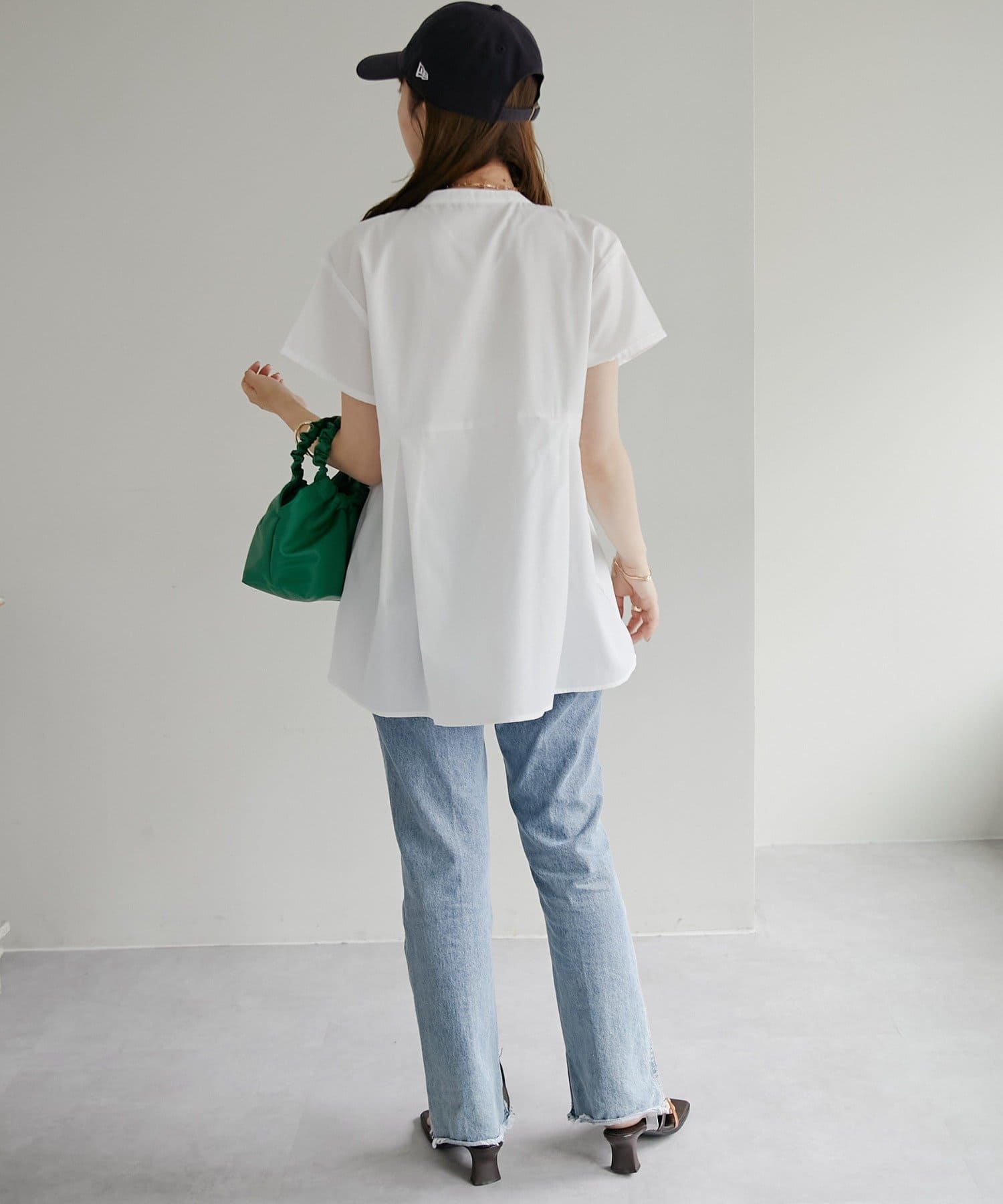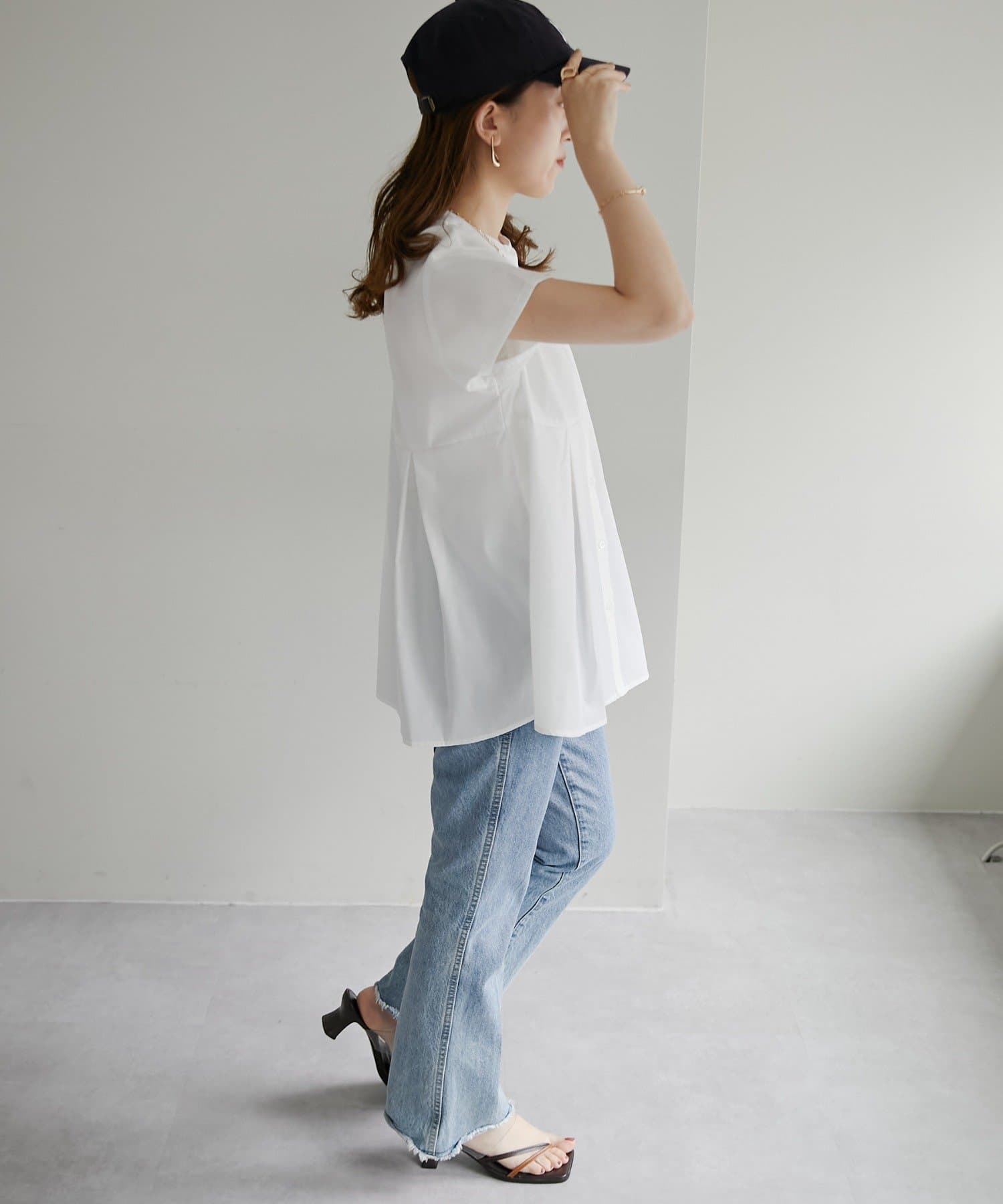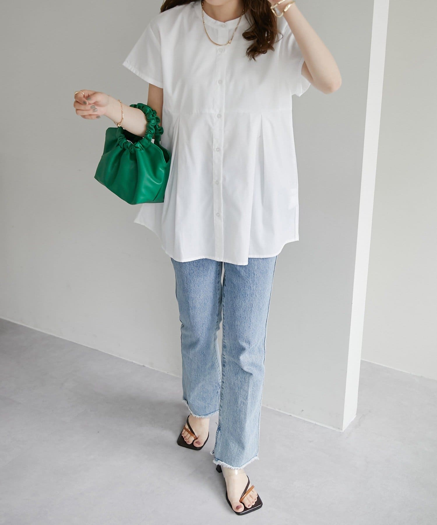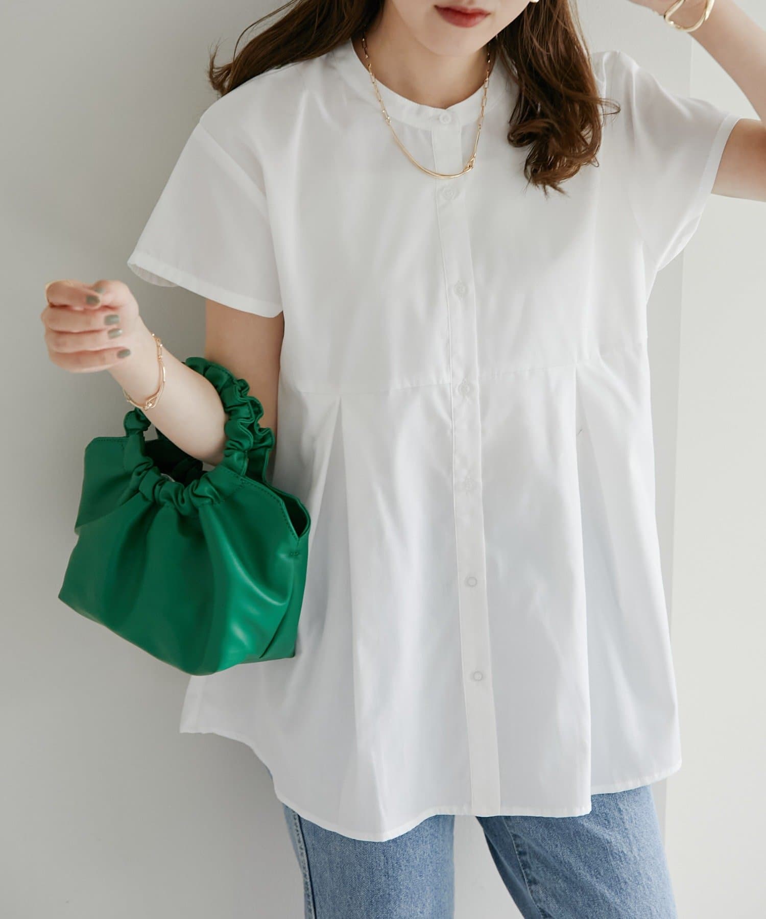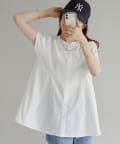 高めに設定したウエスト部分をタック加工で切り替えた、大人フェミニンなシャツブラウス。