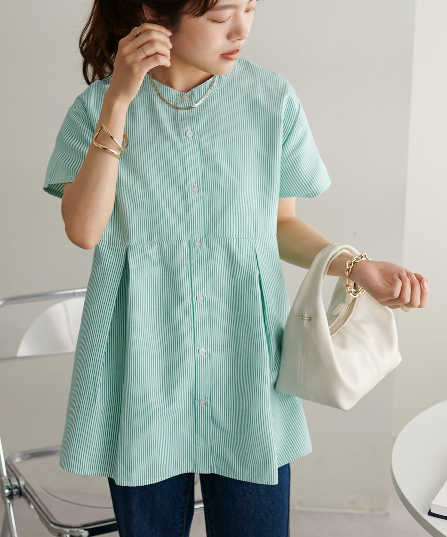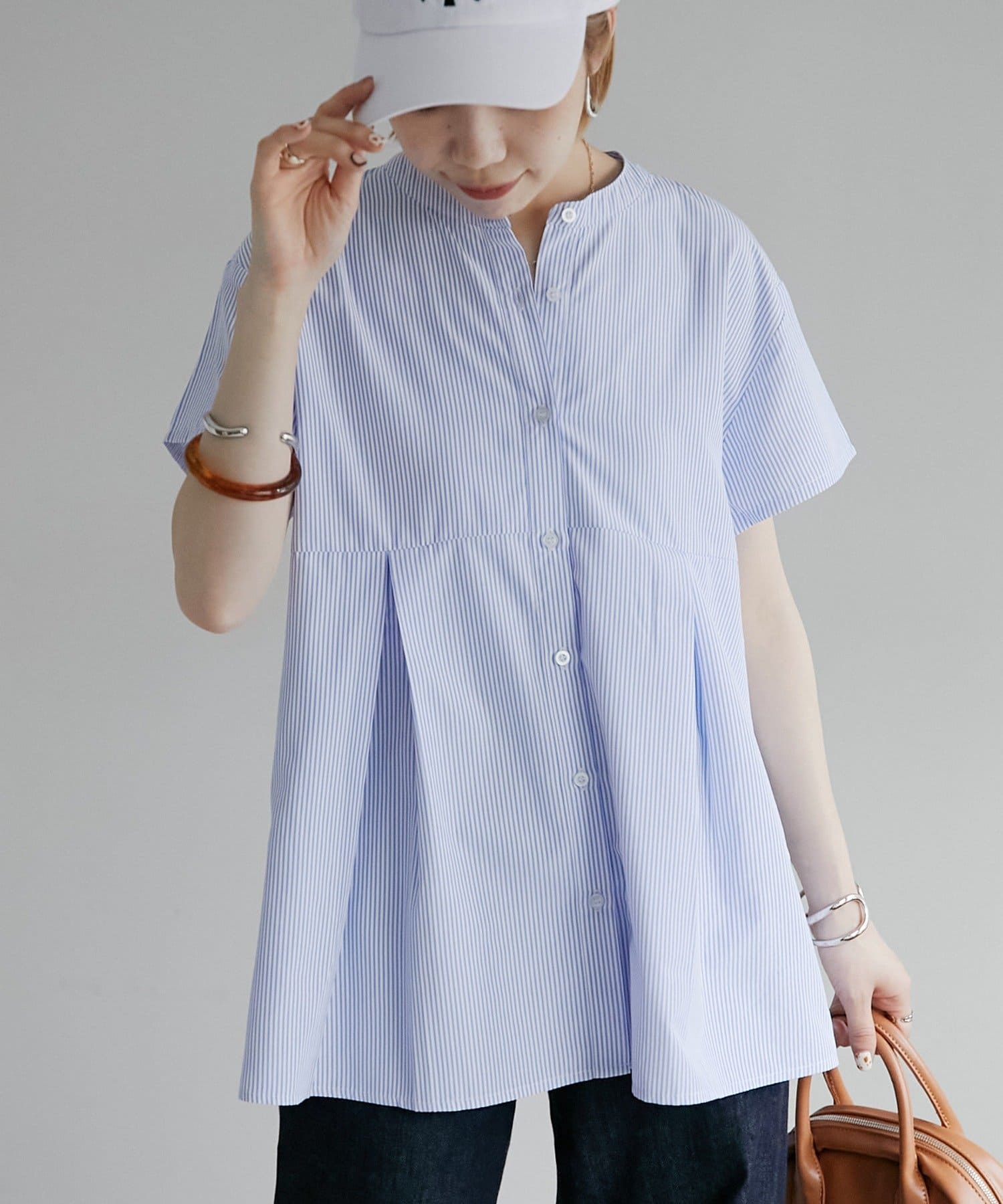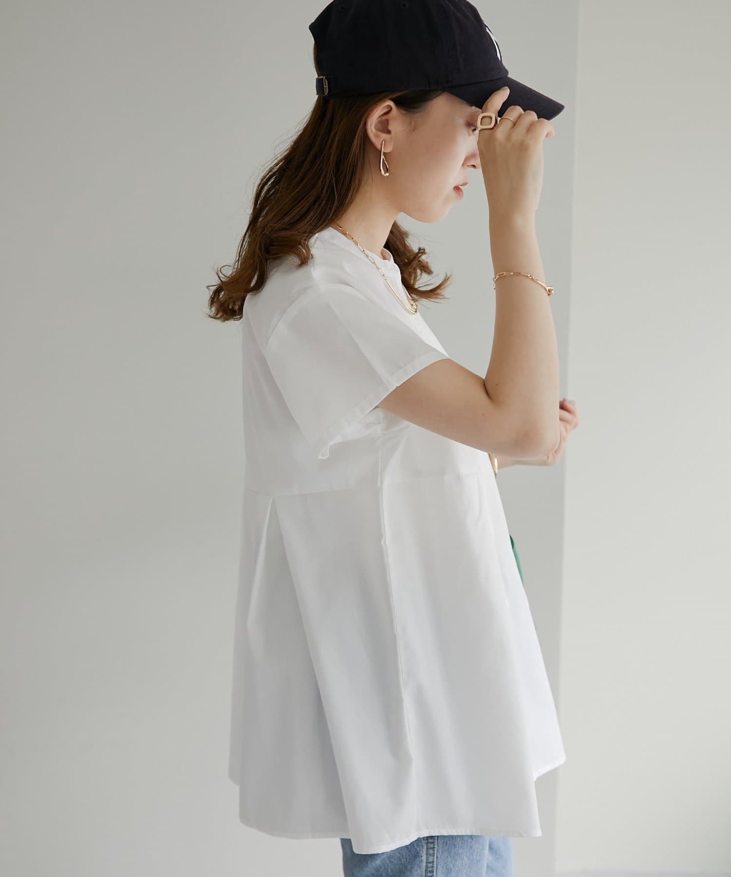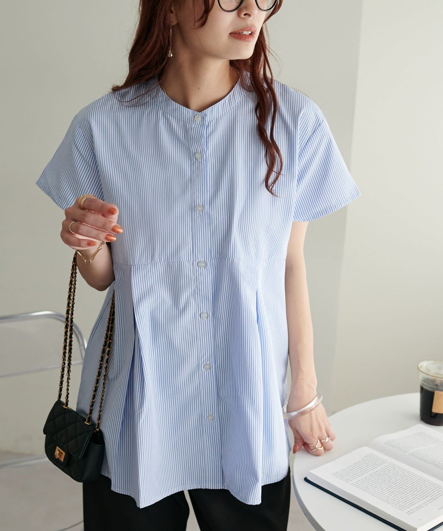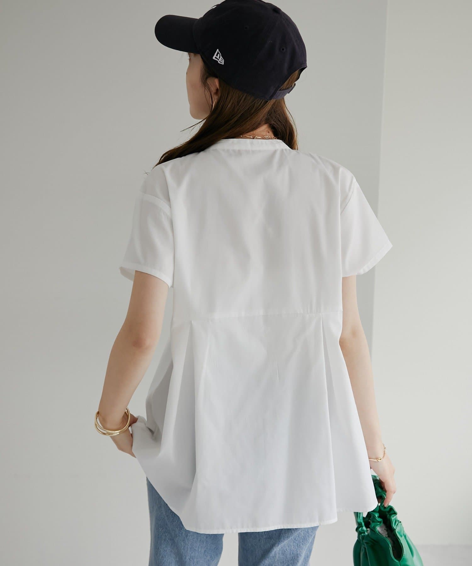 高めに設定したウエスト部分をタック加工で切り替えた、大人フェミニンなシャツブラウス。