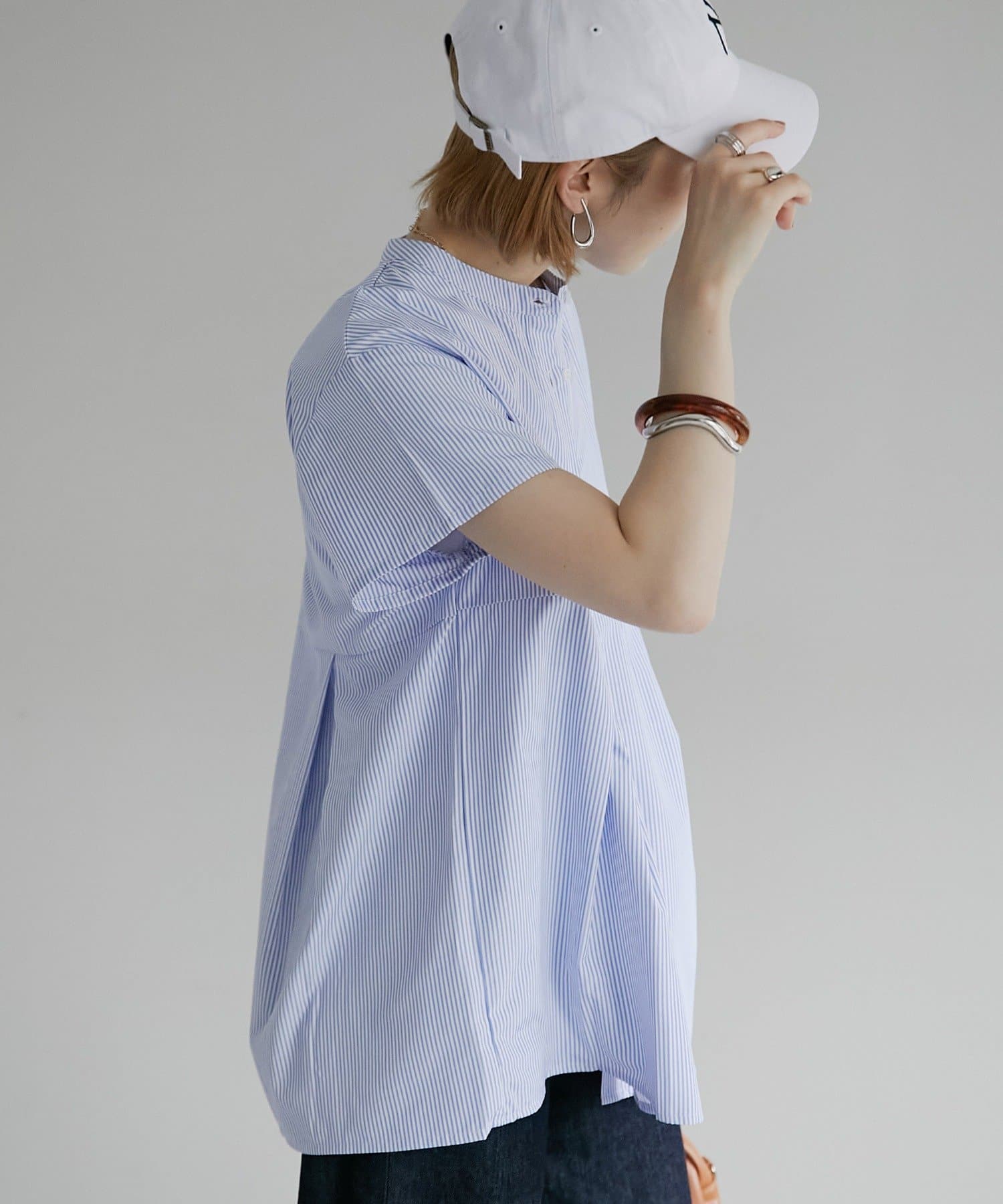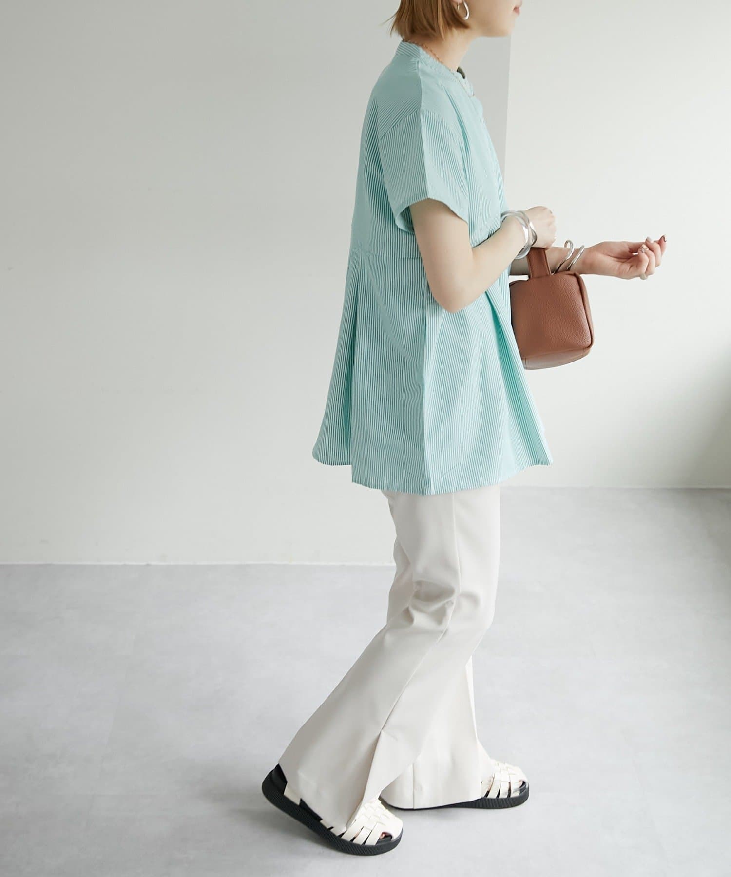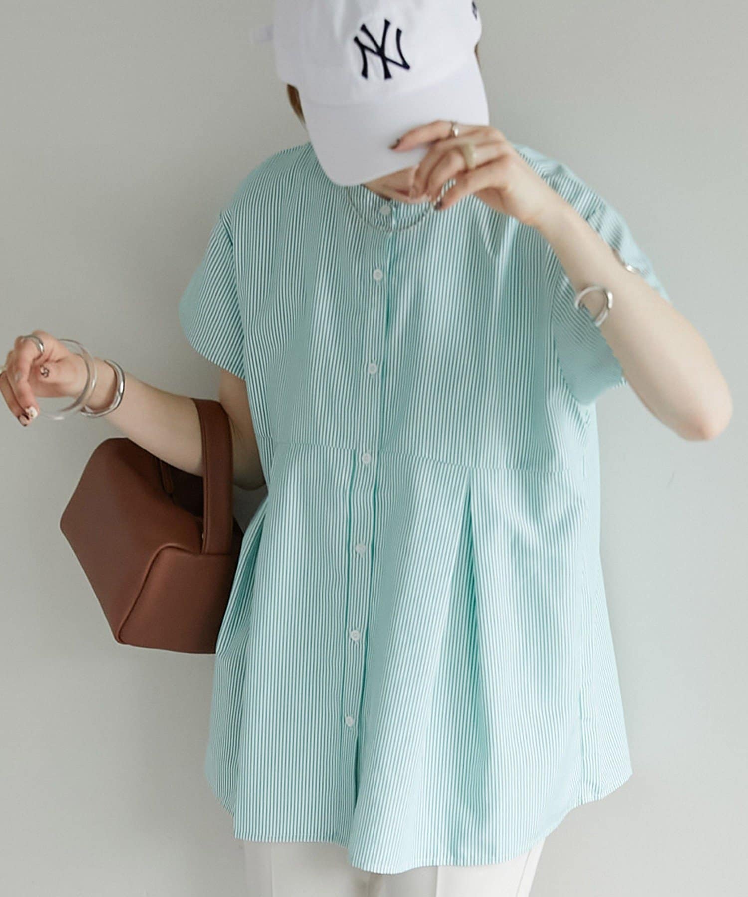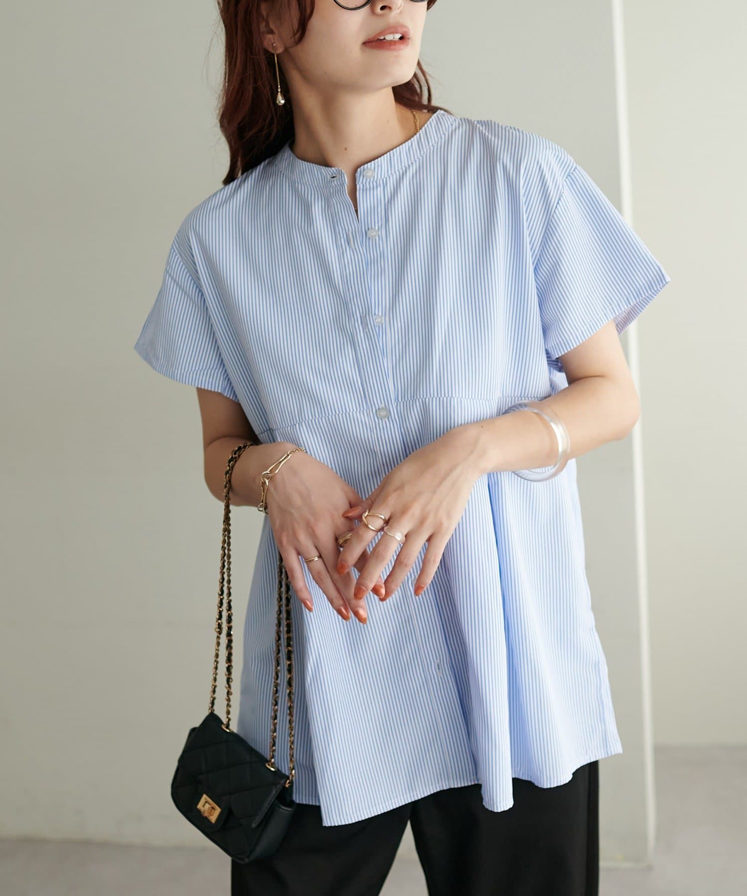 高めに設定したウエスト部分をタック加工で切り替えた、大人フェミニンなシャツブラウス。