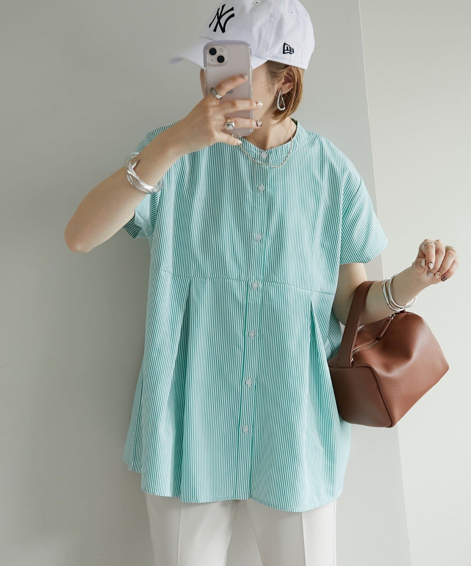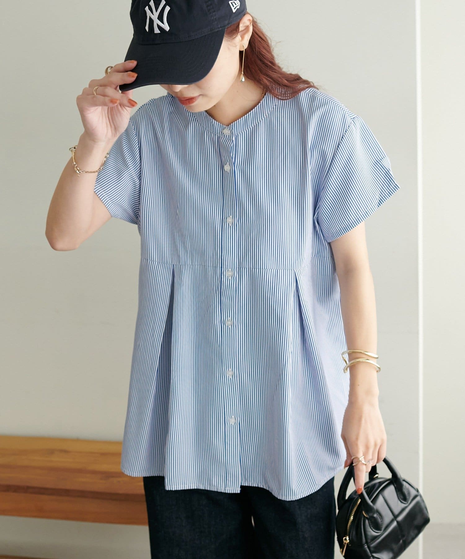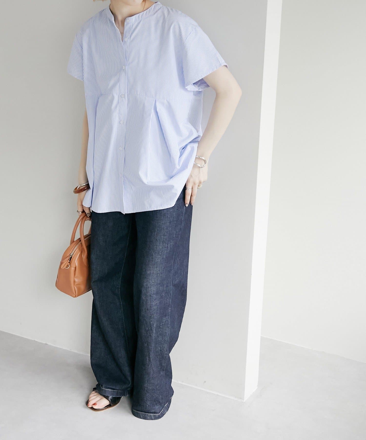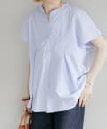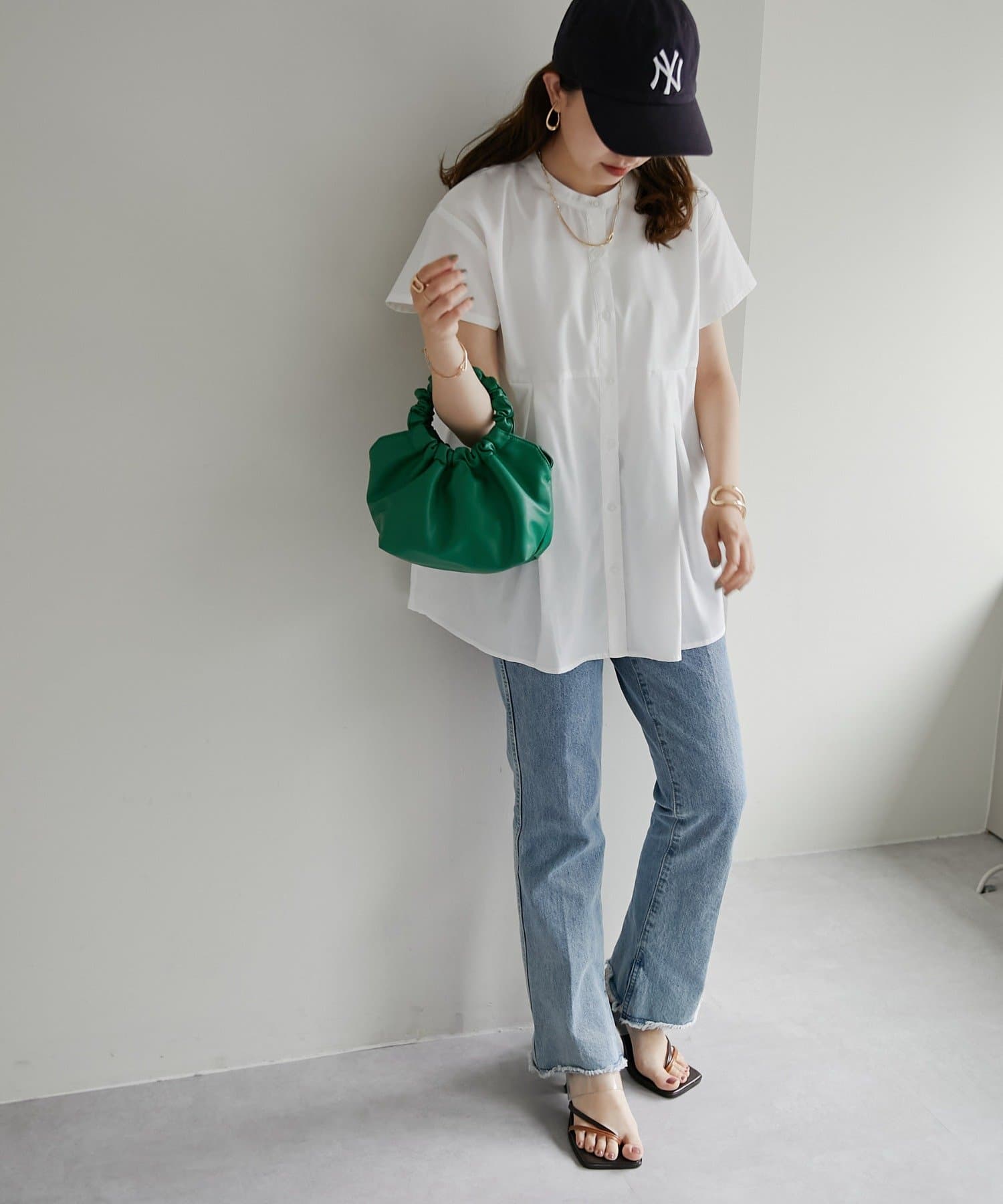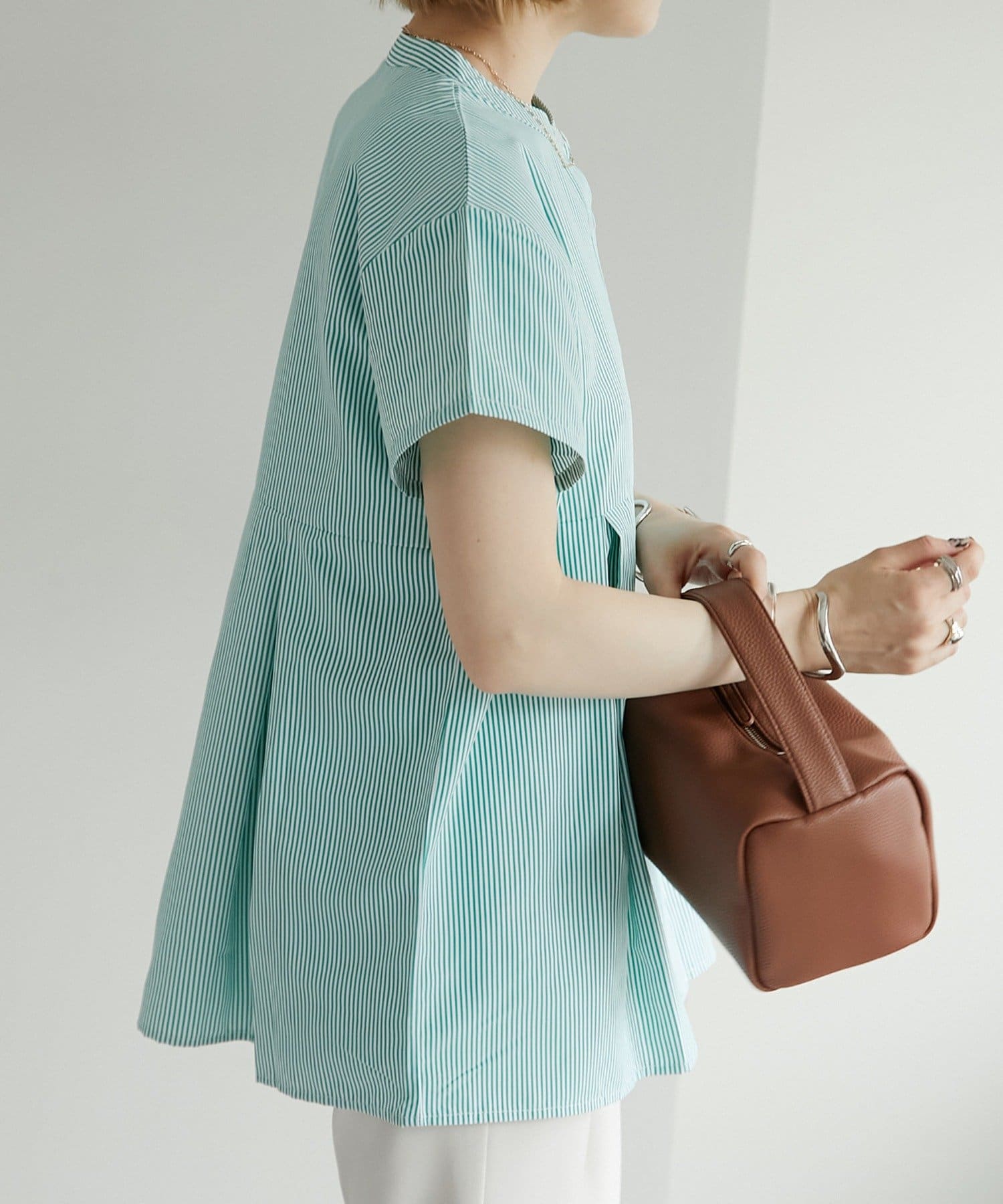 高めに設定したウエスト部分をタック加工で切り替えた、大人フェミニンなシャツブラウス。