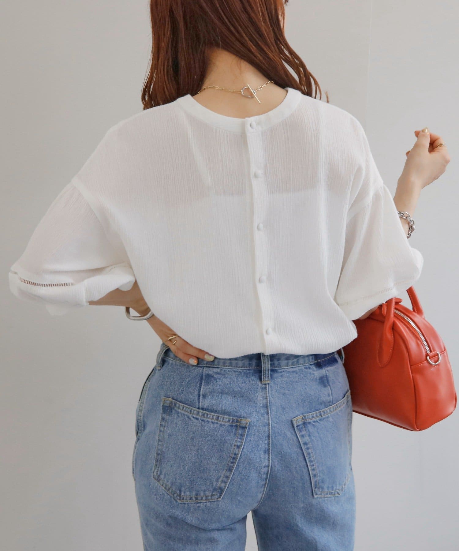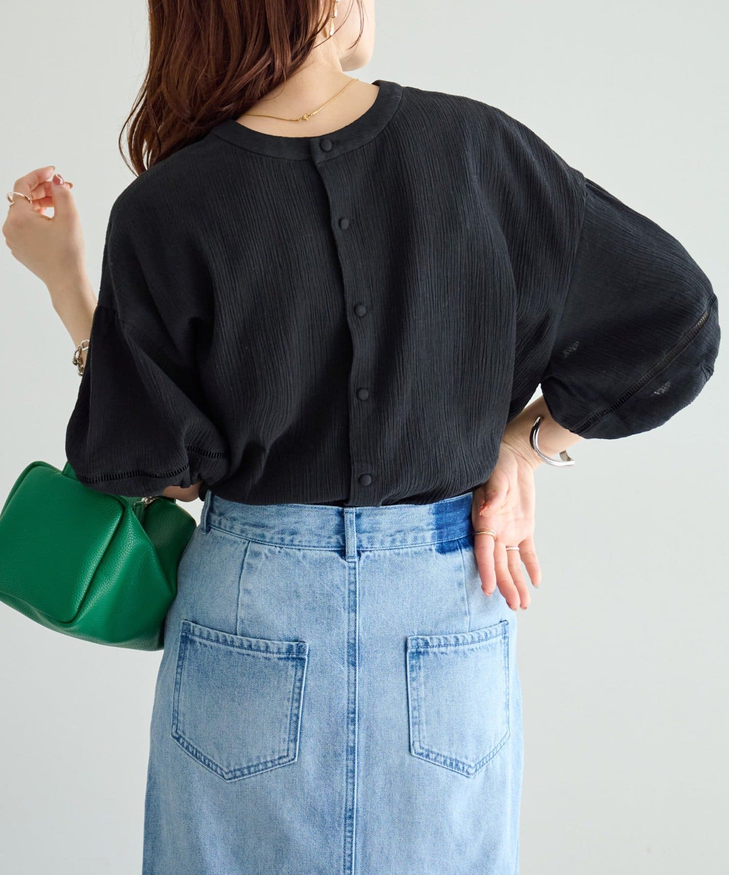 黒は思ったより透けないです。前後2wayなので仕事のときはボタンを前に、とか使いわけられるのが楽しいです。五分袖で二の腕も安心!