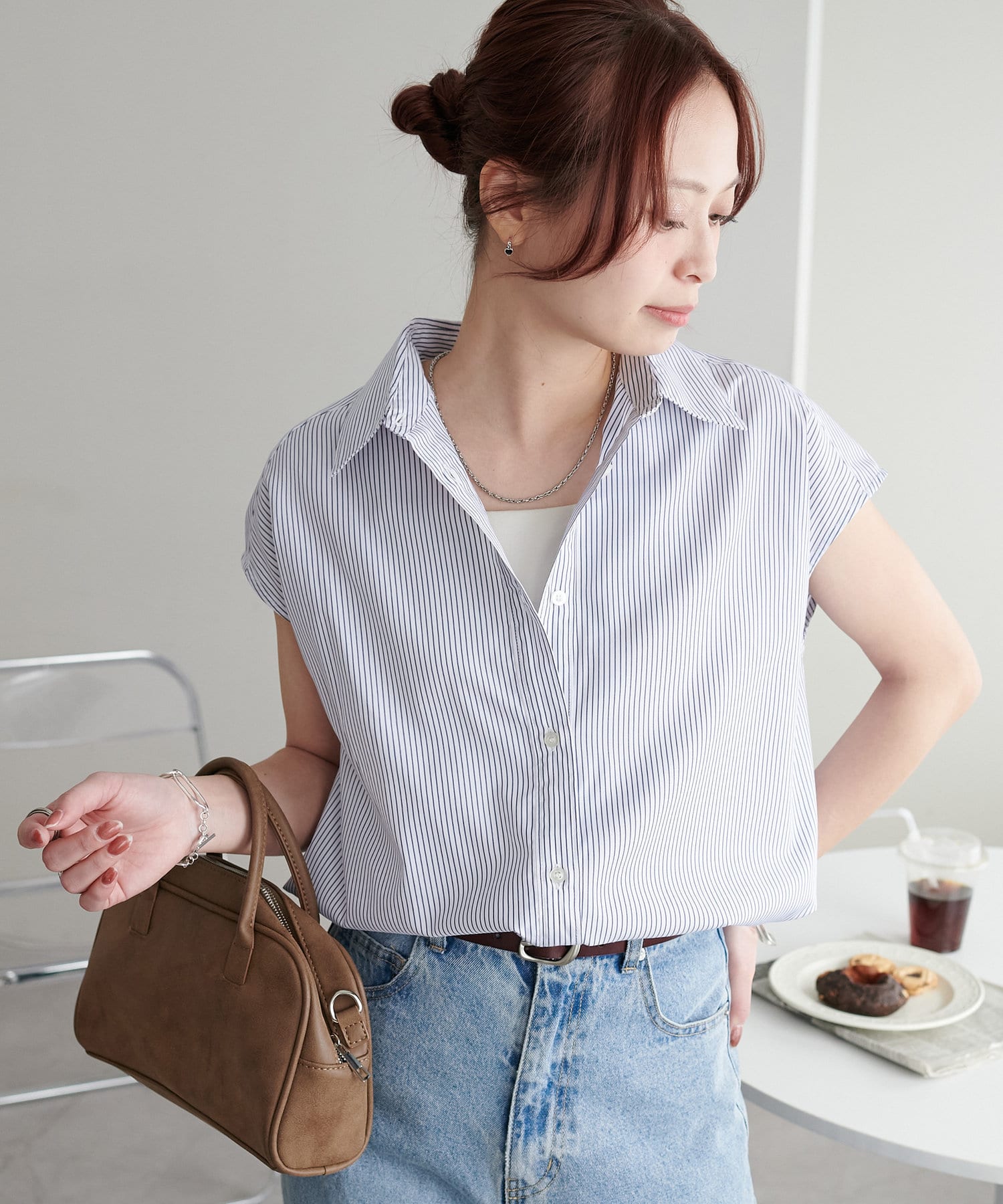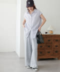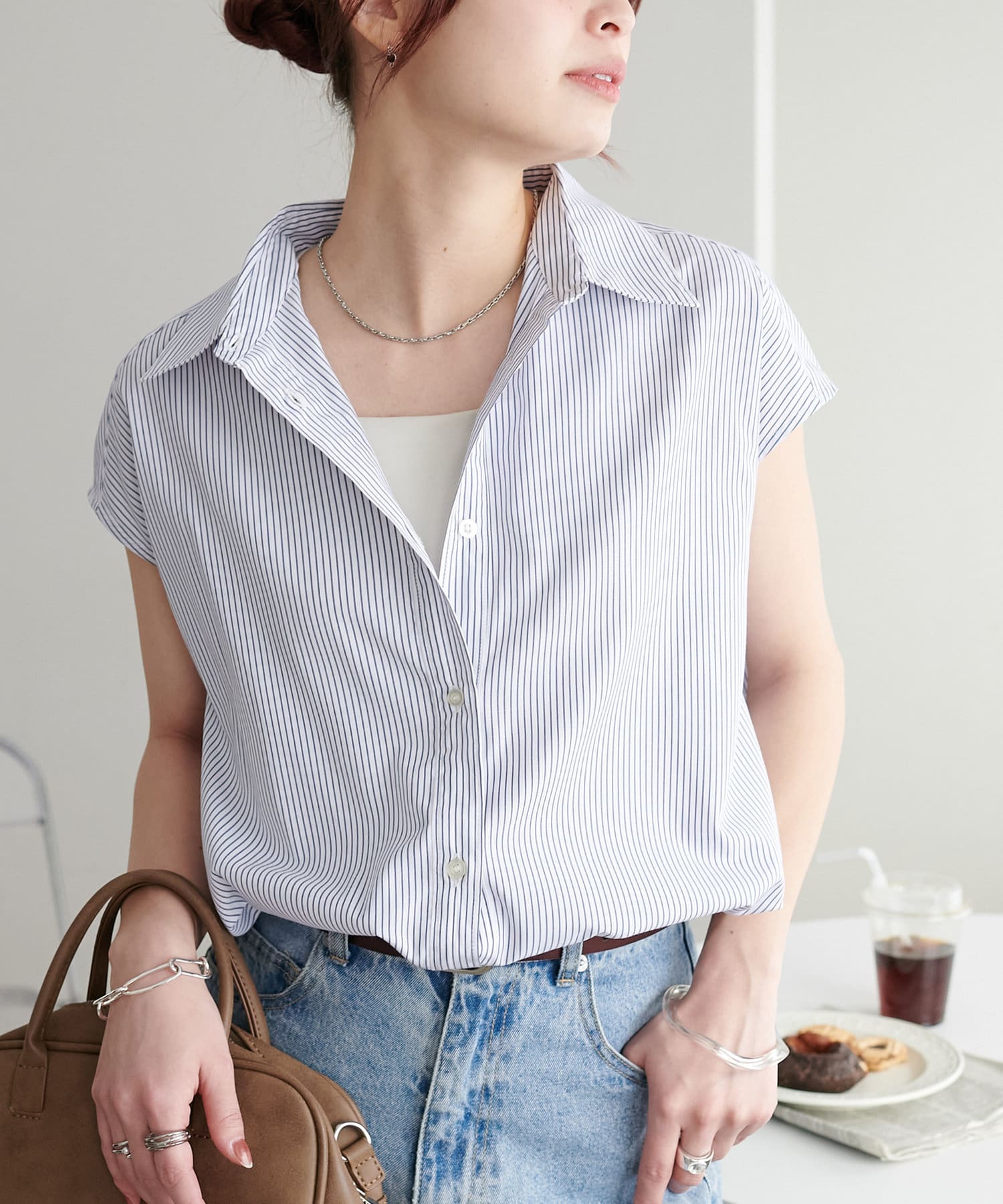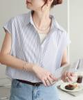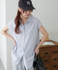 きれいめにもカジュアルにも使える、ストライプ柄のフレンチスリーブシャツ。