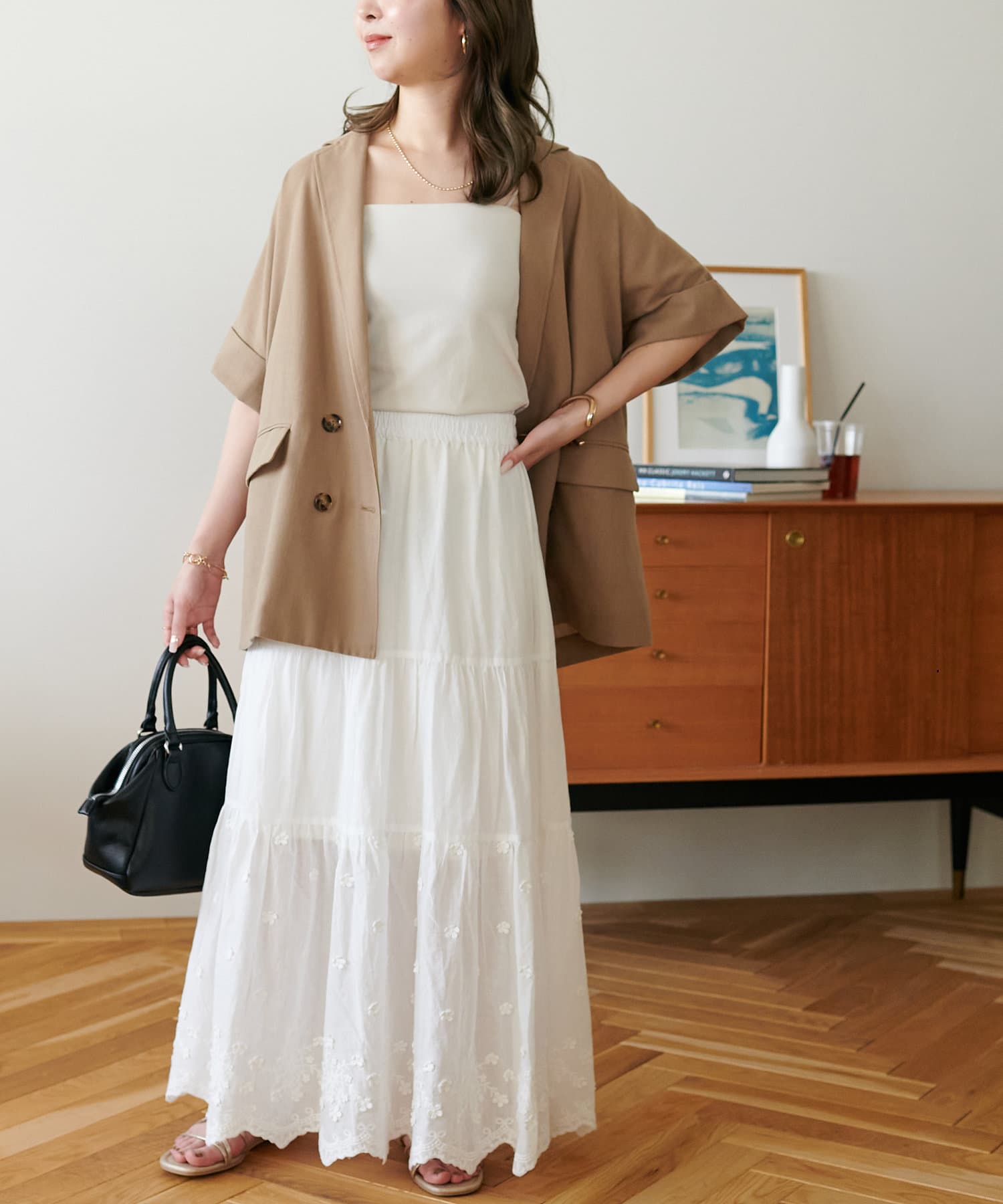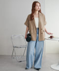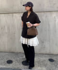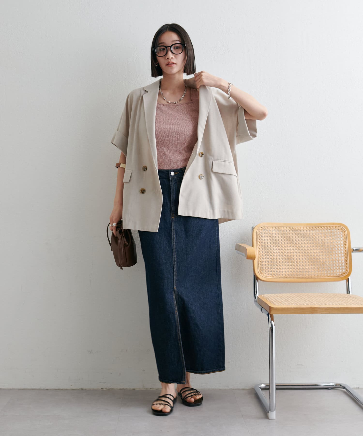 小柄な方はナロースカートやストレートパンツなど、スッキリとしたボトムスと合わせることでメリハリが出ます。