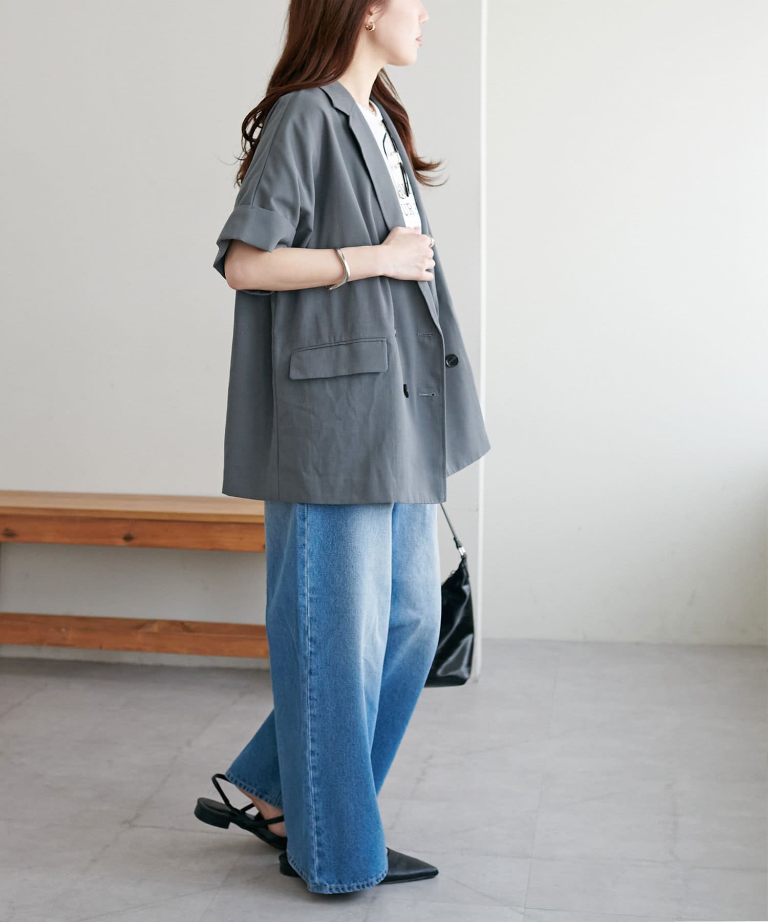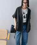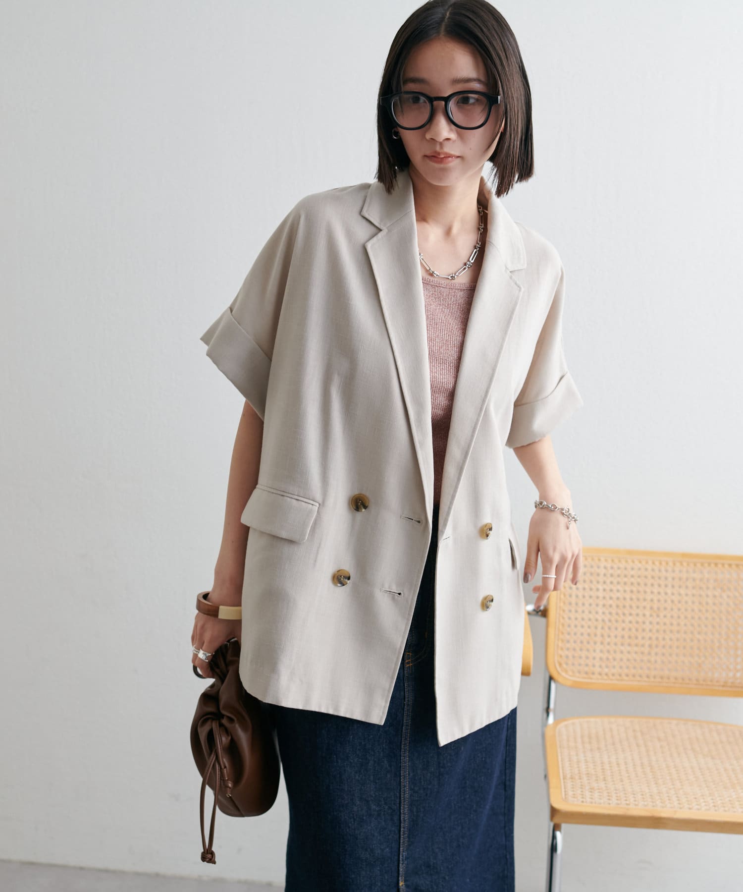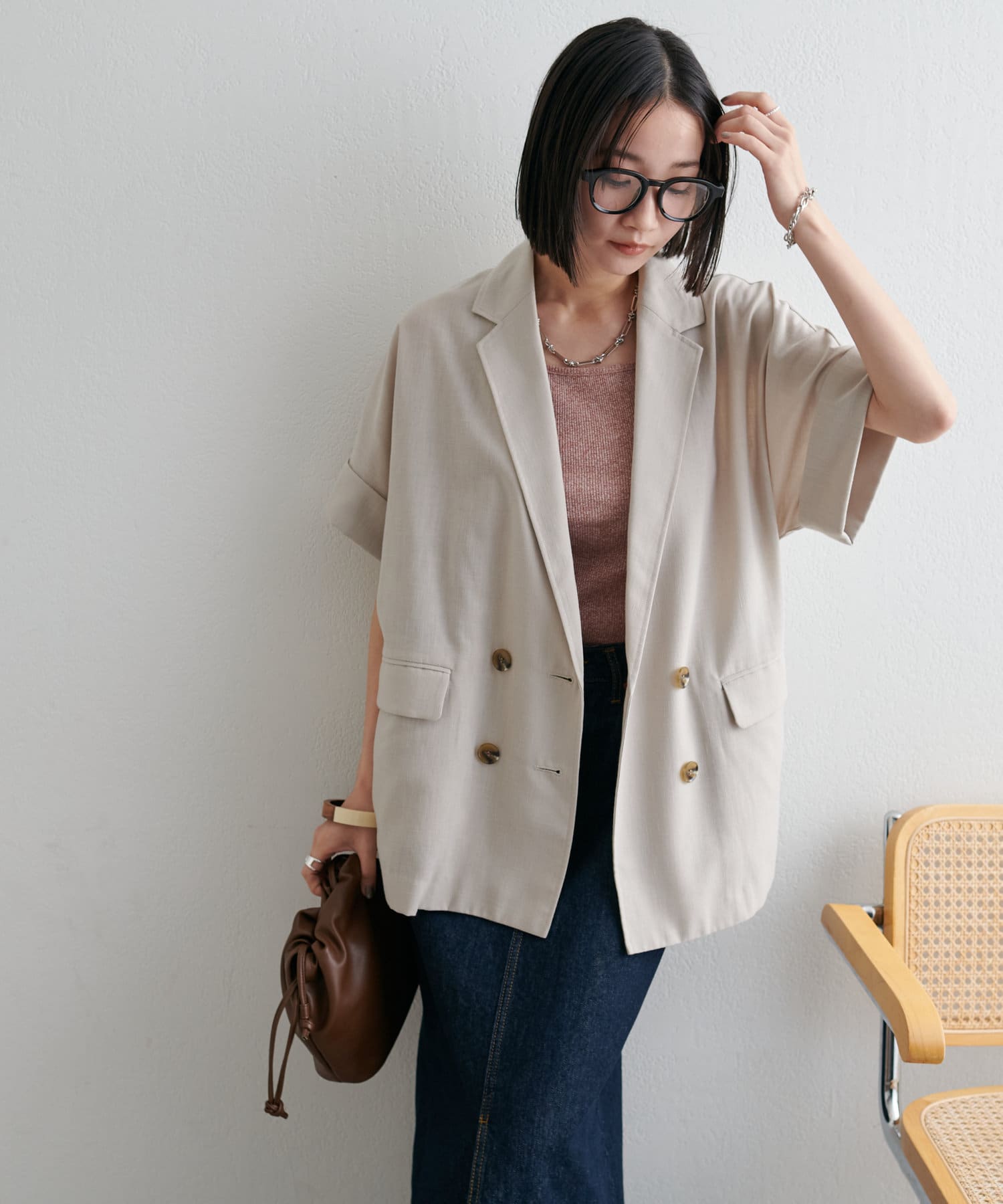 155cmスタッフ:腰回りがすっぽり隠れる着丈のジャケットです。さらっとした生地感なので、夏でも涼しく着ることができておすすめ!
