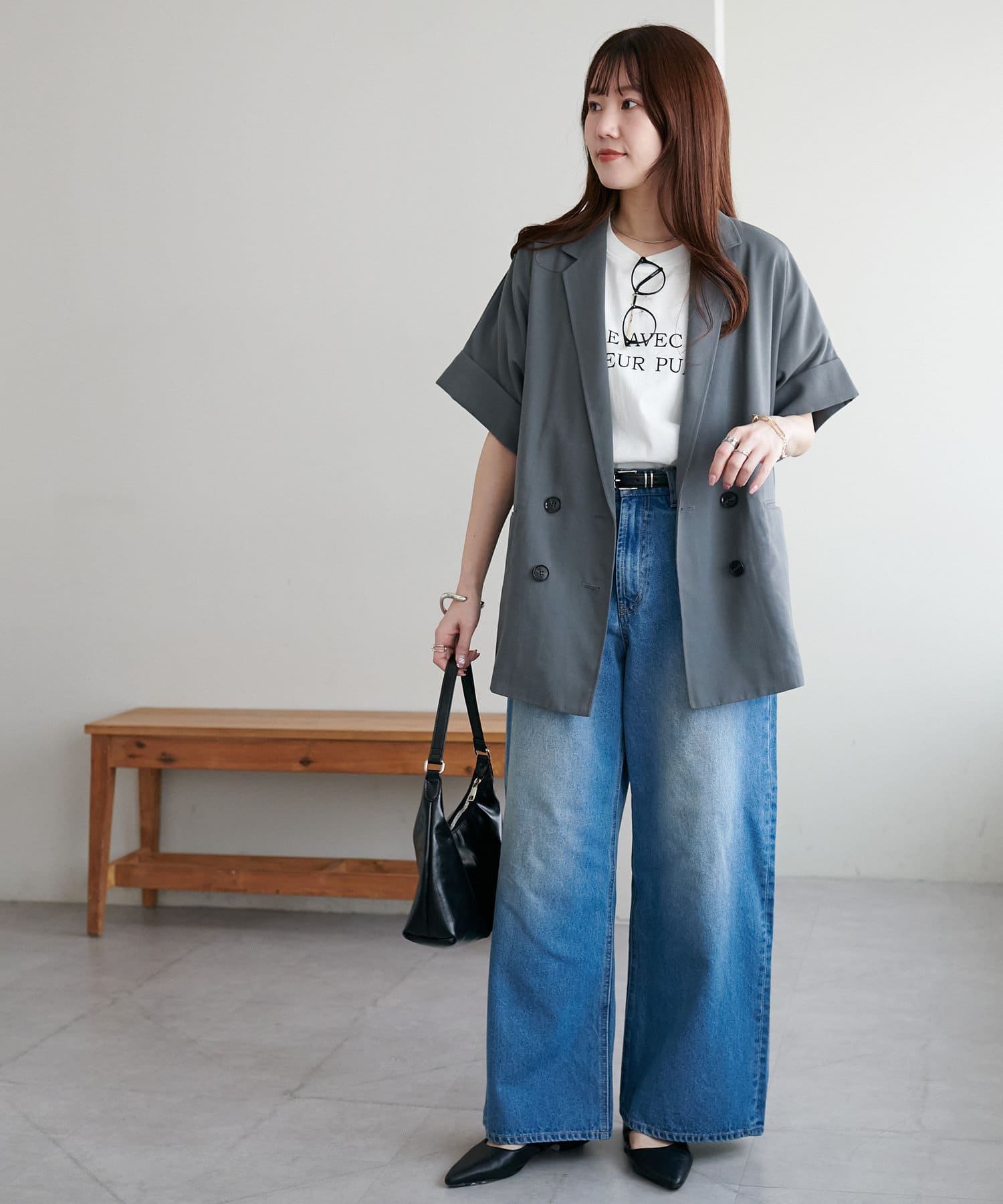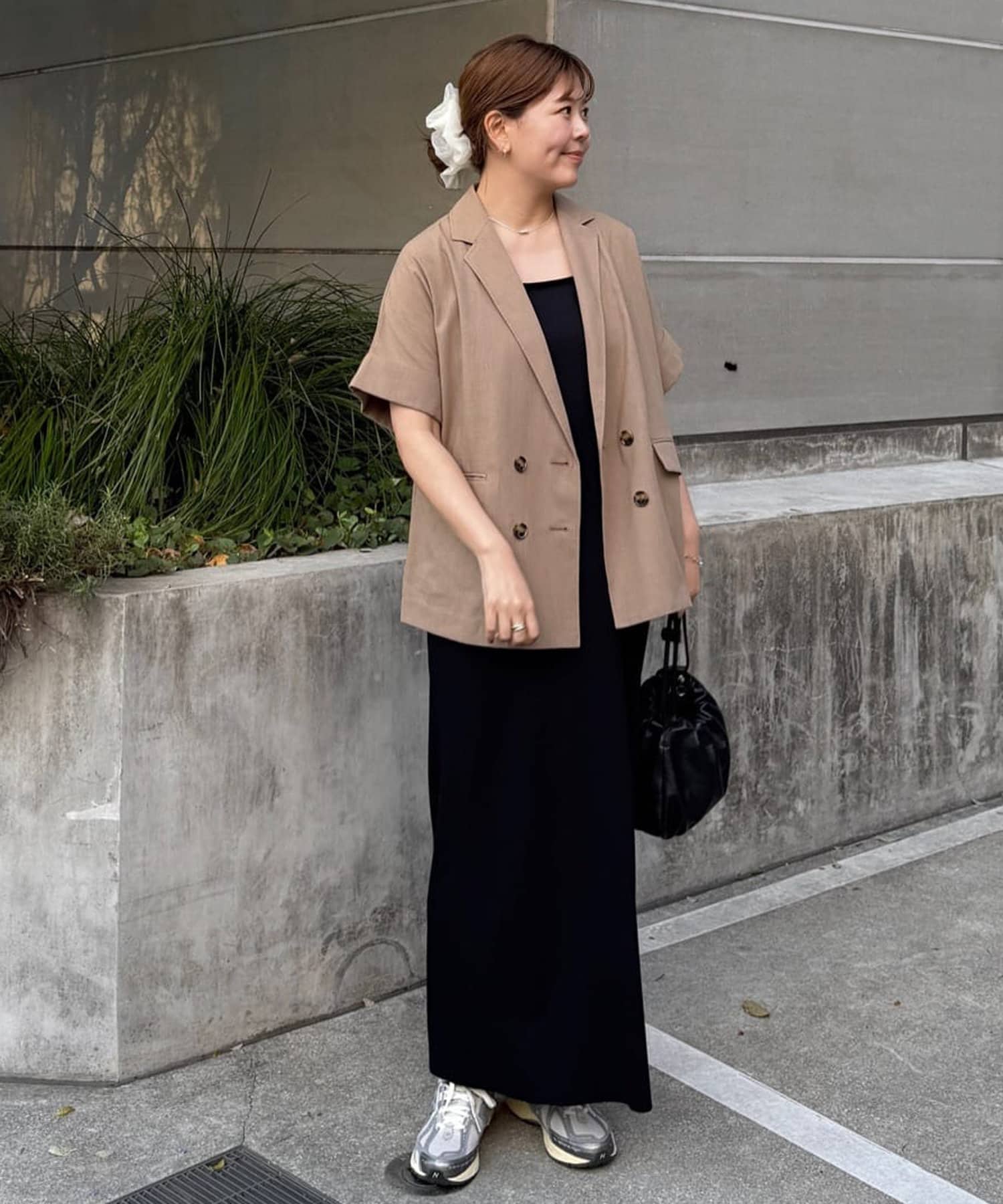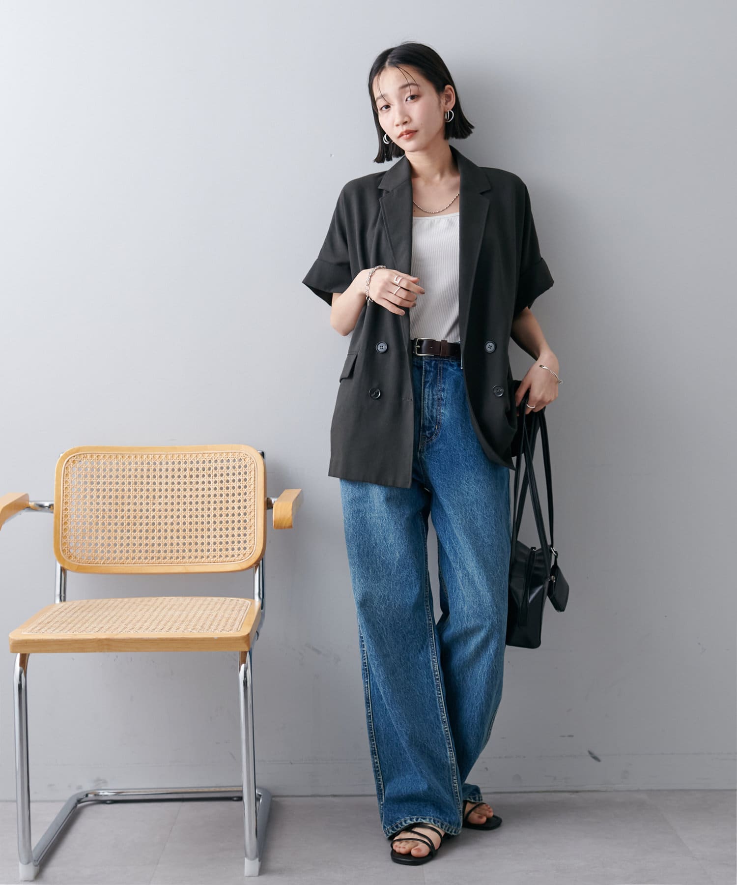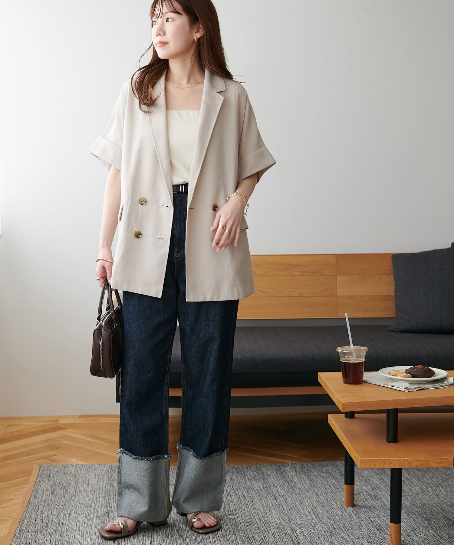 155cmスタッフ:腰回りがすっぽり隠れる着丈のジャケットです。さらっとした生地感なので、夏でも涼しく着ることができておすすめ!