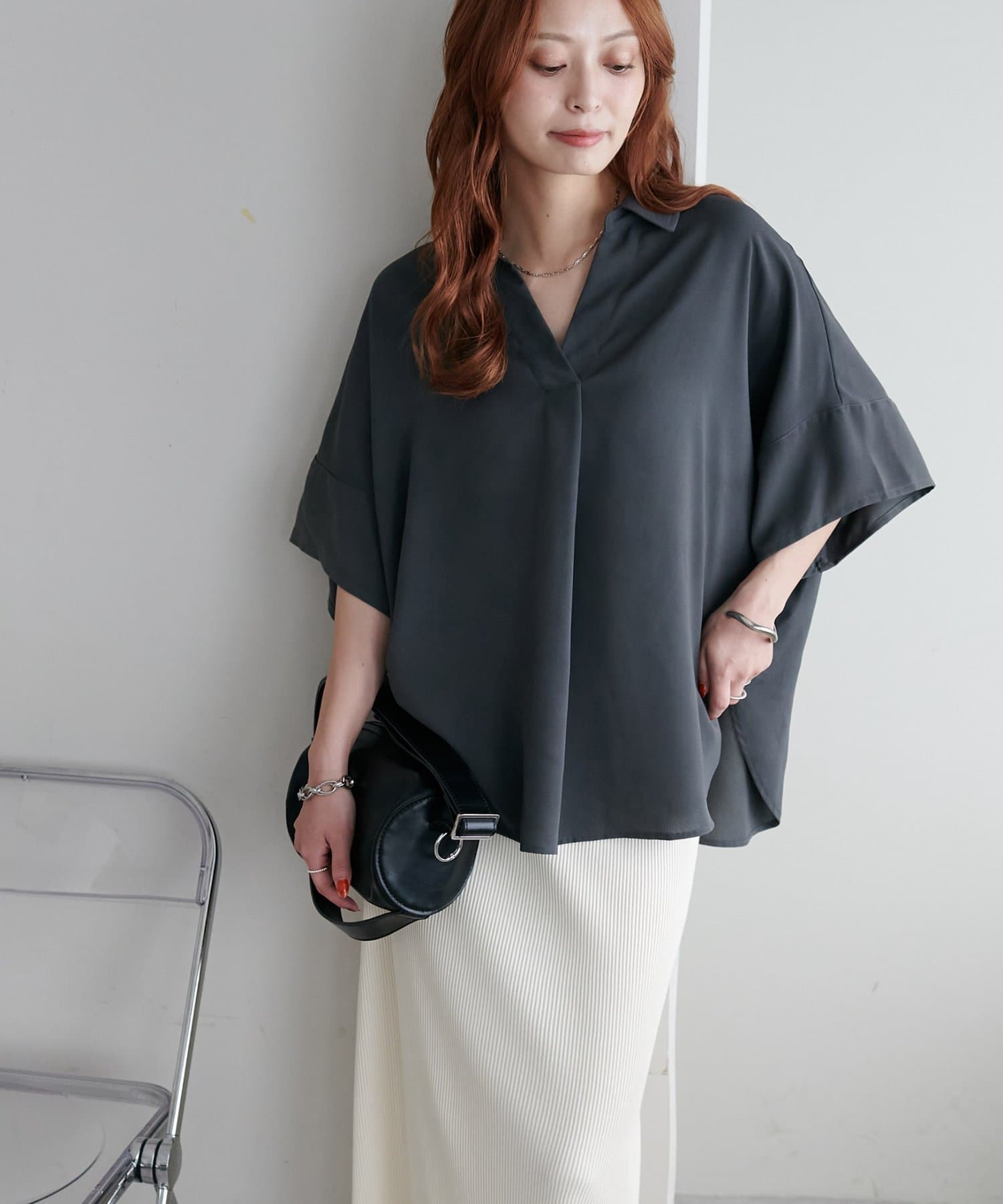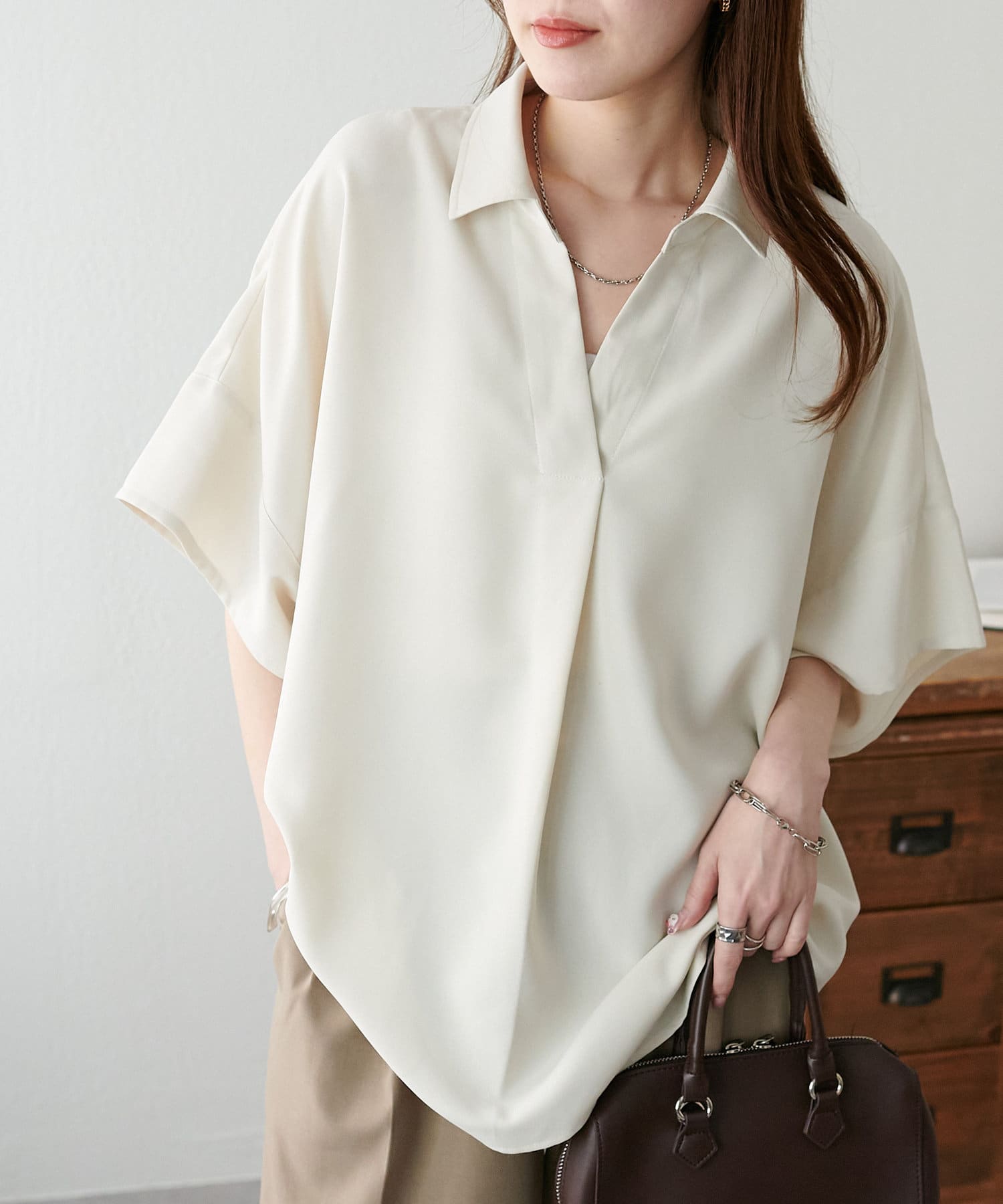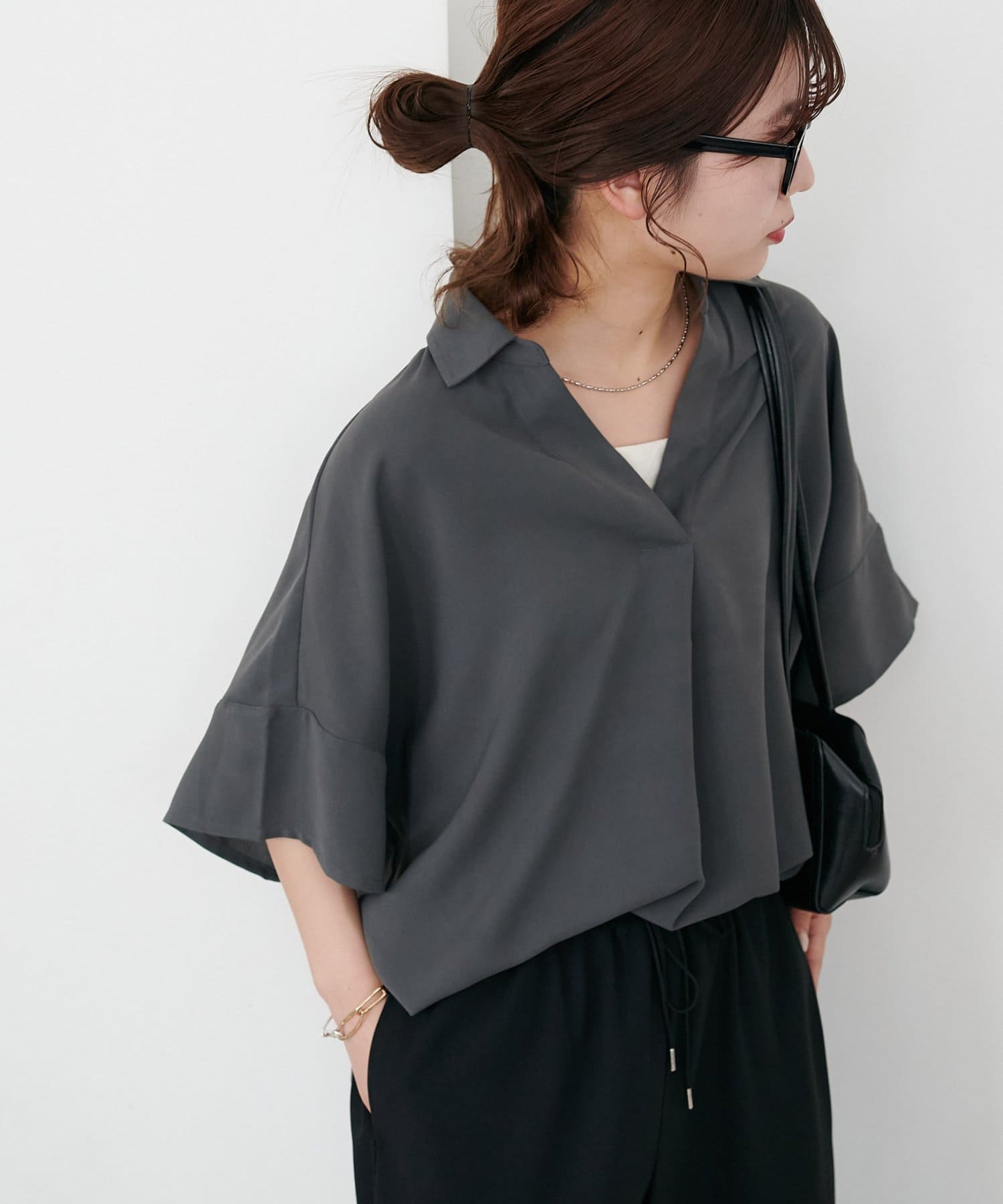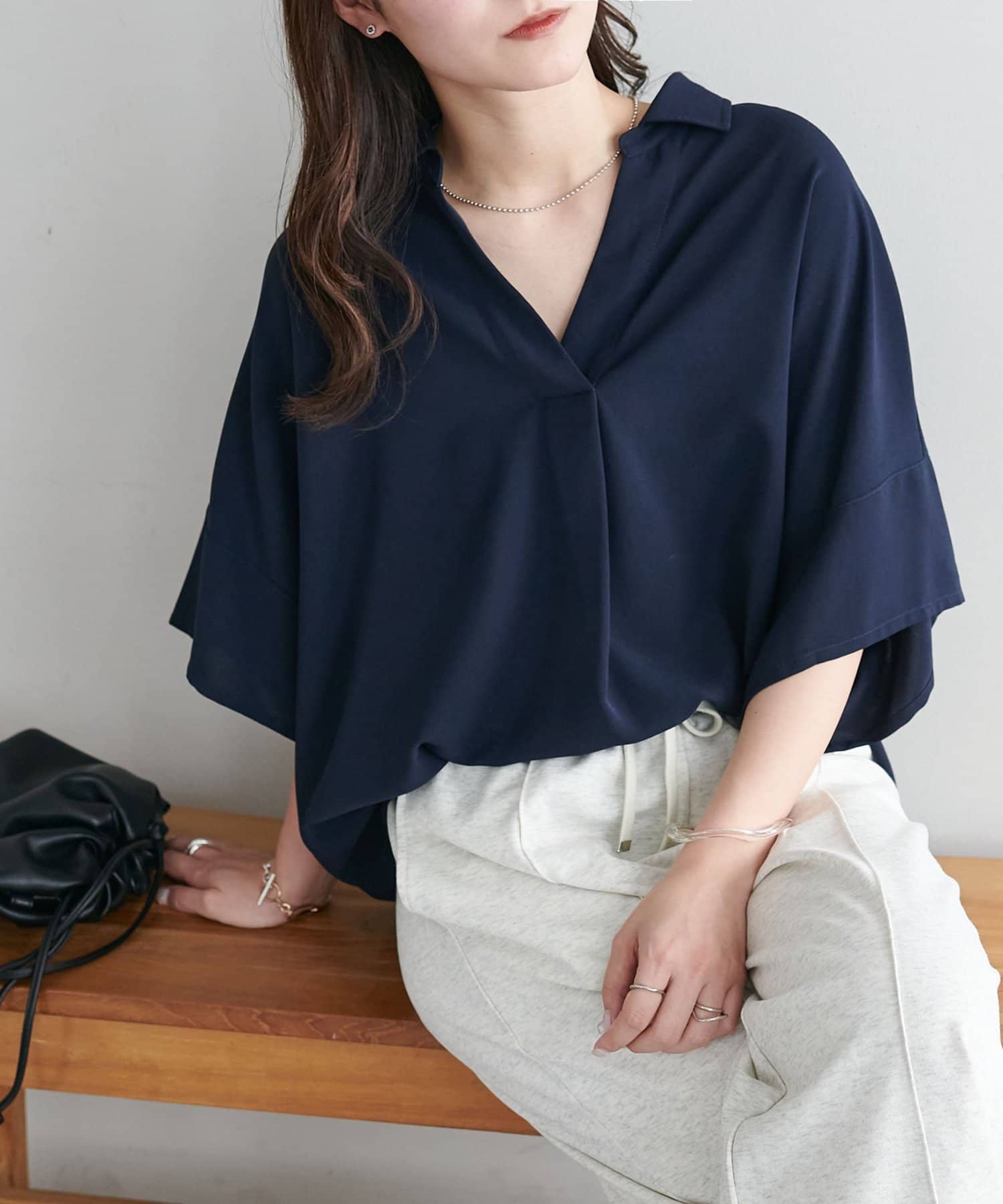 160cmスタッフ:スキッパー部分が、空きすぎず、詰まりすぎずなデザインなのがちょうど良い!襟元を抜いて着るのも、大人っぽくて可愛いですよ!
