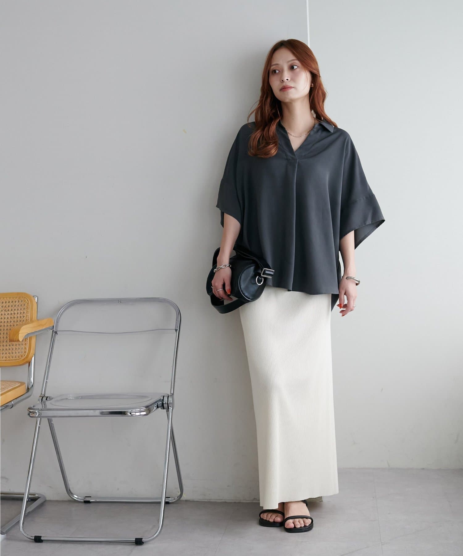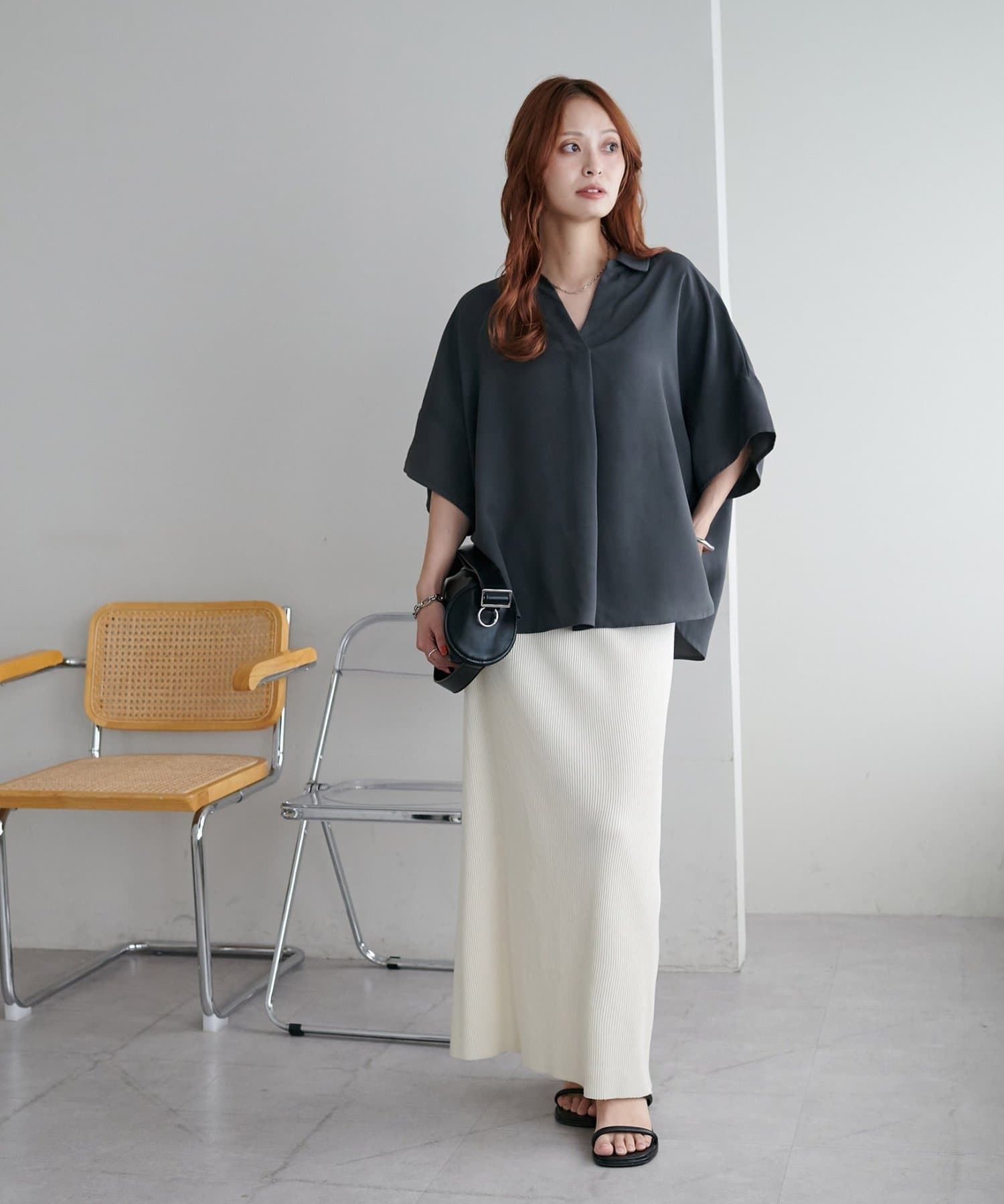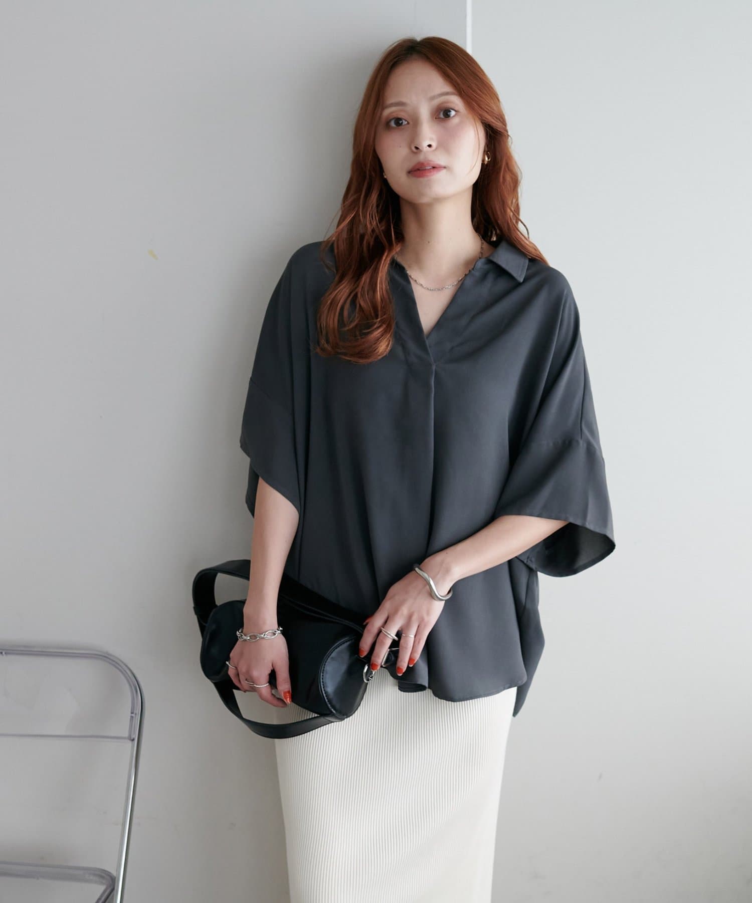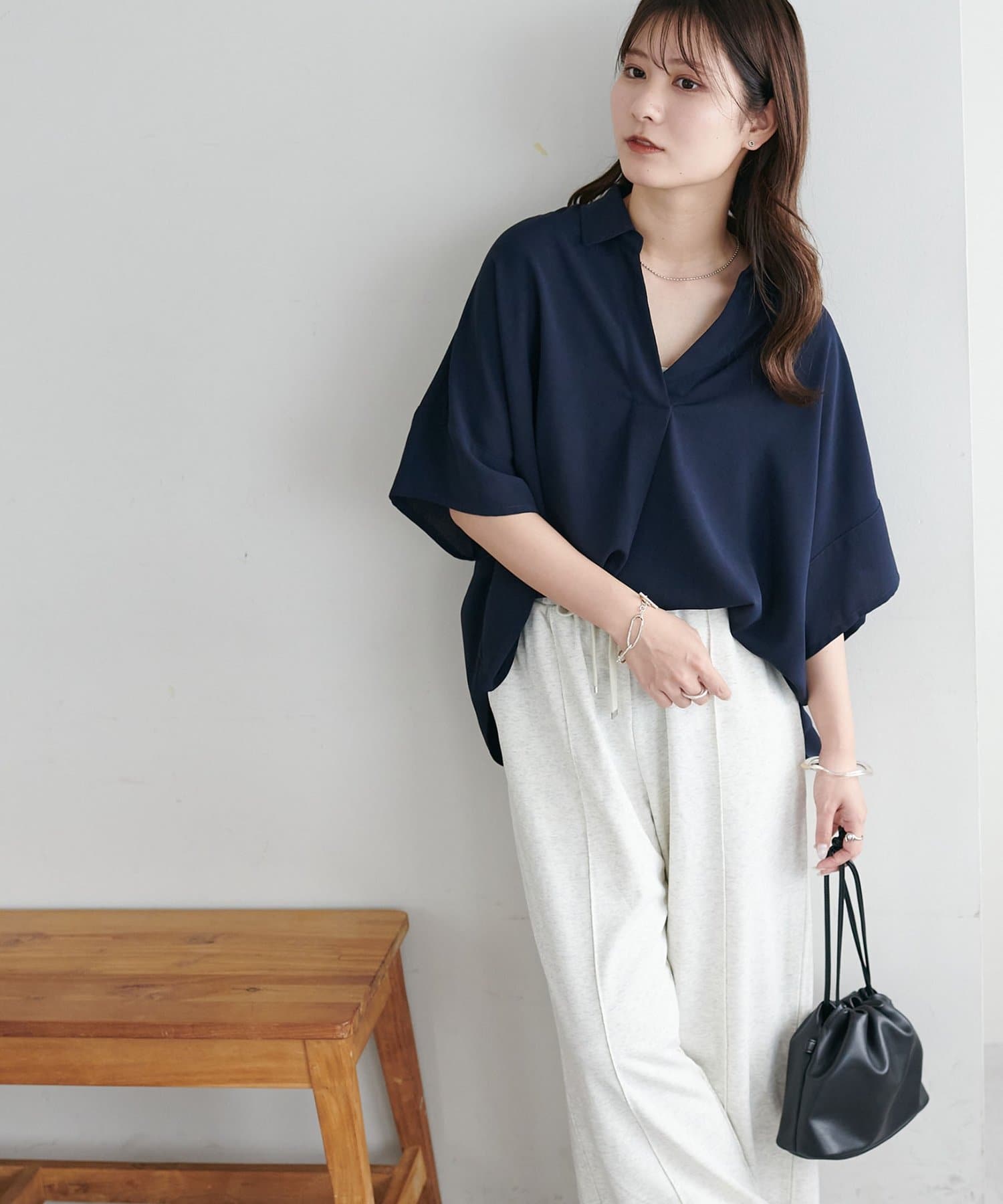 160cmスタッフ:スキッパー部分が、空きすぎず、詰まりすぎずなデザインなのがちょうど良い!襟元を抜いて着るのも、大人っぽくて可愛いですよ!