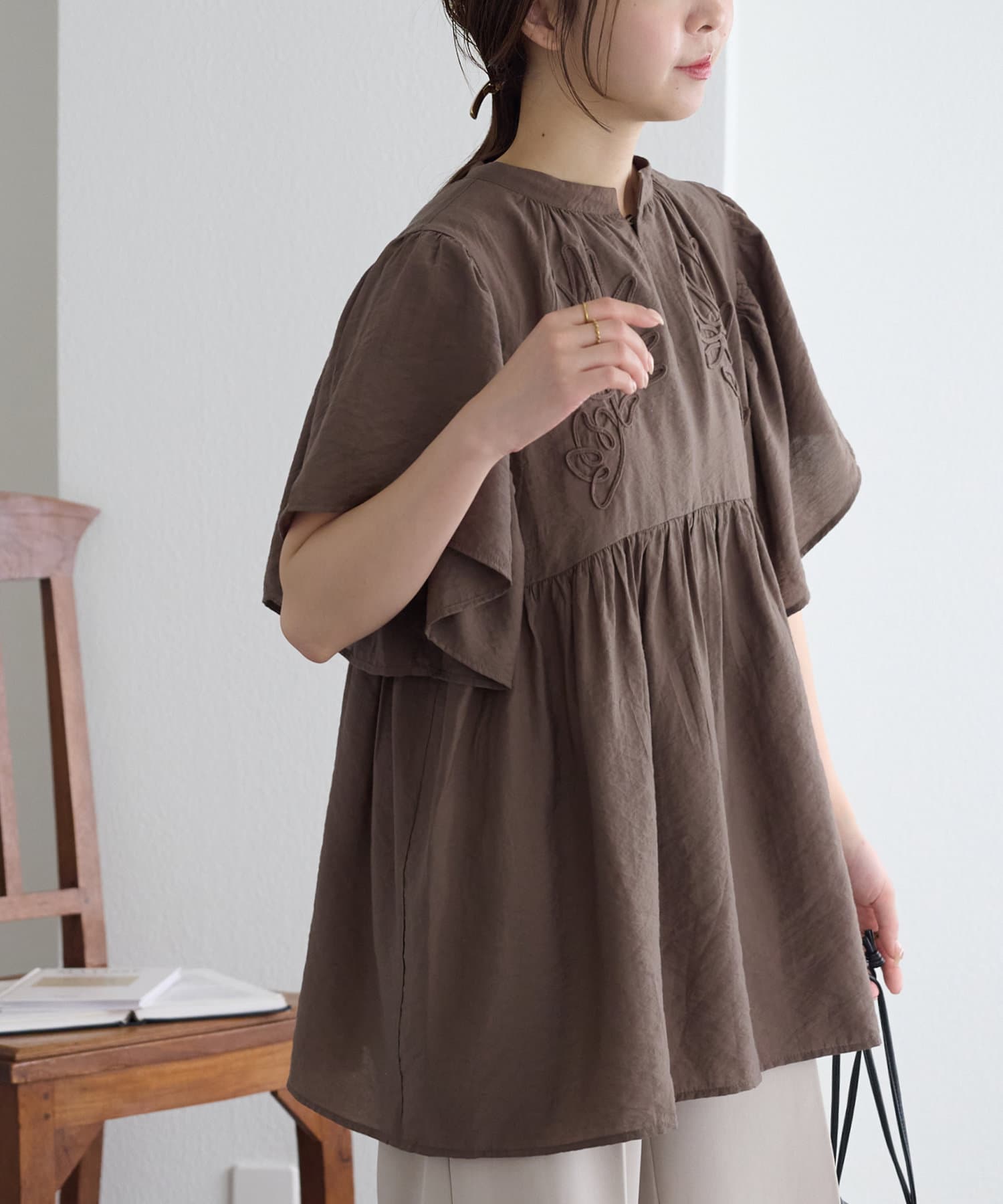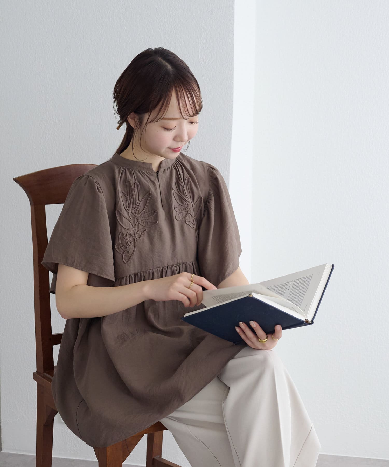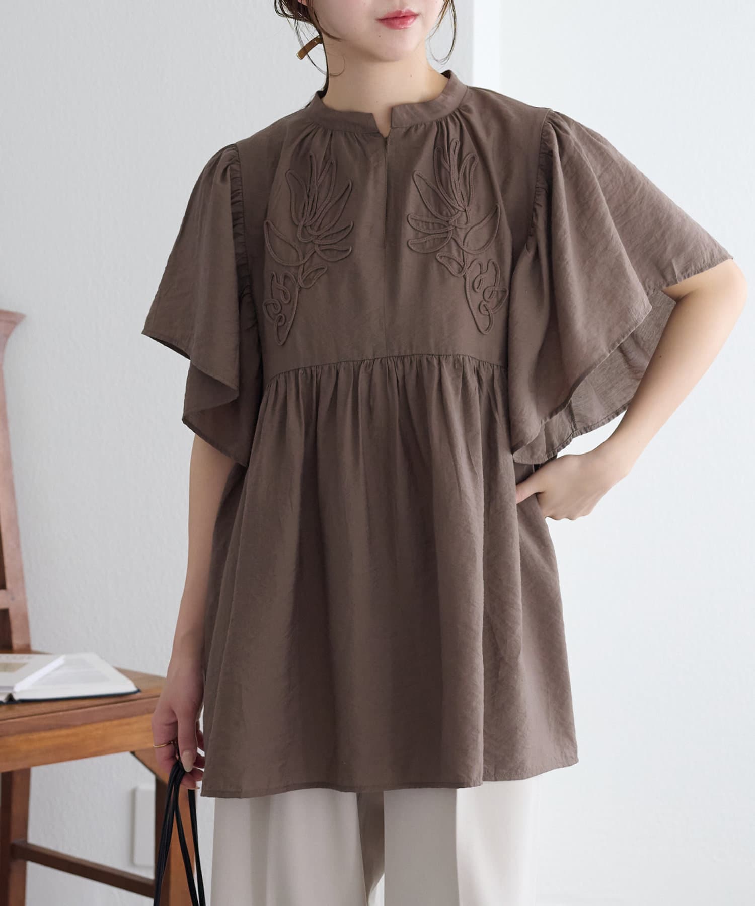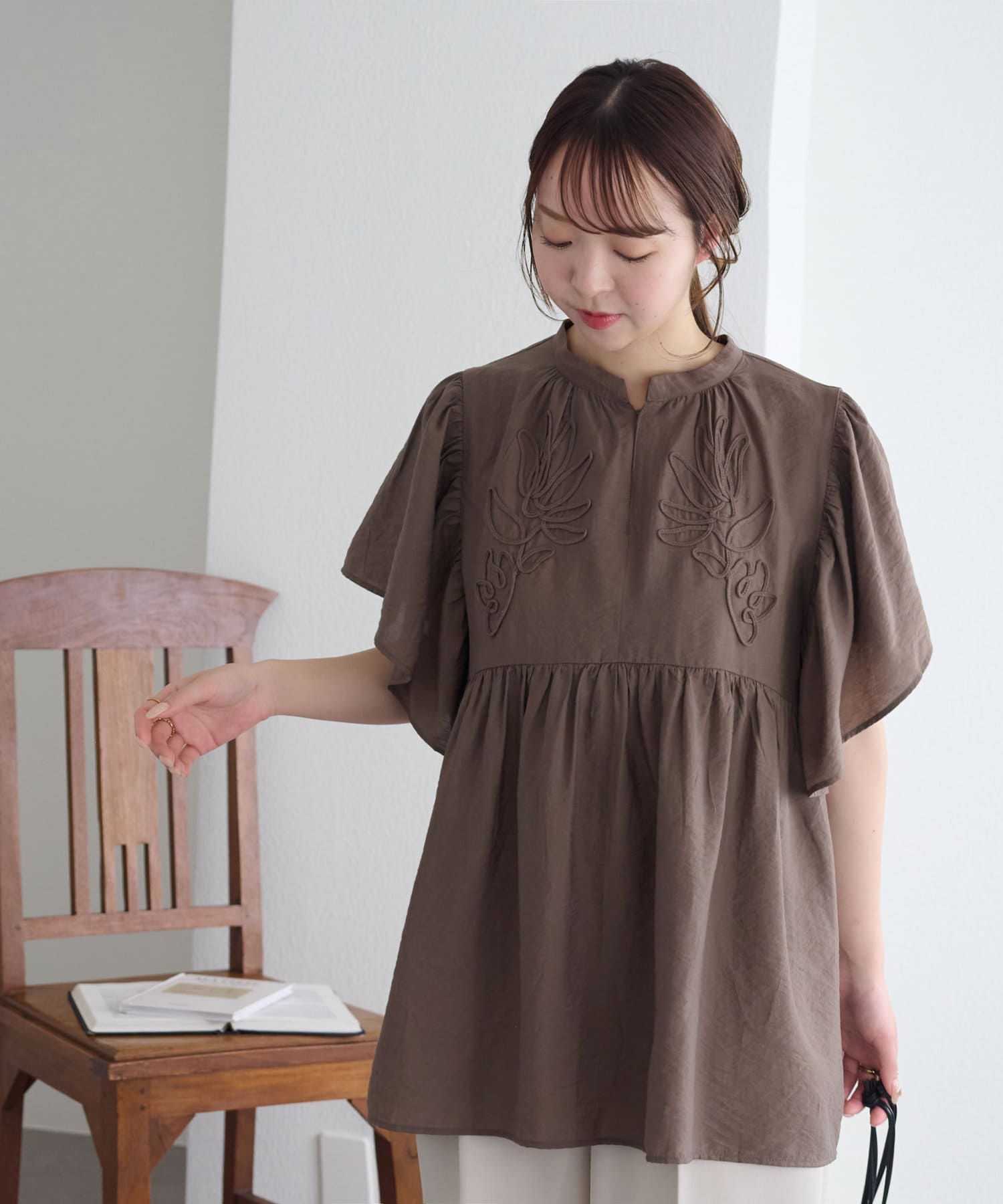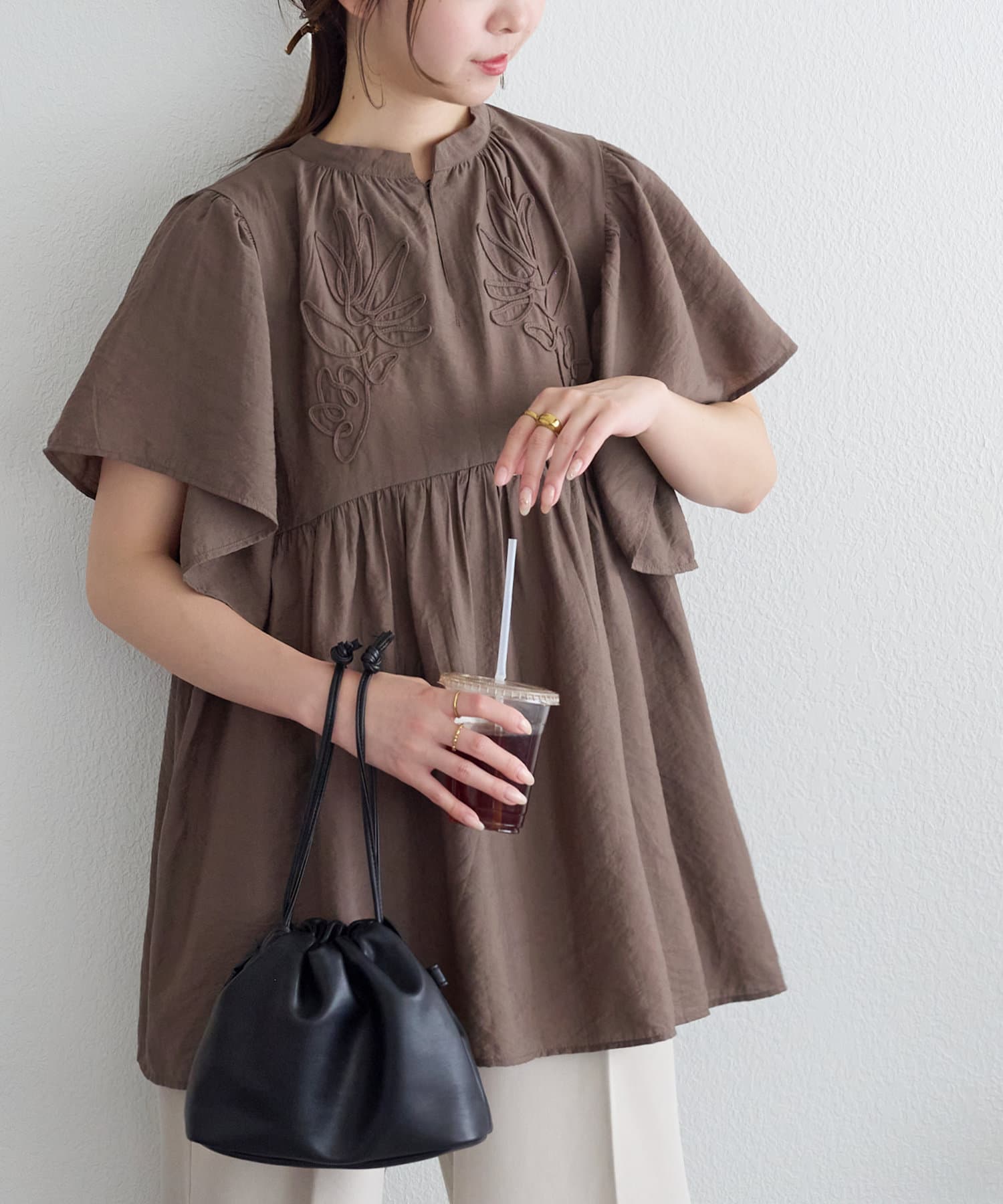 胸元の刺繍がさりげないアクセントになり、大人の女性らしさを演出します。