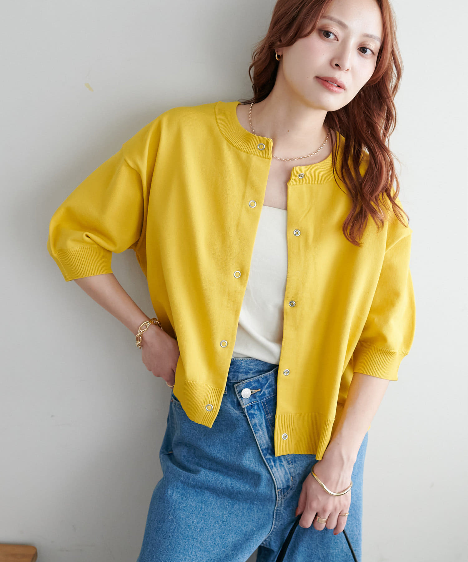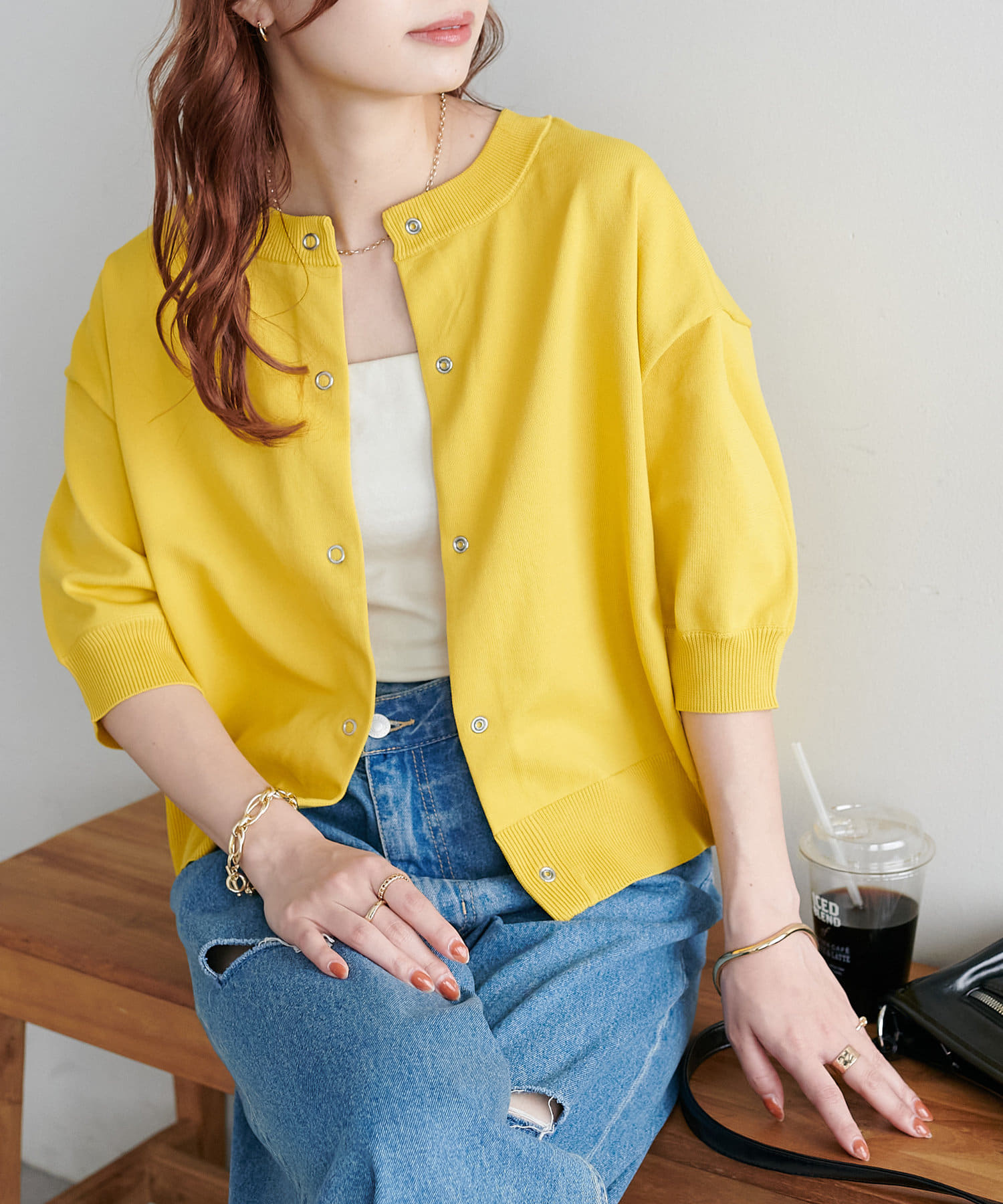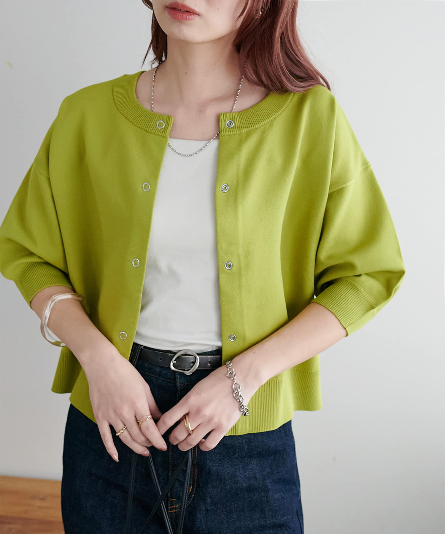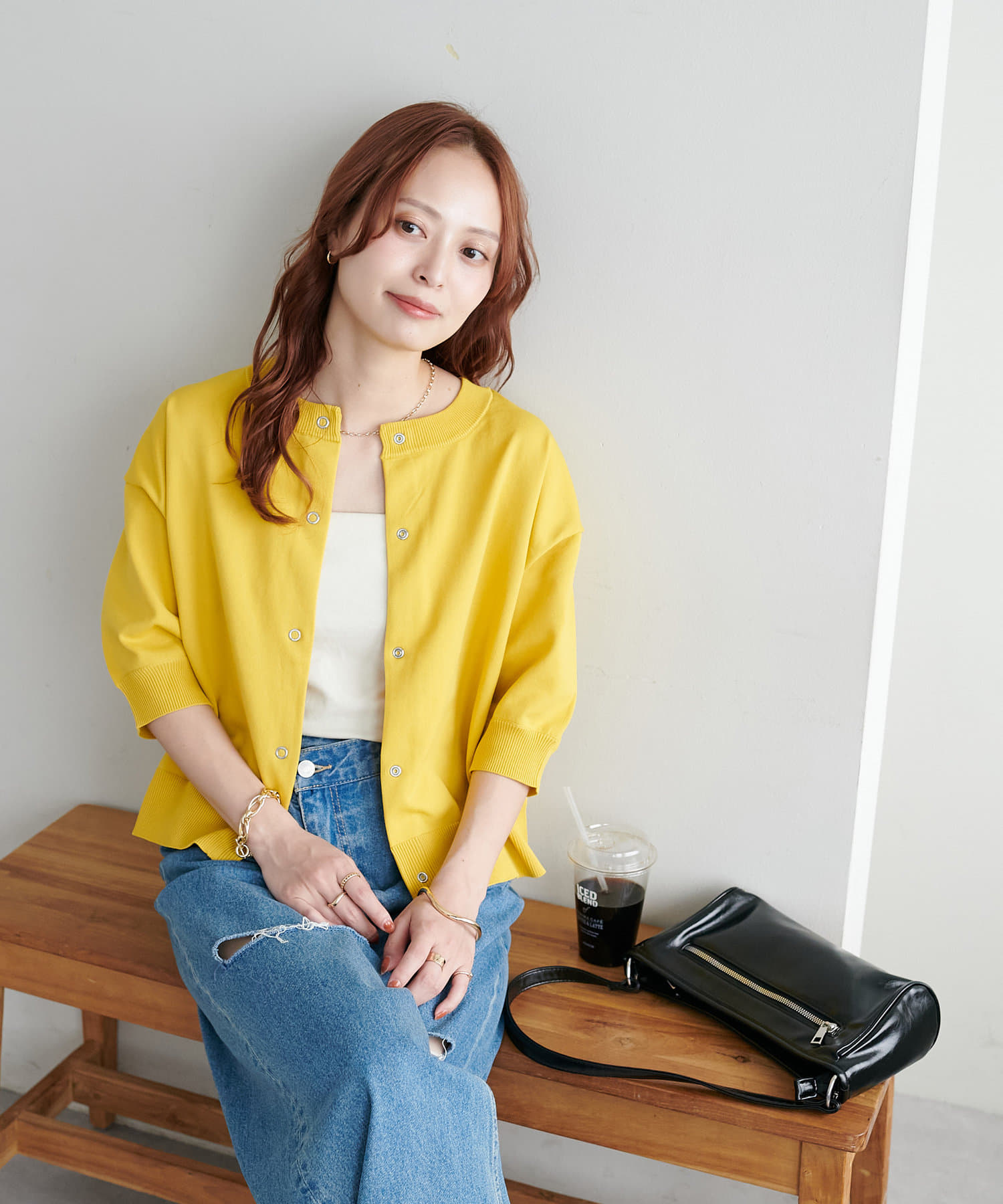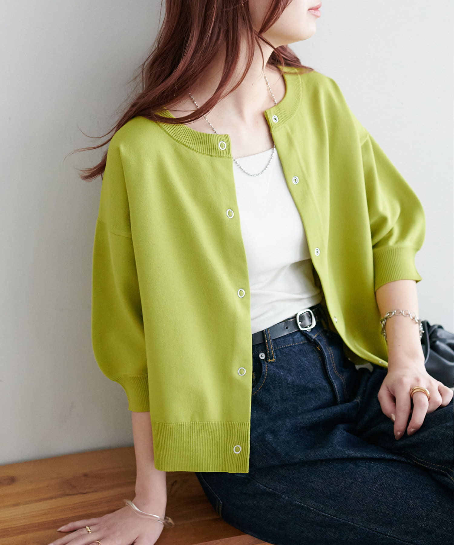 購入場所:パルクローゼット半袖カーディガンはあまり持っておらず、この色味もなかなか冒険です。