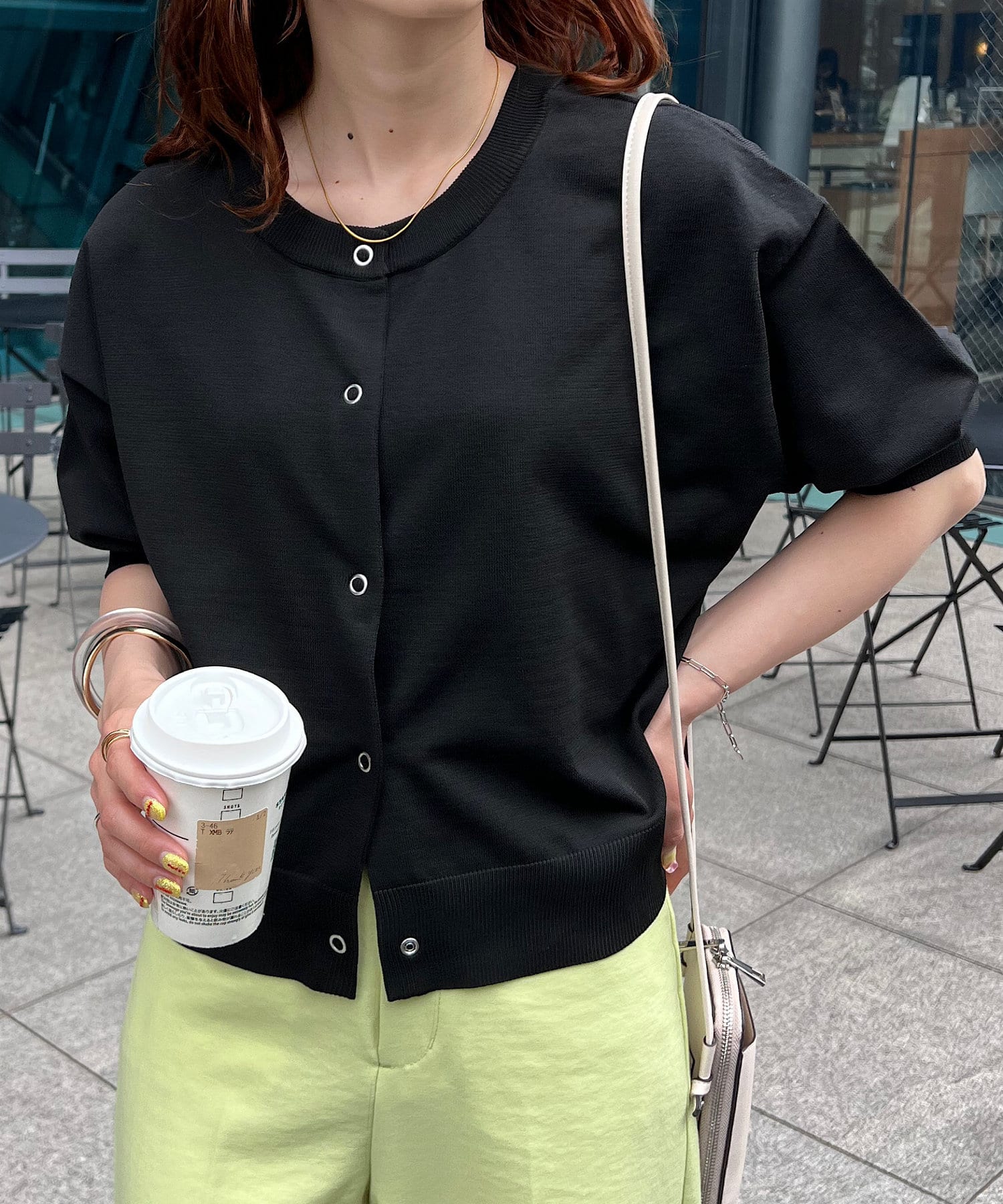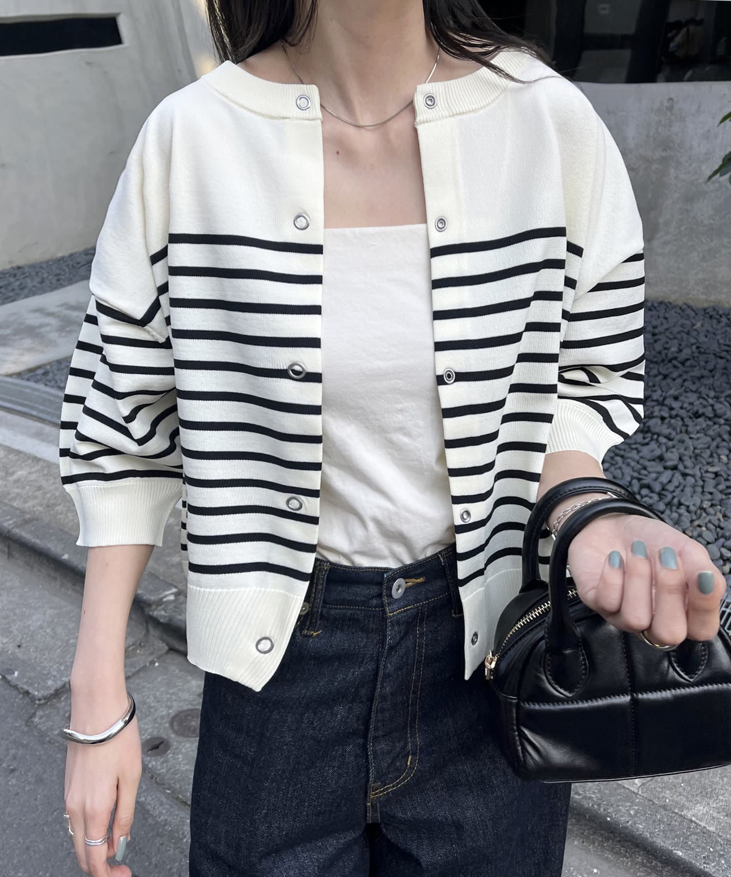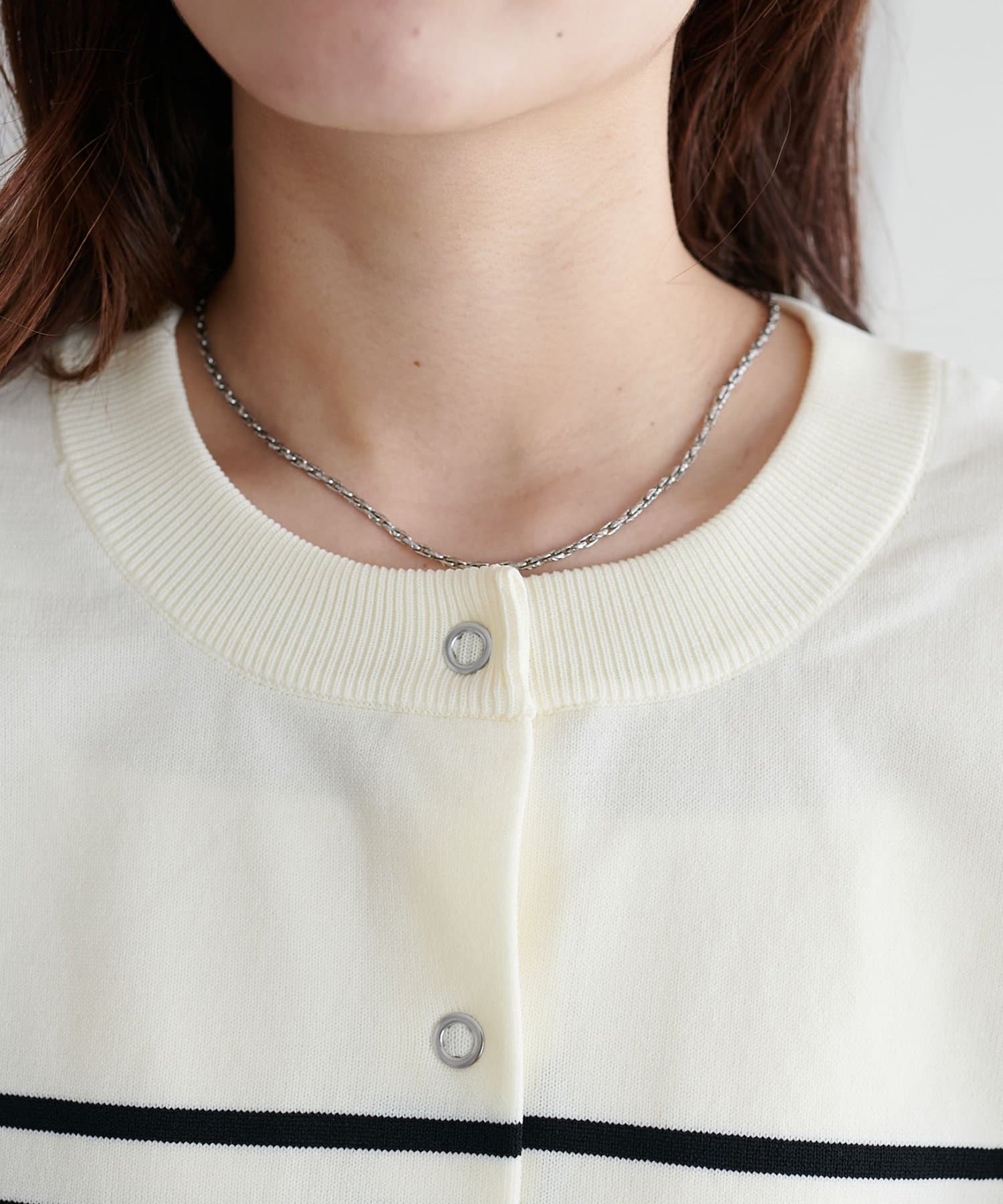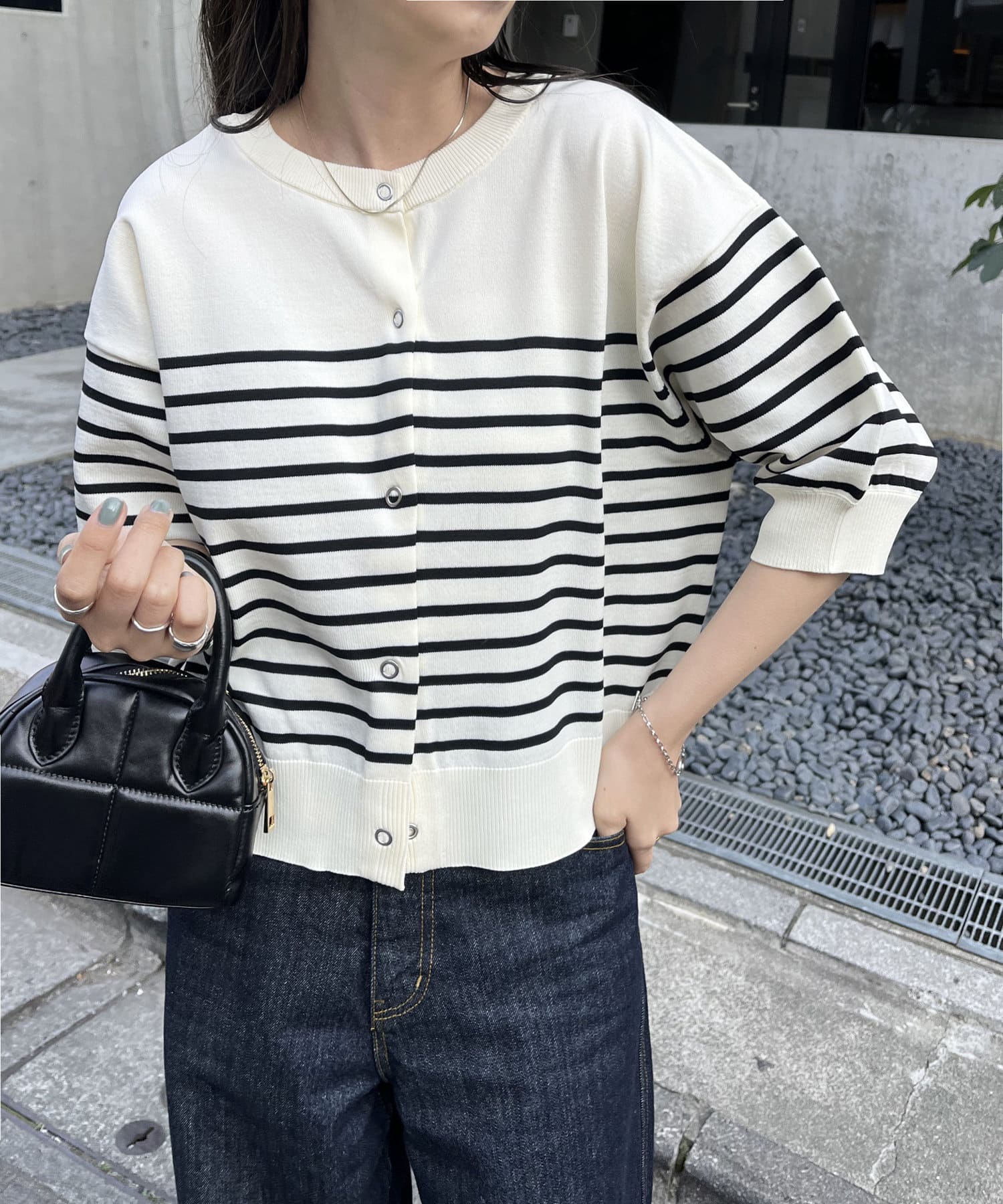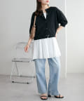 149cmスタッフ:上と下のボタンを1~2個開けると抜け感が出るので、低身長の方は特におすすめです◎