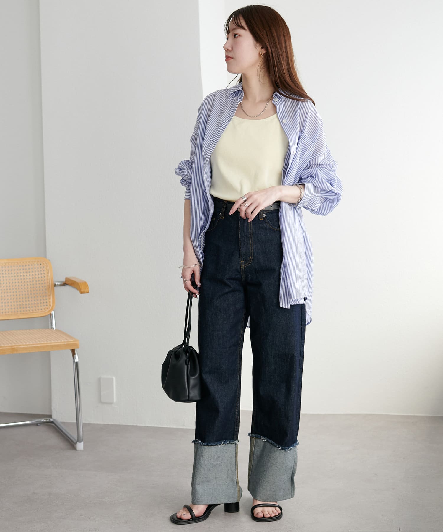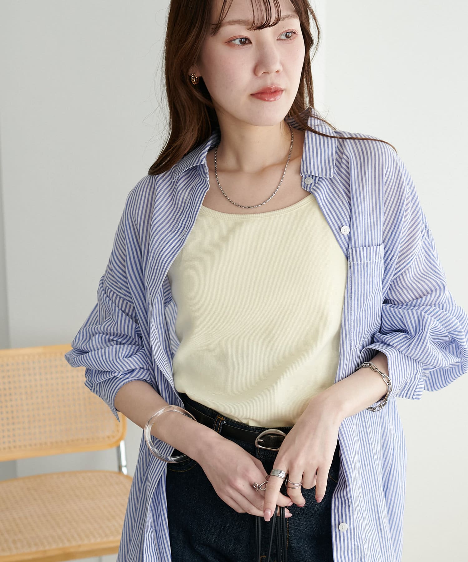シャツやシアートップスのインナーとしてはもちろん、1枚でさらっと着てもサマになる万能アイテム。