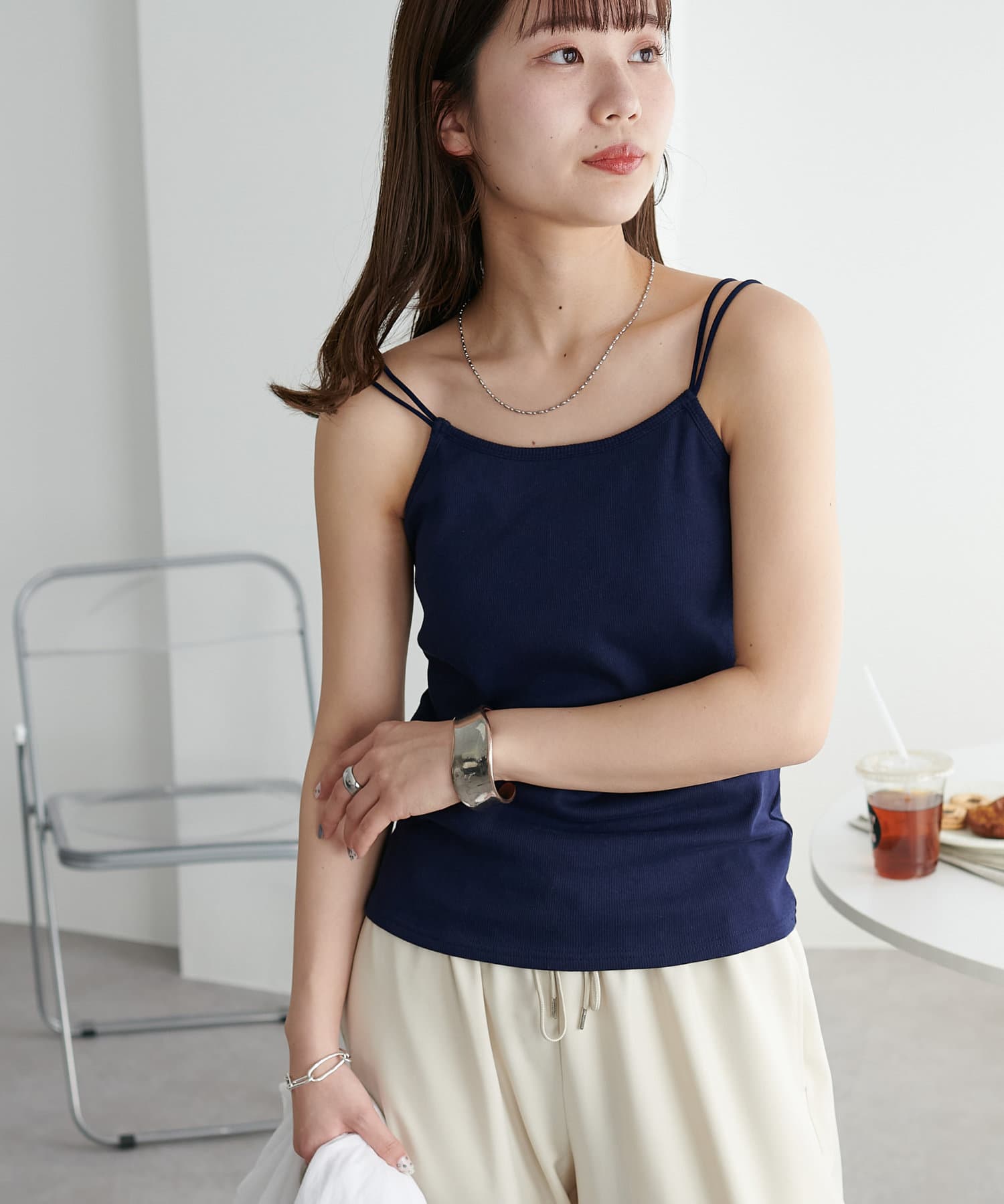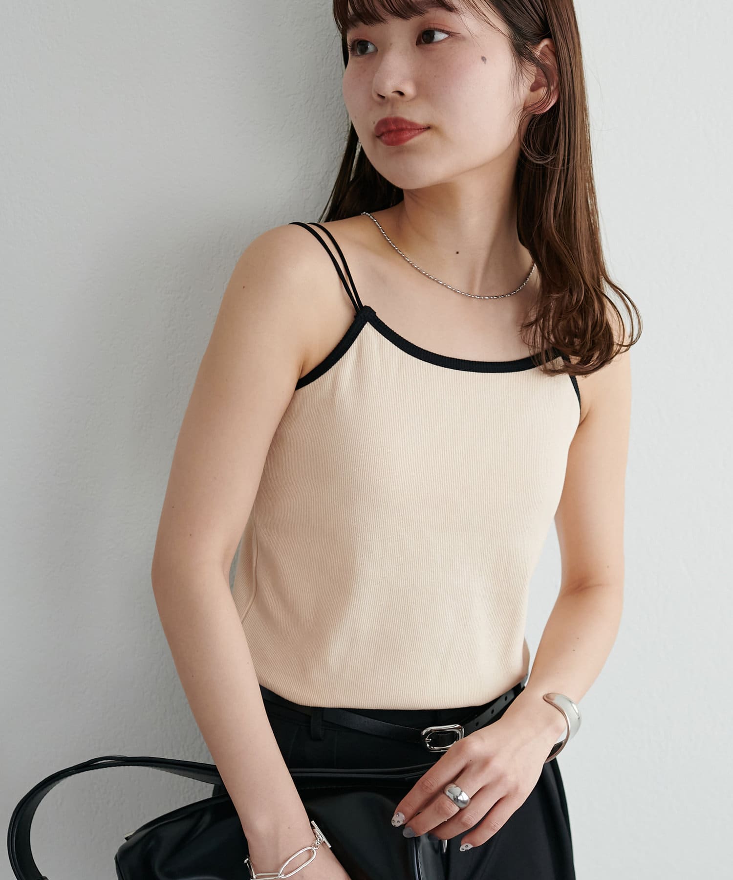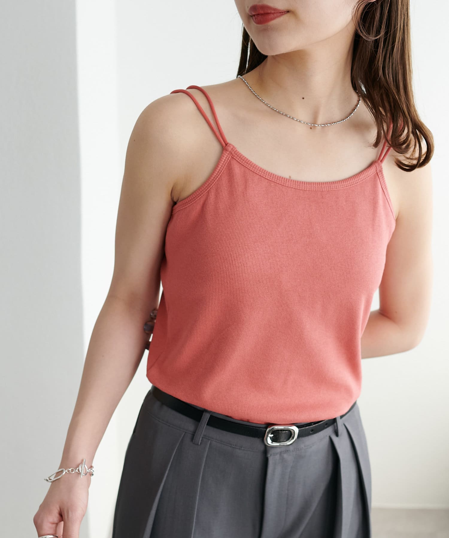華奢なダブルストラップが女性らしい抜け感を演出するリブキャミソール。